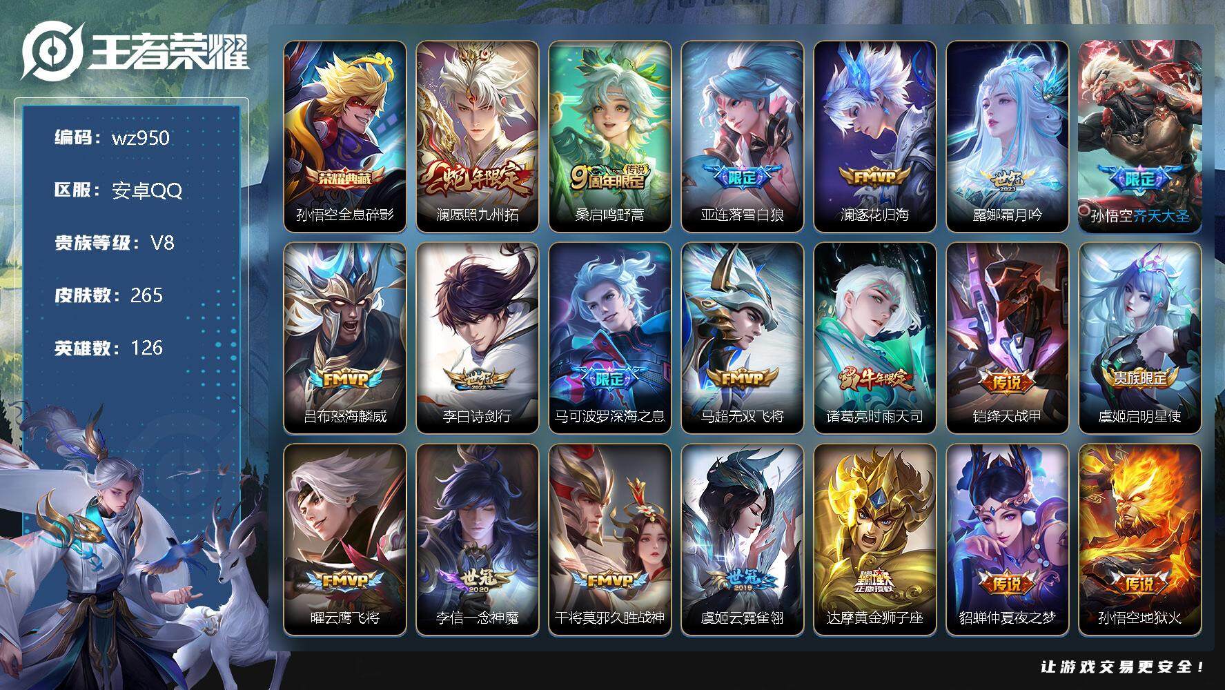 【账号佳】 【可二次实名】【wz950】【商品标题】:安卓Q-V8-永恒钻石II段位-126英雄-265皮肤-1典藏-0珍品无双-0无双-0珍品传说-21传说-66史诗 【荣耀典藏】:孙悟空全息碎影 【传说皮肤】:澜愿照九州拓,桑启鸣野蒿,亚连落雪白狼,澜逐花归海,露娜霜月吟,孙悟空齐天大圣,吕布怒海麟威,李白诗剑行,马可波罗深海之息,马超无双飞将,诸葛亮时雨天司,铠绛天战甲,虞姬启明星使,曜云鹰飞将,李信一念神魔,干将莫邪久胜战神,虞姬云霓雀翎,达摩黄金狮子座,貂蝉仲夏夜之梦,孙悟空地狱火,狄仁杰超时空战士 【限定皮肤】:姜子牙天穹之誓,李白谪仙醉月,狄仁杰阴阳师,赵云皇家上将,赵云百木心枪,孙尚香蔷薇恋人,白起夜都怪侠,典韦岱宗,马可波罗深海之息,马可波罗山海玄木吟,狄仁杰魔术师,达摩沙漠行僧,项羽海滩派对,王昭君午后时光,兰陵王金庭之子,孙悟空齐天大圣,后羿圣弓游侠,李元芳云中旅人,虞姬启明星使,钟馗神迹守卫,鬼谷子五谷丰年,诸葛亮时雨天司,苏烈千军破阵,百里守约朱雀志,沈梦溪大漠名商,明世隐吟游魔法,裴擒虎李小龙,裴擒虎擒涛扼浪,狂铁电玩高手,云中君纤云弄巧,嫦娥拒霜思,嫦娥暖冬兔眠,西施玲珑珍味,鲁班大师探海日志,桑启海盐诗旅,暃星界游侠,戈娅驭风魔法,艾琳流音漫舞,司空震地狱燃心,阿古朵江河有灵,张良古海寻踪,蒙犽百解令,高渐离燃音魔法,妲己灵卜魔法,鬼谷子天穹祈灯,百里玄策超元猎域,亚连落雪白狼,沈梦溪龙舞盛年,刘邦剑破天穹,程咬金群星魔术团,镜青焰无极,项羽苍威无极,刘备异域游侠,周瑜熔金海岸 【年限皮肤】:百里守约朱雀志,诸葛亮时雨天司,典韦岱宗,马可波罗山海玄木吟 【赛季限定】:达摩沙漠行僧,兰陵王金庭之子,张良古海寻踪,李元芳云中旅人,苏烈千军破阵,沈梦溪大漠名商,裴擒虎擒涛扼浪,鲁班大师探海日志,桑启海盐诗旅,鬼谷子天穹祈灯,刘邦剑破天穹,姜子牙天穹之誓 【战令限定】:白起夜都怪侠,王昭君午后时光,艾琳流音漫舞,后羿圣弓游侠,钟馗神迹守卫,明世隐吟游魔法,狂铁电玩高手,嫦娥暖冬兔眠,西施玲珑珍味,司空震地狱燃心,暃星界游侠,戈娅驭风魔法,高渐离燃音魔法,妲己灵卜魔法,镜青焰无极,项羽苍威无极 【史诗皮肤】:项羽苍穹之光,赵云皇家上将,赵云未来纪元,貂蝉圣诞恋歌,甄姬冰雪圆舞曲,王昭君偶像歌手,狄仁杰魔术师,宫本武藏鬼剑武藏,孙尚香蔷薇恋人,孙尚香水果甜心,嬴政摇滚巨星,妲己魅力维加斯,妲己女仆咖啡,墨子龙骑士,墨子金属风暴,曹操幽灵船长,李白千年之狐,吕布末日机甲,张飞乱世虎臣,韩信白龙吟,夏侯惇乘风破浪,兰陵王暗隐猎兽者,百里守约特工魅影,铠曙光守护者,李元芳逐浪之夏,程咬金功夫厨神,白起星夜王子,阿轲节奏热浪,孙策猫狗日记,百里守约朱雀志,伽罗箭羽风息,狄仁杰鹰眼统帅,典韦岱宗,橘右京修罗,孙尚香时之恋人,裴擒虎李小龙,云中君纤云弄巧,司马懿暗渊魔法,嫦娥拒霜思,赵云百木心枪,澜赏金猎手,明世隐吟游魔法,狂铁电玩高手,鬼谷子五谷丰年,暃星界游侠,马可波罗山海玄木吟,刘禅电玩爆裂旋风,戈娅驭风魔法,百里守约真我赫兹,司空震地狱燃心,阿古朵江河有灵,蒙犽百解令,妲己灵卜魔法,高渐离燃音魔法,百里玄策超元猎域,镜青焰无极,李白谪仙醉月,百里守约百相守梦,牛魔星界战将,孙膑茶境仙,弈星万物之道,阿轲化蝶舞,刘禅鸭鸭历险记,狂铁龙之律动,百里守约雪豹霜爪,黄忠百相守梦,公孙离涂山容容 【其他皮肤】:项羽海滩派对,韩信教廷特使,韩信街头霸王,露娜哥特玫瑰,阿轲爱心护理,达摩大发明家,赵云白执事,赵云忍炎影,芈月红桃皇后,程咬金星际陆战队,白起白色死神,牛魔西部大镖客,扁鹊化身博士,宫本武藏未来纪元,安琪拉玩偶对对碰,孙膑天使之翼,姜子牙时尚教父,典韦黄金武士,亚瑟死亡骑士,达摩拳王,花木兰兔女郎,张飞五福同心,甄姬花好人间,刘备万事如意,宫本武藏万象初新,后羿阿尔法小队,狄仁杰阴阳师,刘备纽约教父,刘备汉昭烈帝,关羽龙腾万里,墨子进击墨子号,钟无艳海滩丽影,狂铁命运角斗场,老夫子功夫老勺,孙尚香沉稳之力,诸葛亮掌控之力,李白敏锐之力,鬼谷子幻乐之宴,苏烈坚韧之力,大乔守护之力,明世隐虹云星官,吕布野性能量,钟馗神迹守卫,孙膑归虚梦演,沈梦溪鲨炮海盗猫,姜子牙炽热元素使,哪吒次元突破,盾山圆桌骑士,狂铁特工战影,刘禅秘密基地,露娜瓷语鉴心,鲁班大师乓乓大师,苏烈千军破阵,后羿圣弓游侠,达摩沙漠行僧,程咬金无双福将,白起夜都怪侠,兰陵王金庭之子,刘禅唤灵魔甲,米莱狄契约魔法,王昭君午后时光,沈梦溪大漠名商,蒙犽胡桃狂想曲,蒙恬蔚蓝守将,李元芳云中旅人,桑启海盐诗旅,嫦娥暖冬兔眠,猪八戒潮玩探月行,白起乐园追猎者,裴擒虎擒涛扼浪,太乙真人劲辣红锅,莱西奥西部游侠,鲁班大师探海日志,西施玲珑珍味,李元芳妄想特派,艾琳流音漫舞,张良古海寻踪,