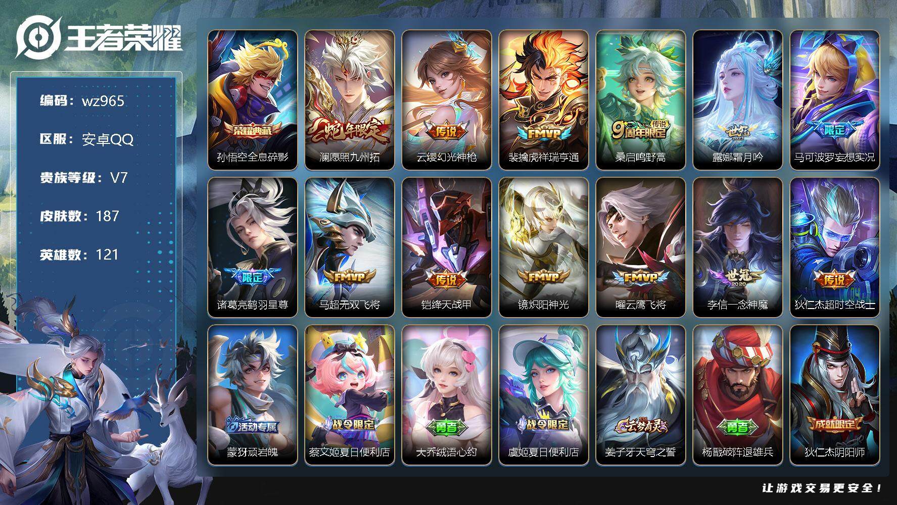 【账号佳】 【可二次实名】【wz965】【商品标题】:安卓Q-V7-永恒钻石III段位-121英雄-187皮肤-1典藏-0珍品无双-0无双-0珍品传说-13传说-48史诗 【荣耀典藏】:孙悟空全息碎影 【传说皮肤】:澜愿照九州拓,云缨幻光神枪,裴擒虎祥瑞亨通,桑启鸣野蒿,露娜霜月吟,马可波罗妄想实况,诸葛亮鹤羽星尊,马超无双飞将,铠绛天战甲,镜炽阳神光,曜云鹰飞将,李信一念神魔,狄仁杰超时空战士 【限定皮肤】:蒙犽顽岩魄,蔡文姬夏日便利店,大乔绒语心约,虞姬夏日便利店,姜子牙天穹之誓,杨戬破阵退雄兵,狄仁杰阴阳师,赵云皇家上将,孙尚香蔷薇恋人,阿轲迷踪丽影,吕布猎兽之王,典韦蓝屏警告,马可波罗妄想实况,狄仁杰魔术师,项羽海滩派对,貂蝉逐梦之音,孙悟空大圣娶亲,孙悟空孙行者,李元芳银河之约,诸葛亮鹤羽星尊,裴擒虎李小龙,云中君纤云弄巧,猪八戒西部大镖客,鲁班大师探海日志,艾琳流音漫舞,司空震地狱燃心,阿古朵江河有灵,张良古海寻踪,高渐离燃音魔法,妲己灵卜魔法,鬼谷子天穹祈灯,伽罗琥珀纪元,沈梦溪龙舞盛年,鲁班七号蔬乡物语,李元芳蔬乡物语,刘邦剑破天穹,程咬金群星魔术团,关羽决胜骁骑,镜青焰无极,项羽苍威无极,刘备异域游侠,周瑜熔金海岸 【赛季限定】:张良古海寻踪,鲁班大师探海日志,鬼谷子天穹祈灯,刘邦剑破天穹,姜子牙天穹之誓 【战令限定】:蔡文姬夏日便利店,虞姬夏日便利店,阿轲迷踪丽影,吕布猎兽之王,典韦蓝屏警告,艾琳流音漫舞,李元芳银河之约,猪八戒西部大镖客,司空震地狱燃心,高渐离燃音魔法,妲己灵卜魔法,鲁班七号蔬乡物语,李元芳蔬乡物语,镜青焰无极,项羽苍威无极 【史诗皮肤】:鲁班七号电玩小子,露娜紫霞仙子,赵云皇家上将,赵云未来纪元,甄姬冰雪圆舞曲,狄仁杰魔术师,宫本武藏鬼剑武藏,孙尚香蔷薇恋人,孙尚香水果甜心,嬴政摇滚巨星,妲己魅力维加斯,妲己女仆咖啡,吕布末日机甲,张飞乱世虎臣,貂蝉逐梦之音,花木兰水晶猎龙者,夏侯惇乘风破浪,兰陵王暗隐猎兽者,诸葛亮黄金分割率,百里守约特工魅影,蔡文姬舞动绿茵,刘禅天才门将,孙悟空大圣娶亲,典韦蓝屏警告,狄仁杰鹰眼统帅,李元芳银河之约,阿轲迷踪丽影,裴擒虎李小龙,云中君纤云弄巧,沈梦溪月团寄思,孙悟空孙行者,澜赏金猎手,司空震地狱燃心,阿古朵江河有灵,妲己灵卜魔法,高渐离燃音魔法,伽罗琥珀纪元,鲁班七号蔬乡物语,镜青焰无极,关羽决胜骁骑,黄忠怒海争锋,蔡文姬夏日便利店,蒙犽顽岩魄,亚连破空之剑,百里守约百相守梦,孙膑茶境仙,赵怀真器灵浮梦炉,狂铁龙之律动,黄忠百相守梦 【其他皮肤】:项羽海滩派对,韩信教廷特使,韩信街头霸王,露娜哥特玫瑰,达摩大发明家,赵云白执事,赵云忍炎影,芈月红桃皇后,安琪拉玩偶对对碰,孙膑天使之翼,妲己少女阿狸,典韦黄金武士,亚瑟死亡骑士,张飞五福同心,宫本武藏万象初新,后羿阿尔法小队,狄仁杰阴阳师,刘备汉昭烈帝,钟无艳海滩丽影,王昭君幻想奇妙夜,狂铁命运角斗场,老夫子功夫老勺,诸葛亮掌控之力,李白敏锐之力,苏烈坚韧之力,大乔守护之力,吕布猎兽之王,姜子牙炽热元素使,哪吒次元突破,盾山圆桌骑士,猪八戒西部大镖客,狂铁特工战影,廉颇无尽征程,刘禅秘密基地,杨戬次元傲视,露娜瓷语鉴心,鲁班大师乓乓大师,马可波罗潮玩牛仔,程咬金无双福将,蒙犽胡桃狂想曲,猪八戒潮玩探月行,鲁班大师探海日志,姬小满零食大作战,艾琳流音漫舞,张良古海寻踪,钟无艳聚星闪耀,海月王牌新星,亚连破局者,后羿完美运算,鬼谷子天穹祈灯,妲己灵卜魔法,海诺时空谍影,嫦娥漠中幻影,朵莉亚金色潮汐,沈梦溪龙舞盛年,钟无艳春野之旅,李元芳蔬乡物语,扁鹊无尽旅途,刘邦剑破天穹,盘古经纬探寻者,程咬金群星魔术团,项羽苍威无极,大司命暗都幽影,刘备异域游侠,杨戬破阵退雄兵,貂蝉长夏之忆,姜子牙天穹之誓,周瑜熔金海岸,虞姬夏日便利店,大乔绒语心约,孙悟空神迹守卫,盘古敬我三分,东皇太一噬灭天穹,老夫子百相守梦,苍苍林狼骑,太乙真人谧流熔炉,典韦铁骨偃魂,马超访茗客,西施雪境奇遇,姜子牙星梦巡礼,东皇太一金福满堂,达摩爆裂喵拳,少司缘灵卦秘语,明世隐景韶洛都,戈娅玫蓝誓约,刘备浪漫序章,钟馗虚灵犬护,苏烈春野闲踪,张良灵野札记,阿古朵布丁狗之约,露娜命运加冕,姬小满小满鸭,白起死霸装,莱西奥踏浪烽翎,鬼谷子克喵,钟无艳生化警戒,貂蝉异域舞娘,曹操超能战警,孙悟空西部大镖客,钟馗地府判官,马可波罗激情绿茵,苍维京掠夺者,东皇太一东海龙王,干将莫邪第七人偶,铠龙域领主,百里守约绝影神枪,百里玄策威尼斯狂欢,梦奇美梦成真,公孙离花间舞,杨玉环霓裳曲,裴擒虎街头旋风,米莱狄精准探案法,元歌午夜歌剧院,司马懿魇语军师,李信灼热之刃,上官婉儿修竹墨客,嫦娥露花倒影,盘古创世神祝,马超幸存者,西施归虚梦演,镜冰刃幻境,澜孤猎,司空震启蛰,暃碧珀绯影,桑启画