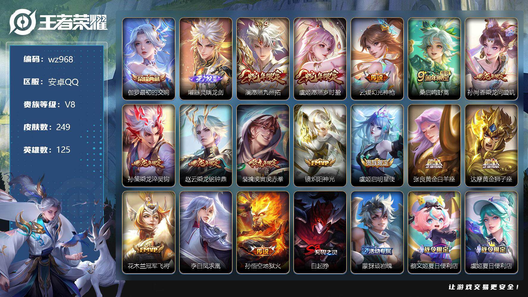 【账号佳】 【可二次实名】【wz968】【商品标题】:安卓Q-V8-最强王者段位-125英雄-249皮肤-1典藏-0珍品无双-1无双-0珍品传说-15传说-68史诗 【荣耀典藏】:伽罗最初的交响 【无双皮肤】:曜器灵螭龙剑 【传说皮肤】:澜愿照九州拓,虞姬愿照岁时盈,云缨幻光神枪,桑启鸣野蒿,孙尚香乘龙问璇玑,孙策乘龙淬吴钩,赵云乘龙铭钟鼎,裴擒虎寅虎赤拳,镜炽阳神光,虞姬启明星使,张良黄金白羊座,达摩黄金狮子座,花木兰冠军飞将,李白凤求凰,孙悟空地狱火 【限定皮肤】:白起狰,蒙犽顽岩魄,蔡文姬夏日便利店,虞姬夏日便利店,姜子牙天穹之誓,狄仁杰阴阳师,虞姬凯尔特女王,赵云皇家上将,嬴政白昼王子,孙尚香蔷薇恋人,芈月重明,吕布猎兽之王,周瑜赤莲之焰,元歌无心,夏侯惇朔风刀,甄姬游园惊梦,曹操烛龙,典韦穷奇,马可波罗暗影游猎,狄仁杰魔术师,狄仁杰万华元夜,达摩沙漠行僧,项羽海滩派对,老夫子醍醐杖,关羽冰锋战神,程咬金演武夺筹,兰陵王金庭之子,孙悟空大圣娶亲,牛魔御旌,李元芳云中旅人,虞姬启明星使,钟馗驱傩正仪,干将莫邪冰霜恋舞曲,雅典娜黎明之约,太乙真人饕餮,鬼谷子原初探秘者,鬼谷子五谷丰年,铠青龙志,苏烈千军破阵,百里玄策原初追逐者,弈星混沌棋,公孙离蜜橘之夏,沈梦溪大漠名商,明世隐疑决卦,裴擒虎李小龙,裴擒虎寅虎赤拳,狂铁御狮,米莱狄御霄,盾山御銮,上官婉儿梁祝,蒙犽狂想玩偶喵,鲁班大师探海日志,桑启海盐诗旅,张良古海寻踪,高渐离燃音魔法,妲己灵卜魔法,鬼谷子天穹祈灯,伽罗琥珀纪元,孙尚香乘龙问璇玑,孙策乘龙淬吴钩,赵云乘龙铭钟鼎,百里玄策超元猎域,鲁班七号蔬乡物语,李元芳蔬乡物语,刘邦剑破天穹 【年限皮肤】:铠青龙志,裴擒虎寅虎赤拳,李白凤求凰,马超神威,孙尚香乘龙问璇玑,孙策乘龙淬吴钩,赵云乘龙铭钟鼎 【赛季限定】:白起狰,芈月重明,夏侯惇朔风刀,曹操烛龙,典韦穷奇,狄仁杰万华元夜,达摩沙漠行僧,老夫子醍醐杖,程咬金演武夺筹,兰陵王金庭之子,张良古海寻踪,牛魔御旌,李元芳云中旅人,虞姬凯尔特女王,钟馗驱傩正仪,雅典娜黎明之约,太乙真人饕餮,鬼谷子原初探秘者,苏烈千军破阵,百里玄策原初追逐者,弈星混沌棋,沈梦溪大漠名商,明世隐疑决卦,狂铁御狮,米莱狄御霄,盾山御銮,鲁班大师探海日志,桑启海盐诗旅,鬼谷子天穹祈灯,刘邦剑破天穹,姜子牙天穹之誓 【战令限定】:蔡文姬夏日便利店,虞姬夏日便利店,嬴政白昼王子,吕布猎兽之王,周瑜赤莲之焰,马可波罗暗影游猎,蒙犽狂想玩偶喵,高渐离燃音魔法,妲己灵卜魔法,鲁班七号蔬乡物语,李元芳蔬乡物语 【史诗皮肤】:露娜紫霞仙子,赵云皇家上将,貂蝉圣诞恋歌,甄姬冰雪圆舞曲,王昭君偶像歌手,狄仁杰魔术师,宫本武藏鬼剑武藏,孙尚香蔷薇恋人,孙尚香水果甜心,嬴政摇滚巨星,妲己魅力维加斯,墨子龙骑士,墨子金属风暴,吕布圣诞狂欢,刘禅绅士熊喵,曹操幽灵船长,李白千年之狐,吕布末日机甲,韩信白龙吟,关羽冰锋战神,花木兰水晶猎龙者,夏侯惇乘风破浪,兰陵王暗隐猎兽者,诸葛亮黄金分割率,甄姬游园惊梦,雅典娜冰冠公主,百里守约特工魅影,公孙离蜜橘之夏,李元芳逐浪之夏,白起星夜王子,阿轲节奏热浪,嬴政白昼王子,孙策猫狗日记,铠青龙志,干将莫邪冰霜恋舞曲,孙悟空大圣娶亲,狄仁杰鹰眼统帅,上官婉儿梁祝,不知火舞魅语,马超神威,马可波罗暗影游猎,蒙犽狂想玩偶喵,百里玄策原初追逐者,裴擒虎李小龙,蒙犽龙鼓争鸣,杨戬天秀启明,司马懿暗渊魔法,雅典娜黎明之约,夏洛特永昼,鬼谷子五谷丰年,元歌无心,妲己灵卜魔法,高渐离燃音魔法,伽罗琥珀纪元,百里玄策超元猎域,鲁班七号蔬乡物语,蔡文姬夏日便利店,蒙犽顽岩魄,姬小满战舞者,亚连破空之剑,百里守约百相守梦,孙膑茶境仙,弈星万物之道,赵怀真器灵浮梦炉,刘禅鸭鸭历险记,狂铁龙之律动,周瑜百相守梦,黄忠百相守梦,弈星守夜人 【其他皮肤】:项羽海滩派对,韩信教廷特使,韩信街头霸王,露娜哥特玫瑰,阿轲爱心护理,达摩大发明家,赵云白执事,赵云忍炎影,白起白色死神,牛魔西部大镖客,扁鹊化身博士,扁鹊救世之瞳,安琪拉玩偶对对碰,孙膑天使之翼,姜子牙时尚教父,妲己少女阿狸,亚瑟死亡骑士,达摩拳王,花木兰兔女郎,张飞五福同心,甄姬花好人间,宫本武藏万象初新,狄仁杰阴阳师,刘备汉昭烈帝,关羽龙腾万里,虞姬凯尔特女王,白起狰,钟无艳海滩丽影,太乙真人饕餮,宫本武藏霸王丸,曹操烛龙,王昭君幻想奇妙夜,芈月重明,老夫子功夫老勺,孙尚香沉稳之力,典韦穷奇,鬼谷子幻乐之宴,狂铁御狮,苏烈坚韧之力,米莱狄御霄,吕布猎兽之王,明世隐虹云星官,牛魔御旌,盾山御銮,沈梦溪鲨炮海盗猫,姜子牙炽热元素使,夏侯惇朔风刀,周瑜赤莲之焰,弈星混沌棋,哪吒次元突破,明世隐疑决卦,盾山圆桌骑士,老夫子醍醐杖,狂铁特工战影,廉颇无尽征程,鬼谷子原初探秘者,狄仁杰万华元