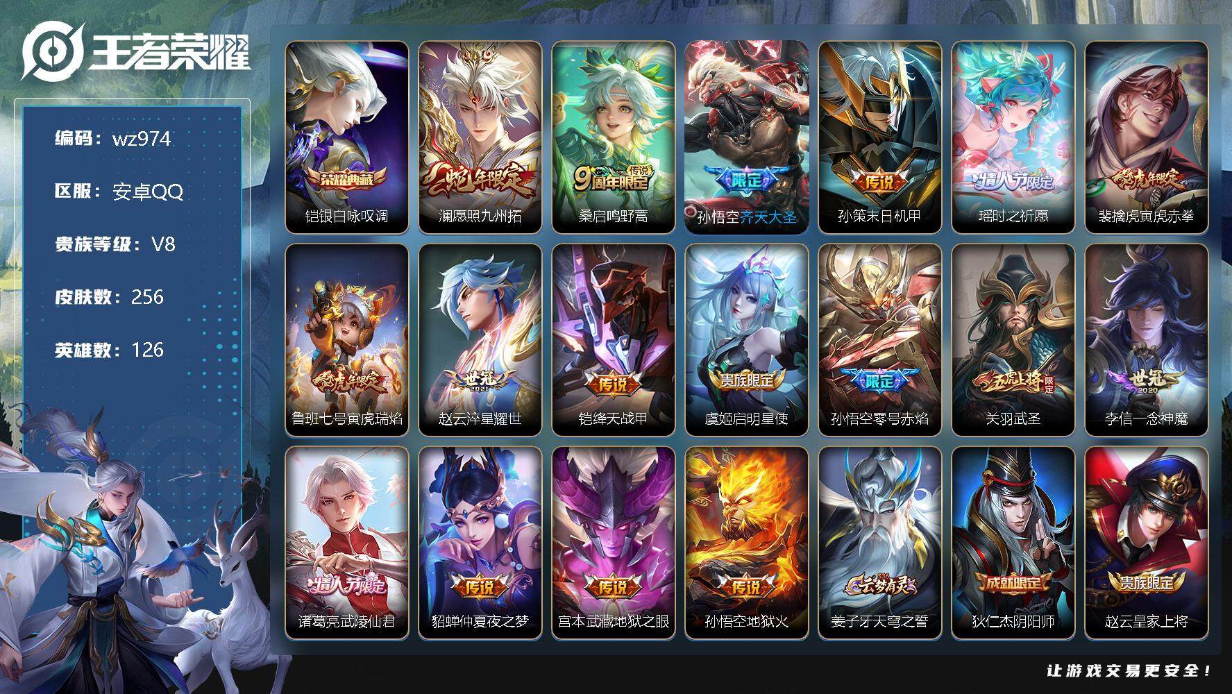 【账号佳】 【可二次实名】【wz974】【商品标题】:安卓Q-V8-永恒钻石II段位-126英雄-256皮肤-1典藏-0珍品无双-0无双-0珍品传说-17传说-75史诗 【荣耀典藏】:铠银白咏叹调 【传说皮肤】:澜愿照九州拓,桑启鸣野蒿,孙悟空齐天大圣,孙策末日机甲,瑶时之祈愿,裴擒虎寅虎赤拳,鲁班七号寅虎瑞焰,赵云淬星耀世,铠绛天战甲,虞姬启明星使,孙悟空零号赤焰,关羽武圣,李信一念神魔,诸葛亮武陵仙君,貂蝉仲夏夜之梦,宫本武藏地狱之眼,孙悟空地狱火 【限定皮肤】:姜子牙天穹之誓,狄仁杰阴阳师,赵云皇家上将,嬴政优雅恋人,鲁班七号寅虎瑞焰,高渐离玩趣恶龙,钟无艳超时空战士,白起夜都怪侠,芈月幻夜卜梦,周瑜真爱至上,元歌无心,甄姬落雪兰心,典韦岱宗,狄仁杰魔术师,达摩沙漠行僧,项羽海滩派对,关羽武圣,露娜一生所爱,韩信傲雪梅枪,兰陵王金庭之子,孙悟空美猴王,孙悟空零号赤焰,孙悟空孙行者,孙悟空齐天大圣,后羿圣弓游侠,李元芳云中旅人,虞姬启明星使,钟馗驱傩正仪,干将莫邪真爱魔法,鬼谷子五谷丰年,诸葛亮武陵仙君,黄忠火炮绅士,苏烈千军破阵,沈梦溪星空之诺,沈梦溪大漠名商,明世隐吟游魔法,裴擒虎李小龙,裴擒虎寅虎赤拳,裴擒虎擒涛扼浪,瑶时之祈愿,云中君时之祈愿,猪八戒猪悟能,上官婉儿神器万象笔,西施玲珑珍味,鲁班大师探海日志,镜匿光追影者,桑启海盐诗旅,戈娅驭风魔法,阿古朵江河有灵,张良古海寻踪,蒙犽百解令,鬼谷子天穹祈灯,沈梦溪龙舞盛年,刘邦剑破天穹,周瑜熔金海岸 【年限皮肤】:孙悟空美猴王,裴擒虎寅虎赤拳,鲁班七号寅虎瑞焰,典韦岱宗,关羽武圣 【赛季限定】:达摩沙漠行僧,兰陵王金庭之子,张良古海寻踪,李元芳云中旅人,钟馗驱傩正仪,苏烈千军破阵,沈梦溪大漠名商,裴擒虎擒涛扼浪,鲁班大师探海日志,桑启海盐诗旅,鬼谷子天穹祈灯,刘邦剑破天穹,姜子牙天穹之誓 【战令限定】:钟无艳超时空战士,白起夜都怪侠,芈月幻夜卜梦,甄姬落雪兰心,后羿圣弓游侠,干将莫邪真爱魔法,黄忠火炮绅士,沈梦溪星空之诺,明世隐吟游魔法,西施玲珑珍味,戈娅驭风魔法 【史诗皮肤】:赵云皇家上将,赵云未来纪元,甄姬冰雪圆舞曲,王昭君偶像歌手,狄仁杰魔术师,廉颇地狱岩魂,宫本武藏鬼剑武藏,孙尚香水果甜心,嬴政优雅恋人,嬴政摇滚巨星,妲己魅力维加斯,妲己女仆咖啡,墨子金属风暴,吕布圣诞狂欢,刘禅绅士熊喵,周瑜真爱至上,吕布末日机甲,张飞乱世虎臣,花木兰水晶猎龙者,刘邦德古拉伯爵,夏侯惇乘风破浪,小乔缤纷独角兽,兰陵王暗隐猎兽者,亚瑟心灵战警,雅典娜冰冠公主,安琪拉心灵骇客,百里守约特工魅影,铠曙光守护者,蔡文姬舞动绿茵,李元芳逐浪之夏,程咬金功夫厨神,白起星夜王子,阿轲节奏热浪,孙策猫狗日记,大乔猫狗日记,露娜一生所爱,伽罗箭羽风息,狄仁杰鹰眼统帅,娜可露露晚萤,典韦岱宗,橘右京修罗,裴擒虎李小龙,百里玄策热力回旋,杨戬天秀启明,干将莫邪真爱魔法,钟馗乐园奇幻夜,孙悟空孙行者,猪八戒猪悟能,司马懿暗渊魔法,镜匿光追影者,黄忠火炮绅士,韩信傲雪梅枪,云中君时之祈愿,澜赏金猎手,明世隐吟游魔法,钟无艳超时空战士,鬼谷子五谷丰年,上官婉儿神器万象笔,元歌无心,刘禅电玩爆裂旋风,戈娅驭风魔法,阿古朵江河有灵,蒙犽百解令,亚连破空之剑,马可波罗星界特工,艾琳陌上桑,百里守约百相守梦,孙膑茶境仙,刘禅鸭鸭历险记,狂铁龙之律动,扁鹊灵蛊蚀心,后羿石田雨龙,云缨赞萌露比,黄忠百相守梦,公孙离涂山容容 【其他皮肤】:项羽海滩派对,韩信教廷特使,韩信街头霸王,露娜哥特玫瑰,赵云白执事,赵云忍炎影,芈月红桃皇后,牛魔西部大镖客,扁鹊化身博士,孙膑天使之翼,姜子牙时尚教父,妲己少女阿狸,典韦黄金武士,亚瑟死亡骑士,达摩拳王,孙悟空美猴王,花木兰兔女郎,甄姬花好人间,刘备万事如意,宫本武藏万象初新,狄仁杰阴阳师,刘备纽约教父,刘备汉昭烈帝,关羽龙腾万里,钟无艳海滩丽影,王昭君幻想奇妙夜,狂铁命运角斗场,老夫子功夫老勺,孙尚香沉稳之力,诸葛亮掌控之力,李白敏锐之力,鬼谷子幻乐之宴,苏烈坚韧之力,大乔守护之力,明世隐虹云星官,吕布野性能量,高渐离玩趣恶龙,沈梦溪鲨炮海盗猫,沈梦溪星空之诺,哪吒次元突破,狂铁特工战影,刘禅秘密基地,杨戬次元傲视,张良缤纷绘卷,钟馗驱傩正仪,鲁班大师乓乓大师,苏烈千军破阵,后羿圣弓游侠,典韦铁甲之心,妲己紫罗兰之誓,马可波罗潮玩牛仔,达摩沙漠行僧,芈月幻夜卜梦,程咬金无双福将,刘邦虎啸剑宗,白起夜都怪侠,兰陵王金庭之子,刘禅唤灵魔甲,米莱狄契约魔法,沈梦溪大漠名商,蒙恬蔚蓝守将,甄姬落雪兰心,李元芳云中旅人,桑启海盐诗旅,海月幻泉雾影,猪八戒潮玩探月行,白起乐园追猎者,裴擒虎擒涛扼浪,太乙真人劲辣红锅,莱西奥西部游侠,鲁班大师探海日志,西施玲珑珍味,姬小满零食大作战,李元芳妄想特派,哪吒热血海滩