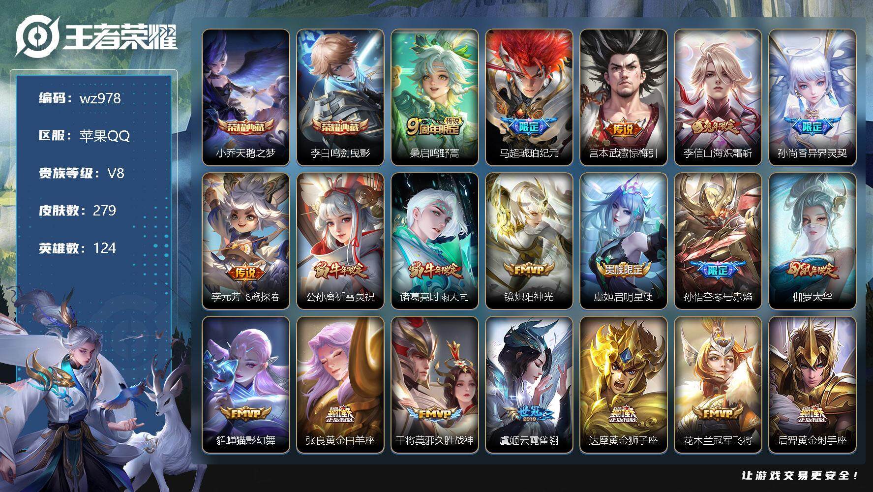 【账号佳】 【可二次实名】【wz978】【商品标题】:苹果Q-V8-永恒钻石IV段位-124英雄-279皮肤-2典藏-0珍品无双-0无双-0珍品传说-22传说-80史诗 【荣耀典藏】:小乔天鹅之梦,李白鸣剑曳影 【传说皮肤】:桑启鸣野蒿,马超琥珀纪元,宫本武藏惊梅引,李信山海炽霜斩,孙尚香异界灵契,李元芳飞鸢探春,公孙离祈雪灵祝,诸葛亮时雨天司,镜炽阳神光,虞姬启明星使,孙悟空零号赤焰,伽罗太华,貂蝉猫影幻舞,张良黄金白羊座,干将莫邪久胜战神,虞姬云霓雀翎,达摩黄金狮子座,花木兰冠军飞将,后羿黄金射手座,孙尚香末日机甲,孙悟空地狱火,狄仁杰超时空战士 【限定皮肤】:姜子牙天穹之誓,狄仁杰阴阳师,赵云皇家上将,墨子神迹守卫,妲己时之彼端,嬴政白昼王子,孙尚香蔷薇恋人,孙尚香异界灵契,鲁班七号狮舞东方,孙膑天狼运算者,芈月幻夜卜梦,吕布猎兽之王,周瑜赤莲之焰,元歌云间偶戏,夏侯惇朔风刀,甄姬幽恒,典韦蓝屏警告,典韦岱宗,马可波罗逐梦之星,马可波罗暗影游猎,狄仁杰魔术师,狄仁杰万华元夜,达摩星际陆战队,达摩沙漠行僧,项羽海滩派对,老夫子醍醐杖,老夫子航海奇遇记,程咬金演武夺筹,韩信飞衡,王昭君凤凰于飞,兰陵王驯魔猎人,兰陵王金庭之子,花木兰默契交锋,亚瑟潮玩骑士王,孙悟空零号赤焰,牛魔御旌,后羿如梦令,后羿圣弓游侠,李元芳银河之约,李元芳匿光侦查者,李元芳云中旅人,虞姬启明星使,钟馗神迹守卫,钟馗驱傩正仪,杨玉环遇见飞天,女娲朔望之晖,干将莫邪冰霜恋舞曲,干将莫邪真爱魔法,雅典娜单词大作战,雅典娜黎明之约,蔡文姬繁星吟游,太乙真人华丽摇滚,鬼谷子原初探秘者,诸葛亮时雨天司,大乔白鹤梁神女,黄忠火炮绅士,苏烈千军破阵,百里玄策原初追逐者,百里守约朱雀志,弈星混沌棋,公孙离蜜橘之夏,公孙离祈雪灵祝,公孙离玉兔公主,沈梦溪星空之诺,沈梦溪大漠名商,明世隐疑决卦,裴擒虎李小龙,裴擒虎擒涛扼浪,狂铁御狮,米莱狄御霄,米莱狄胡桃异想国,云中君纤云弄巧,李信山海炽霜斩,伽罗太华,伽罗天狼溯光者,盾山御銮,猪八戒西部大镖客,上官婉儿梁祝,蒙犽狂想玩偶喵,鲁班大师探海日志,镜匿光追影者,桑启海盐诗旅,艾琳女武神,艾琳流音漫舞,司空震地狱燃心,阿古朵江河有灵,张良古海寻踪,蒙犽百解令,鬼谷子天穹祈灯,伽罗琥珀纪元,马超琥珀纪元,刘邦剑破天穹,周瑜熔金海岸 【年限皮肤】:百里守约朱雀志,王昭君凤凰于飞,公孙离祈雪灵祝,诸葛亮时雨天司,伽罗太华,甄姬幽恒,韩信飞衡,典韦岱宗,李信山海炽霜斩 【赛季限定】:夏侯惇朔风刀,狄仁杰万华元夜,达摩沙漠行僧,老夫子醍醐杖,程咬金演武夺筹,兰陵王金庭之子,张良古海寻踪,牛魔御旌,李元芳云中旅人,钟馗驱傩正仪,雅典娜黎明之约,鬼谷子原初探秘者,苏烈千军破阵,百里玄策原初追逐者,弈星混沌棋,沈梦溪大漠名商,明世隐疑决卦,裴擒虎擒涛扼浪,狂铁御狮,米莱狄御霄,盾山御銮,鲁班大师探海日志,桑启海盐诗旅,鬼谷子天穹祈灯,刘邦剑破天穹,姜子牙天穹之誓 【战令限定】:墨子神迹守卫,嬴政白昼王子,鲁班七号狮舞东方,芈月幻夜卜梦,吕布猎兽之王,周瑜赤莲之焰,元歌云间偶戏,典韦蓝屏警告,马可波罗暗影游猎,达摩星际陆战队,老夫子航海奇遇记,兰陵王驯魔猎人,艾琳流音漫舞,亚瑟潮玩骑士王,后羿圣弓游侠,李元芳银河之约,钟馗神迹守卫,女娲朔望之晖,干将莫邪真爱魔法,雅典娜单词大作战,黄忠火炮绅士,沈梦溪星空之诺,米莱狄胡桃异想国,猪八戒西部大镖客,蒙犽狂想玩偶喵,司空震地狱燃心 【史诗皮肤】:鲁班七号电玩小子,阿轲暗夜猫娘,赵云皇家上将,赵云未来纪元,甄姬冰雪圆舞曲,王昭君偶像歌手,狄仁杰魔术师,廉颇地狱岩魂,宫本武藏鬼剑武藏,孙尚香蔷薇恋人,孙尚香水果甜心,嬴政暗夜贵公子,嬴政摇滚巨星,妲己魅力维加斯,妲己女仆咖啡,墨子金属风暴,吕布圣诞狂欢,曹操幽灵船长,李白千年之狐,张飞乱世虎臣,王昭君凤凰于飞,刘邦德古拉伯爵,夏侯惇乘风破浪,兰陵王暗隐猎兽者,诸葛亮黄金分割率,马可波罗逐梦之星,亚瑟心灵战警,雅典娜冰冠公主,安琪拉心灵骇客,百里守约特工魅影,铠曙光守护者,刘禅天才门将,公孙离蜜橘之夏,李元芳逐浪之夏,程咬金功夫厨神,白起星夜王子,阿轲节奏热浪,杨玉环遇见飞天,嬴政白昼王子,孙策猫狗日记,百里守约朱雀志,干将莫邪冰霜恋舞曲,典韦蓝屏警告,鲁班七号狮舞东方,狄仁杰鹰眼统帅,公孙离无限星赏官,兰陵王驯魔猎人,上官婉儿梁祝,蔡文姬繁星吟游,李元芳银河之约,韩信飞衡,典韦岱宗,妲己时之彼端,甄姬幽恒,后羿如梦令,不知火舞魅语,马可波罗暗影游猎,蒙犽狂想玩偶喵,百里玄策原初追逐者,裴擒虎李小龙,云中君纤云弄巧,孙膑天狼运算者,元歌云间偶戏,花木兰默契交锋,米莱狄胡桃异想国,老夫子航海奇遇记,伽罗天狼溯光者,大乔白鹤梁神女,干将莫邪真爱魔法,镜匿光追影者,黄忠火炮绅士,雅典