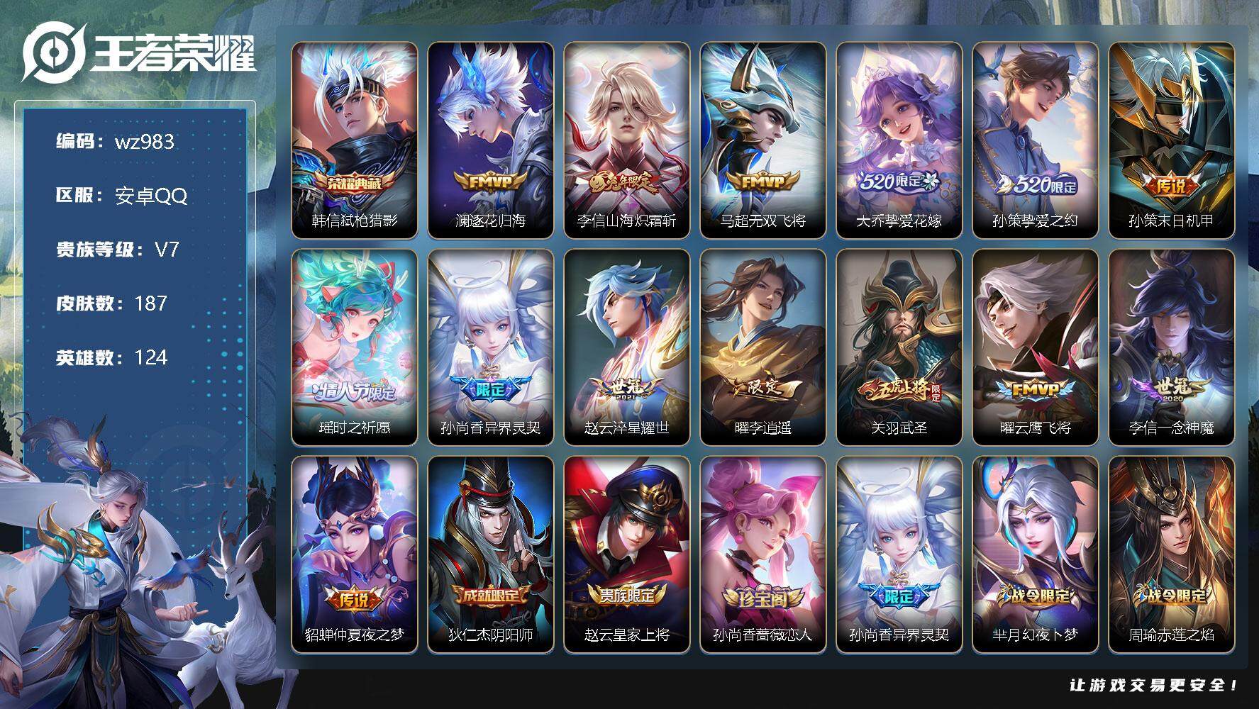 【账号佳】 【可二次实名】【wz983】【商品标题】:安卓Q-V7-永恒钻石I段位-124英雄-187皮肤-1典藏-0珍品无双-0无双-0珍品传说-14传说-40史诗 【荣耀典藏】:韩信弑枪猎影 【传说皮肤】:澜逐花归海,李信山海炽霜斩,马超无双飞将,大乔挚爱花嫁,孙策挚爱之约,孙策末日机甲,瑶时之祈愿,孙尚香异界灵契,赵云淬星耀世,曜李逍遥 ,关羽武圣,曜云鹰飞将,李信一念神魔,貂蝉仲夏夜之梦 【限定皮肤】:狄仁杰阴阳师,赵云皇家上将,孙尚香蔷薇恋人,孙尚香异界灵契,芈月幻夜卜梦,周瑜赤莲之焰,元歌云间偶戏,元歌无心,夏侯惇朔风刀,曹操天狼征服者,典韦岱宗,马可波罗暗影游猎,马可波罗山海玄木吟,狄仁杰魔术师,狄仁杰万华元夜,达摩沙漠行僧,项羽海滩派对,老夫子醍醐杖,关羽武圣,程咬金演武夺筹,韩信逐梦之影,韩信飞衡,韩信傲雪梅枪,兰陵王驯魔猎人,兰陵王金庭之子,亚瑟潮玩骑士王,孙悟空孙行者,牛魔御旌,李元芳银河之约,李元芳云中旅人,钟馗驱傩正仪,雅典娜单词大作战,雅典娜黎明之约,蔡文姬繁星吟游,鬼谷子原初探秘者,鬼谷子五谷丰年,大乔挚爱花嫁,黄忠火炮绅士,苏烈千军破阵,百里玄策原初追逐者,百里守约朱雀志,弈星混沌棋,梦奇顽趣,沈梦溪星空之诺,沈梦溪大漠名商,明世隐疑决卦,裴擒虎李小龙,裴擒虎擒涛扼浪,米莱狄御霄,瑶时之祈愿,云中君纤云弄巧,李信山海炽霜斩,盾山御銮,孙策挚爱之约,猪八戒西部大镖客,上官婉儿梁祝,曜李逍遥 ,蒙犽狂想玩偶喵,鲁班大师探海日志,桑启海盐诗旅,张良古海寻踪,蒙恬荣光圣徽,鬼谷子天穹祈灯 【年限皮肤】:百里守约朱雀志,韩信飞衡,典韦岱宗,关羽武圣,马可波罗山海玄木吟,李信山海炽霜斩 【赛季限定】:夏侯惇朔风刀,狄仁杰万华元夜,达摩沙漠行僧,老夫子醍醐杖,程咬金演武夺筹,兰陵王金庭之子,张良古海寻踪,牛魔御旌,李元芳云中旅人,钟馗驱傩正仪,雅典娜黎明之约,鬼谷子原初探秘者,苏烈千军破阵,百里玄策原初追逐者,弈星混沌棋,梦奇顽趣,沈梦溪大漠名商,明世隐疑决卦,裴擒虎擒涛扼浪,米莱狄御霄,盾山御銮,鲁班大师探海日志,桑启海盐诗旅,鬼谷子天穹祈灯,蒙恬荣光圣徽 【战令限定】:芈月幻夜卜梦,周瑜赤莲之焰,元歌云间偶戏,马可波罗暗影游猎,兰陵王驯魔猎人,亚瑟潮玩骑士王,李元芳银河之约,雅典娜单词大作战,黄忠火炮绅士,沈梦溪星空之诺,猪八戒西部大镖客,蒙犽狂想玩偶喵 【史诗皮肤】:赵云皇家上将,狄仁杰魔术师,廉颇地狱岩魂,宫本武藏鬼剑武藏,孙尚香蔷薇恋人,孙尚香水果甜心,妲己魅力维加斯,妲己女仆咖啡,墨子金属风暴,花木兰水晶猎龙者,韩信逐梦之影,小乔缤纷独角兽,诸葛亮黄金分割率,百里守约特工魅影,孙策猫狗日记,百里守约朱雀志,狄仁杰鹰眼统帅,兰陵王驯魔猎人,上官婉儿梁祝,曹操天狼征服者,蔡文姬繁星吟游,李元芳银河之约,韩信飞衡,典韦岱宗,马可波罗暗影游猎,蒙犽狂想玩偶喵,百里玄策原初追逐者,裴擒虎李小龙,云中君纤云弄巧,元歌云间偶戏,孙悟空孙行者,黄忠火炮绅士,雅典娜黎明之约,韩信傲雪梅枪,鬼谷子五谷丰年,元歌无心,梦奇顽趣,马可波罗山海玄木吟,蒙恬荣光圣徽,公孙离涂山容容 【其他皮肤】:项羽海滩派对,韩信教廷特使,韩信街头霸王,达摩大发明家,赵云忍炎影,牛魔西部大镖客,扁鹊化身博士,安琪拉玩偶对对碰,典韦黄金武士,亚瑟死亡骑士,达摩拳王,花木兰兔女郎,张飞五福同心,甄姬花好人间,刘备万事如意,宫本武藏万象初新,后羿阿尔法小队,狄仁杰阴阳师,刘备纽约教父,刘备汉昭烈帝,关羽龙腾万里,墨子进击墨子号,钟无艳海滩丽影,宫本武藏霸王丸,老夫子功夫老勺,孙尚香沉稳之力,诸葛亮掌控之力,苏烈坚韧之力,大乔守护之力,米莱狄御霄,明世隐虹云星官,牛魔御旌,吕布野性能量,盾山御銮,孙膑归虚梦演,沈梦溪鲨炮海盗猫,夏侯惇朔风刀,周瑜赤莲之焰,沈梦溪星空之诺,弈星混沌棋,哪吒次元突破,鲁班七号黑桃队长,明世隐疑决卦,盾山圆桌骑士,老夫子醍醐杖,猪八戒西部大镖客,鬼谷子原初探秘者,雅典娜单词大作战,狄仁杰万华元夜,亚瑟潮玩骑士王,刘禅秘密基地,杨戬次元傲视,露娜瓷语鉴心,程咬金演武夺筹,张良缤纷绘卷,钟馗驱傩正仪,鲁班大师乓乓大师,苏烈千军破阵,典韦铁甲之心,马可波罗潮玩牛仔,达摩沙漠行僧,芈月幻夜卜梦,兰陵王金庭之子,刘禅唤灵魔甲,沈梦溪大漠名商,李元芳云中旅人,戈娅危途狂花,刘备潮玩造梦师,桑启海盐诗旅,海月幻泉雾影,牛魔牛运亨通,裴擒虎擒涛扼浪,莱西奥西部游侠,鲁班大师探海日志,张良古海寻踪,后羿完美运算,鬼谷子天穹祈灯,海诺时空谍影,廉颇功夫炙烤,姜子牙星梦巡礼,钟馗虚灵犬护,甄姬逆浪荇歌,鲁班七号木偶奇遇记,高渐离金属狂潮,貂蝉异域舞娘,花木兰剑舞者,程咬金华尔街大亨,王昭君精灵公主,狄仁杰锦衣卫,小乔万圣前夜,孙膑未来旅行,孙悟空西部大镖客,周瑜海