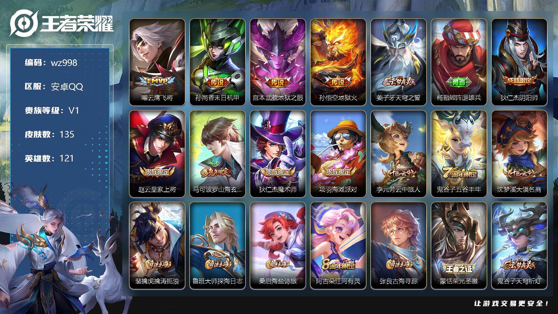【账号佳】 【可二次实名】【wz998】【商品标题】:安卓Q-V1-永恒钻石I段位-121英雄-135皮肤-0典藏-0珍品无双-0无双-0珍品传说-4传说-27史诗 【传说皮肤】:曜云鹰飞将,孙尚香末日机甲,宫本武藏地狱之眼,孙悟空地狱火 【限定皮肤】:姜子牙天穹之誓,杨戬破阵退雄兵,狄仁杰阴阳师,赵云皇家上将,马可波罗山海玄木吟,狄仁杰魔术师,项羽海滩派对,李元芳云中旅人,鬼谷子五谷丰年,沈梦溪大漠名商,裴擒虎擒涛扼浪,鲁班大师探海日志,桑启海盐诗旅,阿古朵江河有灵,张良古海寻踪,蒙恬荣光圣徽,鬼谷子天穹祈灯,伽罗琥珀纪元,姬小满妄想食味,沈梦溪龙舞盛年,刘邦剑破天穹,程咬金群星魔术团,周瑜熔金海岸 【年限皮肤】:马可波罗山海玄木吟 【赛季限定】:张良古海寻踪,李元芳云中旅人,沈梦溪大漠名商,裴擒虎擒涛扼浪,鲁班大师探海日志,桑启海盐诗旅,鬼谷子天穹祈灯,蒙恬荣光圣徽,刘邦剑破天穹,姜子牙天穹之誓 【史诗皮肤】:赵云皇家上将,甄姬冰雪圆舞曲,狄仁杰魔术师,廉颇地狱岩魂,宫本武藏鬼剑武藏,孙尚香水果甜心,嬴政摇滚巨星,墨子金属风暴,吕布圣诞狂欢,刘禅绅士熊喵,张飞乱世虎臣,花木兰水晶猎龙者,兰陵王暗隐猎兽者,铠曙光守护者,白起星夜王子,大乔猫狗日记,狄仁杰鹰眼统帅,鬼谷子五谷丰年,马可波罗山海玄木吟,刘禅电玩爆裂旋风,阿古朵江河有灵,蒙恬荣光圣徽,伽罗琥珀纪元,姬小满妄想食味,黄忠怒海争锋,阿轲化蝶舞,黄忠百相守梦 【其他皮肤】:项羽海滩派对,韩信街头霸王,赵云忍炎影,芈月红桃皇后,程咬金星际陆战队,白起白色死神,牛魔西部大镖客,扁鹊救世之瞳,安琪拉玩偶对对碰,孙膑天使之翼,妲己少女阿狸,典韦黄金武士,亚瑟死亡骑士,花木兰兔女郎,宫本武藏万象初新,狄仁杰阴阳师,刘备汉昭烈帝,关羽龙腾万里,钟无艳海滩丽影,王昭君幻想奇妙夜,老夫子功夫老勺,孙尚香沉稳之力,诸葛亮掌控之力,李白敏锐之力,苏烈坚韧之力,大乔守护之力,明世隐虹云星官,张良幽兰居士,姜子牙炽热元素使,哪吒次元突破,狂铁特工战影,露娜瓷语鉴心,鲁班大师乓乓大师,沈梦溪大漠名商,蒙恬蔚蓝守将,李元芳云中旅人,刘备潮玩造梦师,桑启海盐诗旅,海月幻泉雾影,猪八戒潮玩探月行,牛魔牛运亨通,裴擒虎擒涛扼浪,太乙真人劲辣红锅,鲁班大师探海日志,李元芳妄想特派,哪吒热血海滩,张良古海寻踪,亚连破局者,后羿完美运算,鬼谷子天穹祈灯,嫦娥漠中幻影,朵莉亚金色潮汐,亚瑟鸿运当头,沈梦溪龙舞盛年,钟无艳春野之旅,扁鹊无尽旅途,刘邦剑破天穹,盘古经纬探寻者,程咬金群星魔术团,大司命暗都幽影,杨戬破阵退雄兵,姜子牙天穹之誓,周瑜熔金海岸,东皇太一噬灭天穹,苍苍林狼骑,太乙真人谧流熔炉,典韦铁骨偃魂,明世隐景韶洛都,戈娅玫蓝誓约,刘备浪漫序章,钟馗虚灵犬护,苏烈春野闲踪,张良灵野札记,甄姬逆浪荇歌,云中君云械蓝图,庄周锦麟游梦,莱西奥踏浪烽翎,鬼谷子克喵,哪吒罗小黑战记,鲁班七号木偶奇遇记,项羽帝国元帅,貂蝉异域舞娘,曹操超能战警,后羿精灵王,李白范海辛,虞姬加勒比小姐,夏侯惇战争骑士,马可波罗激情绿茵,黄忠芝加哥教父,百里守约绝影神枪,百里玄策威尼斯狂欢,女娲尼罗河女神,杨玉环霓裳曲,弈星踏雪寻梅,司马懿魇语军师,云中君荷鲁斯之眼,马超幸存者,蒙犽归虚梦演,澜孤猎,司空震启蛰,云缨赤焰之缨,暃碧珀绯影 【内测皮肤】:狂铁特工战影 【营地ID】:1847593359