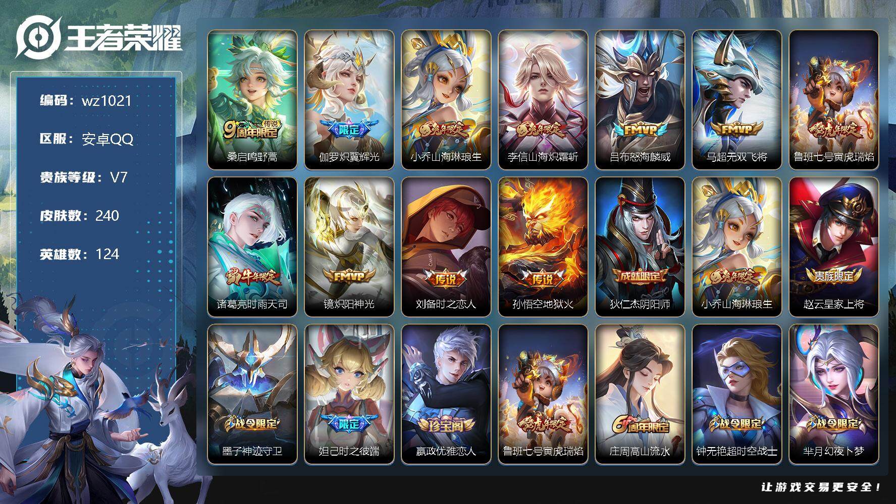 【账号佳】 【可二次实名】【wz1021】【商品标题】:安卓Q-V7-至尊星耀III段位-124英雄-240皮肤-0典藏-0珍品无双-0无双-0珍品传说-11传说-58史诗 【传说皮肤】:桑启鸣野蒿,伽罗炽翼辉光,小乔山海琳琅生,李信山海炽霜斩,吕布怒海麟威,马超无双飞将,鲁班七号寅虎瑞焰,诸葛亮时雨天司,镜炽阳神光,刘备时之恋人,孙悟空地狱火 【限定皮肤】:狄仁杰阴阳师,小乔山海琳琅生,赵云皇家上将,墨子神迹守卫,妲己时之彼端,嬴政优雅恋人,鲁班七号寅虎瑞焰,庄周高山流水,钟无艳超时空战士,芈月幻夜卜梦,元歌云间偶戏,元歌无心,夏侯惇朔风刀,甄姬游园惊梦,甄姬落雪兰心,马可波罗暗影游猎,狄仁杰魔术师,狄仁杰万华元夜,达摩星际陆战队,达摩沙漠行僧,项羽海滩派对,老夫子醍醐杖,老夫子航海奇遇记,程咬金演武夺筹,王昭君午后时光,兰陵王金庭之子,亚瑟潮玩骑士王,牛魔御旌,后羿辉光之辰,后羿圣弓游侠,刘备百相守梦,李元芳云中旅人,虞姬霸王别姬,钟馗驱傩正仪,干将莫邪真爱魔法,蔡文姬繁星吟游,鬼谷子原初探秘者,鬼谷子五谷丰年,诸葛亮时雨天司,黄忠火炮绅士,苏烈千军破阵,弈星混沌棋,沈梦溪大漠名商,明世隐疑决卦,裴擒虎李小龙,裴擒虎擒涛扼浪,狂铁电玩高手,米莱狄胡桃异想国,云中君纤云弄巧,李信山海炽霜斩,伽罗天狼溯光者,伽罗炽翼辉光,猪八戒西部大镖客,上官婉儿梁祝,嫦娥拒霜思,嫦娥暖冬兔眠,鲁班大师探海日志,镜匿光追影者,桑启海盐诗旅,暃星界游侠,艾琳女武神,张良古海寻踪,蒙犽百解令,鬼谷子天穹祈灯,刘邦剑破天穹,程咬金群星魔术团,周瑜熔金海岸 【年限皮肤】:鲁班七号寅虎瑞焰,后羿辉光之辰,诸葛亮时雨天司,李信山海炽霜斩,小乔山海琳琅生,伽罗炽翼辉光 【赛季限定】:夏侯惇朔风刀,狄仁杰万华元夜,达摩沙漠行僧,老夫子醍醐杖,程咬金演武夺筹,兰陵王金庭之子,张良古海寻踪,牛魔御旌,李元芳云中旅人,钟馗驱傩正仪,鬼谷子原初探秘者,苏烈千军破阵,弈星混沌棋,沈梦溪大漠名商,明世隐疑决卦,裴擒虎擒涛扼浪,鲁班大师探海日志,桑启海盐诗旅,鬼谷子天穹祈灯,刘邦剑破天穹 【战令限定】:墨子神迹守卫,钟无艳超时空战士,芈月幻夜卜梦,元歌云间偶戏,甄姬落雪兰心,马可波罗暗影游猎,达摩星际陆战队,老夫子航海奇遇记,王昭君午后时光,亚瑟潮玩骑士王,后羿圣弓游侠,干将莫邪真爱魔法,黄忠火炮绅士,狂铁电玩高手,米莱狄胡桃异想国,猪八戒西部大镖客,嫦娥暖冬兔眠,暃星界游侠 【史诗皮肤】:露娜紫霞仙子,赵云皇家上将,赵云未来纪元,貂蝉圣诞恋歌,王昭君偶像歌手,狄仁杰魔术师,宫本武藏鬼剑武藏,孙尚香水果甜心,嬴政优雅恋人,妲己魅力维加斯,妲己女仆咖啡,墨子金属风暴,刘禅绅士熊喵,曹操幽灵船长,张飞乱世虎臣,虞姬霸王别姬,花木兰水晶猎龙者,刘邦德古拉伯爵,夏侯惇乘风破浪,甄姬游园惊梦,亚瑟心灵战警,安琪拉心灵骇客,后羿辉光之辰,百里守约特工魅影,铠曙光守护者,李元芳逐浪之夏,程咬金功夫厨神,白起星夜王子,阿轲节奏热浪,孙策猫狗日记,狄仁杰鹰眼统帅,上官婉儿梁祝,蔡文姬繁星吟游,妲己时之彼端,橘右京修罗,瑶遇见神鹿,马可波罗暗影游猎,裴擒虎李小龙,云中君纤云弄巧,元歌云间偶戏,米莱狄胡桃异想国,老夫子航海奇遇记,伽罗天狼溯光者,干将莫邪真爱魔法,庄周高山流水,嫦娥拒霜思,镜匿光追影者,黄忠火炮绅士,狂铁电玩高手,钟无艳超时空战士,鬼谷子五谷丰年,元歌无心,暃星界游侠,刘备百相守梦,刘禅电玩爆裂旋风,蒙犽百解令,阿轲化蝶舞,后羿石田雨龙 【其他皮肤】:项羽海滩派对,韩信教廷特使,韩信街头霸王,阿轲爱心护理,达摩大发明家,赵云忍炎影,芈月红桃皇后,艾琳女武神,程咬金爱与正义,白起白色死神,武则天东方不败,扁鹊化身博士,安琪拉玩偶对对碰,孙膑天使之翼,姜子牙时尚教父,妲己少女阿狸,典韦黄金武士,亚瑟死亡骑士,花木兰兔女郎,张飞五福同心,甄姬花好人间,刘备万事如意,宫本武藏万象初新,后羿阿尔法小队,狄仁杰阴阳师,刘备纽约教父,刘备汉昭烈帝,关羽龙腾万里,墨子进击墨子号,钟无艳海滩丽影,宫本武藏霸王丸,狂铁命运角斗场,老夫子功夫老勺,牛魔制霸全明星,孙尚香沉稳之力,诸葛亮掌控之力,李白敏锐之力,鬼谷子幻乐之宴,苏烈坚韧之力,大乔守护之力,项羽科学大爆炸,明世隐虹云星官,庄周奇妙博物学,牛魔御旌,小乔丁香结,吕布野性能量,孙膑归虚梦演,沈梦溪鲨炮海盗猫,姜子牙炽热元素使,夏侯惇朔风刀,弈星混沌棋,哪吒次元突破,鲁班七号黑桃队长,明世隐疑决卦,老夫子醍醐杖,猪八戒西部大镖客,狂铁特工战影,廉颇无尽征程,鬼谷子原初探秘者,狄仁杰万华元夜,亚瑟潮玩骑士王,刘禅秘密基地,杨戬次元傲视,露娜瓷语鉴心,达摩星际陆战队,程咬金演武夺筹,张良缤纷绘卷,盘古重装意志,钟馗驱傩正仪,墨子神迹守卫,鲁班大师乓乓大师,苏烈千军破阵,