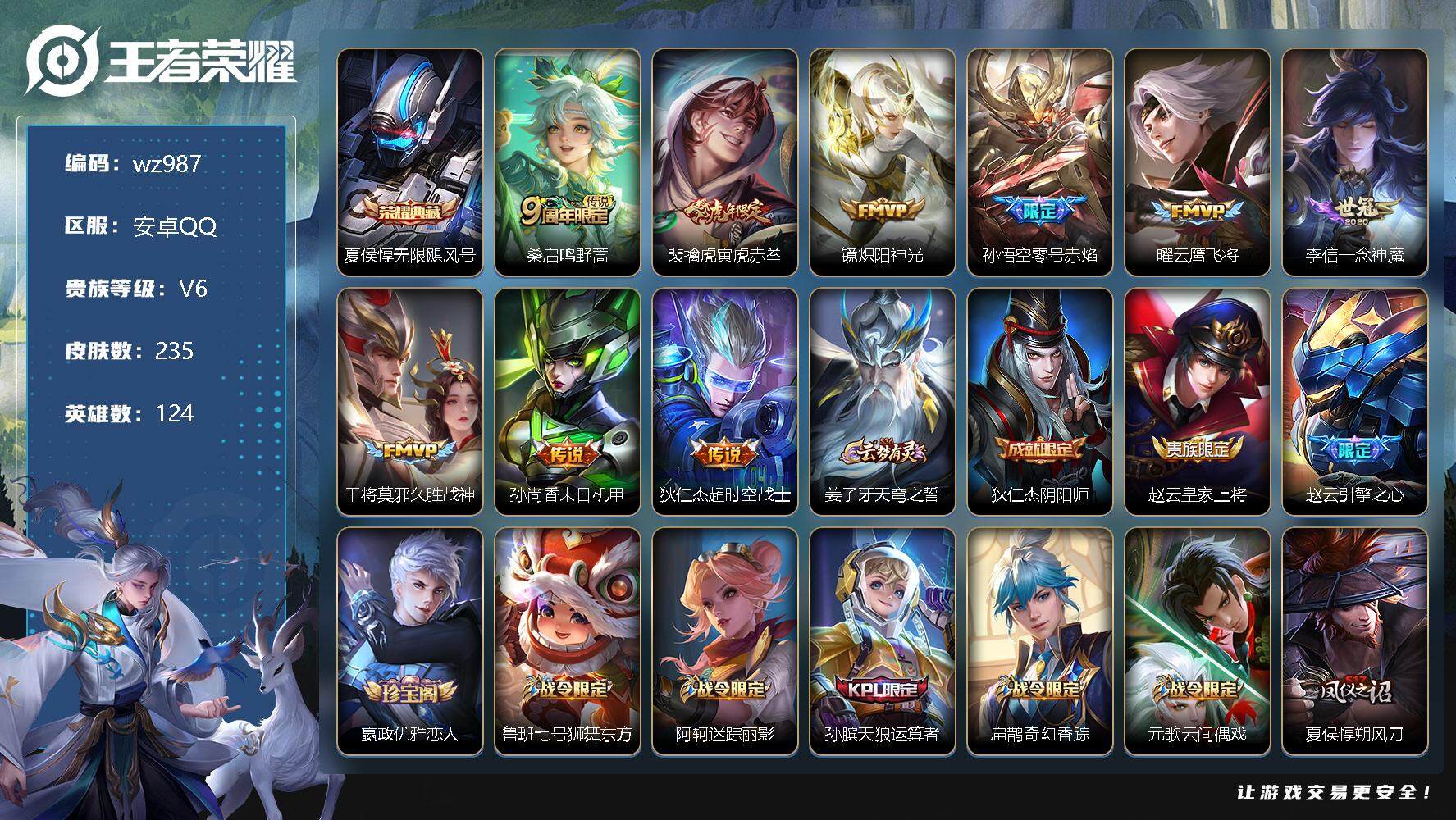 【账号佳】 【可二次实名】【wz987】【商品标题】:安卓Q-V6-最强王者段位-124英雄-235皮肤-1典藏-0珍品无双-0无双-0珍品传说-9传说-70史诗 【荣耀典藏】:夏侯惇无限飓风号 【传说皮肤】:桑启鸣野蒿,裴擒虎寅虎赤拳,镜炽阳神光,孙悟空零号赤焰,曜云鹰飞将,李信一念神魔,干将莫邪久胜战神,孙尚香末日机甲,狄仁杰超时空战士 【限定皮肤】:姜子牙天穹之誓,狄仁杰阴阳师,赵云皇家上将,赵云引擎之心,嬴政优雅恋人,鲁班七号狮舞东方,阿轲迷踪丽影,孙膑天狼运算者,扁鹊奇幻香踪,元歌云间偶戏,夏侯惇朔风刀,甄姬落雪兰心,典韦穷奇,典韦蓝屏警告,马可波罗暗影游猎,狄仁杰魔术师,狄仁杰万华元夜,达摩星际陆战队,达摩沙漠行僧,项羽海滩派对,老夫子醍醐杖,程咬金演武夺筹,刘邦夺宝奇兵,亚瑟潮玩骑士王,孙悟空至尊宝,孙悟空零号赤焰,牛魔御旌,李元芳云中旅人,钟馗神迹守卫,钟馗驱傩正仪,杨玉环遇见飞天,杨戬潮玩骑兵,女娲朔望之晖,雅典娜单词大作战,雅典娜黎明之约,蔡文姬繁星吟游,鬼谷子原初探秘者,鬼谷子五谷丰年,苏烈千军破阵,百里玄策原初追逐者,弈星混沌棋,公孙离蜜橘之夏,沈梦溪大漠名商,明世隐疑决卦,裴擒虎天狼狩猎者,裴擒虎李小龙,裴擒虎寅虎赤拳,裴擒虎擒涛扼浪,狂铁御狮,米莱狄胡桃异想国,云中君纤云弄巧,盾山御銮,猪八戒西部大镖客,上官婉儿梁祝,上官婉儿天狼绘梦者,嫦娥拒霜思,嫦娥暖冬兔眠,西施玲珑珍味,蒙犽狂想玩偶喵,鲁班大师探海日志,桑启海盐诗旅,暃星界游侠,戈娅驭风魔法,艾琳女武神,艾琳流音漫舞,司空震地狱燃心,阿古朵江河有灵,张良古海寻踪,蒙犽百解令,蒙恬荣光圣徽,高渐离燃音魔法,妲己灵卜魔法,鬼谷子天穹祈灯,刘邦剑破天穹,程咬金群星魔术团 【年限皮肤】:裴擒虎寅虎赤拳 【赛季限定】:夏侯惇朔风刀,典韦穷奇,狄仁杰万华元夜,达摩沙漠行僧,老夫子醍醐杖,程咬金演武夺筹,张良古海寻踪,牛魔御旌,李元芳云中旅人,钟馗驱傩正仪,雅典娜黎明之约,鬼谷子原初探秘者,苏烈千军破阵,百里玄策原初追逐者,弈星混沌棋,沈梦溪大漠名商,明世隐疑决卦,裴擒虎擒涛扼浪,狂铁御狮,盾山御銮,鲁班大师探海日志,桑启海盐诗旅,鬼谷子天穹祈灯,蒙恬荣光圣徽,刘邦剑破天穹,姜子牙天穹之誓 【战令限定】:鲁班七号狮舞东方,阿轲迷踪丽影,扁鹊奇幻香踪,元歌云间偶戏,甄姬落雪兰心,典韦蓝屏警告,马可波罗暗影游猎,达摩星际陆战队,刘邦夺宝奇兵,艾琳流音漫舞,亚瑟潮玩骑士王,钟馗神迹守卫,杨戬潮玩骑兵,女娲朔望之晖,雅典娜单词大作战,米莱狄胡桃异想国,猪八戒西部大镖客,嫦娥暖冬兔眠,西施玲珑珍味,蒙犽狂想玩偶喵,司空震地狱燃心,暃星界游侠,戈娅驭风魔法,高渐离燃音魔法,妲己灵卜魔法 【史诗皮肤】:鲁班七号电玩小子,露娜紫霞仙子,阿轲暗夜猫娘,赵云皇家上将,貂蝉圣诞恋歌,甄姬冰雪圆舞曲,狄仁杰魔术师,宫本武藏鬼剑武藏,孙尚香水果甜心,嬴政优雅恋人,妲己魅力维加斯,妲己女仆咖啡,墨子金属风暴,吕布圣诞狂欢,曹操幽灵船长,李白千年之狐,吕布末日机甲,张飞乱世虎臣,韩信白龙吟,孙悟空至尊宝,赵云引擎之心,花木兰水晶猎龙者,刘邦德古拉伯爵,兰陵王暗隐猎兽者,诸葛亮黄金分割率,雅典娜冰冠公主,百里守约特工魅影,刘禅天才门将,公孙离蜜橘之夏,李元芳逐浪之夏,白起星夜王子,阿轲节奏热浪,杨玉环遇见飞天,孙策猫狗日记,典韦蓝屏警告,伽罗箭羽风息,裴擒虎天狼狩猎者,鲁班七号狮舞东方,狄仁杰鹰眼统帅,上官婉儿梁祝,蔡文姬繁星吟游,小乔青蛇,不知火舞魅语,阿轲迷踪丽影,上官婉儿天狼绘梦者,马可波罗暗影游猎,蒙犽狂想玩偶喵,百里玄策原初追逐者,裴擒虎李小龙,云中君纤云弄巧,孙膑天狼运算者,元歌云间偶戏,米莱狄胡桃异想国,嫦娥拒霜思,雅典娜黎明之约,鬼谷子五谷丰年,暃星界游侠,扁鹊奇幻香踪,戈娅驭风魔法,司空震地狱燃心,阿古朵江河有灵,蒙犽百解令,妲己灵卜魔法,高渐离燃音魔法,蒙恬荣光圣徽,亚连破空之剑,百里守约百相守梦,阿轲化蝶舞,狂铁龙之律动,后羿石田雨龙,黄忠百相守梦 【其他皮肤】:项羽海滩派对,韩信教廷特使,韩信街头霸王,露娜哥特玫瑰,达摩大发明家,赵云忍炎影,艾琳女武神,牛魔西部大镖客,扁鹊化身博士,扁鹊救世之瞳,姜子牙时尚教父,妲己少女阿狸,亚瑟死亡骑士,达摩拳王,花木兰兔女郎,后羿阿尔法小队,狄仁杰阴阳师,刘备纽约教父,刘备汉昭烈帝,关羽龙腾万里,钟无艳海滩丽影,宫本武藏霸王丸,王昭君幻想奇妙夜,狂铁命运角斗场,老夫子功夫老勺,典韦穷奇,诸葛亮掌控之力,李白敏锐之力,鬼谷子幻乐之宴,狂铁御狮,苏烈坚韧之力,大乔守护之力,项羽科学大爆炸,明世隐虹云星官,牛魔御旌,女娲朔望之晖,吕布野性能量,钟馗神迹守卫,盾山御銮,孙膑归虚梦演,沈梦溪鲨炮海盗猫,夏侯惇朔风刀,弈星混沌棋,哪吒次元突破,明世隐疑决卦,刘