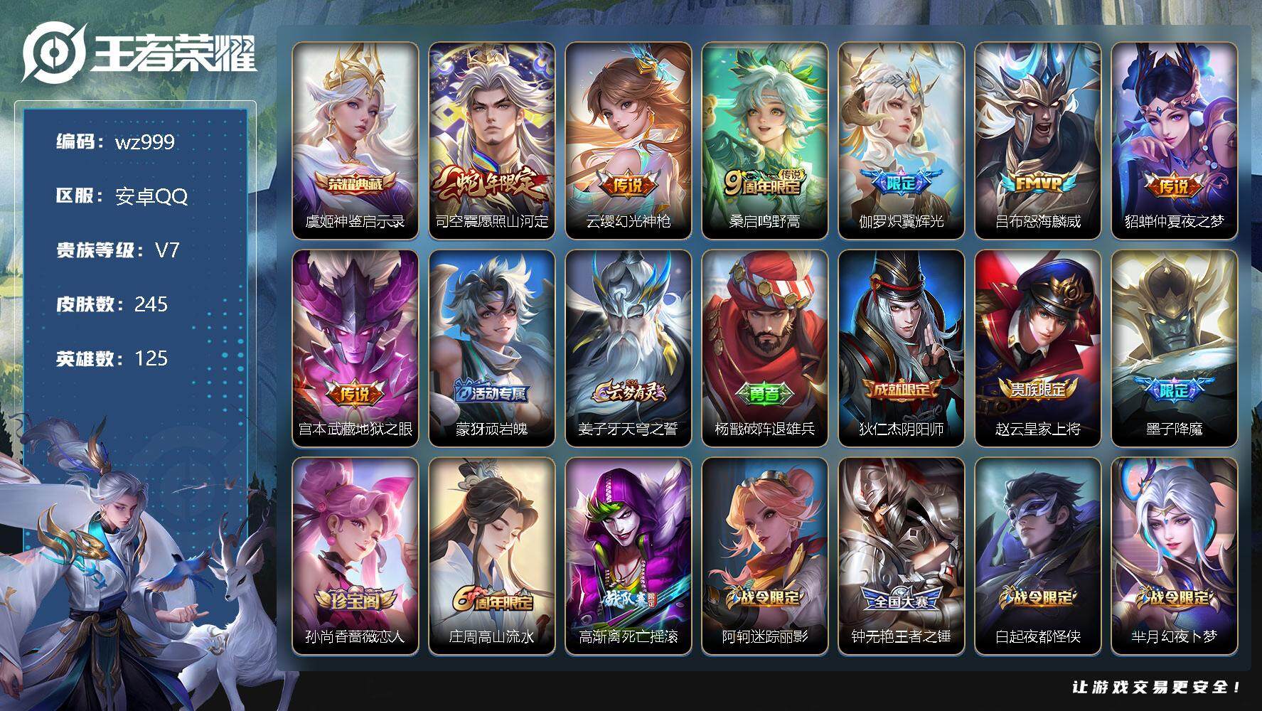 【账号佳】 【可二次实名】【wz999】【商品标题】:安卓Q-V7-最强王者段位-125英雄-245皮肤-1典藏-0珍品无双-0无双-0珍品传说-7传说-82史诗 【荣耀典藏】:虞姬神鉴启示录 【传说皮肤】:司空震愿照山河定,云缨幻光神枪,桑启鸣野蒿,伽罗炽翼辉光,吕布怒海麟威,貂蝉仲夏夜之梦,宫本武藏地狱之眼 【限定皮肤】:蒙犽顽岩魄,姜子牙天穹之誓,杨戬破阵退雄兵,狄仁杰阴阳师,赵云皇家上将,墨子降魔,孙尚香蔷薇恋人,庄周高山流水,高渐离死亡摇滚,阿轲迷踪丽影,钟无艳王者之锤,白起夜都怪侠,芈月幻夜卜梦,元歌云间偶戏,元歌无心,马可波罗暗影游猎,马可波罗山海玄木吟,狄仁杰魔术师,狄仁杰万华元夜,达摩沙漠行僧,项羽海滩派对,程咬金演武夺筹,王昭君午后时光,兰陵王金庭之子,李元芳云中旅人,钟馗驱傩正仪,鬼谷子原初探秘者,鬼谷子五谷丰年,黄忠火炮绅士,苏烈千军破阵,百里玄策原初追逐者,梦奇顽趣,沈梦溪大漠名商,明世隐吟游魔法,裴擒虎李小龙,裴擒虎擒涛扼浪,狂铁电玩高手,云中君纤云弄巧,伽罗炽翼辉光,上官婉儿梁祝,嫦娥拒霜思,嫦娥暖冬兔眠,西施玲珑珍味,蒙犽狂想玩偶喵,鲁班大师探海日志,桑启海盐诗旅,暃星界游侠,阿古朵江河有灵,张良古海寻踪,蒙犽百解令,蒙恬荣光圣徽,高渐离燃音魔法,妲己灵卜魔法,鬼谷子天穹祈灯,姬小满妄想食味,沈梦溪龙舞盛年,刘邦剑破天穹,程咬金群星魔术团,镜青焰无极,周瑜熔金海岸 【年限皮肤】:马可波罗山海玄木吟,伽罗炽翼辉光 【赛季限定】:狄仁杰万华元夜,达摩沙漠行僧,程咬金演武夺筹,兰陵王金庭之子,张良古海寻踪,李元芳云中旅人,钟馗驱傩正仪,鬼谷子原初探秘者,苏烈千军破阵,百里玄策原初追逐者,梦奇顽趣,沈梦溪大漠名商,裴擒虎擒涛扼浪,鲁班大师探海日志,桑启海盐诗旅,鬼谷子天穹祈灯,蒙恬荣光圣徽,刘邦剑破天穹,姜子牙天穹之誓 【战令限定】:阿轲迷踪丽影,白起夜都怪侠,芈月幻夜卜梦,元歌云间偶戏,马可波罗暗影游猎,王昭君午后时光,黄忠火炮绅士,明世隐吟游魔法,狂铁电玩高手,嫦娥暖冬兔眠,西施玲珑珍味,蒙犽狂想玩偶喵,暃星界游侠,高渐离燃音魔法,妲己灵卜魔法,镜青焰无极 【史诗皮肤】:项羽苍穹之光,露娜紫霞仙子,钟无艳王者之锤,赵云皇家上将,赵云未来纪元,貂蝉圣诞恋歌,甄姬冰雪圆舞曲,王昭君偶像歌手,狄仁杰魔术师,廉颇地狱岩魂,宫本武藏鬼剑武藏,孙尚香蔷薇恋人,孙尚香水果甜心,嬴政暗夜贵公子,嬴政摇滚巨星,妲己魅力维加斯,妲己女仆咖啡,墨子金属风暴,曹操幽灵船长,李白千年之狐,吕布末日机甲,张飞乱世虎臣,韩信白龙吟,花木兰水晶猎龙者,刘邦德古拉伯爵,夏侯惇乘风破浪,小乔缤纷独角兽,兰陵王暗隐猎兽者,亚瑟心灵战警,安琪拉心灵骇客,百里守约特工魅影,蔡文姬舞动绿茵,李元芳逐浪之夏,程咬金功夫厨神,白起星夜王子,孙策猫狗日记,伽罗箭羽风息,狄仁杰鹰眼统帅,上官婉儿梁祝,阿轲迷踪丽影,马可波罗暗影游猎,蒙犽狂想玩偶喵,百里玄策原初追逐者,裴擒虎李小龙,云中君纤云弄巧,元歌云间偶戏,沈梦溪月团寄思,庄周高山流水,司马懿暗渊魔法,嫦娥拒霜思,黄忠火炮绅士,夏洛特永昼,明世隐吟游魔法,高渐离天秀音浪,狂铁电玩高手,鬼谷子五谷丰年,元歌无心,墨子降魔,梦奇顽趣,暃星界游侠,马可波罗山海玄木吟,刘禅电玩爆裂旋风,阿古朵江河有灵,蒙犽百解令,周瑜雪夜绮愿,妲己灵卜魔法,高渐离燃音魔法,蒙恬荣光圣徽,姬小满妄想食味,镜青焰无极,蒙犽顽岩魄,亚连破空之剑,艾琳陌上桑,百里守约百相守梦,牛魔星界战将,孙膑茶境仙,弈星万物之道,赵怀真器灵浮梦炉,刘禅鸭鸭历险记,扁鹊灵蛊蚀心,后羿石田雨龙,周瑜百相守梦,公孙离涂山容容 【其他皮肤】:项羽海滩派对,韩信教廷特使,韩信街头霸王,露娜哥特玫瑰,达摩大发明家,赵云白执事,赵云忍炎影,芈月红桃皇后,程咬金星际陆战队,白起白色死神,牛魔西部大镖客,武则天东方不败,扁鹊化身博士,扁鹊救世之瞳,安琪拉玩偶对对碰,孙膑天使之翼,姜子牙时尚教父,妲己少女阿狸,典韦黄金武士,亚瑟死亡骑士,达摩拳王,花木兰兔女郎,张飞五福同心,甄姬花好人间,刘备万事如意,宫本武藏万象初新,后羿阿尔法小队,狄仁杰阴阳师,刘备纽约教父,高渐离死亡摇滚,关羽龙腾万里,墨子进击墨子号,钟无艳海滩丽影,王昭君幻想奇妙夜,老夫子功夫老勺,孙尚香沉稳之力,诸葛亮掌控之力,李白敏锐之力,鬼谷子幻乐之宴,苏烈坚韧之力,大乔守护之力,明世隐虹云星官,小乔丁香结,吕布野性能量,沈梦溪鲨炮海盗猫,姜子牙炽热元素使,哪吒次元突破,狂铁特工战影,鬼谷子原初探秘者,狄仁杰万华元夜,刘禅秘密基地,程咬金演武夺筹,张良缤纷绘卷,钟馗驱傩正仪,鲁班大师乓乓大师,苏烈千军破阵,达摩沙漠行僧,芈月幻夜卜梦,程咬金无双福将,刘邦虎啸剑宗,白起夜都怪侠,兰陵王金庭之子,刘禅唤灵魔甲,米莱狄契约魔