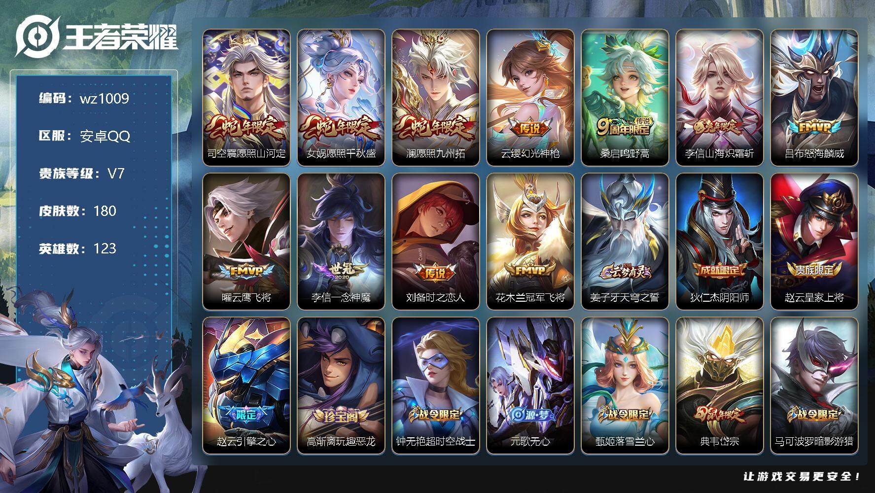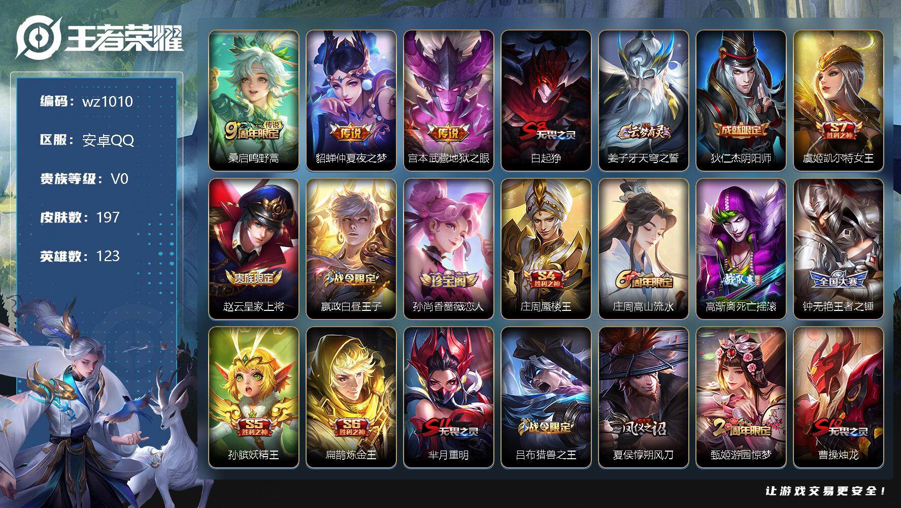 【账号佳】 【可二次实名】【wz1010】【商品标题】:安卓Q-V0-最强王者段位-123英雄-197皮肤-0典藏-0珍品无双-0无双-0珍品传说-3传说-48史诗 【传说皮肤】:桑启鸣野蒿,貂蝉仲夏夜之梦,宫本武藏地狱之眼 【限定皮肤】:白起狰,姜子牙天穹之誓,狄仁杰阴阳师,虞姬凯尔特女王,赵云皇家上将,嬴政白昼王子,孙尚香蔷薇恋人,庄周蜃楼王,庄周高山流水,高渐离死亡摇滚,钟无艳王者之锤,孙膑妖精王,扁鹊炼金王,芈月重明,吕布猎兽之王,夏侯惇朔风刀,甄姬游园惊梦,曹操烛龙,典韦穷奇,狄仁杰万华元夜,达摩沙漠行僧,项羽海滩派对,老夫子醍醐杖,程咬金演武夺筹,韩信傲雪梅枪,兰陵王金庭之子,亚瑟狮心王,亚瑟潮玩骑士王,牛魔御旌,李元芳云中旅人,钟馗驱傩正仪,杨玉环遇见飞天,雅典娜黎明之约,太乙真人饕餮,鬼谷子原初探秘者,鬼谷子五谷丰年,苏烈千军破阵,百里玄策原初追逐者,弈星混沌棋,梦奇顽趣,沈梦溪大漠名商,明世隐疑决卦,裴擒虎李小龙,裴擒虎擒涛扼浪,狂铁御狮,米莱狄御霄,云中君纤云弄巧,上官婉儿梁祝,嫦娥拒霜思,鲁班大师探海日志,桑启海盐诗旅,阿古朵江河有灵,张良古海寻踪,鬼谷子天穹祈灯,沈梦溪龙舞盛年,刘邦剑破天穹 【赛季限定】:庄周蜃楼王,孙膑妖精王,扁鹊炼金王,白起狰,芈月重明,夏侯惇朔风刀,曹操烛龙,典韦穷奇,狄仁杰万华元夜,达摩沙漠行僧,老夫子醍醐杖,程咬金演武夺筹,兰陵王金庭之子,张良古海寻踪,亚瑟狮心王,牛魔御旌,李元芳云中旅人,虞姬凯尔特女王,钟馗驱傩正仪,雅典娜黎明之约,太乙真人饕餮,鬼谷子原初探秘者,苏烈千军破阵,百里玄策原初追逐者,弈星混沌棋,梦奇顽趣,沈梦溪大漠名商,明世隐疑决卦,裴擒虎擒涛扼浪,狂铁御狮,米莱狄御霄,鲁班大师探海日志,桑启海盐诗旅,鬼谷子天穹祈灯,刘邦剑破天穹,姜子牙天穹之誓 【战令限定】:嬴政白昼王子,吕布猎兽之王,亚瑟潮玩骑士王 【史诗皮肤】:露娜紫霞仙子,钟无艳王者之锤,赵云皇家上将,赵云未来纪元,貂蝉圣诞恋歌,甄姬冰雪圆舞曲,王昭君偶像歌手,廉颇地狱岩魂,宫本武藏鬼剑武藏,孙尚香蔷薇恋人,孙尚香水果甜心,嬴政暗夜贵公子,妲己魅力维加斯,妲己女仆咖啡,墨子金属风暴,刘禅绅士熊喵,李白千年之狐,张飞乱世虎臣,花木兰水晶猎龙者,刘邦德古拉伯爵,夏侯惇乘风破浪,小乔缤纷独角兽,兰陵王暗隐猎兽者,甄姬游园惊梦,亚瑟心灵战警,雅典娜冰冠公主,百里守约特工魅影,刘禅天才门将,李元芳逐浪之夏,白起星夜王子,阿轲节奏热浪,杨玉环遇见飞天,嬴政白昼王子,孙策猫狗日记,大乔猫狗日记,狄仁杰鹰眼统帅,上官婉儿梁祝,百里玄策原初追逐者,裴擒虎李小龙,云中君纤云弄巧,庄周高山流水,嫦娥拒霜思,雅典娜黎明之约,韩信傲雪梅枪,鬼谷子五谷丰年,梦奇顽趣,阿古朵江河有灵,黄忠百相守梦 【其他皮肤】:项羽海滩派对,韩信教廷特使,韩信街头霸王,露娜哥特玫瑰,阿轲致命风华,阿轲爱心护理,达摩大发明家,赵云白执事,赵云忍炎影,武则天东方不败,扁鹊化身博士,宫本武藏未来纪元,孙膑天使之翼,姜子牙时尚教父,妲己少女阿狸,典韦黄金武士,亚瑟死亡骑士,达摩拳王,花木兰兔女郎,张飞五福同心,甄姬花好人间,宫本武藏万象初新,亚瑟狮心王,后羿阿尔法小队,狄仁杰阴阳师,庄周蜃楼王,刘备纽约教父,高渐离死亡摇滚,孙膑妖精王,刘备汉昭烈帝,扁鹊炼金王,关羽龙腾万里,虞姬凯尔特女王,白起狰,钟无艳海滩丽影,太乙真人饕餮,宫本武藏霸王丸,曹操烛龙,芈月重明,老夫子功夫老勺,牛魔制霸全明星,典韦穷奇,诸葛亮掌控之力,鬼谷子幻乐之宴,狂铁御狮,米莱狄御霄,吕布猎兽之王,明世隐虹云星官,庄周奇妙博物学,牛魔御旌,小乔丁香结,吕布野性能量,孙膑归虚梦演,沈梦溪鲨炮海盗猫,夏侯惇朔风刀,弈星混沌棋,哪吒次元突破,鲁班七号黑桃队长,明世隐疑决卦,老夫子醍醐杖,狂铁特工战影,鬼谷子原初探秘者,狄仁杰万华元夜,亚瑟潮玩骑士王,刘禅秘密基地,露娜瓷语鉴心,程咬金演武夺筹,张良缤纷绘卷,钟馗驱傩正仪,鲁班大师乓乓大师,苏烈千军破阵,马可波罗潮玩牛仔,达摩沙漠行僧,程咬金无双福将,兰陵王金庭之子,刘禅唤灵魔甲,沈梦溪大漠名商,蒙恬蔚蓝守将,李元芳云中旅人,桑启海盐诗旅,猪八戒潮玩探月行,裴擒虎擒涛扼浪,太乙真人劲辣红锅,鲁班大师探海日志,姬小满零食大作战,张良古海寻踪,鬼谷子天穹祈灯,廉颇功夫炙烤,沈梦溪龙舞盛年,刘邦剑破天穹,姜子牙天穹之誓,盘古敬我三分,东皇太一噬灭天穹,亚瑟动物派对,干将莫邪雾都夜雨,苍苍林狼骑,太乙真人谧流熔炉,典韦铁骨偃魂,影魅影绮裳,姜子牙星梦巡礼,明世隐景韶洛都,戈娅玫蓝誓约,刘备浪漫序章,苏烈春野闲踪,甄姬逆浪荇歌,莱西奥踏浪烽翎,鬼谷子克喵,鲁班七号木偶奇遇记,项羽帝国元帅,钟无艳生化警戒,貂蝉异域舞娘,王昭君精灵公主,狄仁杰锦衣卫,曹操死神来了,曹操超能