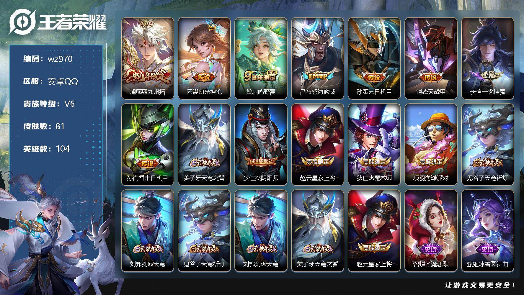 【账号佳】 【可二次实名】【wz970】【商品标题】:安卓Q-V6-永恒钻石II段位-104英雄-81皮肤-0典藏-0珍品无双-0无双-0珍品传说-8传说-18史诗 【传说皮肤】:澜愿照九州拓,云缨幻光神枪,桑启鸣野蒿,吕布怒海麟威,孙策末日机甲,铠绛天战甲,李信一念神魔,孙尚香末日机甲 【限定皮肤】:姜子牙天穹之誓,狄仁杰阴阳师,赵云皇家上将,狄仁杰魔术师,项羽海滩派对,鬼谷子天穹祈灯,刘邦剑破天穹 【赛季限定】:鬼谷子天穹祈灯,刘邦剑破天穹,姜子牙天穹之誓 【史诗皮肤】:赵云皇家上将,貂蝉圣诞恋歌,甄姬冰雪圆舞曲,狄仁杰魔术师,宫本武藏鬼剑武藏,孙尚香水果甜心,墨子金属风暴,花木兰水晶猎龙者,夏侯惇乘风破浪,安琪拉心灵骇客,百里守约特工魅影,孙策猫狗日记,狄仁杰鹰眼统帅,百里守约百相守梦,芈月瑰影绮梦,阿轲化蝶舞,狂铁龙之律动,黄忠百相守梦 【其他皮肤】:项羽海滩派对,韩信街头霸王,赵云忍炎影,白起白色死神,扁鹊救世之瞳,典韦黄金武士,亚瑟死亡骑士,花木兰兔女郎,狄仁杰阴阳师,钟无艳海滩丽影,狂铁命运角斗场,老夫子功夫老勺,李白敏锐之力,小乔丁香结,刘禅秘密基地,鲁班大师乓乓大师,太乙真人劲辣红锅,鬼谷子天穹祈灯,刘邦剑破天穹,大司命暗都幽影,姜子牙天穹之誓,东皇太一噬灭天穹,老夫子百相守梦,干将莫邪雾都夜雨,吕布逐霄战戟,苍苍林狼骑,太乙真人谧流熔炉,典韦铁骨偃魂,西施雪境奇遇,东皇太一金福满堂,明世隐景韶洛都,戈娅玫蓝誓约,刘备浪漫序章,钟馗虚灵犬护,露娜命运加冕,姬小满小满鸭,白起死霸装,甄姬逆浪荇歌,庄周锦麟游梦,莱西奥踏浪烽翎,鬼谷子克喵,哪吒罗小黑战记,鲁班七号木偶奇遇记,小乔万圣前夜,孙悟空西部大镖客,刘禅英喵野望,兰陵王隐刃,马可波罗激情绿茵,苍维京掠夺者,杨戬埃及法老,诸葛亮星航指挥官,东皇太一东海龙王,孙策海之征途,李信灼热之刃,澜孤猎 【营地ID】:1623342325