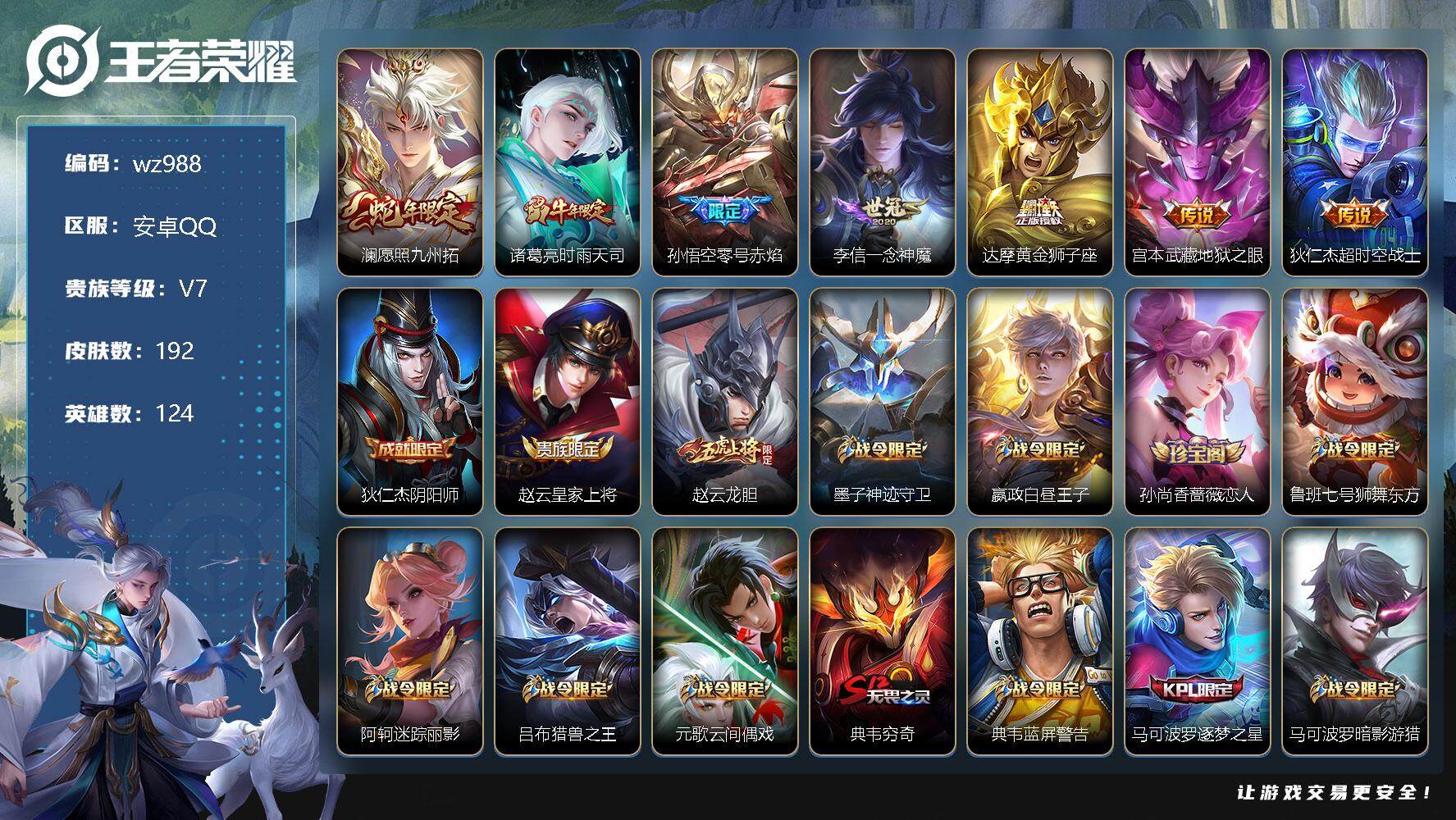 【账号佳】 【可二次实名】【wz988】【商品标题】:安卓Q-V7-至尊星耀II段位-124英雄-192皮肤-0典藏-0珍品无双-0无双-0珍品传说-7传说-57史诗 【传说皮肤】:澜愿照九州拓,诸葛亮时雨天司,孙悟空零号赤焰,李信一念神魔,达摩黄金狮子座,宫本武藏地狱之眼,狄仁杰超时空战士 【限定皮肤】:狄仁杰阴阳师,赵云皇家上将,赵云龙胆,墨子神迹守卫,嬴政白昼王子,孙尚香蔷薇恋人,鲁班七号狮舞东方,阿轲迷踪丽影,吕布猎兽之王,元歌云间偶戏,典韦穷奇,典韦蓝屏警告,马可波罗逐梦之星,马可波罗暗影游猎,狄仁杰魔术师,狄仁杰万华元夜,达摩星际陆战队,项羽海滩派对,老夫子醍醐杖,老夫子航海奇遇记,关羽冰锋战神,程咬金演武夺筹,刘邦夺宝奇兵,韩信逐梦之影,亚瑟潮玩骑士王,孙悟空至尊宝,孙悟空大圣娶亲,孙悟空零号赤焰,牛魔御旌,钟馗神迹守卫,钟馗驱傩正仪,女娲朔望之晖,雅典娜单词大作战,蔡文姬繁星吟游,鬼谷子原初探秘者,鬼谷子五谷丰年,诸葛亮时雨天司,百里守约朱雀志,弈星混沌棋,明世隐疑决卦,裴擒虎李小龙,狂铁御狮,米莱狄御霄,米莱狄胡桃异想国,云中君纤云弄巧,伽罗天狼溯光者,猪八戒西部大镖客,蒙犽狂想玩偶喵,桑启海盐诗旅 【年限皮肤】:百里守约朱雀志,诸葛亮时雨天司,赵云龙胆 【赛季限定】:典韦穷奇,狄仁杰万华元夜,老夫子醍醐杖,程咬金演武夺筹,牛魔御旌,钟馗驱傩正仪,鬼谷子原初探秘者,弈星混沌棋,明世隐疑决卦,狂铁御狮,米莱狄御霄,桑启海盐诗旅 【战令限定】:墨子神迹守卫,嬴政白昼王子,鲁班七号狮舞东方,阿轲迷踪丽影,吕布猎兽之王,元歌云间偶戏,典韦蓝屏警告,马可波罗暗影游猎,达摩星际陆战队,老夫子航海奇遇记,刘邦夺宝奇兵,亚瑟潮玩骑士王,钟馗神迹守卫,女娲朔望之晖,雅典娜单词大作战,米莱狄胡桃异想国,猪八戒西部大镖客,蒙犽狂想玩偶喵 【史诗皮肤】:项羽苍穹之光,露娜紫霞仙子,赵云皇家上将,赵云未来纪元,王昭君偶像歌手,狄仁杰魔术师,宫本武藏鬼剑武藏,孙尚香蔷薇恋人,孙尚香水果甜心,嬴政摇滚巨星,妲己魅力维加斯,妲己女仆咖啡,墨子金属风暴,吕布圣诞狂欢,曹操幽灵船长,李白千年之狐,吕布末日机甲,张飞乱世虎臣,关羽冰锋战神,孙悟空至尊宝,刘邦德古拉伯爵,韩信逐梦之影,兰陵王暗隐猎兽者,诸葛亮黄金分割率,马可波罗逐梦之星,百里守约特工魅影,铠曙光守护者,蔡文姬舞动绿茵,刘禅天才门将,李元芳逐浪之夏,程咬金功夫厨神,嬴政白昼王子,大乔猫狗日记,百里守约朱雀志,孙悟空大圣娶亲,典韦蓝屏警告,鲁班七号狮舞东方,狄仁杰鹰眼统帅,蔡文姬繁星吟游,阿轲迷踪丽影,赵云龙胆,马可波罗暗影游猎,蒙犽狂想玩偶喵,裴擒虎李小龙,云中君纤云弄巧,元歌云间偶戏,米莱狄胡桃异想国,老夫子航海奇遇记,伽罗天狼溯光者,鬼谷子五谷丰年,马可波罗星界特工,孙膑茶境仙,阿轲化蝶舞,刘禅鸭鸭历险记,狂铁龙之律动,扁鹊灵蛊蚀心,牛魔小牛鸭 【其他皮肤】:项羽海滩派对,韩信教廷特使,韩信街头霸王,露娜哥特玫瑰,阿轲爱心护理,达摩大发明家,赵云白执事,赵云忍炎影,芈月红桃皇后,白起白色死神,扁鹊化身博士,扁鹊救世之瞳,宫本武藏未来纪元,安琪拉玩偶对对碰,妲己少女阿狸,典韦黄金武士,亚瑟死亡骑士,达摩拳王,花木兰兔女郎,张飞五福同心,甄姬花好人间,刘备万事如意,宫本武藏万象初新,狄仁杰阴阳师,刘备纽约教父,关羽龙腾万里,钟无艳海滩丽影,老夫子功夫老勺,孙尚香沉稳之力,典韦穷奇,诸葛亮掌控之力,鬼谷子幻乐之宴,狂铁御狮,苏烈坚韧之力,大乔守护之力,米莱狄御霄,吕布猎兽之王,明世隐虹云星官,庄周奇妙博物学,牛魔御旌,女娲朔望之晖,小乔丁香结,吕布野性能量,钟馗神迹守卫,孙膑归虚梦演,沈梦溪鲨炮海盗猫,姜子牙炽热元素使,弈星混沌棋,哪吒次元突破,明世隐疑决卦,刘邦夺宝奇兵,老夫子醍醐杖,猪八戒西部大镖客,鬼谷子原初探秘者,雅典娜单词大作战,狄仁杰万华元夜,亚瑟潮玩骑士王,刘禅秘密基地,杨戬次元傲视,露娜瓷语鉴心,达摩星际陆战队,程咬金演武夺筹,张良缤纷绘卷,盘古重装意志,钟馗驱傩正仪,墨子神迹守卫,鲁班大师乓乓大师,程咬金无双福将,桑启海盐诗旅,猪八戒潮玩探月行,廉颇功夫炙烤,太乙真人谧流熔炉,马超访茗客,姜子牙星梦巡礼,明世隐景韶洛都,戈娅玫蓝誓约,刘备浪漫序章,钟馗虚灵犬护,沈梦溪鸭鸭历险记,苏烈春野闲踪,张良灵野札记,阿古朵布丁狗之约,露娜命运加冕,雅典娜潮玩士官长,姬小满小满鸭,白起死霸装,甄姬逆浪荇歌,哪吒罗小黑战记,雅典娜神奇女侠,鲁班七号福禄兄弟,高渐离金属狂潮,项羽帝国元帅,露娜绯红之刃,钟无艳生化警戒,狄仁杰锦衣卫,曹操超能战警,张良一千零一夜,孙悟空西部大镖客,周瑜海军大将,后羿精灵王,刘禅英喵野望,兰陵王隐刃,李白范海辛,虞姬加勒比小姐,夏侯惇战争骑士,马可波罗激情绿茵,诸葛亮星航指挥