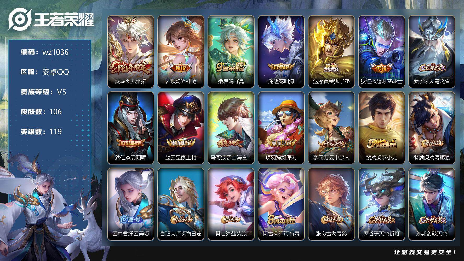 【账号佳】 【可二次实名】【wz1036】【商品标题】:安卓Q-V5-永恒钻石IV段位-119英雄-106皮肤-0典藏-0珍品无双-0无双-0珍品传说-6传说-23史诗 【传说皮肤】:澜愿照九州拓,云缨幻光神枪,桑启鸣野蒿,澜逐花归海,达摩黄金狮子座,狄仁杰超时空战士 【限定皮肤】:姜子牙天穹之誓,狄仁杰阴阳师,赵云皇家上将,马可波罗山海玄木吟,项羽海滩派对,李元芳云中旅人,裴擒虎李小龙,裴擒虎擒涛扼浪,云中君纤云弄巧,鲁班大师探海日志,桑启海盐诗旅,阿古朵江河有灵,张良古海寻踪,鬼谷子天穹祈灯,刘邦剑破天穹,程咬金群星魔术团,周瑜熔金海岸 【年限皮肤】:马可波罗山海玄木吟 【赛季限定】:张良古海寻踪,李元芳云中旅人,裴擒虎擒涛扼浪,鲁班大师探海日志,桑启海盐诗旅,鬼谷子天穹祈灯,刘邦剑破天穹,姜子牙天穹之誓 【史诗皮肤】:露娜紫霞仙子,赵云皇家上将,貂蝉圣诞恋歌,甄姬冰雪圆舞曲,宫本武藏鬼剑武藏,孙尚香水果甜心,妲己魅力维加斯,墨子金属风暴,刘禅绅士熊喵,吕布末日机甲,刘邦德古拉伯爵,兰陵王暗隐猎兽者,安琪拉心灵骇客,白起星夜王子,伽罗箭羽风息,狄仁杰鹰眼统帅,裴擒虎李小龙,云中君纤云弄巧,澜赏金猎手,马可波罗山海玄木吟,阿古朵江河有灵,弈星万物之道,黄忠百相守梦 【其他皮肤】:项羽海滩派对,韩信教廷特使,韩信街头霸王,赵云忍炎影,白起白色死神,扁鹊化身博士,宫本武藏未来纪元,姜子牙时尚教父,妲己少女阿狸,典韦黄金武士,亚瑟死亡骑士,花木兰兔女郎,张飞五福同心,宫本武藏万象初新,后羿阿尔法小队,狄仁杰阴阳师,刘备汉昭烈帝,关羽龙腾万里,狂铁命运角斗场,诸葛亮掌控之力,吕布野性能量,狂铁特工战影,刘禅秘密基地,鲁班大师乓乓大师,李元芳云中旅人,桑启海盐诗旅,猪八戒潮玩探月行,裴擒虎擒涛扼浪,太乙真人劲辣红锅,莱西奥西部游侠,鲁班大师探海日志,李元芳妄想特派,张良古海寻踪,后羿完美运算,鬼谷子天穹祈灯,亚瑟鸿运当头,刘邦剑破天穹,程咬金群星魔术团,姜子牙天穹之誓,周瑜熔金海岸,盘古敬我三分,东皇太一噬灭天穹,吕布逐霄战戟,苍苍林狼骑,太乙真人谧流熔炉,典韦铁骨偃魂,西施雪境奇遇,戈娅玫蓝誓约,钟馗虚灵犬护,苏烈春野闲踪,张良灵野札记,阿古朵布丁狗之约,白起死霸装,甄姬逆浪荇歌,庄周锦麟游梦,莱西奥踏浪烽翎,鬼谷子克喵,鲁班七号福禄兄弟,花木兰剑舞者,孙膑未来旅行,孙悟空西部大镖客,周瑜海军大将,李白范海辛,虞姬加勒比小姐,雅典娜战争女神,马可波罗激情绿茵,铠龙域领主,裴擒虎街头旋风,弈星踏雪寻梅,孙策海之征途,李信灼热之刃,瑶森,马超幸存者,澜孤猎,云缨赤焰之缨,金蝉前尘,暃碧珀绯影 【内测皮肤】:狂铁特工战影 【营地ID】:1676929376