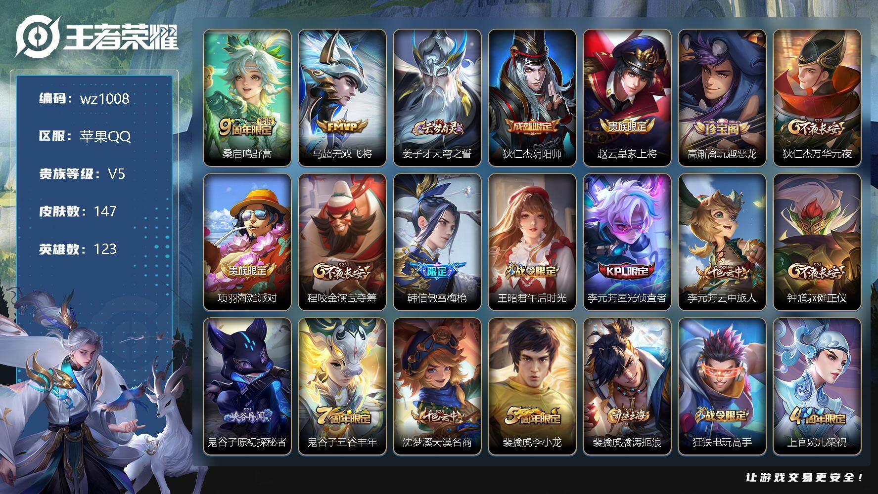 【账号佳】 【可二次实名】【wz1008】苹果Q-V5-最强王者段位-123英雄-147皮肤-0典藏-0珍品无双-0无双-0珍品传说-2传说-33史诗 【传说皮肤】:桑启鸣野蒿,马超无双飞将 【限定皮肤】:姜子牙天穹之誓,狄仁杰阴阳师,赵云皇家上将,高渐离玩趣恶龙,狄仁杰万华元夜,项羽海滩派对,程咬金演武夺筹,韩信傲雪梅枪,王昭君午后时光,李元芳匿光侦查者,李元芳云中旅人,钟馗驱傩正仪,鬼谷子原初探秘者,鬼谷子五谷丰年,沈梦溪大漠名商,裴擒虎李小龙,裴擒虎擒涛扼浪,狂铁电玩高手,上官婉儿梁祝,鲁班大师探海日志,桑启海盐诗旅,阿古朵江河有灵,张良古海寻踪,蒙恬荣光圣徽,鬼谷子天穹祈灯,伽罗琥珀纪元,姬小满妄想食味,沈梦溪龙舞盛年,刘邦剑破天穹,程咬金群星魔术团,周瑜熔金海岸 【赛季限定】:狄仁杰万华元夜,程咬金演武夺筹,张良古海寻踪,李元芳云中旅人,钟馗驱傩正仪,鬼谷子原初探秘者,沈梦溪大漠名商,裴擒虎擒涛扼浪,鲁班大师探海日志,桑启海盐诗旅,鬼谷子天穹祈灯,蒙恬荣光圣徽,刘邦剑破天穹,姜子牙天穹之誓 【战令限定】:王昭君午后时光,狂铁电玩高手 【史诗皮肤】:赵云皇家上将,赵云未来纪元,貂蝉圣诞恋歌,甄姬冰雪圆舞曲,宫本武藏鬼剑武藏,孙尚香水果甜心,妲己魅力维加斯,妲己女仆咖啡,吕布圣诞狂欢,刘禅绅士熊喵,曹操幽灵船长,张飞乱世虎臣,花木兰水晶猎龙者,夏侯惇乘风破浪,小乔缤纷独角兽,亚瑟心灵战警,铠曙光守护者,程咬金功夫厨神,狄仁杰鹰眼统帅,上官婉儿梁祝,橘右京修罗,裴擒虎李小龙,韩信傲雪梅枪,狂铁电玩高手,鬼谷子五谷丰年,李元芳匿光侦查者,阿古朵江河有灵,蒙恬荣光圣徽,伽罗琥珀纪元,姬小满妄想食味,牛魔星界战将,狂铁龙之律动,后羿石田雨龙 【其他皮肤】:项羽海滩派对,韩信教廷特使,韩信街头霸王,露娜哥特玫瑰,赵云白执事,白起白色死神,扁鹊化身博士,扁鹊救世之瞳,安琪拉玩偶对对碰,孙膑天使之翼,姜子牙时尚教父,典韦黄金武士,亚瑟死亡骑士,花木兰兔女郎,张飞五福同心,甄姬花好人间,宫本武藏万象初新,狄仁杰阴阳师,刘备纽约教父,刘备汉昭烈帝,关羽龙腾万里,钟无艳海滩丽影,老夫子功夫老勺,孙尚香沉稳之力,诸葛亮掌控之力,小乔丁香结,吕布野性能量,高渐离玩趣恶龙,沈梦溪鲨炮海盗猫,姜子牙炽热元素使,哪吒次元突破,盾山圆桌骑士,狂铁特工战影,鬼谷子原初探秘者,狄仁杰万华元夜,刘禅秘密基地,程咬金演武夺筹,张良缤纷绘卷,钟馗驱傩正仪,鲁班大师乓乓大师,王昭君午后时光,沈梦溪大漠名商,蒙犽胡桃狂想曲,蒙恬蔚蓝守将,李元芳云中旅人,刘备潮玩造梦师,桑启海盐诗旅,赵怀真太极少年,裴擒虎擒涛扼浪,太乙真人劲辣红锅,莱西奥西部游侠,鲁班大师探海日志,李元芳妄想特派,张良古海寻踪,后羿完美运算,鬼谷子天穹祈灯,海诺时空谍影,廉颇功夫炙烤,沈梦溪龙舞盛年,钟无艳春野之旅,扁鹊无尽旅途,刘邦剑破天穹,盘古经纬探寻者,程咬金群星魔术团,姜子牙天穹之誓,周瑜熔金海岸,盘古敬我三分,东皇太一噬灭天穹,太乙真人谧流熔炉,钟馗虚灵犬护,苏烈春野闲踪,张良灵野札记,阿古朵布丁狗之约,露娜命运加冕,姬小满小满鸭,白起死霸装,甄姬逆浪荇歌,庄周锦麟游梦,鲁班七号福禄兄弟,貂蝉异域舞娘,老夫子潮流仙人,曹操超能战警,孙悟空西部大镖客,后羿精灵王,钟馗地府判官,虞姬加勒比小姐,蔡文姬蔷薇王座,夏侯惇战争骑士,雅典娜战争女神,马可波罗激情绿茵,杨戬埃及法老,黄忠芝加哥教父,东皇太一东海龙王,铠龙域领主,百里守约绝影神枪,百里玄策威尼斯狂欢,苏烈爱与和平,女娲尼罗河女神,明世隐占星师,弈星踏雪寻梅,米莱狄精准探案法,元歌午夜歌剧院,孙策海之征途,李信灼热之刃,瑶森,曜归虚梦演,马超幸存者,澜孤猎,司空震启蛰,云缨赤焰之缨,金蝉前尘,暃碧珀绯影 【内测皮肤】:高渐离玩趣恶龙,狂铁特工战影 【营地ID】:1553897611
