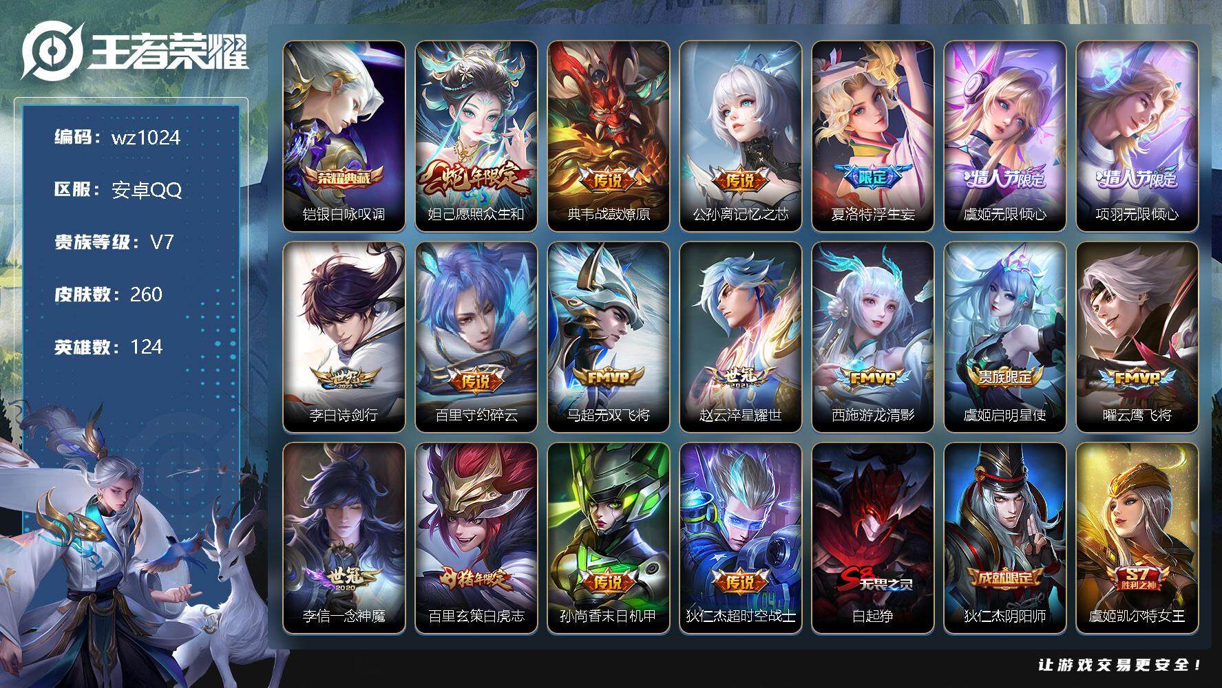 【账号佳】 【可二次实名】【wz1024】【商品标题】:安卓Q-V7-永恒钻石I段位-124英雄-260皮肤-1典藏-0珍品无双-0无双-0珍品传说-17传说-66史诗 【荣耀典藏】:铠银白咏叹调 【传说皮肤】:妲己愿照众生和,典韦战鼓燎原,公孙离记忆之芯,夏洛特浮生妄,虞姬无限倾心,项羽无限倾心,李白诗剑行,百里守约碎云,马超无双飞将,赵云淬星耀世,西施游龙清影,虞姬启明星使,曜云鹰飞将,李信一念神魔,百里玄策白虎志,孙尚香末日机甲,狄仁杰超时空战士 【限定皮肤】:白起狰,狄仁杰阴阳师,虞姬凯尔特女王,赵云皇家上将,墨子神迹守卫,嬴政优雅恋人,阿轲迷踪丽影,扁鹊炼金王,扁鹊奇幻香踪,芈月重明,吕布猎兽之王,周瑜赤莲之焰,夏侯惇朔风刀,曹操烛龙,典韦穷奇,马可波罗暗影游猎,马可波罗山海玄木吟,狄仁杰魔术师,狄仁杰万华元夜,达摩星际陆战队,达摩沙漠行僧,项羽海滩派对,项羽无限倾心,老夫子醍醐杖,老夫子航海奇遇记,关羽百相守梦,程咬金演武夺筹,刘邦夺宝奇兵,兰陵王驯魔猎人,兰陵王金庭之子,花木兰青春决赛季,孙悟空至尊宝,牛魔御旌,后羿圣弓游侠,李元芳银河之约,李元芳云中旅人,虞姬启明星使,虞姬无限倾心,钟馗驱傩正仪,杨玉环遇见飞天,杨戬潮玩骑兵,干将莫邪胡桃夹子,干将莫邪真爱魔法,雅典娜单词大作战,蔡文姬繁星吟游,太乙真人饕餮,太乙真人华丽摇滚,鬼谷子原初探秘者,鬼谷子五谷丰年,黄忠烈魂,苏烈千军破阵,百里玄策白虎志,百里玄策原初追逐者,弈星混沌棋,沈梦溪星空之诺,沈梦溪大漠名商,明世隐疑决卦,裴擒虎李小龙,裴擒虎擒涛扼浪,狂铁御狮,米莱狄御霄,米莱狄胡桃异想国,云中君纤云弄巧,伽罗天狼溯光者,猪八戒西部大镖客,上官婉儿梁祝,上官婉儿天狼绘梦者,嫦娥暖冬兔眠,西施玲珑珍味,蒙犽狂想玩偶喵,鲁班大师探海日志,桑启海盐诗旅,夏洛特浮生妄,暃星界游侠,戈娅驭风魔法,刘邦剑破天穹 【年限皮肤】:百里玄策白虎志,马超神威,黄忠烈魂,马可波罗山海玄木吟 【赛季限定】:扁鹊炼金王,白起狰,芈月重明,夏侯惇朔风刀,曹操烛龙,典韦穷奇,狄仁杰万华元夜,达摩沙漠行僧,老夫子醍醐杖,程咬金演武夺筹,兰陵王金庭之子,牛魔御旌,李元芳云中旅人,虞姬凯尔特女王,钟馗驱傩正仪,太乙真人饕餮,鬼谷子原初探秘者,苏烈千军破阵,百里玄策原初追逐者,弈星混沌棋,沈梦溪大漠名商,明世隐疑决卦,裴擒虎擒涛扼浪,狂铁御狮,米莱狄御霄,鲁班大师探海日志,桑启海盐诗旅,刘邦剑破天穹 【战令限定】:墨子神迹守卫,阿轲迷踪丽影,扁鹊奇幻香踪,吕布猎兽之王,周瑜赤莲之焰,马可波罗暗影游猎,达摩星际陆战队,老夫子航海奇遇记,刘邦夺宝奇兵,兰陵王驯魔猎人,后羿圣弓游侠,李元芳银河之约,杨戬潮玩骑兵,干将莫邪真爱魔法,雅典娜单词大作战,沈梦溪星空之诺,米莱狄胡桃异想国,猪八戒西部大镖客,嫦娥暖冬兔眠,西施玲珑珍味,蒙犽狂想玩偶喵,暃星界游侠,戈娅驭风魔法 【史诗皮肤】:鲁班七号电玩小子,赵云皇家上将,甄姬冰雪圆舞曲,王昭君偶像歌手,狄仁杰魔术师,廉颇地狱岩魂,宫本武藏鬼剑武藏,孙尚香水果甜心,嬴政优雅恋人,妲己魅力维加斯,墨子金属风暴,吕布圣诞狂欢,刘禅绅士熊喵,李白千年之狐,张飞乱世虎臣,韩信白龙吟,孙悟空至尊宝,花木兰水晶猎龙者,刘邦德古拉伯爵,夏侯惇乘风破浪,兰陵王暗隐猎兽者,诸葛亮黄金分割率,花木兰青春决赛季,铠曙光守护者,刘禅天才门将,李元芳逐浪之夏,程咬金功夫厨神,阿轲节奏热浪,杨玉环遇见飞天,孙策猫狗日记,伽罗箭羽风息,狄仁杰鹰眼统帅,公孙离无限星赏官,兰陵王驯魔猎人,上官婉儿梁祝,蔡文姬繁星吟游,李元芳银河之约,娜可露露晚萤,不知火舞魅语,阿轲迷踪丽影,橘右京修罗,瑶遇见神鹿,马超神威,黄忠烈魂,上官婉儿天狼绘梦者,马可波罗暗影游猎,蒙犽狂想玩偶喵,百里玄策原初追逐者,裴擒虎李小龙,云中君纤云弄巧,米莱狄胡桃异想国,老夫子航海奇遇记,伽罗天狼溯光者,杨戬天秀启明,干将莫邪真爱魔法,夏洛特永昼,貂蝉唤灵魅影,鬼谷子五谷丰年,暃星界游侠,马可波罗山海玄木吟,扁鹊奇幻香踪,关羽百相守梦,戈娅驭风魔法,阿轲化蝶舞,狂铁龙之律动,黄忠百相守梦 【其他皮肤】:项羽海滩派对,韩信教廷特使,韩信街头霸王,露娜哥特玫瑰,阿轲致命风华,阿轲爱心护理,达摩大发明家,赵云忍炎影,程咬金星际陆战队,白起白色死神,牛魔西部大镖客,扁鹊化身博士,安琪拉玩偶对对碰,孙膑天使之翼,姜子牙时尚教父,妲己少女阿狸,典韦黄金武士,亚瑟死亡骑士,达摩拳王,花木兰兔女郎,张飞五福同心,甄姬花好人间,刘备万事如意,宫本武藏万象初新,狄仁杰阴阳师,刘备纽约教父,刘备汉昭烈帝,扁鹊炼金王,关羽龙腾万里,虞姬凯尔特女王,墨子进击墨子号,白起狰,钟无艳海滩丽影,太乙真人饕餮,宫本武藏霸王丸,曹操烛龙,王昭君幻想奇妙夜,芈月重明,狂铁命运角斗场,老夫