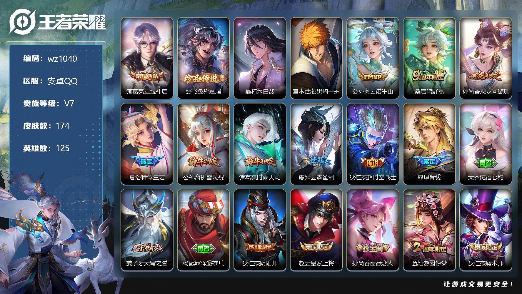 【账号佳】 【可二次实名】【wz1040】【商品标题】:安卓Q-V7-至尊星耀II段位-125英雄-174皮肤-1典藏-0珍品无双-0无双-3珍品传说-8传说-44史诗 【荣耀典藏】:诸葛亮星域神启 【珍品传说】:张飞兔狲蓬尾,暃朽木白哉,宫本武藏黑崎一护 【传说皮肤】:公孙离云诺千山,桑启鸣野蒿,孙尚香乘龙问璇玑,夏洛特浮生妄,公孙离祈雪灵祝,诸葛亮时雨天司,虞姬云霓雀翎,狄仁杰超时空战士 【限定皮肤】:暃埋骨钱,大乔绒语心约,姜子牙天穹之誓,杨戬破阵退雄兵,狄仁杰阴阳师,赵云皇家上将,孙尚香蔷薇恋人,甄姬游园惊梦,狄仁杰魔术师,项羽海滩派对,老夫子醍醐杖,孙悟空至尊宝,李元芳云中旅人,钟馗驱傩正仪,雅典娜黎明之约,诸葛亮时雨天司,苏烈千军破阵,公孙离祈雪灵祝,沈梦溪大漠名商,明世隐疑决卦,裴擒虎擒涛扼浪,嫦娥拒霜思,鲁班大师探海日志,桑启海盐诗旅,夏洛特浮生妄,艾琳女武神,阿古朵江河有灵,张良古海寻踪,蒙犽百解令,蒙恬荣光圣徽,鬼谷子天穹祈灯,伽罗琥珀纪元,孙尚香乘龙问璇玑,沈梦溪龙舞盛年,刘邦剑破天穹,程咬金群星魔术团,周瑜熔金海岸 【年限皮肤】:公孙离祈雪灵祝,诸葛亮时雨天司,孙尚香乘龙问璇玑 【赛季限定】:老夫子醍醐杖,张良古海寻踪,李元芳云中旅人,钟馗驱傩正仪,雅典娜黎明之约,苏烈千军破阵,沈梦溪大漠名商,明世隐疑决卦,裴擒虎擒涛扼浪,鲁班大师探海日志,桑启海盐诗旅,鬼谷子天穹祈灯,蒙恬荣光圣徽,刘邦剑破天穹,姜子牙天穹之誓 【史诗皮肤】:鲁班七号电玩小子,项羽苍穹之光,露娜紫霞仙子,赵云皇家上将,貂蝉圣诞恋歌,甄姬冰雪圆舞曲,狄仁杰魔术师,宫本武藏鬼剑武藏,孙尚香蔷薇恋人,孙尚香水果甜心,妲己魅力维加斯,墨子金属风暴,吕布圣诞狂欢,李白千年之狐,吕布末日机甲,张飞乱世虎臣,孙悟空至尊宝,花木兰水晶猎龙者,夏侯惇乘风破浪,兰陵王暗隐猎兽者,甄姬游园惊梦,亚瑟心灵战警,百里守约特工魅影,铠曙光守护者,李元芳逐浪之夏,大乔猫狗日记,伽罗箭羽风息,狄仁杰鹰眼统帅,公孙离无限星赏官,嫦娥拒霜思,雅典娜黎明之约,貂蝉唤灵魅影,刘禅电玩爆裂旋风,阿古朵江河有灵,蒙犽百解令,蒙恬荣光圣徽,伽罗琥珀纪元,暃埋骨钱,狂铁龙之律动,百里守约雪豹霜爪,后羿石田雨龙,周瑜百相守梦,黄忠百相守梦,公孙离涂山容容 【其他皮肤】:项羽海滩派对,韩信教廷特使,韩信街头霸王,达摩大发明家,赵云忍炎影,芈月红桃皇后,艾琳女武神,白起白色死神,牛魔西部大镖客,扁鹊救世之瞳,安琪拉玩偶对对碰,孙膑天使之翼,妲己少女阿狸,典韦黄金武士,亚瑟死亡骑士,花木兰兔女郎,张飞五福同心,甄姬花好人间,狄仁杰阴阳师,刘备汉昭烈帝,关羽龙腾万里,钟无艳海滩丽影,宫本武藏霸王丸,狂铁命运角斗场,老夫子功夫老勺,诸葛亮掌控之力,李白敏锐之力,鬼谷子幻乐之宴,苏烈坚韧之力,明世隐虹云星官,小乔丁香结,沈梦溪鲨炮海盗猫,姜子牙炽热元素使,哪吒次元突破,明世隐疑决卦,老夫子醍醐杖,狂铁特工战影,露娜瓷语鉴心,张良缤纷绘卷,钟馗驱傩正仪,鲁班大师乓乓大师,苏烈千军破阵,程咬金无双福将,沈梦溪大漠名商,蒙恬蔚蓝守将,李元芳云中旅人,刘备潮玩造梦师,桑启海盐诗旅,猪八戒潮玩探月行,赵怀真太极少年,裴擒虎擒涛扼浪,太乙真人劲辣红锅,鲁班大师探海日志,姬小满零食大作战,李元芳妄想特派,哪吒热血海滩,张良古海寻踪,亚连破局者,后羿完美运算,鬼谷子天穹祈灯,嫦娥漠中幻影,朵莉亚金色潮汐,廉颇功夫炙烤,亚瑟鸿运当头,沈梦溪龙舞盛年,钟无艳春野之旅,刘邦剑破天穹,盘古经纬探寻者,程咬金群星魔术团,杨戬破阵退雄兵,姜子牙天穹之誓,周瑜熔金海岸,大乔绒语心约,盘古敬我三分,东皇太一噬灭天穹,干将莫邪雾都夜雨,苍苍林狼骑,典韦铁骨偃魂,姜子牙星梦巡礼,钟馗虚灵犬护,苏烈春野闲踪,小乔秘证寻踪,张良灵野札记,露娜命运加冕,雅典娜潮玩士官长,姬小满小满鸭,白起死霸装,甄姬逆浪荇歌,孙策百相守梦,庄周锦麟游梦,空空儿戏梦巡演,高渐离落日弦歌,莱西奥踏浪烽翎,鬼谷子克喵,哪吒罗小黑战记,露娜绯红之刃,王昭君精灵公主,张良一千零一夜,虞姬加勒比小姐,雅典娜战争女神,诸葛亮星航指挥官,黄忠芝加哥教父,大乔伊势巫女,东皇太一东海龙王,百里守约绝影神枪,百里玄策威尼斯狂欢,梦奇美梦成真,公孙离花间舞,弈星踏雪寻梅,元歌午夜歌剧院,上官婉儿修竹墨客,马超幸存者,蒙犽归虚梦演,蒙恬秩序猎龙将,司空震启蛰,云缨赤焰之缨,金蝉前尘 【内测皮肤】:孙尚香蔷薇恋人,艾琳女武神,狂铁特工战影 【营地ID】:2120103955
