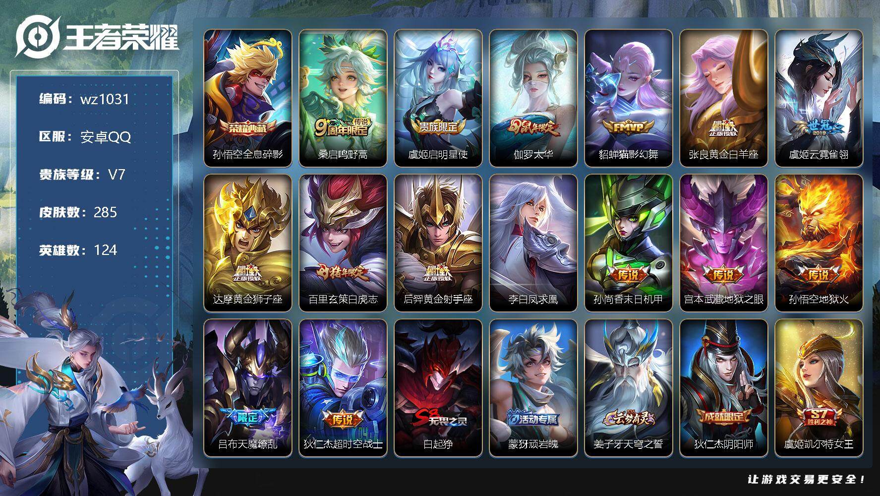 【账号佳】 【可二次实名】【wz1031】【商品标题】:安卓Q-V7-永恒钻石II段位-124英雄-285皮肤-1典藏-0珍品无双-0无双-0珍品传说-15传说-72史诗 【荣耀典藏】:孙悟空全息碎影 【传说皮肤】:桑启鸣野蒿,虞姬启明星使,伽罗太华,貂蝉猫影幻舞,张良黄金白羊座,虞姬云霓雀翎,达摩黄金狮子座,百里玄策白虎志,后羿黄金射手座,李白凤求凰,孙尚香末日机甲,宫本武藏地狱之眼,孙悟空地狱火,吕布天魔缭乱,狄仁杰超时空战士 【限定皮肤】:白起狰,蒙犽顽岩魄,姜子牙天穹之誓,狄仁杰阴阳师,虞姬凯尔特女王,赵云皇家上将,赵云引擎之心,妲己时之彼端,嬴政白昼王子,鲁班七号狮舞东方,庄周蜃楼王,庄周玄嵩,扁鹊炼金王,芈月重明,吕布天魔缭乱,吕布猎兽之王,周瑜赤莲之焰,夏侯惇朔风刀,甄姬幽恒,曹操烛龙,典韦穷奇,典韦蓝屏警告,典韦岱宗,狄仁杰魔术师,狄仁杰万华元夜,项羽海滩派对,老夫子醍醐杖,关羽冰锋战神,程咬金演武夺筹,露娜一生所爱,韩信飞衡,王昭君凤凰于飞,兰陵王驯魔猎人,花木兰默契交锋,孙悟空至尊宝,孙悟空大圣娶亲,牛魔御旌,后羿如梦令,李元芳银河之约,李元芳云中旅人,虞姬启明星使,钟馗神迹守卫,钟馗驱傩正仪,杨玉环遇见飞天,女娲朔望之晖,哪吒逐梦之翼,干将莫邪冰霜恋舞曲,雅典娜单词大作战,蔡文姬繁星吟游,太乙真人饕餮,东皇太一逐梦之光,鬼谷子原初探秘者,铠青龙志,百里玄策白虎志,百里玄策原初追逐者,弈星混沌棋,沈梦溪星空之诺,明世隐疑决卦,裴擒虎天狼狩猎者,裴擒虎擒涛扼浪,狂铁御狮,米莱狄御霄,伽罗太华,上官婉儿梁祝,鲁班大师探海日志,桑启海盐诗旅,张良古海寻踪,鬼谷子天穹祈灯,沈梦溪龙舞盛年,刘邦剑破天穹,程咬金群星魔术团,镜青焰无极,项羽苍威无极,周瑜熔金海岸 【年限皮肤】:百里玄策白虎志,铠青龙志,王昭君凤凰于飞,李白凤求凰,伽罗太华,甄姬幽恒,韩信飞衡,典韦岱宗,庄周玄嵩 【赛季限定】:庄周蜃楼王,扁鹊炼金王,白起狰,芈月重明,夏侯惇朔风刀,曹操烛龙,典韦穷奇,狄仁杰万华元夜,老夫子醍醐杖,程咬金演武夺筹,张良古海寻踪,牛魔御旌,李元芳云中旅人,虞姬凯尔特女王,钟馗驱傩正仪,太乙真人饕餮,鬼谷子原初探秘者,百里玄策原初追逐者,弈星混沌棋,明世隐疑决卦,裴擒虎擒涛扼浪,狂铁御狮,米莱狄御霄,鲁班大师探海日志,桑启海盐诗旅,鬼谷子天穹祈灯,刘邦剑破天穹,姜子牙天穹之誓 【战令限定】:嬴政白昼王子,鲁班七号狮舞东方,吕布猎兽之王,周瑜赤莲之焰,典韦蓝屏警告,兰陵王驯魔猎人,李元芳银河之约,钟馗神迹守卫,女娲朔望之晖,雅典娜单词大作战,沈梦溪星空之诺,镜青焰无极,项羽苍威无极 【史诗皮肤】:鲁班七号电玩小子,露娜紫霞仙子,阿轲暗夜猫娘,赵云皇家上将,赵云未来纪元,貂蝉圣诞恋歌,甄姬冰雪圆舞曲,狄仁杰魔术师,宫本武藏鬼剑武藏,孙尚香水果甜心,嬴政暗夜贵公子,嬴政摇滚巨星,妲己魅力维加斯,妲己女仆咖啡,墨子金属风暴,吕布圣诞狂欢,曹操幽灵船长,吕布末日机甲,张飞乱世虎臣,韩信白龙吟,关羽冰锋战神,王昭君凤凰于飞,孙悟空至尊宝,赵云引擎之心,刘邦德古拉伯爵,夏侯惇乘风破浪,小乔缤纷独角兽,兰陵王暗隐猎兽者,诸葛亮黄金分割率,亚瑟心灵战警,百里守约特工魅影,铠曙光守护者,哪吒逐梦之翼,刘禅天才门将,李元芳逐浪之夏,程咬金功夫厨神,白起星夜王子,阿轲节奏热浪,杨玉环遇见飞天,东皇太一逐梦之光,嬴政白昼王子,孙策猫狗日记,铠青龙志,干将莫邪冰霜恋舞曲,露娜一生所爱,孙悟空大圣娶亲,典韦蓝屏警告,伽罗箭羽风息,裴擒虎天狼狩猎者,鲁班七号狮舞东方,狄仁杰鹰眼统帅,公孙离无限星赏官,兰陵王驯魔猎人,上官婉儿梁祝,蔡文姬繁星吟游,李元芳银河之约,韩信飞衡,典韦岱宗,妲己时之彼端,甄姬幽恒,庄周玄嵩,后羿如梦令,百里玄策原初追逐者,花木兰默契交锋,杨戬天秀启明,镜青焰无极,蒙犽顽岩魄,牛魔星界战将,弈星万物之道,刘禅鸭鸭历险记,周瑜百相守梦,黄忠百相守梦 【其他皮肤】:项羽海滩派对,韩信教廷特使,韩信街头霸王,露娜哥特玫瑰,阿轲爱心护理,达摩大发明家,赵云白执事,赵云忍炎影,芈月红桃皇后,程咬金星际陆战队,白起白色死神,牛魔西部大镖客,武则天东方不败,扁鹊化身博士,扁鹊救世之瞳,安琪拉玩偶对对碰,孙膑天使之翼,妲己少女阿狸,典韦黄金武士,亚瑟死亡骑士,达摩拳王,花木兰兔女郎,张飞五福同心,甄姬花好人间,刘备万事如意,后羿阿尔法小队,狄仁杰阴阳师,庄周蜃楼王,刘备纽约教父,刘备汉昭烈帝,扁鹊炼金王,关羽龙腾万里,虞姬凯尔特女王,墨子进击墨子号,白起狰,钟无艳海滩丽影,太乙真人饕餮,宫本武藏霸王丸,曹操烛龙,王昭君幻想奇妙夜,芈月重明,狂铁命运角斗场,老夫子功夫老勺,牛魔制霸全明星,孙尚香沉稳之力,典韦穷奇,诸葛亮掌控之力,李白敏锐之力,鬼谷子幻乐之宴,狂铁御狮,安琪