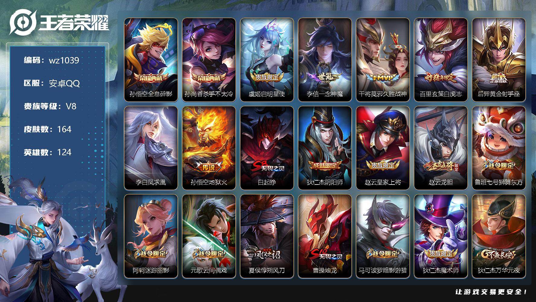 【账号佳】 【可二次实名】【wz1039】【商品标题】:安卓Q-V8-永恒钻石II段位-124英雄-164皮肤-2典藏-0珍品无双-0无双-0珍品传说-7传说-45史诗 【荣耀典藏】:孙悟空全息碎影,孙尚香杀手不太冷 【传说皮肤】:虞姬启明星使,李信一念神魔,干将莫邪久胜战神,百里玄策白虎志,后羿黄金射手座,李白凤求凰,孙悟空地狱火 【限定皮肤】:白起狰,狄仁杰阴阳师,赵云皇家上将,赵云龙胆,鲁班七号狮舞东方,阿轲迷踪丽影,元歌云间偶戏,夏侯惇朔风刀,曹操烛龙,马可波罗暗影游猎,狄仁杰魔术师,狄仁杰万华元夜,项羽海滩派对,老夫子醍醐杖,程咬金演武夺筹,刘邦夺宝奇兵,孙悟空至尊宝,牛魔御旌,李元芳银河之约,虞姬启明星使,钟馗神迹守卫,钟馗驱傩正仪,女娲朔望之晖,鬼谷子原初探秘者,百里玄策白虎志,弈星混沌棋,沈梦溪星空之诺,明世隐疑决卦,裴擒虎天狼狩猎者,裴擒虎李小龙,狂铁御狮,米莱狄御霄,猪八戒西部大镖客,上官婉儿梁祝,鬼谷子天穹祈灯,沈梦溪龙舞盛年,镜青焰无极 【年限皮肤】:百里玄策白虎志,李白凤求凰,马超神威,赵云龙胆 【赛季限定】:白起狰,夏侯惇朔风刀,曹操烛龙,狄仁杰万华元夜,老夫子醍醐杖,程咬金演武夺筹,牛魔御旌,钟馗驱傩正仪,鬼谷子原初探秘者,弈星混沌棋,明世隐疑决卦,狂铁御狮,米莱狄御霄,鬼谷子天穹祈灯 【战令限定】:鲁班七号狮舞东方,阿轲迷踪丽影,元歌云间偶戏,马可波罗暗影游猎,刘邦夺宝奇兵,李元芳银河之约,钟馗神迹守卫,女娲朔望之晖,沈梦溪星空之诺,猪八戒西部大镖客,镜青焰无极 【史诗皮肤】:露娜紫霞仙子,赵云皇家上将,貂蝉圣诞恋歌,王昭君偶像歌手,狄仁杰魔术师,宫本武藏鬼剑武藏,孙尚香水果甜心,嬴政摇滚巨星,妲己魅力维加斯,吕布圣诞狂欢,李白千年之狐,张飞乱世虎臣,孙悟空至尊宝,刘邦德古拉伯爵,夏侯惇乘风破浪,兰陵王暗隐猎兽者,诸葛亮黄金分割率,百里守约特工魅影,铠曙光守护者,李元芳逐浪之夏,程咬金功夫厨神,白起星夜王子,孙策猫狗日记,伽罗箭羽风息,裴擒虎天狼狩猎者,鲁班七号狮舞东方,狄仁杰鹰眼统帅,上官婉儿梁祝,李元芳银河之约,娜可露露晚萤,不知火舞魅语,阿轲迷踪丽影,橘右京修罗,马超神威,赵云龙胆,马可波罗暗影游猎,裴擒虎李小龙,元歌云间偶戏,镜青焰无极,弈星万物之道,狂铁龙之律动,后羿石田雨龙,周瑜百相守梦,黄忠百相守梦,西施织梦人 【其他皮肤】:项羽海滩派对,韩信教廷特使,韩信街头霸王,露娜哥特玫瑰,达摩大发明家,赵云白执事,赵云忍炎影,白起白色死神,宫本武藏未来纪元,安琪拉玩偶对对碰,姜子牙时尚教父,妲己少女阿狸,典韦黄金武士,亚瑟死亡骑士,花木兰兔女郎,张飞五福同心,甄姬花好人间,刘备万事如意,宫本武藏万象初新,狄仁杰阴阳师,关羽龙腾万里,白起狰,钟无艳海滩丽影,宫本武藏霸王丸,曹操烛龙,狂铁命运角斗场,老夫子功夫老勺,狂铁御狮,苏烈坚韧之力,大乔守护之力,米莱狄御霄,牛魔御旌,女娲朔望之晖,吕布野性能量,钟馗神迹守卫,孙膑归虚梦演,沈梦溪鲨炮海盗猫,夏侯惇朔风刀,沈梦溪星空之诺,弈星混沌棋,哪吒次元突破,明世隐疑决卦,刘邦夺宝奇兵,老夫子醍醐杖,猪八戒西部大镖客,狂铁特工战影,鬼谷子原初探秘者,狄仁杰万华元夜,刘禅秘密基地,程咬金演武夺筹,钟馗驱傩正仪,鲁班大师乓乓大师,海月王牌新星,后羿完美运算,鬼谷子天穹祈灯,廉颇功夫炙烤,沈梦溪龙舞盛年,钟无艳春野之旅,太乙真人谧流熔炉,姜子牙星梦巡礼,钟馗虚灵犬护,露娜命运加冕,姬小满小满鸭,白起死霸装,甄姬逆浪荇歌,孙策百相守梦,庄周锦麟游梦,高渐离落日弦歌,莱西奥踏浪烽翎,鬼谷子克喵,鲁班七号木偶奇遇记,王昭君精灵公主,张良一千零一夜,小乔万圣前夜,孙悟空西部大镖客,后羿精灵王,刘禅英喵野望,李元芳特种部队,刘邦圣殿之光,关羽天启骑士,夏侯惇战争骑士,马可波罗激情绿茵,苍维京掠夺者,哪吒三太子,黄忠芝加哥教父,大乔伊势巫女,东皇太一东海龙王,苏烈爱与和平,明世隐占星师,杨玉环霓裳曲,元歌午夜歌剧院,孙策海之征途,司马懿魇语军师,伽罗花见巫女,沈梦溪棒球奇才,李信灼热之刃,上官婉儿修竹墨客,嫦娥露花倒影,猪八戒年年有余,瑶森,曜归虚梦演,马超幸存者,蒙犽归虚梦演,镜冰刃幻境,蒙恬秩序猎龙将,云缨赤焰之缨,金蝉前尘,桑启画中游 【内测皮肤】:狂铁特工战影 【营地ID】:490673250
