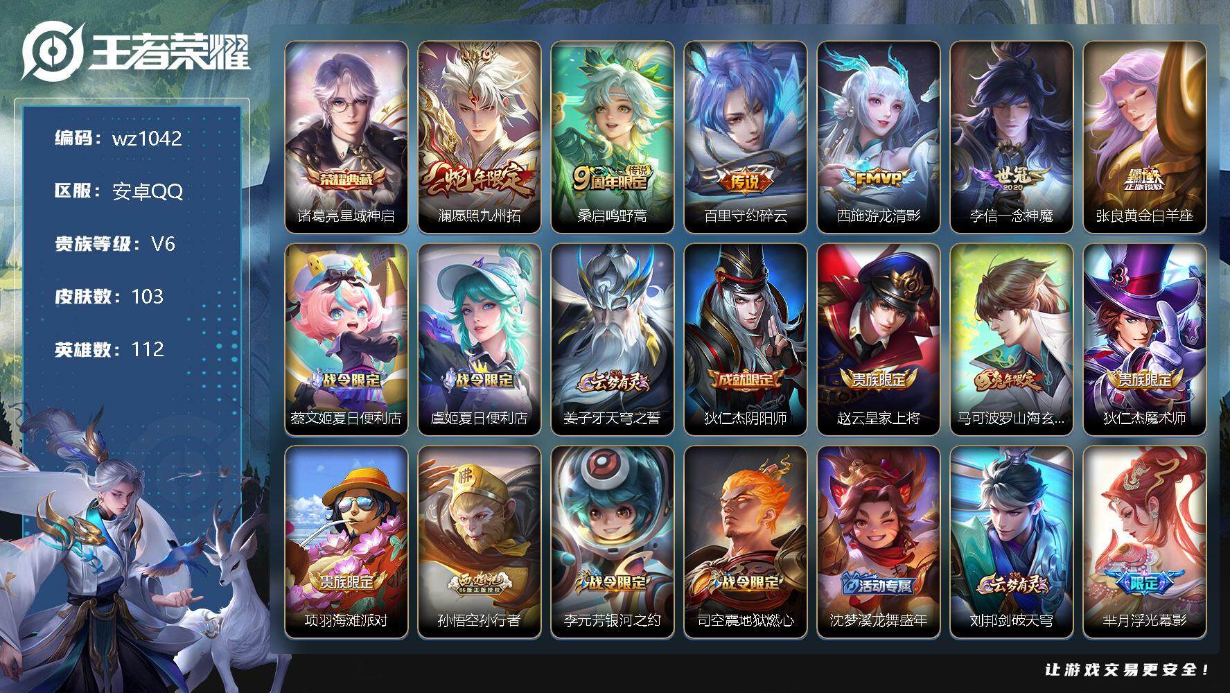 【账号佳】 【可二次实名】【wz1042】【商品标题】:安卓Q-V6-尊贵铂金II段位-112英雄-103皮肤-1典藏-0珍品无双-0无双-0珍品传说-6传说-37史诗 【荣耀典藏】:诸葛亮星域神启 【传说皮肤】:澜愿照九州拓,桑启鸣野蒿,百里守约碎云,西施游龙清影,李信一念神魔,张良黄金白羊座 【限定皮肤】:蔡文姬夏日便利店,虞姬夏日便利店,姜子牙天穹之誓,狄仁杰阴阳师,赵云皇家上将,马可波罗山海玄木吟,狄仁杰魔术师,项羽海滩派对,孙悟空孙行者,李元芳银河之约,司空震地狱燃心,沈梦溪龙舞盛年,刘邦剑破天穹,芈月浮光幕影 【年限皮肤】:马可波罗山海玄木吟 【赛季限定】:刘邦剑破天穹,姜子牙天穹之誓 【战令限定】:蔡文姬夏日便利店,虞姬夏日便利店,李元芳银河之约,司空震地狱燃心 【史诗皮肤】:露娜紫霞仙子,赵云皇家上将,王昭君偶像歌手,狄仁杰魔术师,宫本武藏鬼剑武藏,孙尚香水果甜心,嬴政暗夜贵公子,妲己魅力维加斯,妲己女仆咖啡,墨子金属风暴,李白千年之狐,夏侯惇乘风破浪,小乔缤纷独角兽,兰陵王暗隐猎兽者,亚瑟心灵战警,雅典娜冰冠公主,百里守约特工魅影,白起星夜王子,阿轲节奏热浪,大乔猫狗日记,狄仁杰鹰眼统帅,李元芳银河之约,橘右京修罗,杨戬天秀启明,沈梦溪月团寄思,孙悟空孙行者,澜赏金猎手,马可波罗山海玄木吟,司空震地狱燃心,芈月浮光幕影,蔡文姬夏日便利店,大司命东方月初,姬小满战舞者,亚连破空之剑,百里守约百相守梦,孙膑茶境仙,赵怀真器灵浮梦炉 【其他皮肤】:项羽海滩派对,韩信街头霸王,露娜哥特玫瑰,达摩大发明家,芈月红桃皇后,白起白色死神,安琪拉玩偶对对碰,典韦黄金武士,亚瑟死亡骑士,狄仁杰阴阳师,刘备汉昭烈帝,小乔丁香结,哪吒次元突破,鲁班大师乓乓大师,蒙恬蔚蓝守将,海月幻泉雾影,太乙真人劲辣红锅,曹操决胜大满贯,海诺时空谍影,廉颇功夫炙烤,沈梦溪龙舞盛年,刘邦剑破天穹,姜子牙天穹之誓,虞姬夏日便利店,孙悟空神迹守卫,盘古敬我三分,东皇太一噬灭天穹,老夫子百相守梦,米莱狄怪诞之夜,干将莫邪雾都夜雨,吕布逐霄战戟,苍苍林狼骑,太乙真人谧流熔炉,典韦铁骨偃魂,马超访茗客,西施雪境奇遇,东皇太一金福满堂,达摩爆裂喵拳,钟馗虚灵犬护,露娜命运加冕,鲁班七号福禄兄弟,项羽帝国元帅,貂蝉异域舞娘,小乔万圣前夜,李元芳特种部队,虞姬加勒比小姐,关羽天启骑士,苍维京掠夺者,哪吒三太子,百里守约绝影神枪,女娲尼罗河女神,杨玉环霓裳曲,裴擒虎街头旋风,弈星踏雪寻梅,元歌午夜歌剧院,猪八戒年年有余,盘古创世神祝,鲁班大师归虚梦演 【营地ID】:1668745300