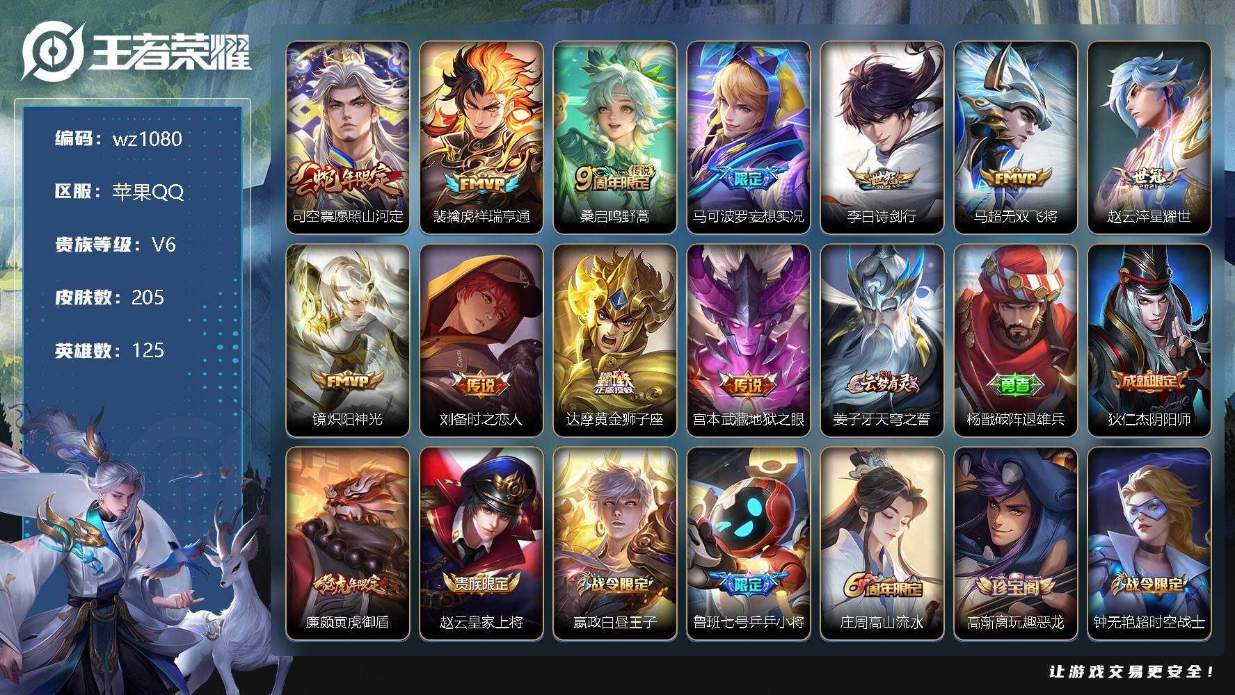 【账号佳】 【可二次实名】【wz1080】【商品标题】:苹果Q-V6-最强王者段位-125英雄-205皮肤-0典藏-0珍品无双-0无双-0珍品传说-11传说-58史诗 【传说皮肤】:司空震愿照山河定,裴擒虎祥瑞亨通,桑启鸣野蒿,马可波罗妄想实况,李白诗剑行,马超无双飞将,赵云淬星耀世,镜炽阳神光,刘备时之恋人,达摩黄金狮子座,宫本武藏地狱之眼 【限定皮肤】:姜子牙天穹之誓,杨戬破阵退雄兵,狄仁杰阴阳师,廉颇寅虎御盾,赵云皇家上将,嬴政白昼王子,鲁班七号乒乒小将,庄周高山流水,高渐离玩趣恶龙,钟无艳超时空战士,芈月白晶晶,元歌无心,甄姬落雪兰心,马可波罗妄想实况,狄仁杰魔术师,狄仁杰万华元夜,项羽海滩派对,李元芳匿光侦查者,李元芳云中旅人,雅典娜黎明之约,鬼谷子原初探秘者,鬼谷子五谷丰年,弈星混沌棋,明世隐疑决卦,裴擒虎李小龙,裴擒虎擒涛扼浪,嫦娥暖冬兔眠,西施玲珑珍味,鲁班大师探海日志,桑启海盐诗旅,暃星界游侠,戈娅驭风魔法,阿古朵江河有灵,张良古海寻踪,高渐离燃音魔法,妲己灵卜魔法,鬼谷子天穹祈灯,姬小满妄想食味,沈梦溪龙舞盛年,鲁班七号蔬乡物语,李元芳蔬乡物语,刘邦剑破天穹,程咬金群星魔术团,刘备异域游侠 【年限皮肤】:廉颇寅虎御盾 【赛季限定】:狄仁杰万华元夜,张良古海寻踪,李元芳云中旅人,雅典娜黎明之约,鬼谷子原初探秘者,弈星混沌棋,明世隐疑决卦,裴擒虎擒涛扼浪,鲁班大师探海日志,桑启海盐诗旅,鬼谷子天穹祈灯,刘邦剑破天穹,姜子牙天穹之誓 【战令限定】:嬴政白昼王子,钟无艳超时空战士,甄姬落雪兰心,嫦娥暖冬兔眠,西施玲珑珍味,暃星界游侠,戈娅驭风魔法,高渐离燃音魔法,妲己灵卜魔法,鲁班七号蔬乡物语,李元芳蔬乡物语 【史诗皮肤】:项羽苍穹之光,赵云皇家上将,赵云未来纪元,甄姬冰雪圆舞曲,王昭君偶像歌手,狄仁杰魔术师,宫本武藏鬼剑武藏,孙尚香水果甜心,嬴政摇滚巨星,妲己魅力维加斯,墨子金属风暴,吕布圣诞狂欢,曹操幽灵船长,李白千年之狐,张飞乱世虎臣,花木兰水晶猎龙者,刘邦德古拉伯爵,夏侯惇乘风破浪,小乔缤纷独角兽,兰陵王暗隐猎兽者,亚瑟心灵战警,安琪拉心灵骇客,百里守约特工魅影,铠曙光守护者,蔡文姬舞动绿茵,李元芳逐浪之夏,程咬金功夫厨神,白起星夜王子,阿轲节奏热浪,嬴政白昼王子,孙策猫狗日记,伽罗箭羽风息,狄仁杰鹰眼统帅,橘右京修罗,裴擒虎李小龙,芈月白晶晶,百里玄策热力回旋,蒙犽龙鼓争鸣,鲁班七号乒乒小将,庄周高山流水,司马懿暗渊魔法,雅典娜黎明之约,廉颇寅虎御盾,貂蝉唤灵魅影,钟无艳超时空战士,鬼谷子五谷丰年,元歌无心,暃星界游侠,镜玫瑰异探,戈娅驭风魔法,李元芳匿光侦查者,阿古朵江河有灵,妲己灵卜魔法,高渐离燃音魔法,姬小满妄想食味,鲁班七号蔬乡物语,牛魔星界战将,后羿石田雨龙,黄忠百相守梦 【其他皮肤】:项羽海滩派对,韩信教廷特使,韩信街头霸王,露娜哥特玫瑰,赵云忍炎影,芈月红桃皇后,白起白色死神,牛魔西部大镖客,扁鹊化身博士,扁鹊救世之瞳,宫本武藏未来纪元,安琪拉玩偶对对碰,孙膑天使之翼,典韦黄金武士,亚瑟死亡骑士,达摩拳王,花木兰兔女郎,张飞五福同心,甄姬花好人间,刘备万事如意,宫本武藏万象初新,狄仁杰阴阳师,刘备纽约教父,刘备汉昭烈帝,关羽龙腾万里,钟无艳海滩丽影,狂铁命运角斗场,老夫子功夫老勺,诸葛亮掌控之力,鬼谷子幻乐之宴,苏烈坚韧之力,大乔守护之力,明世隐虹云星官,小乔丁香结,吕布野性能量,孙膑归虚梦演,高渐离玩趣恶龙,沈梦溪鲨炮海盗猫,弈星混沌棋,哪吒次元突破,明世隐疑决卦,盾山圆桌骑士,狂铁特工战影,鬼谷子原初探秘者,狄仁杰万华元夜,刘禅秘密基地,盘古重装意志,鲁班大师乓乓大师,程咬金无双福将,蒙恬蔚蓝守将,甄姬落雪兰心,李元芳云中旅人,桑启海盐诗旅,嫦娥暖冬兔眠,海月幻泉雾影,猪八戒潮玩探月行,白起乐园追猎者,赵怀真太极少年,裴擒虎擒涛扼浪,太乙真人劲辣红锅,鲁班大师探海日志,西施玲珑珍味,姬小满零食大作战,李元芳妄想特派,张良古海寻踪,钟无艳聚星闪耀,海月王牌新星,亚连破局者,鬼谷子天穹祈灯,妲己灵卜魔法,海诺时空谍影,朵莉亚金色潮汐,廉颇功夫炙烤,亚瑟鸿运当头,沈梦溪龙舞盛年,钟无艳春野之旅,李元芳蔬乡物语,刘邦剑破天穹,程咬金群星魔术团,大司命暗都幽影,刘备异域游侠,杨戬破阵退雄兵,姜子牙天穹之誓,盘古敬我三分,东皇太一噬灭天穹,干将莫邪雾都夜雨,苍苍林狼骑,太乙真人谧流熔炉,典韦铁骨偃魂,西施雪境奇遇,姜子牙星梦巡礼,明世隐景韶洛都,戈娅玫蓝誓约,钟馗虚灵犬护,苏烈春野闲踪,张良灵野札记,阿古朵布丁狗之约,姬小满小满鸭,白起死霸装,甄姬逆浪荇歌,云中君云械蓝图,庄周锦麟游梦,空空儿戏梦巡演,莱西奥踏浪烽翎,鬼谷子克喵,钟无艳生化警戒,貂蝉异域舞娘,花木兰剑舞者,老夫子潮流仙人,小乔万圣前夜,孙悟空西部大镖客,