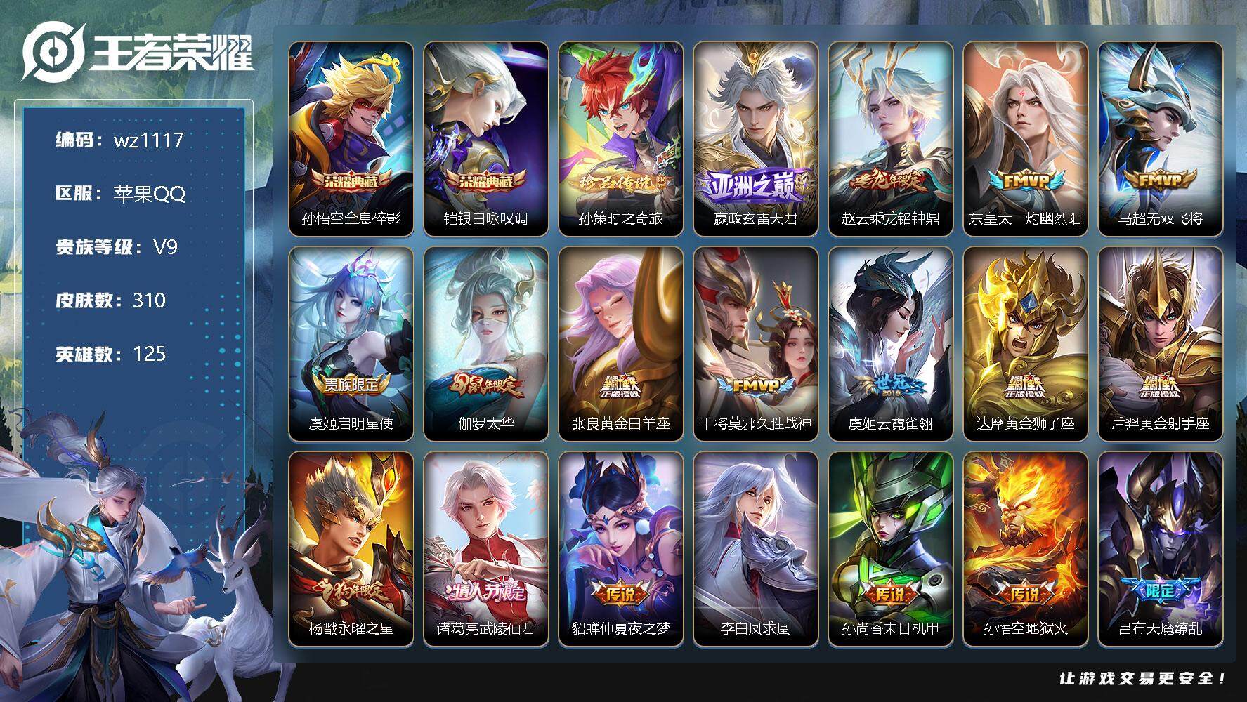 【账号佳】 【可二次实名】【wz1117】【商品标题】:苹果Q-V9-永恒钻石II段位-125英雄-310皮肤-2典藏-0珍品无双-0无双-1珍品传说-19传说-96史诗 【荣耀典藏】:孙悟空全息碎影,铠银白咏叹调 【珍品传说】:孙策时之奇旅 【传说皮肤】:嬴政玄雷天君,赵云乘龙铭钟鼎,东皇太一灼幽烈阳,马超无双飞将,虞姬启明星使,伽罗太华,张良黄金白羊座,干将莫邪久胜战神,虞姬云霓雀翎,达摩黄金狮子座,后羿黄金射手座,杨戬永曜之星,诸葛亮武陵仙君,貂蝉仲夏夜之梦,李白凤求凰,孙尚香末日机甲,孙悟空地狱火,吕布天魔缭乱,狄仁杰超时空战士 【限定皮肤】:白起狰,蔡文姬夏日便利店,虞姬夏日便利店,姜子牙天穹之誓,狄仁杰阴阳师,赵云皇家上将,赵云引擎之心,妲己时之彼端,鲁班七号狮舞东方,庄周玄嵩,阿轲迷踪丽影,钟无艳王者之锤,钟无艳超时空战士,扁鹊奇幻香踪,白起夜都怪侠,芈月重明,芈月幻夜卜梦,吕布天魔缭乱,周瑜赤莲之焰,元歌无心,夏侯惇朔风刀,甄姬幽恒,甄姬落雪兰心,曹操烛龙,曹操天狼征服者,典韦穷奇,典韦岱宗,马可波罗逐梦之星,马可波罗暗影游猎,狄仁杰魔术师,狄仁杰万华元夜,达摩沙漠行僧,项羽海滩派对,老夫子醍醐杖,关羽冰锋战神,安琪拉魔法小厨娘,程咬金演武夺筹,刘邦夺宝奇兵,韩信逐梦之影,韩信飞衡,王昭君凤凰于飞,王昭君午后时光,兰陵王驯魔猎人,兰陵王金庭之子,花木兰青春决赛季,孙悟空美猴王,孙悟空至尊宝,孙悟空大圣娶亲,牛魔御旌,后羿辉光之辰,后羿如梦令,张飞虎魄,李元芳银河之约,李元芳云中旅人,虞姬启明星使,钟馗神迹守卫,钟馗驱傩正仪,杨玉环遇见飞天,杨戬永曜之星,杨戬潮玩骑兵,雅典娜单词大作战,蔡文姬繁星吟游,太乙真人饕餮,太乙真人华丽摇滚,鬼谷子原初探秘者,鬼谷子五谷丰年,诸葛亮武陵仙君,黄忠烈魂,黄忠火炮绅士,铠青龙志,苏烈千军破阵,弈星混沌棋,梦奇顽趣,沈梦溪星空之诺,沈梦溪大漠名商,明世隐疑决卦,明世隐吟游魔法,裴擒虎擒涛扼浪,狂铁御狮,狂铁电玩高手,米莱狄御霄,瑶山海碧波行,伽罗太华,盾山御銮,猪八戒西部大镖客,上官婉儿梁祝,上官婉儿天狼绘梦者,嫦娥如梦令,嫦娥拒霜思,嫦娥暖冬兔眠,西施玲珑珍味,蒙犽狂想玩偶喵,鲁班大师探海日志,桑启海盐诗旅,暃星界游侠,戈娅驭风魔法,艾琳女武神,艾琳流音漫舞,司空震地狱燃心,阿古朵江河有灵,张良古海寻踪,蒙恬荣光圣徽,鬼谷子天穹祈灯,姬小满妄想食味,赵云乘龙铭钟鼎,刘邦剑破天穹,周瑜熔金海岸 【年限皮肤】:铠青龙志,孙悟空美猴王,王昭君凤凰于飞,李白凤求凰,杨戬永曜之星,后羿辉光之辰,伽罗太华,甄姬幽恒,韩信飞衡,典韦岱宗,庄周玄嵩,马超神威,黄忠烈魂,张飞虎魄,瑶山海碧波行,赵云乘龙铭钟鼎 【赛季限定】:白起狰,芈月重明,夏侯惇朔风刀,曹操烛龙,典韦穷奇,狄仁杰万华元夜,达摩沙漠行僧,老夫子醍醐杖,程咬金演武夺筹,兰陵王金庭之子,张良古海寻踪,牛魔御旌,李元芳云中旅人,钟馗驱傩正仪,太乙真人饕餮,鬼谷子原初探秘者,苏烈千军破阵,弈星混沌棋,梦奇顽趣,沈梦溪大漠名商,明世隐疑决卦,裴擒虎擒涛扼浪,狂铁御狮,米莱狄御霄,盾山御銮,鲁班大师探海日志,桑启海盐诗旅,鬼谷子天穹祈灯,蒙恬荣光圣徽,刘邦剑破天穹,姜子牙天穹之誓 【战令限定】:蔡文姬夏日便利店,虞姬夏日便利店,鲁班七号狮舞东方,阿轲迷踪丽影,钟无艳超时空战士,扁鹊奇幻香踪,白起夜都怪侠,芈月幻夜卜梦,周瑜赤莲之焰,甄姬落雪兰心,马可波罗暗影游猎,刘邦夺宝奇兵,王昭君午后时光,兰陵王驯魔猎人,艾琳流音漫舞,李元芳银河之约,钟馗神迹守卫,杨戬潮玩骑兵,雅典娜单词大作战,黄忠火炮绅士,沈梦溪星空之诺,明世隐吟游魔法,狂铁电玩高手,猪八戒西部大镖客,嫦娥暖冬兔眠,西施玲珑珍味,蒙犽狂想玩偶喵,司空震地狱燃心,暃星界游侠,戈娅驭风魔法 【史诗皮肤】:鲁班七号电玩小子,项羽苍穹之光,露娜紫霞仙子,钟无艳王者之锤,赵云皇家上将,赵云未来纪元,貂蝉圣诞恋歌,甄姬冰雪圆舞曲,王昭君偶像歌手,狄仁杰魔术师,廉颇地狱岩魂,宫本武藏鬼剑武藏,孙尚香水果甜心,嬴政摇滚巨星,妲己魅力维加斯,妲己女仆咖啡,墨子龙骑士,墨子金属风暴,吕布圣诞狂欢,刘禅绅士熊喵,曹操幽灵船长,李白千年之狐,吕布末日机甲,安琪拉魔法小厨娘,关羽冰锋战神,王昭君凤凰于飞,孙悟空至尊宝,赵云引擎之心,花木兰水晶猎龙者,刘邦德古拉伯爵,韩信逐梦之影,夏侯惇乘风破浪,小乔缤纷独角兽,兰陵王暗隐猎兽者,诸葛亮黄金分割率,马可波罗逐梦之星,亚瑟心灵战警,雅典娜冰冠公主,安琪拉心灵骇客,后羿辉光之辰,花木兰青春决赛季,百里守约特工魅影,铠曙光守护者,蔡文姬舞动绿茵,刘禅天才门将,李元芳逐浪之夏,程咬金功夫厨神,阿轲节奏热浪,杨玉环遇见飞天,孙策猫狗日记,大乔猫狗日记,铠青龙志,孙悟空大圣娶亲,伽罗箭羽风息,