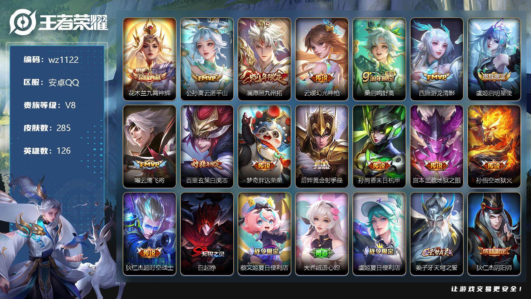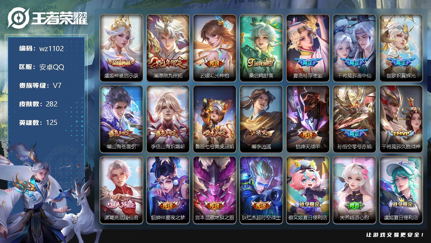 【账号佳】 【可二次实名】【wz1102】【商品标题】:安卓Q-V7-至尊星耀III段位-125英雄-282皮肤-1典藏-0珍品无双-0无双-0珍品传说-17传说-69史诗 【荣耀典藏】:虞姬神鉴启示录 【传说皮肤】:澜愿照九州拓,云缨幻光神枪,桑启鸣野蒿,夏洛特浮生妄,干将莫邪画中仙,伽罗炽翼辉光,曜山海苍雷引,李信山海炽霜斩,鲁班七号寅虎瑞焰,曜李逍遥 ,铠绛天战甲,孙悟空零号赤焰,干将莫邪久胜战神,诸葛亮武陵仙君,貂蝉仲夏夜之梦,宫本武藏地狱之眼,狄仁杰超时空战士 【限定皮肤】:蔡文姬夏日便利店,大乔绒语心约,虞姬夏日便利店,姜子牙天穹之誓,李白谪仙醉月,狄仁杰阴阳师,赵云皇家上将,赵云龙胆,嬴政优雅恋人,孙尚香蔷薇恋人,鲁班七号狮舞东方,鲁班七号寅虎瑞焰,高渐离死亡摇滚,高渐离玩趣恶龙,钟无艳王者之锤,芈月幻夜卜梦,周瑜赤莲之焰,元歌云间偶戏,元歌无心,夏侯惇朔风刀,马可波罗暗影游猎,马可波罗山海玄木吟,狄仁杰魔术师,狄仁杰万华元夜,达摩沙漠行僧,项羽海滩派对,老夫子醍醐杖,关羽冰锋战神,程咬金演武夺筹,韩信逐梦之影,韩信傲雪梅枪,亚瑟潮玩骑士王,孙悟空大圣娶亲,孙悟空零号赤焰,孙悟空孙行者,牛魔御旌,张飞虎魄,李元芳云中旅人,钟馗驱傩正仪,干将莫邪画中仙,雅典娜单词大作战,鬼谷子原初探秘者,鬼谷子五谷丰年,诸葛亮武陵仙君,黄忠烈魂,苏烈千军破阵,百里玄策原初追逐者,弈星混沌棋,沈梦溪大漠名商,沈梦溪匿光破解者,明世隐疑决卦,裴擒虎李小龙,裴擒虎擒涛扼浪,狂铁御狮,米莱狄御霄,云中君纤云弄巧,李信山海炽霜斩,伽罗天狼溯光者,伽罗炽翼辉光,盾山御銮,猪八戒西部大镖客,上官婉儿梁祝,嫦娥拒霜思,曜李逍遥 ,曜山海苍雷引,蒙犽狂想玩偶喵,鲁班大师探海日志,桑启海盐诗旅,夏洛特浮生妄,张良古海寻踪,蒙犽百解令,沈梦溪龙舞盛年,刘邦剑破天穹,程咬金群星魔术团,镜青焰无极,项羽苍威无极,周瑜熔金海岸 【年限皮肤】:鲁班七号寅虎瑞焰,马超神威,黄忠烈魂,张飞虎魄,赵云龙胆,马可波罗山海玄木吟,李信山海炽霜斩,曜山海苍雷引,伽罗炽翼辉光 【赛季限定】:夏侯惇朔风刀,狄仁杰万华元夜,达摩沙漠行僧,老夫子醍醐杖,程咬金演武夺筹,张良古海寻踪,牛魔御旌,李元芳云中旅人,钟馗驱傩正仪,鬼谷子原初探秘者,苏烈千军破阵,百里玄策原初追逐者,弈星混沌棋,沈梦溪大漠名商,明世隐疑决卦,裴擒虎擒涛扼浪,狂铁御狮,米莱狄御霄,盾山御銮,鲁班大师探海日志,桑启海盐诗旅,刘邦剑破天穹,姜子牙天穹之誓 【战令限定】:蔡文姬夏日便利店,虞姬夏日便利店,鲁班七号狮舞东方,芈月幻夜卜梦,周瑜赤莲之焰,元歌云间偶戏,马可波罗暗影游猎,亚瑟潮玩骑士王,雅典娜单词大作战,猪八戒西部大镖客,蒙犽狂想玩偶喵,镜青焰无极,项羽苍威无极 【史诗皮肤】:阿轲暗夜猫娘,钟无艳王者之锤,赵云皇家上将,赵云未来纪元,狄仁杰魔术师,廉颇地狱岩魂,宫本武藏鬼剑武藏,孙尚香蔷薇恋人,孙尚香水果甜心,嬴政优雅恋人,嬴政暗夜贵公子,嬴政摇滚巨星,妲己魅力维加斯,妲己女仆咖啡,墨子金属风暴,吕布圣诞狂欢,李白千年之狐,关羽冰锋战神,花木兰水晶猎龙者,韩信逐梦之影,夏侯惇乘风破浪,兰陵王暗隐猎兽者,诸葛亮黄金分割率,亚瑟心灵战警,雅典娜冰冠公主,百里守约特工魅影,铠曙光守护者,蔡文姬舞动绿茵,李元芳逐浪之夏,程咬金功夫厨神,白起星夜王子,孙策猫狗日记,孙悟空大圣娶亲,鲁班七号狮舞东方,狄仁杰鹰眼统帅,上官婉儿梁祝,娜可露露晚萤,马超神威,赵云龙胆,黄忠烈魂,孙尚香时之恋人,马可波罗暗影游猎,张飞虎魄,蒙犽狂想玩偶喵,百里玄策原初追逐者,裴擒虎李小龙,云中君纤云弄巧,元歌云间偶戏,伽罗天狼溯光者,孙悟空孙行者,司马懿暗渊魔法,嫦娥拒霜思,韩信傲雪梅枪,澜赏金猎手,鬼谷子五谷丰年,元歌无心,马可波罗山海玄木吟,沈梦溪匿光破解者,蒙犽百解令,镜青焰无极,黄忠怒海争锋,蔡文姬夏日便利店,李白谪仙醉月,牛魔星界战将,赵怀真器灵浮梦炉,阿轲化蝶舞,周瑜百相守梦,黄忠百相守梦,公孙离涂山容容 【其他皮肤】:项羽海滩派对,韩信教廷特使,韩信街头霸王,露娜哥特玫瑰,阿轲爱心护理,达摩大发明家,赵云忍炎影,芈月红桃皇后,程咬金星际陆战队,白起白色死神,牛魔西部大镖客,武则天东方不败,扁鹊化身博士,扁鹊救世之瞳,宫本武藏未来纪元,孙膑天使之翼,妲己少女阿狸,典韦黄金武士,亚瑟死亡骑士,花木兰兔女郎,张飞五福同心,甄姬花好人间,刘备万事如意,宫本武藏万象初新,后羿阿尔法小队,狄仁杰阴阳师,刘备纽约教父,高渐离死亡摇滚,刘备汉昭烈帝,李元芳黑猫爱糖果,关羽龙腾万里,墨子进击墨子号,钟无艳海滩丽影,宫本武藏霸王丸,狂铁命运角斗场,老夫子功夫老勺,孙尚香沉稳之力,诸葛亮掌控之力,李白敏锐之力,鬼谷子幻乐之宴,狂铁御狮,苏烈坚韧之力,大乔守护之力,项羽科