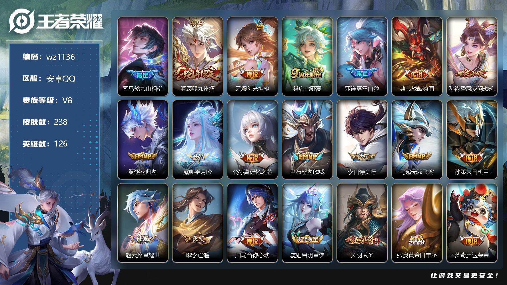 【账号佳】 【可二次实名】【wz1136】【商品标题】:安卓Q-V8-永恒钻石I段位-126英雄-238皮肤-0典藏-0珍品无双-0无双-0珍品传说-24传说-80史诗 【传说皮肤】:司马懿九山相柳,澜愿照九州拓,云缨幻光神枪,桑启鸣野蒿,亚连落雪白狼,典韦战鼓燎原,孙尚香乘龙问璇玑,澜逐花归海,露娜霜月吟,公孙离记忆之芯,吕布怒海麟威,李白诗剑行,马超无双飞将,孙策末日机甲,赵云淬星耀世,曜李逍遥 ,周瑜音你心动,虞姬启明星使,关羽武圣,张良黄金白羊座,梦奇胖达荣荣,后羿黄金射手座,貂蝉仲夏夜之梦,宫本武藏地狱之眼 【限定皮肤】:暃埋骨钱,蔡文姬夏日便利店,大乔绒语心约,虞姬夏日便利店,姜子牙天穹之誓,狄仁杰阴阳师,赵云皇家上将,嬴政优雅恋人,元歌云间偶戏,狄仁杰魔术师,狄仁杰万华元夜,达摩星际陆战队,达摩沙漠行僧,项羽海滩派对,老夫子醍醐杖,关羽武圣,程咬金演武夺筹,韩信傲雪梅枪,兰陵王金庭之子,花木兰默契交锋,亚瑟潮玩骑士王,孙悟空至尊宝,刘备百相守梦,李元芳匿光侦查者,李元芳云中旅人,虞姬霸王别姬,虞姬启明星使,钟馗神迹守卫,钟馗驱傩正仪,干将莫邪冰霜恋舞曲,鬼谷子原初探秘者,苏烈千军破阵,沈梦溪星空之诺,明世隐疑决卦,裴擒虎李小龙,裴擒虎擒涛扼浪,米莱狄胡桃异想国,云中君纤云弄巧,上官婉儿梁祝,嫦娥拒霜思,嫦娥暖冬兔眠,曜李逍遥 ,鲁班大师探海日志,桑启海盐诗旅,暃星界游侠,艾琳流音漫舞,司空震地狱燃心,阿古朵江河有灵,张良古海寻踪,蒙犽百解令,蒙恬荣光圣徽,鬼谷子天穹祈灯,孙尚香乘龙问璇玑,亚连落雪白狼,沈梦溪龙舞盛年,刘邦剑破天穹,程咬金群星魔术团,关羽决胜骁骑,镜青焰无极,项羽苍威无极,海诺心动手记,芈月浮光幕影,周瑜熔金海岸 【年限皮肤】:关羽武圣,孙尚香乘龙问璇玑 【赛季限定】:狄仁杰万华元夜,达摩沙漠行僧,老夫子醍醐杖,程咬金演武夺筹,兰陵王金庭之子,张良古海寻踪,李元芳云中旅人,钟馗驱傩正仪,鬼谷子原初探秘者,苏烈千军破阵,明世隐疑决卦,裴擒虎擒涛扼浪,鲁班大师探海日志,桑启海盐诗旅,鬼谷子天穹祈灯,蒙恬荣光圣徽,刘邦剑破天穹,姜子牙天穹之誓 【战令限定】:蔡文姬夏日便利店,虞姬夏日便利店,元歌云间偶戏,达摩星际陆战队,艾琳流音漫舞,亚瑟潮玩骑士王,钟馗神迹守卫,沈梦溪星空之诺,米莱狄胡桃异想国,嫦娥暖冬兔眠,司空震地狱燃心,暃星界游侠,镜青焰无极,项羽苍威无极 【史诗皮肤】:项羽苍穹之光,露娜紫霞仙子,赵云皇家上将,赵云未来纪元,甄姬冰雪圆舞曲,王昭君偶像歌手,狄仁杰魔术师,廉颇地狱岩魂,宫本武藏鬼剑武藏,孙尚香水果甜心,嬴政优雅恋人,嬴政暗夜贵公子,嬴政摇滚巨星,妲己魅力维加斯,墨子金属风暴,吕布圣诞狂欢,曹操幽灵船长,李白千年之狐,吕布末日机甲,张飞乱世虎臣,虞姬霸王别姬,孙悟空至尊宝,刘邦德古拉伯爵,夏侯惇乘风破浪,小乔缤纷独角兽,兰陵王暗隐猎兽者,亚瑟心灵战警,百里守约特工魅影,铠曙光守护者,蔡文姬舞动绿茵,李元芳逐浪之夏,白起星夜王子,阿轲节奏热浪,干将莫邪冰霜恋舞曲,狄仁杰鹰眼统帅,上官婉儿梁祝,不知火舞魅语,橘右京修罗,瑶遇见神鹿,裴擒虎李小龙,云中君纤云弄巧,元歌云间偶戏,花木兰默契交锋,米莱狄胡桃异想国,百里玄策热力回旋,沈梦溪月团寄思,司马懿暗渊魔法,嫦娥拒霜思,韩信傲雪梅枪,哪吒雪上飞焰,暃星界游侠,镜玫瑰异探,刘备百相守梦,刘禅电玩爆裂旋风,李元芳匿光侦查者,司空震地狱燃心,阿古朵江河有灵,蒙犽百解令,蒙恬荣光圣徽,镜青焰无极,关羽决胜骁骑,海诺心动手记,芈月浮光幕影,蔡文姬夏日便利店,暃埋骨钱,少司缘涂山红红,大司命东方月初,姬小满战舞者,亚连破空之剑,马可波罗星界特工,艾琳陌上桑,牛魔星界战将,姬小满飞车小橘子,白起苍鳞隐世,弈星万物之道,赵怀真器灵浮梦炉,阿轲化蝶舞,狂铁龙之律动,黄忠百相守梦,西施织梦人 【其他皮肤】:项羽海滩派对,韩信教廷特使,赵云白执事,赵云忍炎影,程咬金星际陆战队,白起白色死神,牛魔西部大镖客,扁鹊化身博士,扁鹊救世之瞳,宫本武藏未来纪元,姜子牙时尚教父,典韦黄金武士,亚瑟死亡骑士,达摩拳王,花木兰兔女郎,张飞五福同心,刘备万事如意,宫本武藏万象初新,狄仁杰阴阳师,关羽龙腾万里,钟无艳海滩丽影,王昭君幻想奇妙夜,狂铁命运角斗场,老夫子功夫老勺,孙尚香沉稳之力,诸葛亮掌控之力,鬼谷子幻乐之宴,苏烈坚韧之力,大乔守护之力,明世隐虹云星官,庄周奇妙博物学,吕布野性能量,钟馗神迹守卫,沈梦溪鲨炮海盗猫,姜子牙炽热元素使,沈梦溪星空之诺,哪吒次元突破,明世隐疑决卦,老夫子醍醐杖,狂铁特工战影,鬼谷子原初探秘者,狄仁杰万华元夜,亚瑟潮玩骑士王,刘禅秘密基地,杨戬次元傲视,露娜瓷语鉴心,达摩星际陆战队,程咬金演武夺筹,张良缤纷绘卷,钟馗驱傩正仪,鲁班大师乓乓大师,苏烈千军破阵,达摩沙