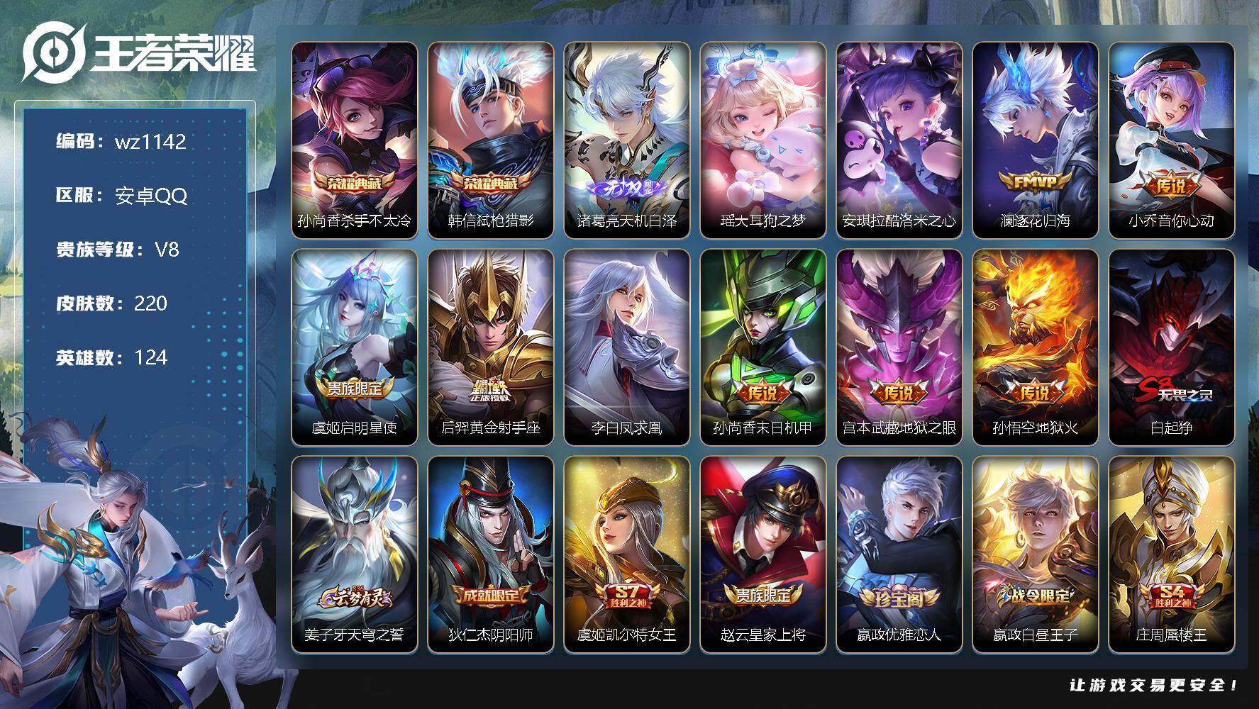 【账号佳】 【可二次实名】【wz1142】【商品标题】:安卓Q-V8-至尊星耀III段位-124英雄-220皮肤-2典藏-0珍品无双-1无双-2珍品传说-8传说-48史诗 【荣耀典藏】:孙尚香杀手不太冷,韩信弑枪猎影 【无双皮肤】:诸葛亮天机白泽 【珍品传说】:瑶大耳狗之梦,安琪拉酷洛米之心 【传说皮肤】:澜逐花归海,小乔音你心动,虞姬启明星使,后羿黄金射手座,李白凤求凰,孙尚香末日机甲,宫本武藏地狱之眼,孙悟空地狱火 【限定皮肤】:白起狰,姜子牙天穹之誓,狄仁杰阴阳师,虞姬凯尔特女王,赵云皇家上将,嬴政优雅恋人,嬴政白昼王子,庄周蜃楼王,高渐离死亡摇滚,孙膑妖精王,扁鹊炼金王,芈月重明,吕布猎兽之王,夏侯惇朔风刀,甄姬游园惊梦,曹操烛龙,典韦穷奇,狄仁杰魔术师,项羽海滩派对,老夫子醍醐杖,程咬金演武夺筹,韩信逐梦之影,王昭君凤凰于飞,亚瑟狮心王,孙悟空至尊宝,牛魔御旌,李元芳云中旅人,虞姬启明星使,钟馗驱傩正仪,杨玉环遇见飞天,蔡文姬繁星吟游,太乙真人饕餮,太乙真人华丽摇滚,鬼谷子原初探秘者,铠青龙志,百里玄策原初追逐者,弈星混沌棋,沈梦溪大漠名商,明世隐疑决卦,裴擒虎李小龙,狂铁御狮,米莱狄御霄,盾山御銮,上官婉儿梁祝,桑启海盐诗旅,鬼谷子天穹祈灯,鲁班七号蔬乡物语,周瑜熔金海岸 【年限皮肤】:铠青龙志,王昭君凤凰于飞,李白凤求凰 【赛季限定】:庄周蜃楼王,孙膑妖精王,扁鹊炼金王,白起狰,芈月重明,夏侯惇朔风刀,曹操烛龙,典韦穷奇,老夫子醍醐杖,程咬金演武夺筹,亚瑟狮心王,牛魔御旌,李元芳云中旅人,虞姬凯尔特女王,钟馗驱傩正仪,太乙真人饕餮,鬼谷子原初探秘者,百里玄策原初追逐者,弈星混沌棋,沈梦溪大漠名商,明世隐疑决卦,狂铁御狮,米莱狄御霄,盾山御銮,桑启海盐诗旅,鬼谷子天穹祈灯,姜子牙天穹之誓 【战令限定】:嬴政白昼王子,吕布猎兽之王,鲁班七号蔬乡物语 【史诗皮肤】:赵云皇家上将,赵云未来纪元,狄仁杰魔术师,廉颇地狱岩魂,孙尚香水果甜心,嬴政优雅恋人,嬴政摇滚巨星,妲己魅力维加斯,妲己女仆咖啡,墨子龙骑士,墨子金属风暴,吕布圣诞狂欢,李白千年之狐,吕布末日机甲,张飞乱世虎臣,韩信白龙吟,王昭君凤凰于飞,孙悟空至尊宝,刘邦德古拉伯爵,韩信逐梦之影,夏侯惇乘风破浪,小乔缤纷独角兽,兰陵王暗隐猎兽者,诸葛亮黄金分割率,甄姬游园惊梦,蔡文姬舞动绿茵,程咬金功夫厨神,白起星夜王子,杨玉环遇见飞天,嬴政白昼王子,铠青龙志,伽罗箭羽风息,狄仁杰鹰眼统帅,上官婉儿梁祝,蔡文姬繁星吟游,小乔青蛇,孙尚香时之恋人,百里玄策原初追逐者,裴擒虎李小龙,鲁班七号蔬乡物语,阿轲化蝶舞,刘禅鸭鸭历险记,狂铁龙之律动,周瑜百相守梦,黄忠百相守梦,朵莉亚幻珠鲛人,西施织梦人,公孙离涂山容容 【其他皮肤】:项羽海滩派对,韩信教廷特使,韩信街头霸王,露娜哥特玫瑰,阿轲致命风华,阿轲爱心护理,达摩大发明家,赵云白执事,赵云忍炎影,程咬金爱与正义,白起白色死神,牛魔西部大镖客,扁鹊化身博士,扁鹊救世之瞳,宫本武藏未来纪元,安琪拉玩偶对对碰,孙膑天使之翼,姜子牙时尚教父,妲己少女阿狸,典韦黄金武士,亚瑟死亡骑士,达摩拳王,花木兰兔女郎,张飞五福同心,甄姬花好人间,宫本武藏万象初新,亚瑟狮心王,狄仁杰阴阳师,庄周蜃楼王,刘备纽约教父,高渐离死亡摇滚,孙膑妖精王,李元芳黑猫爱糖果,扁鹊炼金王,关羽龙腾万里,虞姬凯尔特女王,墨子进击墨子号,白起狰,钟无艳海滩丽影,太乙真人饕餮,宫本武藏霸王丸,曹操烛龙,芈月重明,老夫子功夫老勺,典韦穷奇,李白敏锐之力,鬼谷子幻乐之宴,狂铁御狮,安琪拉如懿,太乙真人华丽摇滚,苏烈坚韧之力,大乔守护之力,项羽科学大爆炸,米莱狄御霄,吕布猎兽之王,明世隐虹云星官,牛魔御旌,小乔丁香结,吕布野性能量,盾山御銮,孙膑归虚梦演,沈梦溪鲨炮海盗猫,姜子牙炽热元素使,夏侯惇朔风刀,弈星混沌棋,哪吒次元突破,明世隐疑决卦,老夫子醍醐杖,廉颇无尽征程,鬼谷子原初探秘者,刘禅秘密基地,程咬金演武夺筹,张良缤纷绘卷,盘古重装意志,钟馗驱傩正仪,鲁班大师乓乓大师,程咬金无双福将,沈梦溪大漠名商,蒙恬蔚蓝守将,李元芳云中旅人,桑启海盐诗旅,猪八戒潮玩探月行,赵怀真太极少年,后羿完美运算,鬼谷子天穹祈灯,朵莉亚金色潮汐,廉颇功夫炙烤,姜子牙天穹之誓,周瑜熔金海岸,东皇太一噬灭天穹,西施雪境奇遇,姜子牙星梦巡礼,东皇太一金福满堂,明世隐景韶洛都,戈娅玫蓝誓约,刘备浪漫序章,钟馗虚灵犬护,沈梦溪鸭鸭历险记,阿古朵布丁狗之约,露娜命运加冕,雅典娜潮玩士官长,姬小满小满鸭,甄姬逆浪荇歌,孙策百相守梦,莱西奥踏浪烽翎,鬼谷子克喵,桑启青衿临川,鲁班七号福禄兄弟,高渐离金属狂潮,项羽帝国元帅,露娜绯红之刃,貂蝉异域舞娘,老夫子潮流仙人,程咬金华尔街大亨,曹操超能战警,小乔万圣前夜,孙悟空西部大镖客,