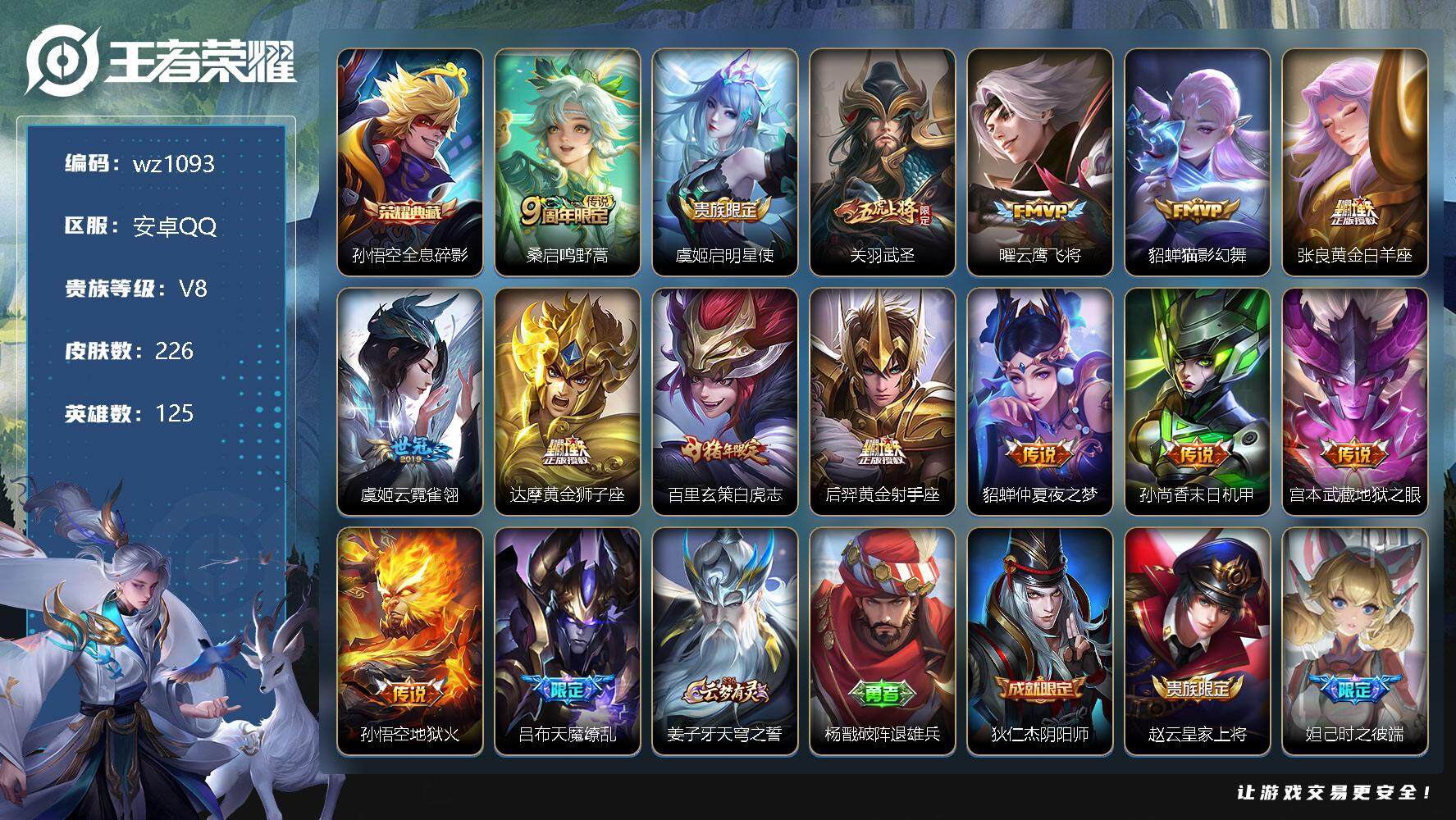 【账号佳】 【可二次实名】【wz1093】【商品标题】:安卓Q-V8-永恒钻石I段位-125英雄-226皮肤-1典藏-0珍品无双-0无双-0珍品传说-15传说-71史诗 【荣耀典藏】:孙悟空全息碎影 【传说皮肤】:桑启鸣野蒿,虞姬启明星使,关羽武圣,曜云鹰飞将,貂蝉猫影幻舞,张良黄金白羊座,虞姬云霓雀翎,达摩黄金狮子座,百里玄策白虎志,后羿黄金射手座,貂蝉仲夏夜之梦,孙尚香末日机甲,宫本武藏地狱之眼,孙悟空地狱火,吕布天魔缭乱 【限定皮肤】:姜子牙天穹之誓,杨戬破阵退雄兵,狄仁杰阴阳师,赵云皇家上将,妲己时之彼端,孙尚香蔷薇恋人,庄周高山流水,阿轲迷踪丽影,孙膑天狼运算者,吕布天魔缭乱,吕布猎兽之王,周瑜赤莲之焰,元歌云间偶戏,夏侯惇朔风刀,曹操天狼征服者,典韦蓝屏警告,马可波罗暗影游猎,狄仁杰魔术师,狄仁杰万华元夜,达摩沙漠行僧,项羽海滩派对,老夫子醍醐杖,关羽武圣,程咬金演武夺筹,刘邦夺宝奇兵,韩信飞衡,兰陵王驯魔猎人,兰陵王金庭之子,亚瑟潮玩骑士王,孙悟空至尊宝,孙悟空大圣娶亲,牛魔御旌,后羿如梦令,李元芳银河之约,李元芳云中旅人,虞姬启明星使,钟馗驱傩正仪,女娲朔望之晖,雅典娜单词大作战,蔡文姬繁星吟游,鬼谷子原初探秘者,鬼谷子五谷丰年,苏烈千军破阵,百里玄策白虎志,百里玄策原初追逐者,百里守约朱雀志,弈星混沌棋,沈梦溪星空之诺,沈梦溪大漠名商,明世隐疑决卦,裴擒虎天狼狩猎者,裴擒虎李小龙,裴擒虎擒涛扼浪,盾山御銮,猪八戒西部大镖客,上官婉儿梁祝,上官婉儿天狼绘梦者,嫦娥如梦令,蒙犽狂想玩偶喵,鲁班大师探海日志,桑启海盐诗旅,张良古海寻踪,鬼谷子天穹祈灯,刘邦剑破天穹,周瑜熔金海岸 【年限皮肤】:百里玄策白虎志,百里守约朱雀志,韩信飞衡,关羽武圣 【赛季限定】:夏侯惇朔风刀,狄仁杰万华元夜,达摩沙漠行僧,老夫子醍醐杖,程咬金演武夺筹,兰陵王金庭之子,张良古海寻踪,牛魔御旌,李元芳云中旅人,钟馗驱傩正仪,鬼谷子原初探秘者,苏烈千军破阵,百里玄策原初追逐者,弈星混沌棋,沈梦溪大漠名商,明世隐疑决卦,裴擒虎擒涛扼浪,盾山御銮,鲁班大师探海日志,桑启海盐诗旅,鬼谷子天穹祈灯,刘邦剑破天穹,姜子牙天穹之誓 【战令限定】:阿轲迷踪丽影,吕布猎兽之王,周瑜赤莲之焰,元歌云间偶戏,典韦蓝屏警告,马可波罗暗影游猎,刘邦夺宝奇兵,兰陵王驯魔猎人,亚瑟潮玩骑士王,李元芳银河之约,女娲朔望之晖,雅典娜单词大作战,沈梦溪星空之诺,猪八戒西部大镖客,蒙犽狂想玩偶喵 【史诗皮肤】:鲁班七号电玩小子,项羽苍穹之光,露娜紫霞仙子,阿轲暗夜猫娘,赵云皇家上将,貂蝉圣诞恋歌,狄仁杰魔术师,廉颇地狱岩魂,宫本武藏鬼剑武藏,孙尚香蔷薇恋人,孙尚香水果甜心,嬴政暗夜贵公子,妲己魅力维加斯,墨子金属风暴,吕布圣诞狂欢,曹操幽灵船长,李白千年之狐,吕布末日机甲,韩信白龙吟,孙悟空至尊宝,花木兰水晶猎龙者,夏侯惇乘风破浪,小乔缤纷独角兽,兰陵王暗隐猎兽者,诸葛亮黄金分割率,亚瑟心灵战警,雅典娜冰冠公主,安琪拉心灵骇客,百里守约特工魅影,铠曙光守护者,蔡文姬舞动绿茵,刘禅天才门将,程咬金功夫厨神,阿轲节奏热浪,孙策猫狗日记,大乔猫狗日记,百里守约朱雀志,孙悟空大圣娶亲,典韦蓝屏警告,伽罗箭羽风息,裴擒虎天狼狩猎者,狄仁杰鹰眼统帅,公孙离无限星赏官,兰陵王驯魔猎人,上官婉儿梁祝,曹操天狼征服者,蔡文姬繁星吟游,李元芳银河之约,娜可露露晚萤,韩信飞衡,妲己时之彼端,嫦娥如梦令,后羿如梦令,不知火舞魅语,阿轲迷踪丽影,橘右京修罗,上官婉儿天狼绘梦者,马可波罗暗影游猎,蒙犽狂想玩偶喵,百里玄策原初追逐者,裴擒虎李小龙,孙膑天狼运算者,元歌云间偶戏,沈梦溪月团寄思,庄周高山流水,鬼谷子五谷丰年,弈星万物之道,阿轲化蝶舞,狂铁龙之律动,黄忠百相守梦,西施织梦人 【其他皮肤】:项羽海滩派对,韩信教廷特使,韩信街头霸王,露娜哥特玫瑰,达摩大发明家,赵云白执事,赵云忍炎影,芈月红桃皇后,程咬金星际陆战队,白起白色死神,牛魔西部大镖客,扁鹊化身博士,扁鹊救世之瞳,安琪拉玩偶对对碰,孙膑天使之翼,妲己少女阿狸,亚瑟死亡骑士,达摩拳王,花木兰兔女郎,张飞五福同心,甄姬花好人间,刘备万事如意,宫本武藏万象初新,狄仁杰阴阳师,刘备纽约教父,关羽龙腾万里,钟无艳海滩丽影,宫本武藏霸王丸,王昭君幻想奇妙夜,狂铁命运角斗场,老夫子功夫老勺,孙尚香沉稳之力,诸葛亮掌控之力,李白敏锐之力,鬼谷子幻乐之宴,苏烈坚韧之力,大乔守护之力,吕布猎兽之王,明世隐虹云星官,牛魔御旌,女娲朔望之晖,吕布野性能量,盾山御銮,沈梦溪鲨炮海盗猫,姜子牙炽热元素使,夏侯惇朔风刀,周瑜赤莲之焰,沈梦溪星空之诺,弈星混沌棋,哪吒次元突破,明世隐疑决卦,刘邦夺宝奇兵,盾山圆桌骑士,老夫子醍醐杖,猪八戒西部大镖客,鬼谷子原初探秘者,雅典娜单词大作战,狄仁杰万