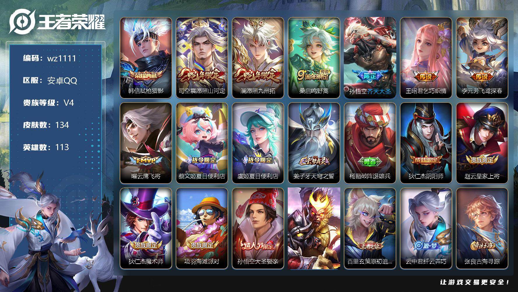 【账号佳】 【可二次实名】【wz1111】【商品标题】:安卓Q-V4-最强王者段位-113英雄-134皮肤-1典藏-0珍品无双-0无双-0珍品传说-7传说-34史诗 【荣耀典藏】:韩信弑枪猎影 【传说皮肤】:司空震愿照山河定,澜愿照九州拓,桑启鸣野蒿,孙悟空齐天大圣,王昭君乞巧织情,李元芳飞鸢探春,曜云鹰飞将 【限定皮肤】:蔡文姬夏日便利店,虞姬夏日便利店,姜子牙天穹之誓,杨戬破阵退雄兵,狄仁杰阴阳师,赵云皇家上将,狄仁杰魔术师,项羽海滩派对,孙悟空大圣娶亲,孙悟空齐天大圣,百里玄策原初追逐者,云中君纤云弄巧,张良古海寻踪,高渐离燃音魔法,妲己灵卜魔法,鬼谷子天穹祈灯,沈梦溪龙舞盛年,鲁班七号蔬乡物语,李元芳蔬乡物语,刘邦剑破天穹,镜青焰无极,项羽苍威无极,周瑜熔金海岸 【赛季限定】:张良古海寻踪,百里玄策原初追逐者,鬼谷子天穹祈灯,刘邦剑破天穹,姜子牙天穹之誓 【战令限定】:蔡文姬夏日便利店,虞姬夏日便利店,高渐离燃音魔法,妲己灵卜魔法,鲁班七号蔬乡物语,李元芳蔬乡物语,镜青焰无极,项羽苍威无极 【史诗皮肤】:露娜紫霞仙子,赵云皇家上将,甄姬冰雪圆舞曲,王昭君偶像歌手,狄仁杰魔术师,宫本武藏鬼剑武藏,孙尚香水果甜心,嬴政暗夜贵公子,嬴政摇滚巨星,李白千年之狐,吕布末日机甲,张飞乱世虎臣,花木兰水晶猎龙者,刘邦德古拉伯爵,兰陵王暗隐猎兽者,诸葛亮黄金分割率,阿轲节奏热浪,孙悟空大圣娶亲,伽罗箭羽风息,狄仁杰鹰眼统帅,大乔白蛇,百里玄策原初追逐者,云中君纤云弄巧,沈梦溪月团寄思,澜赏金猎手,百里守约真我赫兹,妲己灵卜魔法,高渐离燃音魔法,鲁班七号蔬乡物语,镜青焰无极,蔡文姬夏日便利店,亚连破空之剑,牛魔星界战将,阿轲化蝶舞,狂铁龙之律动 【其他皮肤】:项羽海滩派对,韩信街头霸王,赵云白执事,赵云忍炎影,扁鹊化身博士,扁鹊救世之瞳,宫本武藏未来纪元,安琪拉玩偶对对碰,孙膑天使之翼,妲己少女阿狸,典韦黄金武士,达摩拳王,甄姬花好人间,刘备万事如意,狄仁杰阴阳师,关羽龙腾万里,王昭君幻想奇妙夜,狂铁命运角斗场,孙尚香沉稳之力,诸葛亮掌控之力,大乔守护之力,张良幽兰居士,庄周奇妙博物学,哪吒次元突破,刘禅秘密基地,鲁班大师乓乓大师,刘禅唤灵魔甲,太乙真人劲辣红锅,张良古海寻踪,后羿完美运算,程咬金暖冬絮语,鬼谷子天穹祈灯,妲己灵卜魔法,嫦娥漠中幻影,沈梦溪龙舞盛年,钟无艳春野之旅,李元芳蔬乡物语,扁鹊无尽旅途,刘邦剑破天穹,盘古经纬探寻者,项羽苍威无极,杨戬破阵退雄兵,姜子牙天穹之誓,周瑜熔金海岸,虞姬夏日便利店,孙悟空神迹守卫,东皇太一噬灭天穹,干将莫邪雾都夜雨,吕布逐霄战戟,太乙真人谧流熔炉,东皇太一金福满堂,明世隐景韶洛都,戈娅玫蓝誓约,刘备浪漫序章,钟馗虚灵犬护,小乔秘证寻踪,张良灵野札记,阿古朵布丁狗之约,露娜命运加冕,白起死霸装,甄姬逆浪荇歌,鲁班七号福禄兄弟,露娜绯红之刃,曹操超能战警,孙悟空西部大镖客,钟馗地府判官,李元芳特种部队,夏侯惇战争骑士,雅典娜战争女神,马可波罗激情绿茵,杨戬埃及法老,黄忠芝加哥教父,东皇太一东海龙王,百里玄策威尼斯狂欢,梦奇美梦成真,女娲尼罗河女神,公孙离花间舞,元歌午夜歌剧院,司马懿魇语军师,李信灼热之刃,上官婉儿修竹墨客,猪八戒年年有余,盘古创世神祝,云中君荷鲁斯之眼,曜归虚梦演,马超幸存者,西施归虚梦演,镜冰刃幻境,阿古朵熊喵少女,司空震启蛰,云缨赤焰之缨,金蝉前尘 【营地ID】:1692705344