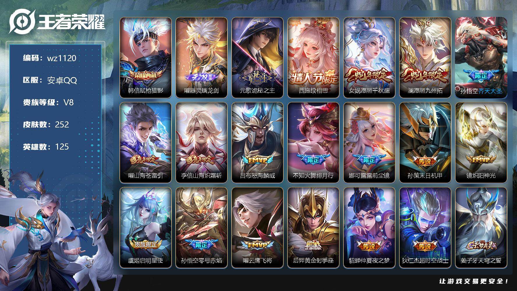 【账号佳】 【可二次实名】【wz1120】【商品标题】:安卓Q-V8-至尊星耀III段位-125英雄-252皮肤-1典藏-0珍品无双-1无双-0珍品传说-18传说-82史诗 【荣耀典藏】:韩信弑枪猎影 【无双皮肤】:曜器灵螭龙剑 【传说皮肤】:元歌诡秘之主,西施续相思,女娲愿照千秋盛,澜愿照九州拓,孙悟空齐天大圣,曜山海苍雷引,李信山海炽霜斩,吕布怒海麟威,不知火舞绯月行,娜可露露前尘镜,孙策末日机甲,镜炽阳神光,虞姬启明星使,孙悟空零号赤焰,曜云鹰飞将,后羿黄金射手座,貂蝉仲夏夜之梦,狄仁杰超时空战士 【限定皮肤】:姜子牙天穹之誓,狄仁杰阴阳师,赵云皇家上将,赵云百木心枪,嬴政优雅恋人,鲁班七号乒乒小将,钟无艳超时空战士,白起夜都怪侠,芈月幻夜卜梦,元歌无心,甄姬落雪兰心,马可波罗暗影游猎,马可波罗山海玄木吟,狄仁杰魔术师,狄仁杰万华元夜,达摩沙漠行僧,项羽海滩派对,老夫子醍醐杖,老夫子航海奇遇记,程咬金演武夺筹,韩信傲雪梅枪,王昭君午后时光,兰陵王金庭之子,不知火舞绯月行,娜可露露前尘镜,亚瑟潮玩骑士王,孙悟空至尊宝,孙悟空零号赤焰,孙悟空齐天大圣,李元芳云中旅人,虞姬启明星使,钟馗驱傩正仪,杨玉环寅虎心曲,雅典娜单词大作战,鬼谷子原初探秘者,鬼谷子五谷丰年,黄忠火炮绅士,铠青龙志,苏烈千军破阵,百里玄策原初追逐者,公孙离蜜橘之夏,公孙离玉兔公主,沈梦溪大漠名商,明世隐吟游魔法,裴擒虎天狼狩猎者,裴擒虎李小龙,裴擒虎擒涛扼浪,狂铁电玩高手,瑶山海碧波行,李信山海炽霜斩,盾山梦圆繁星,上官婉儿神器万象笔,嫦娥暖冬兔眠,曜山海苍雷引,西施玲珑珍味,鲁班大师匿光启智者,鲁班大师探海日志,桑启海盐诗旅,暃星界游侠,戈娅驭风魔法,艾琳女武神,艾琳流音漫舞,司空震地狱燃心,阿古朵江河有灵,张良古海寻踪,妲己灵卜魔法,鬼谷子天穹祈灯,镜青焰无极,周瑜熔金海岸 【年限皮肤】:铠青龙志,杨玉环寅虎心曲,瑶山海碧波行,马可波罗山海玄木吟,李信山海炽霜斩,曜山海苍雷引 【赛季限定】:狄仁杰万华元夜,达摩沙漠行僧,老夫子醍醐杖,程咬金演武夺筹,兰陵王金庭之子,张良古海寻踪,李元芳云中旅人,钟馗驱傩正仪,鬼谷子原初探秘者,苏烈千军破阵,百里玄策原初追逐者,沈梦溪大漠名商,裴擒虎擒涛扼浪,鲁班大师探海日志,桑启海盐诗旅,鬼谷子天穹祈灯,姜子牙天穹之誓 【战令限定】:钟无艳超时空战士,白起夜都怪侠,芈月幻夜卜梦,甄姬落雪兰心,马可波罗暗影游猎,老夫子航海奇遇记,王昭君午后时光,艾琳流音漫舞,亚瑟潮玩骑士王,雅典娜单词大作战,黄忠火炮绅士,明世隐吟游魔法,狂铁电玩高手,嫦娥暖冬兔眠,西施玲珑珍味,司空震地狱燃心,暃星界游侠,戈娅驭风魔法,妲己灵卜魔法,镜青焰无极 【史诗皮肤】:鲁班七号电玩小子,项羽苍穹之光,露娜紫霞仙子,阿轲暗夜猫娘,赵云皇家上将,赵云未来纪元,貂蝉圣诞恋歌,甄姬冰雪圆舞曲,狄仁杰魔术师,廉颇地狱岩魂,宫本武藏鬼剑武藏,孙尚香水果甜心,嬴政优雅恋人,嬴政暗夜贵公子,妲己魅力维加斯,妲己女仆咖啡,墨子金属风暴,吕布圣诞狂欢,刘禅绅士熊喵,曹操幽灵船长,李白千年之狐,吕布末日机甲,张飞乱世虎臣,孙悟空至尊宝,花木兰水晶猎龙者,刘邦德古拉伯爵,夏侯惇乘风破浪,小乔缤纷独角兽,亚瑟心灵战警,雅典娜冰冠公主,安琪拉心灵骇客,百里守约特工魅影,蔡文姬舞动绿茵,刘禅天才门将,公孙离蜜橘之夏,李元芳逐浪之夏,程咬金功夫厨神,孙策猫狗日记,铠青龙志,伽罗箭羽风息,裴擒虎天狼狩猎者,狄仁杰鹰眼统帅,娜可露露晚萤,不知火舞魅语,橘右京修罗,孙尚香时之恋人,马可波罗暗影游猎,百里玄策原初追逐者,裴擒虎李小龙,老夫子航海奇遇记,鲁班七号乒乒小将,黄忠火炮绅士,韩信傲雪梅枪,杨玉环寅虎心曲,赵云百木心枪,公孙离玉兔公主,澜赏金猎手,明世隐吟游魔法,貂蝉唤灵魅影,狂铁电玩高手,鲁班大师匿光启智者,钟无艳超时空战士,鬼谷子五谷丰年,盾山梦圆繁星,阿古朵顽趣,上官婉儿神器万象笔,元歌无心,暃星界游侠,马可波罗山海玄木吟,瑶山海碧波行,戈娅驭风魔法,司空震地狱燃心,阿古朵江河有灵,妲己灵卜魔法,镜青焰无极,孙膑茶境仙,弈星万物之道,赵怀真器灵浮梦炉,阿轲化蝶舞,老夫子藏狐褐绒,周瑜百相守梦,黄忠百相守梦,西施织梦人 【其他皮肤】:项羽海滩派对,韩信教廷特使,韩信街头霸王,露娜哥特玫瑰,达摩大发明家,赵云忍炎影,艾琳女武神,程咬金爱与正义,白起白色死神,牛魔西部大镖客,扁鹊化身博士,宫本武藏未来纪元,妲己少女阿狸,典韦黄金武士,亚瑟死亡骑士,达摩拳王,甄姬花好人间,刘备万事如意,狄仁杰阴阳师,刘备纽约教父,刘备汉昭烈帝,关羽龙腾万里,钟无艳海滩丽影,宫本武藏霸王丸,王昭君幻想奇妙夜,老夫子功夫老勺,孙尚香沉稳之力,诸葛亮掌控之力,李白敏锐之力,鬼谷子幻乐之宴,苏烈坚韧之力,大乔守护之力,明世隐虹