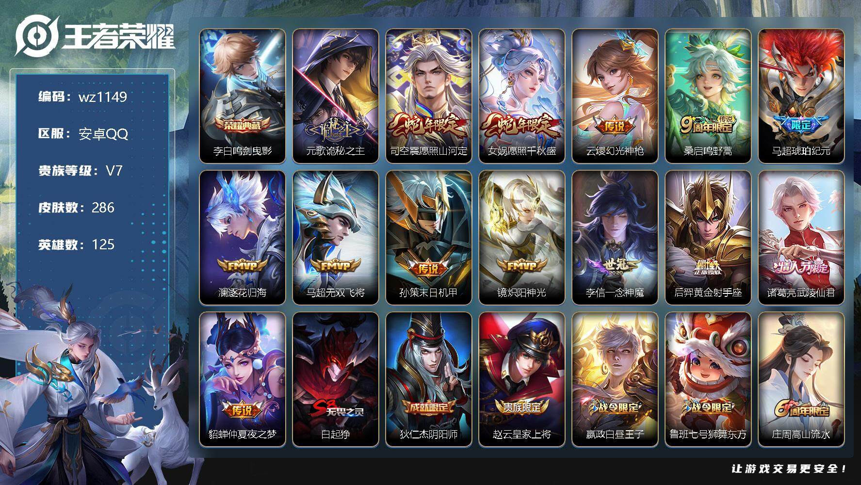 【账号佳】 【可二次实名】【wz1149】【商品标题】:安卓Q-V7-至尊星耀I段位-125英雄-286皮肤-1典藏-0珍品无双-0无双-0珍品传说-14传说-78史诗 【荣耀典藏】:李白鸣剑曳影 【传说皮肤】:元歌诡秘之主,司空震愿照山河定,女娲愿照千秋盛,云缨幻光神枪,桑启鸣野蒿,马超琥珀纪元,澜逐花归海,马超无双飞将,孙策末日机甲,镜炽阳神光,李信一念神魔,后羿黄金射手座,诸葛亮武陵仙君,貂蝉仲夏夜之梦 【限定皮肤】:白起狰,狄仁杰阴阳师,赵云皇家上将,嬴政白昼王子,鲁班七号狮舞东方,庄周高山流水,钟无艳王者之锤,芈月重明,芈月幻夜卜梦,吕布猎兽之王,元歌无心,夏侯惇朔风刀,曹操烛龙,典韦穷奇,典韦蓝屏警告,狄仁杰魔术师,狄仁杰万华元夜,达摩沙漠行僧,项羽海滩派对,老夫子醍醐杖,程咬金演武夺筹,韩信傲雪梅枪,兰陵王金庭之子,牛魔御旌,李元芳云中旅人,虞姬霸王别姬,钟馗神迹守卫,钟馗驱傩正仪,杨玉环遇见飞天,女娲朔望之晖,干将莫邪胡桃夹子,雅典娜黎明之约,太乙真人饕餮,鬼谷子原初探秘者,鬼谷子五谷丰年,诸葛亮武陵仙君,黄忠火炮绅士,苏烈千军破阵,百里玄策原初追逐者,弈星混沌棋,梦奇顽趣,沈梦溪大漠名商,明世隐疑决卦,裴擒虎李小龙,裴擒虎擒涛扼浪,狂铁御狮,米莱狄御霄,云中君纤云弄巧,盾山御銮,上官婉儿梁祝,嫦娥拒霜思,鲁班大师探海日志,镜匿光追影者,桑启海盐诗旅,艾琳流音漫舞,司空震地狱燃心,阿古朵江河有灵,张良古海寻踪,蒙恬荣光圣徽,高渐离燃音魔法,妲己灵卜魔法,鬼谷子天穹祈灯,马超琥珀纪元,姬小满妄想食味,鲁班七号蔬乡物语,李元芳蔬乡物语,刘邦剑破天穹,刘备异域游侠 【赛季限定】:白起狰,芈月重明,夏侯惇朔风刀,曹操烛龙,典韦穷奇,狄仁杰万华元夜,达摩沙漠行僧,老夫子醍醐杖,程咬金演武夺筹,兰陵王金庭之子,张良古海寻踪,牛魔御旌,李元芳云中旅人,钟馗驱傩正仪,雅典娜黎明之约,太乙真人饕餮,鬼谷子原初探秘者,苏烈千军破阵,百里玄策原初追逐者,弈星混沌棋,梦奇顽趣,沈梦溪大漠名商,明世隐疑决卦,裴擒虎擒涛扼浪,狂铁御狮,米莱狄御霄,盾山御銮,鲁班大师探海日志,桑启海盐诗旅,鬼谷子天穹祈灯,蒙恬荣光圣徽,刘邦剑破天穹 【战令限定】:嬴政白昼王子,鲁班七号狮舞东方,芈月幻夜卜梦,吕布猎兽之王,典韦蓝屏警告,艾琳流音漫舞,钟馗神迹守卫,女娲朔望之晖,黄忠火炮绅士,司空震地狱燃心,高渐离燃音魔法,妲己灵卜魔法,鲁班七号蔬乡物语,李元芳蔬乡物语 【史诗皮肤】:鲁班七号电玩小子,露娜紫霞仙子,钟无艳王者之锤,赵云皇家上将,赵云未来纪元,貂蝉圣诞恋歌,甄姬冰雪圆舞曲,狄仁杰魔术师,廉颇地狱岩魂,宫本武藏鬼剑武藏,孙尚香水果甜心,嬴政摇滚巨星,妲己魅力维加斯,妲己女仆咖啡,墨子龙骑士,墨子金属风暴,吕布圣诞狂欢,刘禅绅士熊喵,曹操幽灵船长,李白千年之狐,吕布末日机甲,张飞乱世虎臣,虞姬霸王别姬,花木兰水晶猎龙者,刘邦德古拉伯爵,夏侯惇乘风破浪,小乔缤纷独角兽,兰陵王暗隐猎兽者,诸葛亮黄金分割率,雅典娜冰冠公主,安琪拉心灵骇客,百里守约特工魅影,蔡文姬舞动绿茵,刘禅天才门将,李元芳逐浪之夏,白起星夜王子,阿轲节奏热浪,杨玉环遇见飞天,嬴政白昼王子,大乔猫狗日记,典韦蓝屏警告,伽罗箭羽风息,鲁班七号狮舞东方,狄仁杰鹰眼统帅,上官婉儿梁祝,瑶遇见神鹿,百里玄策原初追逐者,裴擒虎李小龙,云中君纤云弄巧,庄周高山流水,嫦娥拒霜思,镜匿光追影者,黄忠火炮绅士,雅典娜黎明之约,韩信傲雪梅枪,夏洛特永昼,澜赏金猎手,貂蝉唤灵魅影,弈星滕王阁序,鬼谷子五谷丰年,元歌无心,梦奇顽趣,刘禅电玩爆裂旋风,司空震地狱燃心,阿古朵江河有灵,妲己灵卜魔法,高渐离燃音魔法,蒙恬荣光圣徽,姬小满妄想食味,鲁班七号蔬乡物语,姬小满战舞者,弈星炽弈燎原,牛魔星界战将,姬小满飞车小橘子,赵怀真器灵浮梦炉,后羿石田雨龙,黄忠百相守梦,西施织梦人,公孙离涂山容容 【其他皮肤】:项羽海滩派对,韩信教廷特使,韩信街头霸王,露娜哥特玫瑰,阿轲爱心护理,达摩大发明家,赵云忍炎影,芈月红桃皇后,白起白色死神,牛魔西部大镖客,武则天东方不败,扁鹊化身博士,扁鹊救世之瞳,宫本武藏未来纪元,安琪拉玩偶对对碰,孙膑天使之翼,姜子牙时尚教父,妲己少女阿狸,典韦黄金武士,亚瑟死亡骑士,达摩拳王,花木兰兔女郎,张飞五福同心,甄姬花好人间,刘备万事如意,后羿阿尔法小队,狄仁杰阴阳师,刘备纽约教父,刘备汉昭烈帝,关羽龙腾万里,白起狰,钟无艳海滩丽影,太乙真人饕餮,宫本武藏霸王丸,曹操烛龙,王昭君幻想奇妙夜,芈月重明,狂铁命运角斗场,老夫子功夫老勺,孙尚香沉稳之力,典韦穷奇,李白敏锐之力,鬼谷子幻乐之宴,狂铁御狮,安琪拉如懿,苏烈坚韧之力,大乔守护之力,项羽科学大爆炸,米莱狄御霄,吕布猎兽之王,明世隐虹云星官,牛魔御旌,女娲朔望之晖