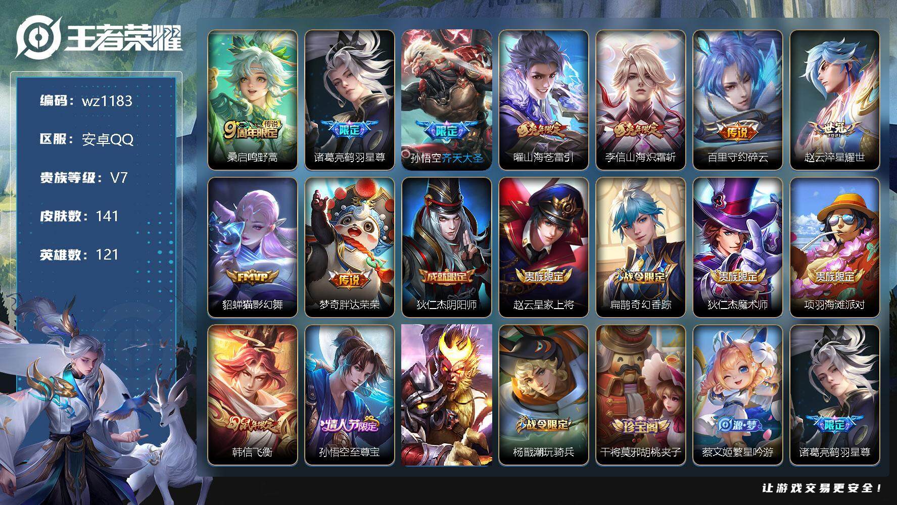 【账号佳】 【可二次实名】【wz1183】【商品标题】:安卓Q-V7-永恒钻石I段位-121英雄-141皮肤-0典藏-0珍品无双-0无双-0珍品传说-9传说-41史诗 【传说皮肤】:桑启鸣野蒿,诸葛亮鹤羽星尊,孙悟空齐天大圣,曜山海苍雷引,李信山海炽霜斩,百里守约碎云,赵云淬星耀世,貂蝉猫影幻舞,梦奇胖达荣荣 【限定皮肤】:狄仁杰阴阳师,赵云皇家上将,扁鹊奇幻香踪,狄仁杰魔术师,项羽海滩派对,韩信飞衡,孙悟空至尊宝,孙悟空齐天大圣,杨戬潮玩骑兵,干将莫邪胡桃夹子,蔡文姬繁星吟游,诸葛亮鹤羽星尊,沈梦溪匿光破解者,裴擒虎擒涛扼浪,云中君纤云弄巧,李信山海炽霜斩,嫦娥拒霜思,嫦娥暖冬兔眠,曜山海苍雷引,西施玲珑珍味,鲁班大师探海日志,桑启海盐诗旅,暃星界游侠,戈娅驭风魔法,艾琳流音漫舞,赵怀真鹤归松栖,司空震地狱燃心,阿古朵江河有灵,张良古海寻踪,蒙犽百解令,高渐离燃音魔法,妲己灵卜魔法,鬼谷子天穹祈灯,沈梦溪龙舞盛年,刘邦剑破天穹 【年限皮肤】:韩信飞衡,李信山海炽霜斩,曜山海苍雷引 【赛季限定】:张良古海寻踪,裴擒虎擒涛扼浪,鲁班大师探海日志,桑启海盐诗旅,鬼谷子天穹祈灯,刘邦剑破天穹 【战令限定】:扁鹊奇幻香踪,艾琳流音漫舞,杨戬潮玩骑兵,嫦娥暖冬兔眠,西施玲珑珍味,司空震地狱燃心,暃星界游侠,戈娅驭风魔法,高渐离燃音魔法,妲己灵卜魔法 【史诗皮肤】:露娜紫霞仙子,赵云皇家上将,貂蝉圣诞恋歌,甄姬冰雪圆舞曲,狄仁杰魔术师,宫本武藏鬼剑武藏,孙尚香水果甜心,妲己魅力维加斯,妲己女仆咖啡,李白千年之狐,吕布末日机甲,孙悟空至尊宝,小乔缤纷独角兽,诸葛亮黄金分割率,百里守约特工魅影,铠曙光守护者,刘禅天才门将,李元芳逐浪之夏,白起星夜王子,狄仁杰鹰眼统帅,蔡文姬繁星吟游,韩信飞衡,橘右京修罗,云中君纤云弄巧,嫦娥拒霜思,暃星界游侠,镜玫瑰异探,扁鹊奇幻香踪,沈梦溪匿光破解者,刘禅电玩爆裂旋风,戈娅驭风魔法,百里守约真我赫兹,赵怀真鹤归松栖,司空震地狱燃心,阿古朵江河有灵,蒙犽百解令,妲己灵卜魔法,高渐离燃音魔法,阿轲化蝶舞,狂铁龙之律动,后羿石田雨龙,公孙离涂山容容 【其他皮肤】:项羽海滩派对,韩信街头霸王,赵云白执事,赵云忍炎影,芈月红桃皇后,白起白色死神,牛魔西部大镖客,扁鹊救世之瞳,姜子牙时尚教父,典韦黄金武士,亚瑟死亡骑士,达摩拳王,花木兰兔女郎,甄姬花好人间,刘备万事如意,狄仁杰阴阳师,钟无艳海滩丽影,孙尚香沉稳之力,诸葛亮掌控之力,苏烈坚韧之力,明世隐虹云星官,庄周奇妙博物学,姜子牙炽热元素使,狂铁特工战影,露娜瓷语鉴心,干将莫邪胡桃夹子,蒙恬蔚蓝守将,刘备潮玩造梦师,桑启海盐诗旅,嫦娥暖冬兔眠,猪八戒潮玩探月行,牛魔牛运亨通,白起乐园追猎者,赵怀真太极少年,裴擒虎擒涛扼浪,杨戬潮玩骑兵,太乙真人劲辣红锅,莱西奥西部游侠,鲁班大师探海日志,西施玲珑珍味,姬小满零食大作战,李元芳妄想特派,艾琳流音漫舞,张良古海寻踪,曹操决胜大满贯,后羿完美运算,程咬金暖冬絮语,鬼谷子天穹祈灯,妲己灵卜魔法,海诺时空谍影,廉颇功夫炙烤,沈梦溪龙舞盛年,刘邦剑破天穹,盘古经纬探寻者,姜子牙星梦巡礼,戈娅玫蓝誓约,刘备浪漫序章,钟馗虚灵犬护,苏烈春野闲踪,甄姬逆浪荇歌,哪吒罗小黑战记,鲁班七号福禄兄弟,鲁班七号木偶奇遇记,钟无艳生化警戒,貂蝉异域舞娘,孙悟空西部大镖客,周瑜海军大将,后羿精灵王,李白范海辛,李元芳特种部队,虞姬加勒比小姐,夏侯惇战争骑士,马可波罗激情绿茵,杨戬埃及法老,黄忠芝加哥教父,干将莫邪第七人偶,铠龙域领主,百里守约绝影神枪,明世隐占星师,公孙离花间舞,米莱狄精准探案法,李信灼热之刃,上官婉儿修竹墨客,马超幸存者,西施归虚梦演,蒙犽归虚梦演,蒙恬秩序猎龙将,澜孤猎,司空震启蛰,云缨赤焰之缨,桑启画中游 【内测皮肤】:狂铁特工战影,干将莫邪胡桃夹子 【营地ID】:1797740639