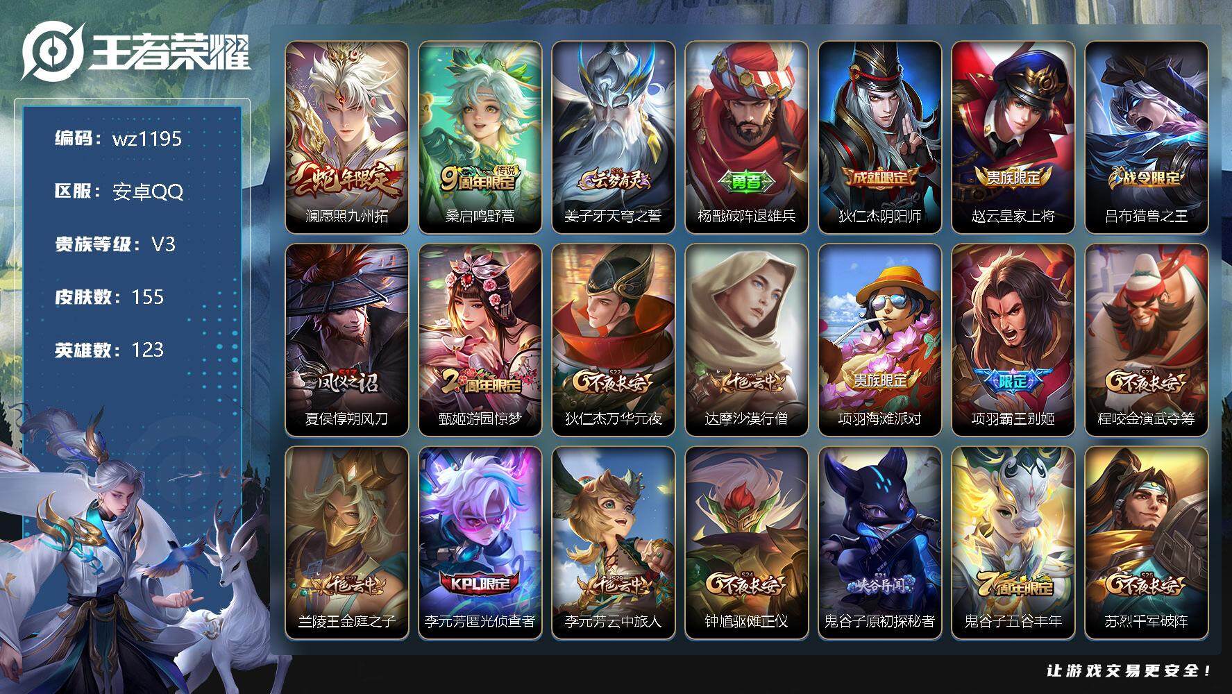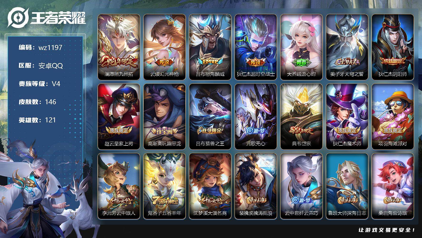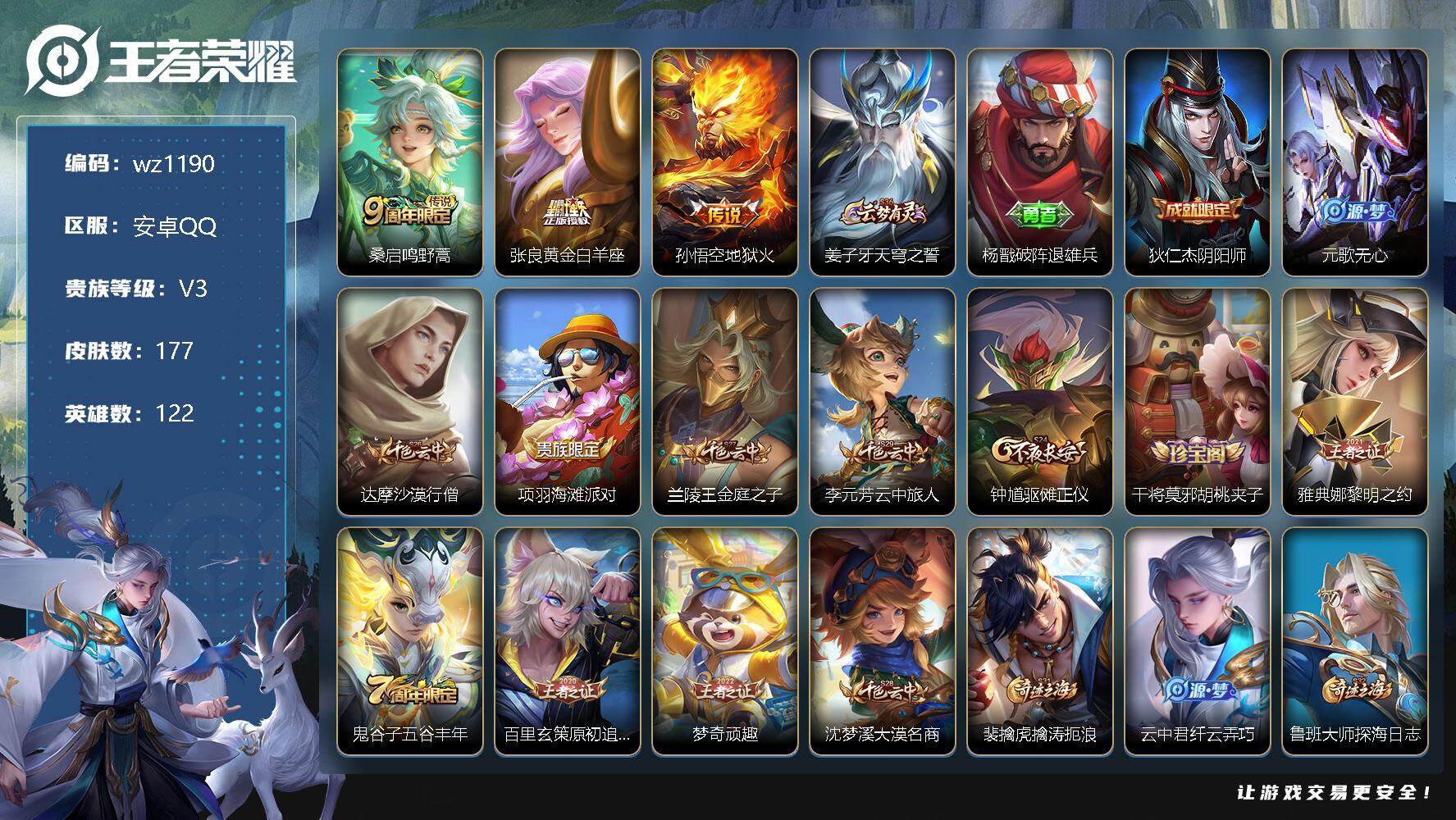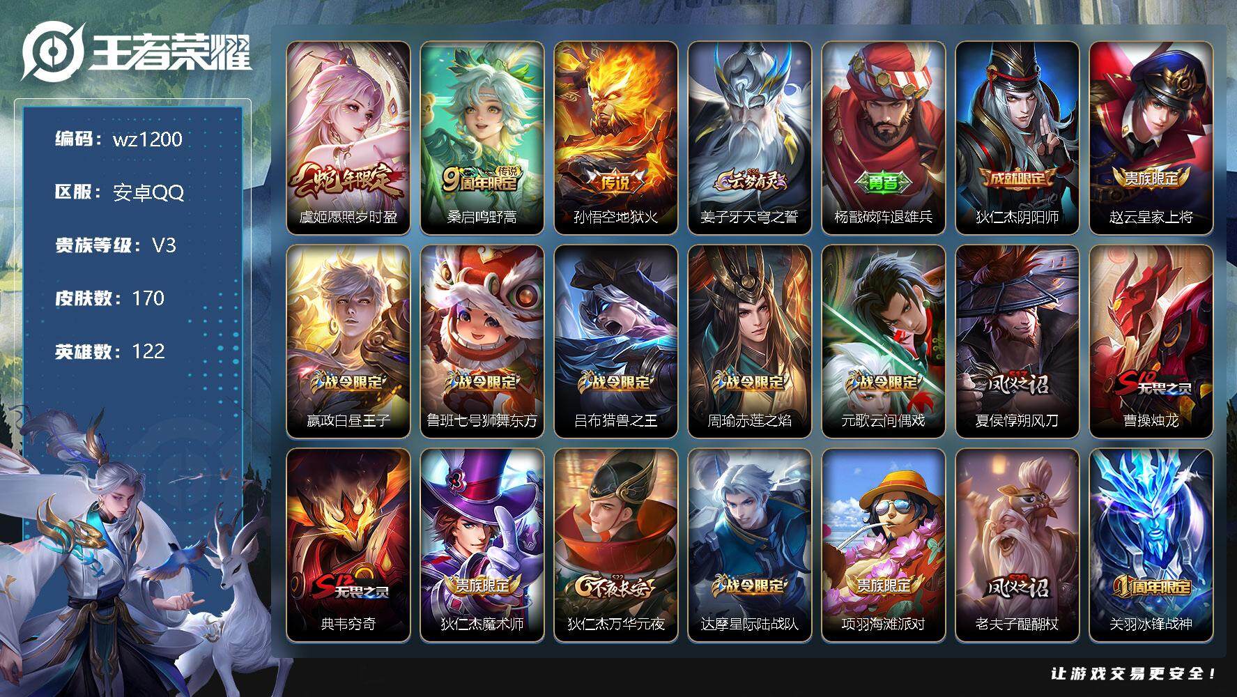 【账号佳】 【可二次实名】【wz1200】【商品标题】:安卓Q-V3-至尊星耀IV段位-122英雄-170皮肤-0典藏-0珍品无双-0无双-0珍品传说-3传说-40史诗 【传说皮肤】:虞姬愿照岁时盈,桑启鸣野蒿,孙悟空地狱火 【限定皮肤】:姜子牙天穹之誓,杨戬破阵退雄兵,狄仁杰阴阳师,赵云皇家上将,嬴政白昼王子,鲁班七号狮舞东方,吕布猎兽之王,周瑜赤莲之焰,元歌云间偶戏,夏侯惇朔风刀,曹操烛龙,典韦穷奇,狄仁杰魔术师,狄仁杰万华元夜,达摩星际陆战队,项羽海滩派对,老夫子醍醐杖,关羽冰锋战神,程咬金演武夺筹,兰陵王驯魔猎人,亚瑟潮玩骑士王,孙悟空大圣娶亲,牛魔御旌,后羿如梦令,李元芳银河之约,钟馗神迹守卫,钟馗驱傩正仪,杨玉环遇见飞天,雅典娜单词大作战,东皇太一逐梦之光,鬼谷子原初探秘者,百里玄策原初追逐者,弈星混沌棋,沈梦溪星空之诺,明世隐疑决卦,裴擒虎李小龙,裴擒虎擒涛扼浪,狂铁御狮,米莱狄御霄,云中君纤云弄巧,盾山御銮,上官婉儿梁祝,蒙犽狂想玩偶喵,鲁班大师探海日志,艾琳女武神,张良古海寻踪,高渐离燃音魔法,妲己灵卜魔法,鬼谷子天穹祈灯,刘邦剑破天穹,程咬金群星魔术团,周瑜熔金海岸 【赛季限定】:夏侯惇朔风刀,曹操烛龙,典韦穷奇,狄仁杰万华元夜,老夫子醍醐杖,程咬金演武夺筹,张良古海寻踪,牛魔御旌,钟馗驱傩正仪,鬼谷子原初探秘者,百里玄策原初追逐者,弈星混沌棋,明世隐疑决卦,裴擒虎擒涛扼浪,狂铁御狮,米莱狄御霄,盾山御銮,鲁班大师探海日志,鬼谷子天穹祈灯,刘邦剑破天穹,姜子牙天穹之誓 【战令限定】:嬴政白昼王子,鲁班七号狮舞东方,吕布猎兽之王,周瑜赤莲之焰,元歌云间偶戏,达摩星际陆战队,兰陵王驯魔猎人,亚瑟潮玩骑士王,李元芳银河之约,钟馗神迹守卫,雅典娜单词大作战,沈梦溪星空之诺,蒙犽狂想玩偶喵,高渐离燃音魔法,妲己灵卜魔法 【史诗皮肤】:鲁班七号电玩小子,阿轲暗夜猫娘,赵云皇家上将,甄姬冰雪圆舞曲,王昭君偶像歌手,狄仁杰魔术师,宫本武藏鬼剑武藏,孙尚香水果甜心,妲己魅力维加斯,吕布圣诞狂欢,李白千年之狐,吕布末日机甲,张飞乱世虎臣,关羽冰锋战神,夏侯惇乘风破浪,兰陵王暗隐猎兽者,诸葛亮黄金分割率,百里守约特工魅影,蔡文姬舞动绿茵,白起星夜王子,阿轲节奏热浪,杨玉环遇见飞天,东皇太一逐梦之光,嬴政白昼王子,孙悟空大圣娶亲,鲁班七号狮舞东方,狄仁杰鹰眼统帅,兰陵王驯魔猎人,上官婉儿梁祝,李元芳银河之约,娜可露露晚萤,后羿如梦令,蒙犽狂想玩偶喵,百里玄策原初追逐者,裴擒虎李小龙,云中君纤云弄巧,元歌云间偶戏,妲己灵卜魔法,高渐离燃音魔法,牛魔星界战将,阿轲化蝶舞 【其他皮肤】:项羽海滩派对,韩信教廷特使,韩信街头霸王,露娜哥特玫瑰,达摩大发明家,赵云忍炎影,艾琳女武神,白起白色死神,牛魔西部大镖客,扁鹊化身博士,扁鹊救世之瞳,宫本武藏未来纪元,安琪拉玩偶对对碰,妲己少女阿狸,典韦黄金武士,亚瑟死亡骑士,达摩拳王,花木兰兔女郎,刘备万事如意,宫本武藏万象初新,后羿阿尔法小队,狄仁杰阴阳师,刘备纽约教父,关羽龙腾万里,钟无艳海滩丽影,宫本武藏霸王丸,曹操烛龙,王昭君幻想奇妙夜,老夫子功夫老勺,孙尚香沉稳之力,典韦穷奇,诸葛亮掌控之力,李白敏锐之力,鬼谷子幻乐之宴,狂铁御狮,安琪拉如懿,苏烈坚韧之力,大乔守护之力,项羽科学大爆炸,米莱狄御霄,吕布猎兽之王,庄周奇妙博物学,牛魔御旌,小乔丁香结,钟馗神迹守卫,盾山御銮,孙膑归虚梦演,沈梦溪鲨炮海盗猫,夏侯惇朔风刀,周瑜赤莲之焰,沈梦溪星空之诺,弈星混沌棋,鲁班七号黑桃队长,明世隐疑决卦,老夫子醍醐杖,鬼谷子原初探秘者,雅典娜单词大作战,狄仁杰万华元夜,亚瑟潮玩骑士王,刘禅秘密基地,露娜瓷语鉴心,达摩星际陆战队,程咬金演武夺筹,张良缤纷绘卷,盘古重装意志,钟馗驱傩正仪,鲁班大师乓乓大师,猪八戒潮玩探月行,裴擒虎擒涛扼浪,鲁班大师探海日志,张良古海寻踪,鬼谷子天穹祈灯,妲己灵卜魔法,钟无艳春野之旅,刘邦剑破天穹,程咬金群星魔术团,杨戬破阵退雄兵,姜子牙天穹之誓,周瑜熔金海岸,东皇太一噬灭天穹,太乙真人谧流熔炉,典韦铁骨偃魂,西施雪境奇遇,姜子牙星梦巡礼,明世隐景韶洛都,戈娅玫蓝誓约,钟馗虚灵犬护,张良灵野札记,阿古朵布丁狗之约,鲁班七号福禄兄弟,鲁班七号木偶奇遇记,钟无艳生化警戒,花木兰剑舞者,老夫子潮流仙人,程咬金华尔街大亨,王昭君精灵公主,狄仁杰锦衣卫,曹操死神来了,曹操超能战警,孙膑未来旅行,孙悟空西部大镖客,兰陵王隐刃,钟馗地府判官,李元芳特种部队,虞姬加勒比小姐,关羽天启骑士,夏侯惇战争骑士,马可波罗激情绿茵,东皇太一东海龙王,干将莫邪第七人偶,铠龙域领主,百里守约绝影神枪,明世隐占星师,公孙离花间舞,裴擒虎街头旋风,元歌午夜歌剧院,孙策海之征途,司马懿魇语军师,嫦娥露花倒影,猪八戒年年有余,云中君荷