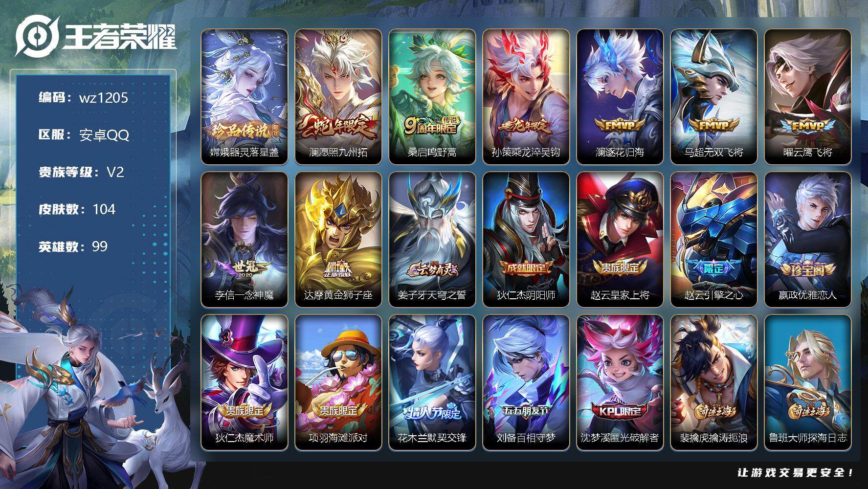 【账号佳】 【可二次实名】【wz1205】【商品标题】:安卓Q-V2-尊贵铂金III段位-99英雄-104皮肤-0典藏-0珍品无双-0无双-1珍品传说-8传说-33史诗 【珍品传说】:嫦娥器灵落星盏 【传说皮肤】:澜愿照九州拓,桑启鸣野蒿,孙策乘龙淬吴钩,澜逐花归海,马超无双飞将,曜云鹰飞将,李信一念神魔,达摩黄金狮子座 【限定皮肤】:姜子牙天穹之誓,狄仁杰阴阳师,赵云皇家上将,赵云引擎之心,嬴政优雅恋人,狄仁杰魔术师,项羽海滩派对,花木兰默契交锋,刘备百相守梦,沈梦溪匿光破解者,裴擒虎擒涛扼浪,鲁班大师探海日志,阿古朵江河有灵,张良古海寻踪,高渐离燃音魔法,妲己灵卜魔法,鬼谷子天穹祈灯,伽罗琥珀纪元,孙策乘龙淬吴钩,刘邦剑破天穹,程咬金群星魔术团,关羽决胜骁骑,镜青焰无极,项羽苍威无极,周瑜熔金海岸 【年限皮肤】:孙策乘龙淬吴钩 【赛季限定】:张良古海寻踪,裴擒虎擒涛扼浪,鲁班大师探海日志,鬼谷子天穹祈灯,刘邦剑破天穹,姜子牙天穹之誓 【战令限定】:高渐离燃音魔法,妲己灵卜魔法,镜青焰无极,项羽苍威无极 【史诗皮肤】:露娜紫霞仙子,赵云皇家上将,貂蝉圣诞恋歌,甄姬冰雪圆舞曲,狄仁杰魔术师,廉颇地狱岩魂,宫本武藏鬼剑武藏,孙尚香水果甜心,嬴政优雅恋人,妲己魅力维加斯,妲己女仆咖啡,墨子金属风暴,曹操幽灵船长,张飞乱世虎臣,赵云引擎之心,刘邦德古拉伯爵,诸葛亮黄金分割率,百里守约特工魅影,李元芳逐浪之夏,白起星夜王子,大乔猫狗日记,狄仁杰鹰眼统帅,小乔青蛇,花木兰默契交锋,沈梦溪月团寄思,刘备百相守梦,沈梦溪匿光破解者,阿古朵江河有灵,妲己灵卜魔法,高渐离燃音魔法,伽罗琥珀纪元,镜青焰无极,关羽决胜骁骑,阿轲化蝶舞 【其他皮肤】:项羽海滩派对,韩信教廷特使,韩信街头霸王,赵云忍炎影,程咬金星际陆战队,牛魔西部大镖客,扁鹊化身博士,妲己少女阿狸,典韦黄金武士,亚瑟死亡骑士,达摩拳王,刘备万事如意,狄仁杰阴阳师,刘备汉昭烈帝,钟无艳海滩丽影,诸葛亮掌控之力,李白敏锐之力,鬼谷子幻乐之宴,沈梦溪鲨炮海盗猫,狂铁特工战影,裴擒虎擒涛扼浪,太乙真人劲辣红锅,莱西奥西部游侠,鲁班大师探海日志,李元芳妄想特派,张良古海寻踪,钟无艳聚星闪耀,亚连破局者,后羿完美运算,鬼谷子天穹祈灯,妲己灵卜魔法,朵莉亚金色潮汐,刘邦剑破天穹,程咬金群星魔术团,项羽苍威无极,姜子牙天穹之誓,周瑜熔金海岸,盘古敬我三分,东皇太一噬灭天穹,苍苍林狼骑,太乙真人谧流熔炉,典韦铁骨偃魂,西施雪境奇遇,戈娅玫蓝誓约,张良灵野札记,露娜绯红之刃,小乔万圣前夜,孙悟空西部大镖客,后羿精灵王,雅典娜战争女神,苍维京掠夺者,黄忠芝加哥教父,铠龙域领主,公孙离花间舞,元歌午夜歌剧院,司马懿魇语军师,瑶森,马超幸存者,蒙恬秩序猎龙将,澜孤猎,司空震启蛰,暃碧珀绯影 【内测皮肤】:嬴政优雅恋人,狂铁特工战影 【营地ID】:1794706870