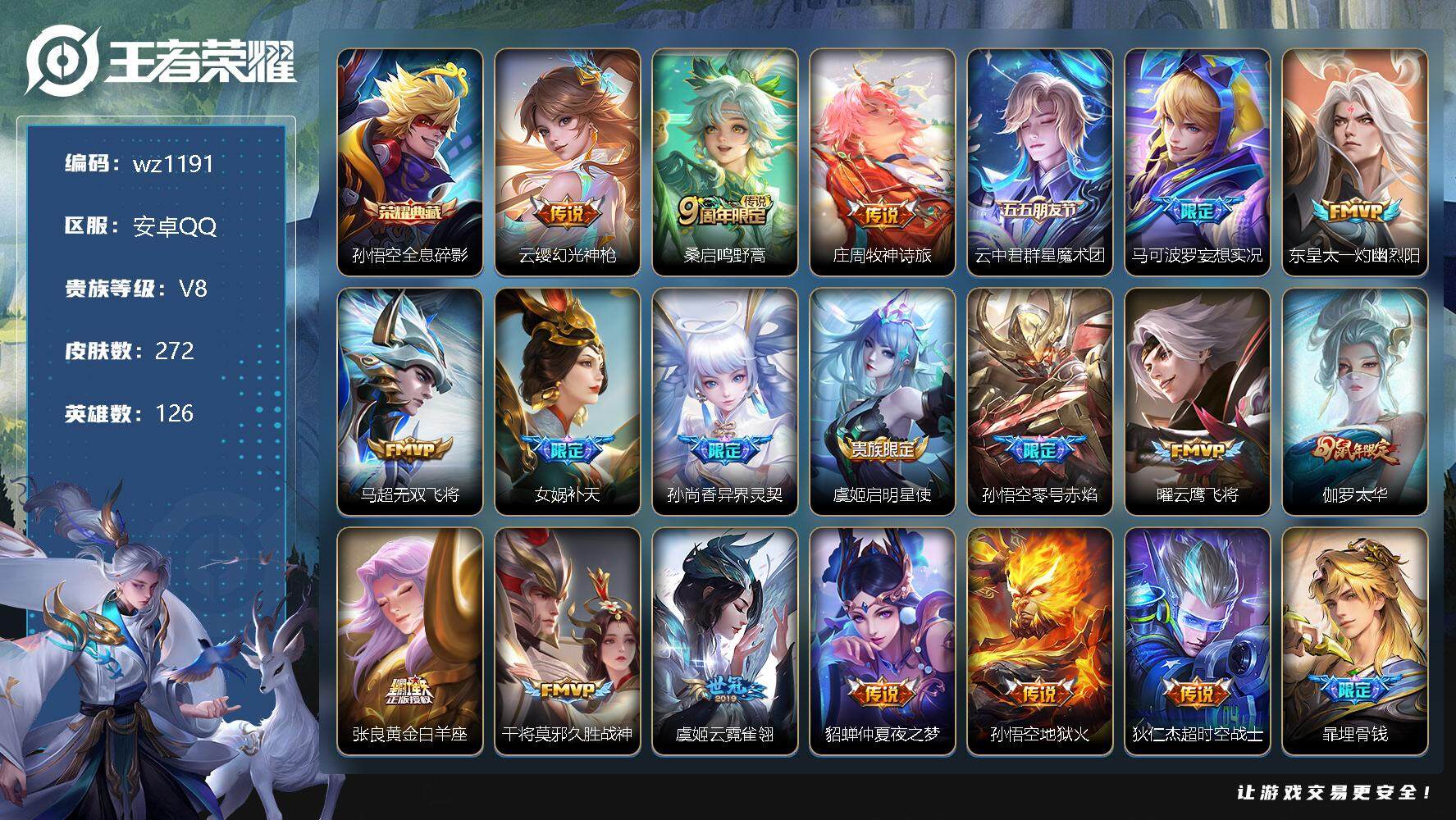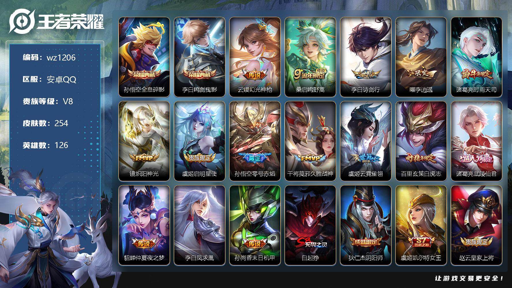 【账号佳】 【可二次实名】【wz1206】【商品标题】:安卓Q-V8-至尊星耀III段位-126英雄-254皮肤-2典藏-0珍品无双-0无双-0珍品传说-15传说-71史诗 【荣耀典藏】:孙悟空全息碎影,李白鸣剑曳影 【传说皮肤】:云缨幻光神枪,桑启鸣野蒿,李白诗剑行,曜李逍遥 ,诸葛亮时雨天司,镜炽阳神光,虞姬启明星使,孙悟空零号赤焰,干将莫邪久胜战神,虞姬云霓雀翎,百里玄策白虎志,诸葛亮武陵仙君,貂蝉仲夏夜之梦,李白凤求凰,孙尚香末日机甲 【限定皮肤】:白起狰,狄仁杰阴阳师,虞姬凯尔特女王,赵云皇家上将,嬴政优雅恋人,嬴政白昼王子,孙尚香蔷薇恋人,鲁班七号狮舞东方,庄周蜃楼王,高渐离死亡摇滚,阿轲迷踪丽影,孙膑妖精王,扁鹊炼金王,芈月重明,芈月白晶晶,吕布猎兽之王,周瑜赤莲之焰,夏侯惇朔风刀,曹操烛龙,典韦穷奇,典韦蓝屏警告,狄仁杰魔术师,狄仁杰万华元夜,达摩沙漠行僧,项羽海滩派对,老夫子醍醐杖,安琪拉魔法小厨娘,程咬金演武夺筹,露娜一生所爱,刘邦夺宝奇兵,韩信傲雪梅枪,兰陵王驯魔猎人,兰陵王金庭之子,花木兰青春决赛季,花木兰默契交锋,孙悟空至尊宝,孙悟空大圣娶亲,孙悟空零号赤焰,牛魔御旌,李元芳云中旅人,虞姬启明星使,钟馗神迹守卫,钟馗驱傩正仪,杨玉环遇见飞天,女娲朔望之晖,干将莫邪冰霜恋舞曲,雅典娜黎明之约,蔡文姬繁星吟游,太乙真人饕餮,太乙真人华丽摇滚,鬼谷子原初探秘者,鬼谷子五谷丰年,诸葛亮武陵仙君,诸葛亮时雨天司,铠青龙志,苏烈千军破阵,百里玄策白虎志,百里玄策原初追逐者,百里守约朱雀志,弈星混沌棋,梦奇顽趣,公孙离玉兔公主,沈梦溪大漠名商,明世隐疑决卦,裴擒虎天狼狩猎者,裴擒虎李小龙,裴擒虎擒涛扼浪,狂铁御狮,米莱狄御霄,云中君纤云弄巧,盾山御銮,上官婉儿梁祝,曜李逍遥 ,鲁班大师探海日志,桑启海盐诗旅,阿古朵江河有灵,张良古海寻踪,蒙恬荣光圣徽,鬼谷子天穹祈灯,刘邦剑破天穹 【年限皮肤】:百里玄策白虎志,百里守约朱雀志,铠青龙志,李白凤求凰,诸葛亮时雨天司 【赛季限定】:庄周蜃楼王,孙膑妖精王,扁鹊炼金王,白起狰,芈月重明,夏侯惇朔风刀,曹操烛龙,典韦穷奇,狄仁杰万华元夜,达摩沙漠行僧,老夫子醍醐杖,程咬金演武夺筹,兰陵王金庭之子,张良古海寻踪,牛魔御旌,李元芳云中旅人,虞姬凯尔特女王,钟馗驱傩正仪,雅典娜黎明之约,太乙真人饕餮,鬼谷子原初探秘者,苏烈千军破阵,百里玄策原初追逐者,弈星混沌棋,梦奇顽趣,沈梦溪大漠名商,明世隐疑决卦,裴擒虎擒涛扼浪,狂铁御狮,米莱狄御霄,盾山御銮,鲁班大师探海日志,桑启海盐诗旅,鬼谷子天穹祈灯,蒙恬荣光圣徽,刘邦剑破天穹 【战令限定】:嬴政白昼王子,鲁班七号狮舞东方,阿轲迷踪丽影,吕布猎兽之王,周瑜赤莲之焰,典韦蓝屏警告,刘邦夺宝奇兵,兰陵王驯魔猎人,钟馗神迹守卫,女娲朔望之晖 【史诗皮肤】:鲁班七号电玩小子,露娜紫霞仙子,赵云皇家上将,貂蝉圣诞恋歌,甄姬冰雪圆舞曲,王昭君偶像歌手,狄仁杰魔术师,宫本武藏鬼剑武藏,孙尚香蔷薇恋人,孙尚香水果甜心,嬴政优雅恋人,嬴政暗夜贵公子,嬴政摇滚巨星,妲己魅力维加斯,妲己女仆咖啡,墨子龙骑士,吕布圣诞狂欢,曹操幽灵船长,李白千年之狐,安琪拉魔法小厨娘,张飞乱世虎臣,孙悟空至尊宝,花木兰水晶猎龙者,刘邦德古拉伯爵,小乔缤纷独角兽,兰陵王暗隐猎兽者,诸葛亮黄金分割率,亚瑟心灵战警,安琪拉心灵骇客,花木兰青春决赛季,铠曙光守护者,蔡文姬舞动绿茵,李元芳逐浪之夏,程咬金功夫厨神,白起星夜王子,阿轲节奏热浪,杨玉环遇见飞天,嬴政白昼王子,孙策猫狗日记,铠青龙志,百里守约朱雀志,干将莫邪冰霜恋舞曲,露娜一生所爱,孙悟空大圣娶亲,典韦蓝屏警告,裴擒虎天狼狩猎者,鲁班七号狮舞东方,狄仁杰鹰眼统帅,兰陵王驯魔猎人,上官婉儿梁祝,蔡文姬繁星吟游,娜可露露晚萤,不知火舞魅语,阿轲迷踪丽影,百里玄策原初追逐者,裴擒虎李小龙,云中君纤云弄巧,芈月白晶晶,花木兰默契交锋,雅典娜黎明之约,韩信傲雪梅枪,公孙离玉兔公主,貂蝉唤灵魅影,鬼谷子五谷丰年,梦奇顽趣,阿古朵江河有灵,周瑜雪夜绮愿,蒙恬荣光圣徽,后羿石田雨龙,黄忠百相守梦,公孙离涂山容容 【其他皮肤】:项羽海滩派对,韩信教廷特使,韩信街头霸王,露娜哥特玫瑰,阿轲致命风华,阿轲爱心护理,达摩大发明家,赵云白执事,芈月红桃皇后,程咬金星际陆战队,扁鹊化身博士,扁鹊救世之瞳,孙膑天使之翼,妲己少女阿狸,亚瑟死亡骑士,达摩拳王,花木兰兔女郎,张飞五福同心,甄姬花好人间,宫本武藏万象初新,狄仁杰阴阳师,庄周蜃楼王,刘备纽约教父,高渐离死亡摇滚,孙膑妖精王,扁鹊炼金王,关羽龙腾万里,虞姬凯尔特女王,白起狰,钟无艳海滩丽影,太乙真人饕餮,宫本武藏霸王丸,曹操烛龙,王昭君幻想奇妙夜,芈月重明,老夫子功夫老勺,典韦穷奇,诸葛亮掌控之力,李白敏锐之力,鬼谷