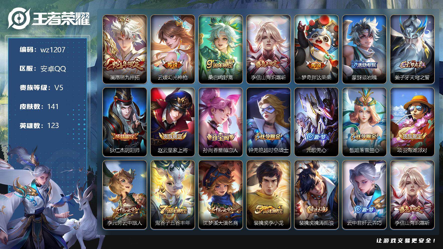 【账号佳】 【可二次实名】【wz1207】【商品标题】:安卓Q-V5-至尊星耀IV段位-123英雄-141皮肤-0典藏-0珍品无双-0无双-0珍品传说-5传说-42史诗 【传说皮肤】:澜愿照九州拓,云缨幻光神枪,桑启鸣野蒿,李信山海炽霜斩,梦奇胖达荣荣 【限定皮肤】:蒙犽顽岩魄,姜子牙天穹之誓,狄仁杰阴阳师,赵云皇家上将,孙尚香蔷薇恋人,钟无艳超时空战士,元歌无心,甄姬落雪兰心,项羽海滩派对,李元芳云中旅人,鬼谷子五谷丰年,沈梦溪大漠名商,裴擒虎李小龙,裴擒虎擒涛扼浪,云中君纤云弄巧,李信山海炽霜斩,嫦娥拒霜思,鲁班大师探海日志,桑启海盐诗旅,阿古朵江河有灵,张良古海寻踪,蒙犽百解令,鬼谷子天穹祈灯,沈梦溪龙舞盛年,刘邦剑破天穹,程咬金群星魔术团,周瑜熔金海岸 【年限皮肤】:李信山海炽霜斩 【赛季限定】:张良古海寻踪,李元芳云中旅人,沈梦溪大漠名商,裴擒虎擒涛扼浪,鲁班大师探海日志,桑启海盐诗旅,鬼谷子天穹祈灯,刘邦剑破天穹,姜子牙天穹之誓 【战令限定】:钟无艳超时空战士,甄姬落雪兰心 【史诗皮肤】:露娜紫霞仙子,赵云皇家上将,貂蝉圣诞恋歌,甄姬冰雪圆舞曲,王昭君偶像歌手,宫本武藏鬼剑武藏,孙尚香蔷薇恋人,孙尚香水果甜心,嬴政暗夜贵公子,嬴政摇滚巨星,妲己女仆咖啡,墨子龙骑士,墨子金属风暴,吕布圣诞狂欢,刘禅绅士熊喵,花木兰水晶猎龙者,夏侯惇乘风破浪,小乔缤纷独角兽,兰陵王暗隐猎兽者,诸葛亮黄金分割率,亚瑟心灵战警,百里守约特工魅影,刘禅天才门将,李元芳逐浪之夏,白起星夜王子,阿轲节奏热浪,孙策猫狗日记,伽罗箭羽风息,狄仁杰鹰眼统帅,裴擒虎李小龙,云中君纤云弄巧,嫦娥拒霜思,钟无艳超时空战士,鬼谷子五谷丰年,元歌无心,阿古朵江河有灵,蒙犽百解令,蒙犽顽岩魄,赵怀真器灵浮梦炉,阿轲化蝶舞,刘禅鸭鸭历险记,狂铁龙之律动 【其他皮肤】:项羽海滩派对,韩信教廷特使,韩信街头霸王,露娜哥特玫瑰,达摩大发明家,赵云忍炎影,程咬金星际陆战队,白起白色死神,牛魔西部大镖客,武则天东方不败,扁鹊救世之瞳,宫本武藏未来纪元,安琪拉玩偶对对碰,孙膑天使之翼,姜子牙时尚教父,妲己少女阿狸,典韦黄金武士,达摩拳王,花木兰兔女郎,甄姬花好人间,后羿阿尔法小队,狄仁杰阴阳师,刘备纽约教父,关羽龙腾万里,钟无艳海滩丽影,王昭君幻想奇妙夜,老夫子功夫老勺,李白敏锐之力,小乔丁香结,姜子牙炽热元素使,盾山圆桌骑士,狂铁特工战影,刘禅秘密基地,张良缤纷绘卷,鲁班大师乓乓大师,马可波罗潮玩牛仔,刘邦虎啸剑宗,沈梦溪大漠名商,蒙恬蔚蓝守将,甄姬落雪兰心,李元芳云中旅人,戈娅危途狂花,刘备潮玩造梦师,桑启海盐诗旅,猪八戒潮玩探月行,裴擒虎擒涛扼浪,太乙真人劲辣红锅,鲁班大师探海日志,李元芳妄想特派,哪吒热血海滩,张良古海寻踪,钟无艳聚星闪耀,亚连破局者,后羿完美运算,鬼谷子天穹祈灯,嫦娥漠中幻影,沈梦溪龙舞盛年,钟无艳春野之旅,刘邦剑破天穹,程咬金群星魔术团,大司命暗都幽影,姜子牙天穹之誓,周瑜熔金海岸,盘古敬我三分,东皇太一噬灭天穹,干将莫邪雾都夜雨,吕布逐霄战戟,苍苍林狼骑,太乙真人谧流熔炉,典韦铁骨偃魂,西施雪境奇遇,姜子牙星梦巡礼,少司缘灵卦秘语,明世隐景韶洛都,戈娅玫蓝誓约,刘备浪漫序章,钟馗虚灵犬护,沈梦溪鸭鸭历险记,阿古朵布丁狗之约,露娜命运加冕,露娜绯红之刃,貂蝉异域舞娘,小乔万圣前夜,刘禅英喵野望,李元芳特种部队,马可波罗激情绿茵,苍维京掠夺者,东皇太一东海龙王,百里守约绝影神枪,李信灼热之刃,马超幸存者,澜孤猎,云缨赤焰之缨,暃碧珀绯影 【内测皮肤】:孙尚香蔷薇恋人,狂铁特工战影 【营地ID】:1805825229