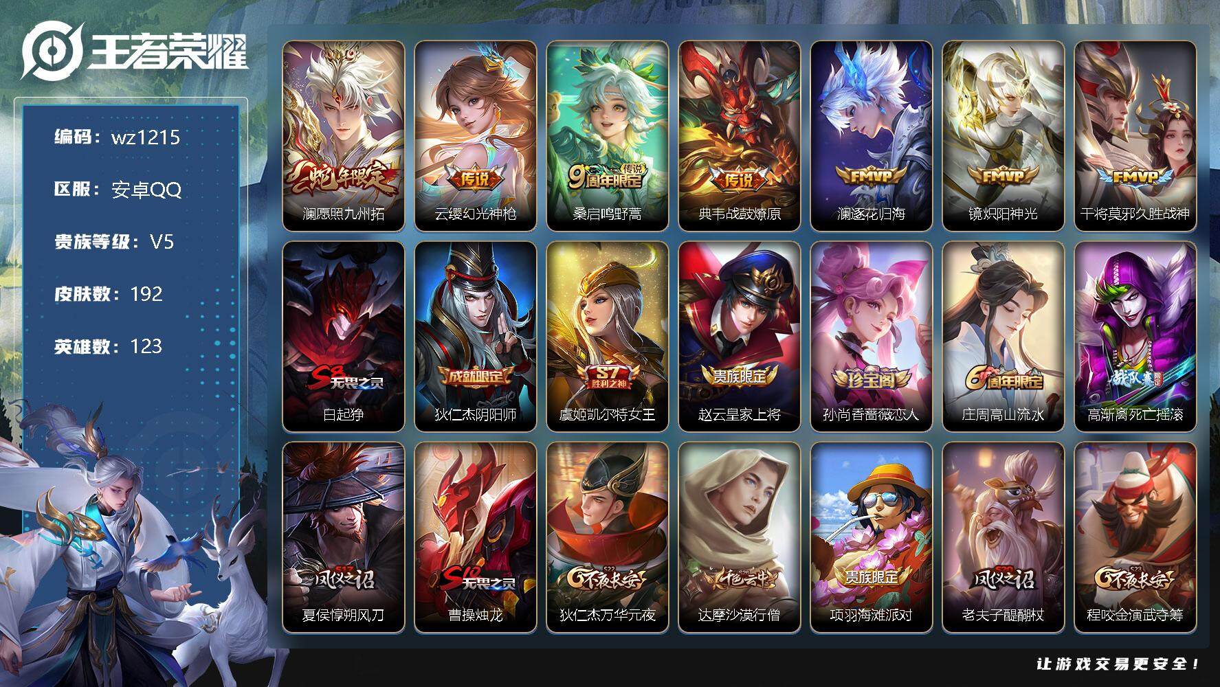 【账号佳】 【可二次实名】【wz1215】【商品标题】:安卓Q-V5-最强王者段位-123英雄-192皮肤-0典藏-0珍品无双-0无双-0珍品传说-7传说-38史诗 【传说皮肤】:澜愿照九州拓,云缨幻光神枪,桑启鸣野蒿,典韦战鼓燎原,澜逐花归海,镜炽阳神光,干将莫邪久胜战神 【限定皮肤】:白起狰,狄仁杰阴阳师,虞姬凯尔特女王,赵云皇家上将,孙尚香蔷薇恋人,庄周高山流水,高渐离死亡摇滚,夏侯惇朔风刀,曹操烛龙,狄仁杰万华元夜,达摩沙漠行僧,项羽海滩派对,老夫子醍醐杖,程咬金演武夺筹,韩信傲雪梅枪,兰陵王金庭之子,牛魔御旌,李元芳云中旅人,钟馗驱傩正仪,杨玉环遇见飞天,雅典娜黎明之约,太乙真人饕餮,太乙真人华丽摇滚,鬼谷子原初探秘者,鬼谷子五谷丰年,苏烈千军破阵,百里玄策原初追逐者,弈星混沌棋,梦奇顽趣,沈梦溪大漠名商,明世隐疑决卦,裴擒虎李小龙,裴擒虎擒涛扼浪,狂铁御狮,米莱狄御霄,盾山御銮,上官婉儿梁祝,鲁班大师探海日志,桑启海盐诗旅,张良古海寻踪,蒙恬荣光圣徽,鬼谷子天穹祈灯,姬小满妄想食味,刘邦剑破天穹 【赛季限定】:白起狰,夏侯惇朔风刀,曹操烛龙,狄仁杰万华元夜,达摩沙漠行僧,老夫子醍醐杖,程咬金演武夺筹,兰陵王金庭之子,张良古海寻踪,牛魔御旌,李元芳云中旅人,虞姬凯尔特女王,钟馗驱傩正仪,雅典娜黎明之约,太乙真人饕餮,鬼谷子原初探秘者,苏烈千军破阵,百里玄策原初追逐者,弈星混沌棋,梦奇顽趣,沈梦溪大漠名商,明世隐疑决卦,裴擒虎擒涛扼浪,狂铁御狮,米莱狄御霄,盾山御銮,鲁班大师探海日志,桑启海盐诗旅,鬼谷子天穹祈灯,蒙恬荣光圣徽,刘邦剑破天穹 【史诗皮肤】:露娜紫霞仙子,赵云皇家上将,甄姬冰雪圆舞曲,廉颇地狱岩魂,宫本武藏鬼剑武藏,孙尚香蔷薇恋人,孙尚香水果甜心,嬴政摇滚巨星,墨子金属风暴,吕布圣诞狂欢,曹操幽灵船长,张飞乱世虎臣,花木兰水晶猎龙者,兰陵王暗隐猎兽者,亚瑟心灵战警,白起星夜王子,阿轲节奏热浪,杨玉环遇见飞天,孙策猫狗日记,狄仁杰鹰眼统帅,上官婉儿梁祝,橘右京修罗,百里玄策原初追逐者,裴擒虎李小龙,钟馗乐园奇幻夜,庄周高山流水,雅典娜黎明之约,韩信傲雪梅枪,鬼谷子五谷丰年,梦奇顽趣,蒙恬荣光圣徽,姬小满妄想食味,百里守约百相守梦,牛魔星界战将,孙膑茶境仙,狂铁龙之律动,黄忠百相守梦,公孙离涂山容容 【其他皮肤】:项羽海滩派对,韩信教廷特使,韩信街头霸王,露娜哥特玫瑰,阿轲爱心护理,达摩大发明家,赵云白执事,赵云忍炎影,程咬金星际陆战队,白起白色死神,安琪拉玩偶对对碰,孙膑天使之翼,妲己少女阿狸,典韦黄金武士,亚瑟死亡骑士,花木兰兔女郎,张飞五福同心,甄姬花好人间,宫本武藏万象初新,后羿阿尔法小队,狄仁杰阴阳师,刘备纽约教父,高渐离死亡摇滚,刘备汉昭烈帝,关羽龙腾万里,虞姬凯尔特女王,白起狰,钟无艳海滩丽影,太乙真人饕餮,宫本武藏霸王丸,曹操烛龙,王昭君幻想奇妙夜,老夫子功夫老勺,鬼谷子幻乐之宴,狂铁御狮,太乙真人华丽摇滚,苏烈坚韧之力,米莱狄御霄,明世隐虹云星官,牛魔御旌,小乔丁香结,吕布野性能量,盾山御銮,孙膑归虚梦演,沈梦溪鲨炮海盗猫,夏侯惇朔风刀,弈星混沌棋,哪吒次元突破,明世隐疑决卦,盾山圆桌骑士,老夫子醍醐杖,鬼谷子原初探秘者,狄仁杰万华元夜,刘禅秘密基地,杨戬次元傲视,程咬金演武夺筹,张良缤纷绘卷,钟馗驱傩正仪,鲁班大师乓乓大师,苏烈千军破阵,达摩沙漠行僧,程咬金无双福将,兰陵王金庭之子,沈梦溪大漠名商,蒙恬蔚蓝守将,李元芳云中旅人,桑启海盐诗旅,猪八戒潮玩探月行,赵怀真太极少年,裴擒虎擒涛扼浪,鲁班大师探海日志,姬小满零食大作战,李元芳妄想特派,张良古海寻踪,后羿完美运算,鬼谷子天穹祈灯,嫦娥漠中幻影,廉颇功夫炙烤,刘邦剑破天穹,东皇太一噬灭天穹,老夫子百相守梦,干将莫邪雾都夜雨,吕布逐霄战戟,苍苍林狼骑,太乙真人谧流熔炉,典韦铁骨偃魂,马超访茗客,西施雪境奇遇,姜子牙星梦巡礼,少司缘灵卦秘语,明世隐景韶洛都,戈娅玫蓝誓约,刘备浪漫序章,钟馗虚灵犬护,苏烈春野闲踪,张良灵野札记,露娜命运加冕,甄姬逆浪荇歌,莱西奥踏浪烽翎,鲁班七号福禄兄弟,鲁班七号木偶奇遇记,高渐离金属狂潮,钟无艳生化警戒,貂蝉异域舞娘,花木兰剑舞者,王昭君精灵公主,曹操超能战警,张良一千零一夜,孙悟空西部大镖客,周瑜海军大将,后羿精灵王,李白范海辛,李元芳特种部队,虞姬加勒比小姐,关羽天启骑士,马可波罗激情绿茵,苍维京掠夺者,杨戬埃及法老,哪吒三太子,黄忠芝加哥教父,东皇太一东海龙王,干将莫邪第七人偶,鬼谷子阿摩司公爵,百里守约绝影神枪,梦奇美梦成真,公孙离花间舞,杨玉环霓裳曲,裴擒虎街头旋风,弈星踏雪寻梅,元歌午夜歌剧院,孙策海之征途,伽罗花见巫女,沈梦溪棒球奇才,李信灼热之刃,猪八戒年年有余,盘古创世神祝,云中君荷鲁斯之眼,曜归虚梦演,西施归