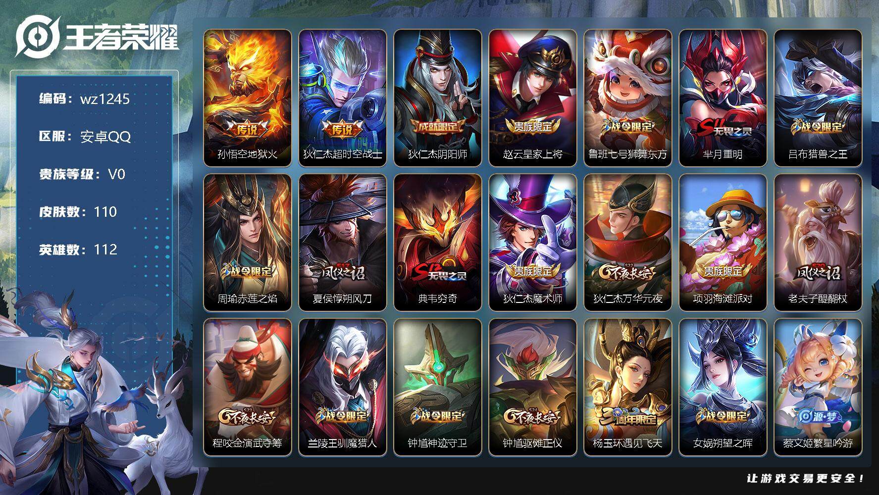 【账号佳】 【可二次实名】【wz1245】【商品标题】:安卓Q-V0-永恒钻石III段位-112英雄-110皮肤-0典藏-0珍品无双-0无双-0珍品传说-2传说-20史诗 【传说皮肤】:孙悟空地狱火,狄仁杰超时空战士 【限定皮肤】:狄仁杰阴阳师,赵云皇家上将,鲁班七号狮舞东方,芈月重明,吕布猎兽之王,周瑜赤莲之焰,夏侯惇朔风刀,典韦穷奇,狄仁杰魔术师,狄仁杰万华元夜,项羽海滩派对,老夫子醍醐杖,程咬金演武夺筹,兰陵王驯魔猎人,钟馗神迹守卫,钟馗驱傩正仪,杨玉环遇见飞天,女娲朔望之晖,蔡文姬繁星吟游,鬼谷子原初探秘者,弈星混沌棋,明世隐疑决卦,裴擒虎李小龙,狂铁御狮,米莱狄御霄,云中君纤云弄巧,盾山御銮,上官婉儿梁祝,鬼谷子天穹祈灯 【赛季限定】:芈月重明,夏侯惇朔风刀,典韦穷奇,狄仁杰万华元夜,老夫子醍醐杖,程咬金演武夺筹,钟馗驱傩正仪,鬼谷子原初探秘者,弈星混沌棋,明世隐疑决卦,狂铁御狮,米莱狄御霄,盾山御銮,鬼谷子天穹祈灯 【战令限定】:鲁班七号狮舞东方,吕布猎兽之王,周瑜赤莲之焰,兰陵王驯魔猎人,钟馗神迹守卫,女娲朔望之晖 【史诗皮肤】:项羽苍穹之光,阿轲暗夜猫娘,赵云皇家上将,貂蝉圣诞恋歌,王昭君偶像歌手,狄仁杰魔术师,孙尚香水果甜心,墨子龙骑士,刘邦德古拉伯爵,兰陵王暗隐猎兽者,百里守约特工魅影,李元芳逐浪之夏,杨玉环遇见飞天,鲁班七号狮舞东方,狄仁杰鹰眼统帅,兰陵王驯魔猎人,上官婉儿梁祝,蔡文姬繁星吟游,裴擒虎李小龙,云中君纤云弄巧 【其他皮肤】:项羽海滩派对,韩信教廷特使,露娜哥特玫瑰,阿轲爱心护理,赵云忍炎影,芈月红桃皇后,程咬金星际陆战队,扁鹊化身博士,姜子牙时尚教父,妲己少女阿狸,典韦黄金武士,亚瑟死亡骑士,达摩拳王,花木兰兔女郎,刘备万事如意,宫本武藏万象初新,狄仁杰阴阳师,刘备汉昭烈帝,关羽龙腾万里,钟无艳海滩丽影,宫本武藏霸王丸,芈月重明,孙尚香沉稳之力,典韦穷奇,诸葛亮掌控之力,鬼谷子幻乐之宴,狂铁御狮,米莱狄御霄,吕布猎兽之王,明世隐虹云星官,张良幽兰居士,女娲朔望之晖,吕布野性能量,钟馗神迹守卫,盾山御銮,孙膑归虚梦演,姜子牙炽热元素使,夏侯惇朔风刀,周瑜赤莲之焰,弈星混沌棋,哪吒次元突破,明世隐疑决卦,盾山圆桌骑士,老夫子醍醐杖,鬼谷子原初探秘者,狄仁杰万华元夜,杨戬次元傲视,程咬金演武夺筹,张良缤纷绘卷,钟馗驱傩正仪,鲁班大师乓乓大师,莱西奥西部游侠,鬼谷子天穹祈灯,露娜命运加冕,白起死霸装,鲁班七号福禄兄弟,高渐离金属狂潮,曹操死神来了,孙悟空西部大镖客,后羿精灵王,刘禅英喵野望,钟馗地府判官,虞姬加勒比小姐,蔡文姬蔷薇王座,雅典娜战争女神,马可波罗激情绿茵,苍维京掠夺者,杨戬埃及法老,哪吒三太子,诸葛亮星航指挥官,大乔伊势巫女,铠龙域领主,百里守约绝影神枪,百里玄策威尼斯狂欢,公孙离花间舞,裴擒虎街头旋风,孙策海之征途,司马懿魇语军师,伽罗花见巫女,沈梦溪棒球奇才,李信灼热之刃,嫦娥露花倒影,盘古创世神祝,瑶森,云中君荷鲁斯之眼,蒙犽归虚梦演,镜冰刃幻境,澜孤猎 【营地ID】:2142761530