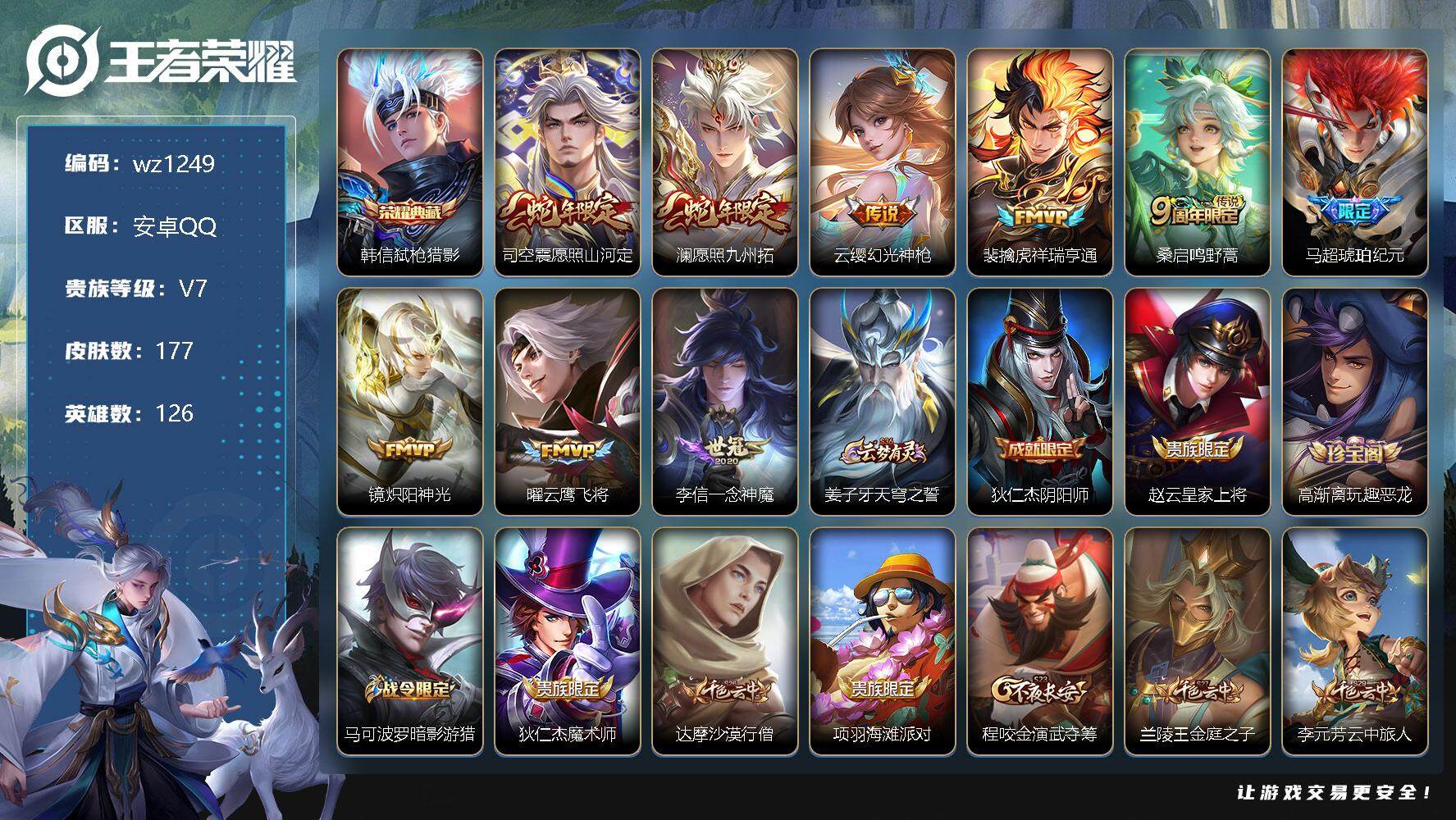 【账号佳】 【可二次实名】【wz1249】【商品标题】:安卓Q-V7-至尊星耀III段位-126英雄-177皮肤-1典藏-0珍品无双-0无双-0珍品传说-9传说-43史诗 【荣耀典藏】:韩信弑枪猎影 【传说皮肤】:司空震愿照山河定,澜愿照九州拓,云缨幻光神枪,裴擒虎祥瑞亨通,桑启鸣野蒿,马超琥珀纪元,镜炽阳神光,曜云鹰飞将,李信一念神魔 【限定皮肤】:姜子牙天穹之誓,狄仁杰阴阳师,赵云皇家上将,高渐离玩趣恶龙,马可波罗暗影游猎,狄仁杰魔术师,达摩沙漠行僧,项羽海滩派对,程咬金演武夺筹,兰陵王金庭之子,李元芳云中旅人,钟馗驱傩正仪,苏烈千军破阵,沈梦溪大漠名商,裴擒虎李小龙,裴擒虎擒涛扼浪,鲁班大师探海日志,艾琳流音漫舞,司空震地狱燃心,阿古朵江河有灵,张良古海寻踪,蒙恬荣光圣徽,鬼谷子天穹祈灯,马超琥珀纪元,沈梦溪龙舞盛年,鲁班七号蔬乡物语,李元芳蔬乡物语,刘邦剑破天穹,程咬金群星魔术团,镜青焰无极,项羽苍威无极,周瑜熔金海岸 【赛季限定】:达摩沙漠行僧,程咬金演武夺筹,兰陵王金庭之子,张良古海寻踪,李元芳云中旅人,钟馗驱傩正仪,苏烈千军破阵,沈梦溪大漠名商,裴擒虎擒涛扼浪,鲁班大师探海日志,鬼谷子天穹祈灯,蒙恬荣光圣徽,刘邦剑破天穹,姜子牙天穹之誓 【战令限定】:马可波罗暗影游猎,艾琳流音漫舞,司空震地狱燃心,鲁班七号蔬乡物语,李元芳蔬乡物语,镜青焰无极,项羽苍威无极 【史诗皮肤】:露娜紫霞仙子,赵云皇家上将,貂蝉圣诞恋歌,甄姬冰雪圆舞曲,王昭君偶像歌手,狄仁杰魔术师,宫本武藏鬼剑武藏,孙尚香水果甜心,嬴政摇滚巨星,妲己魅力维加斯,墨子金属风暴,吕布圣诞狂欢,刘禅绅士熊喵,曹操幽灵船长,吕布末日机甲,花木兰水晶猎龙者,刘邦德古拉伯爵,夏侯惇乘风破浪,诸葛亮黄金分割率,雅典娜冰冠公主,安琪拉心灵骇客,百里守约特工魅影,刘禅天才门将,程咬金功夫厨神,白起星夜王子,阿轲节奏热浪,狄仁杰鹰眼统帅,橘右京修罗,马可波罗暗影游猎,裴擒虎李小龙,澜赏金猎手,司空震地狱燃心,阿古朵江河有灵,蒙恬荣光圣徽,鲁班七号蔬乡物语,镜青焰无极,牛魔星界战将,孙膑茶境仙,白起苍鳞隐世,赵怀真器灵浮梦炉,狂铁龙之律动,后羿石田雨龙,黄忠百相守梦 【其他皮肤】:项羽海滩派对,韩信教廷特使,韩信街头霸王,赵云白执事,赵云忍炎影,芈月红桃皇后,白起白色死神,扁鹊救世之瞳,安琪拉玩偶对对碰,孙膑天使之翼,姜子牙时尚教父,典韦黄金武士,亚瑟死亡骑士,花木兰兔女郎,张飞五福同心,甄姬花好人间,刘备万事如意,狄仁杰阴阳师,刘备汉昭烈帝,关羽龙腾万里,钟无艳海滩丽影,老夫子功夫老勺,鬼谷子幻乐之宴,苏烈坚韧之力,张良幽兰居士,小乔丁香结,孙膑归虚梦演,高渐离玩趣恶龙,沈梦溪鲨炮海盗猫,盾山圆桌骑士,狂铁特工战影,程咬金演武夺筹,张良缤纷绘卷,钟馗驱傩正仪,鲁班大师乓乓大师,苏烈千军破阵,达摩沙漠行僧,兰陵王金庭之子,刘禅唤灵魔甲,沈梦溪大漠名商,蒙恬蔚蓝守将,李元芳云中旅人,戈娅危途狂花,刘备潮玩造梦师,猪八戒潮玩探月行,裴擒虎擒涛扼浪,太乙真人劲辣红锅,鲁班大师探海日志,李元芳妄想特派,艾琳流音漫舞,张良古海寻踪,钟无艳聚星闪耀,后羿完美运算,鬼谷子天穹祈灯,沈梦溪龙舞盛年,钟无艳春野之旅,李元芳蔬乡物语,刘邦剑破天穹,盘古经纬探寻者,程咬金群星魔术团,项羽苍威无极,大司命暗都幽影,貂蝉长夏之忆,姜子牙天穹之誓,周瑜熔金海岸,盘古敬我三分,东皇太一噬灭天穹,米莱狄怪诞之夜,干将莫邪雾都夜雨,苍苍林狼骑,太乙真人谧流熔炉,典韦铁骨偃魂,马超访茗客,西施雪境奇遇,姜子牙星梦巡礼,东皇太一金福满堂,达摩爆裂喵拳,少司缘灵卦秘语,明世隐景韶洛都,戈娅玫蓝誓约,刘备浪漫序章,钟馗虚灵犬护,张良灵野札记,阿古朵布丁狗之约,露娜命运加冕,白起死霸装,甄姬逆浪荇歌,云中君云械蓝图,庄周锦麟游梦,莱西奥踏浪烽翎,鬼谷子克喵,张良一千零一夜,孙悟空西部大镖客,后羿精灵王,刘禅英喵野望,李白范海辛,刘邦圣殿之光,虞姬加勒比小姐,马可波罗激情绿茵,苍维京掠夺者,杨戬埃及法老,哪吒三太子,黄忠芝加哥教父,大乔伊势巫女,女娲尼罗河女神,明世隐占星师,裴擒虎街头旋风,弈星踏雪寻梅,米莱狄精准探案法,元歌午夜歌剧院,孙策海之征途,司马懿魇语军师,上官婉儿修竹墨客,盘古创世神祝,瑶森,曜归虚梦演,马超幸存者,西施归虚梦演,阿古朵熊喵少女,澜孤猎,司空震启蛰,云缨赤焰之缨,金蝉前尘,暃碧珀绯影 【内测皮肤】:高渐离玩趣恶龙,狂铁特工战影 【营地ID】:1830016897