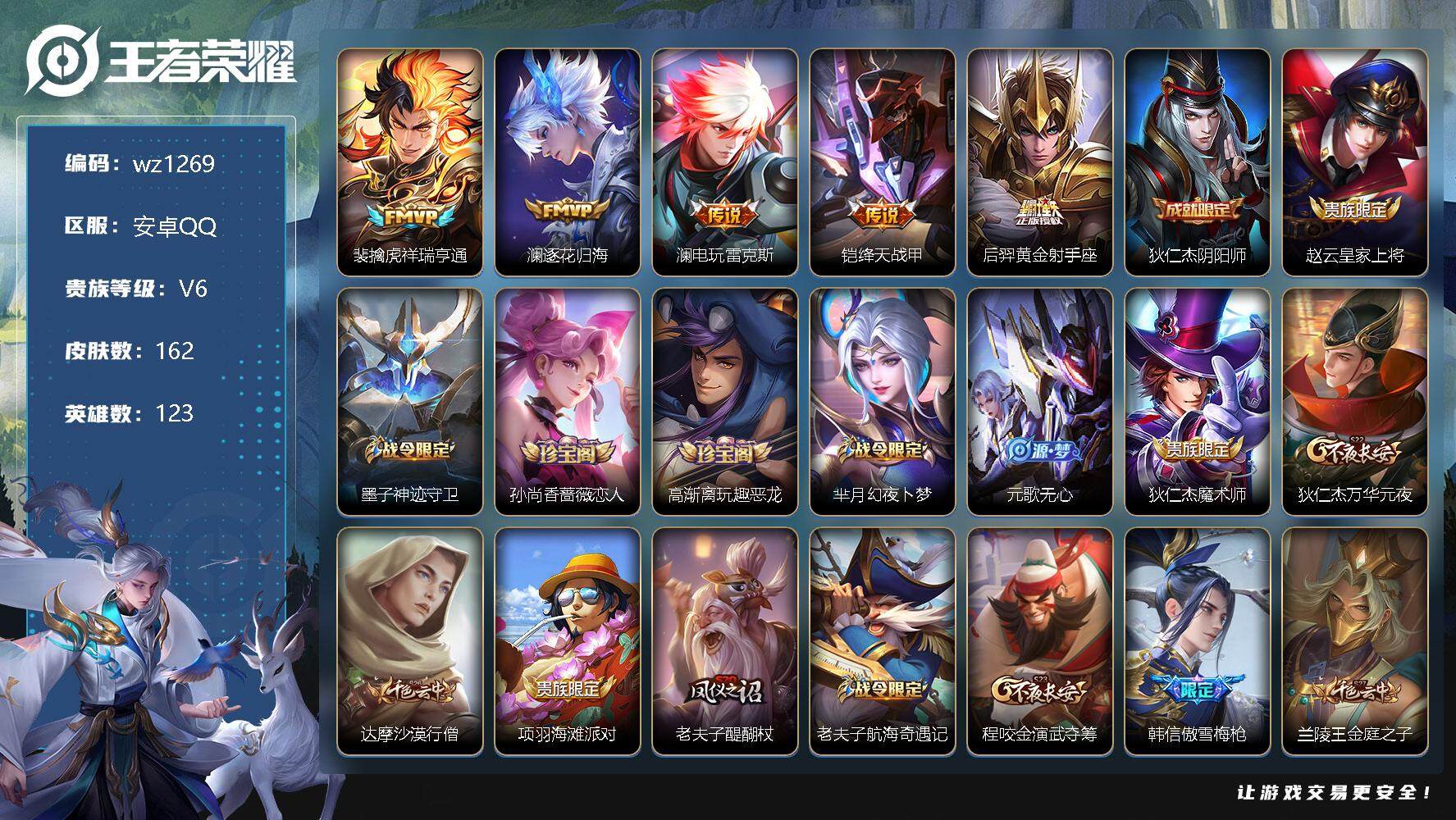 【账号佳】 【可二次实名】【wz1269】【商品标题】:安卓Q-V6-最强王者段位-123英雄-162皮肤-0典藏-0珍品无双-0无双-0珍品传说-5传说-34史诗 【传说皮肤】:裴擒虎祥瑞亨通,澜逐花归海,澜电玩雷克斯,铠绛天战甲,后羿黄金射手座 【限定皮肤】:狄仁杰阴阳师,赵云皇家上将,墨子神迹守卫,孙尚香蔷薇恋人,高渐离玩趣恶龙,芈月幻夜卜梦,元歌无心,狄仁杰魔术师,狄仁杰万华元夜,达摩沙漠行僧,项羽海滩派对,老夫子醍醐杖,老夫子航海奇遇记,程咬金演武夺筹,韩信傲雪梅枪,兰陵王金庭之子,孙悟空孙行者,后羿圣弓游侠,李元芳云中旅人,钟馗驱傩正仪,杨玉环遇见飞天,干将莫邪真爱魔法,雅典娜黎明之约,鬼谷子原初探秘者,鬼谷子五谷丰年,黄忠火炮绅士,苏烈千军破阵,百里玄策原初追逐者,梦奇顽趣,沈梦溪大漠名商,裴擒虎李小龙,裴擒虎擒涛扼浪,嫦娥拒霜思,鲁班大师探海日志,桑启海盐诗旅,张良古海寻踪,蒙恬荣光圣徽,鬼谷子天穹祈灯,刘邦剑破天穹,程咬金群星魔术团 【赛季限定】:狄仁杰万华元夜,达摩沙漠行僧,老夫子醍醐杖,程咬金演武夺筹,兰陵王金庭之子,张良古海寻踪,李元芳云中旅人,钟馗驱傩正仪,雅典娜黎明之约,鬼谷子原初探秘者,苏烈千军破阵,百里玄策原初追逐者,梦奇顽趣,沈梦溪大漠名商,裴擒虎擒涛扼浪,鲁班大师探海日志,桑启海盐诗旅,鬼谷子天穹祈灯,蒙恬荣光圣徽,刘邦剑破天穹 【战令限定】:墨子神迹守卫,芈月幻夜卜梦,老夫子航海奇遇记,后羿圣弓游侠,干将莫邪真爱魔法,黄忠火炮绅士 【史诗皮肤】:赵云皇家上将,甄姬冰雪圆舞曲,狄仁杰魔术师,宫本武藏鬼剑武藏,孙尚香蔷薇恋人,孙尚香水果甜心,嬴政摇滚巨星,妲己女仆咖啡,墨子龙骑士,墨子金属风暴,李白千年之狐,吕布末日机甲,安琪拉心灵骇客,铠曙光守护者,白起星夜王子,杨玉环遇见飞天,狄仁杰鹰眼统帅,百里玄策原初追逐者,裴擒虎李小龙,老夫子航海奇遇记,干将莫邪真爱魔法,孙悟空孙行者,嫦娥拒霜思,黄忠火炮绅士,雅典娜黎明之约,韩信傲雪梅枪,夏洛特永昼,鬼谷子五谷丰年,元歌无心,梦奇顽趣,刘禅电玩爆裂旋风,蒙恬荣光圣徽,牛魔星界战将,后羿石田雨龙 【其他皮肤】:项羽海滩派对,韩信教廷特使,韩信街头霸王,露娜哥特玫瑰,阿轲爱心护理,赵云忍炎影,白起白色死神,扁鹊化身博士,扁鹊救世之瞳,宫本武藏未来纪元,姜子牙时尚教父,妲己少女阿狸,典韦黄金武士,达摩拳王,花木兰兔女郎,张飞五福同心,甄姬花好人间,刘备万事如意,宫本武藏万象初新,狄仁杰阴阳师,刘备纽约教父,关羽龙腾万里,墨子进击墨子号,钟无艳海滩丽影,宫本武藏霸王丸,狂铁命运角斗场,老夫子功夫老勺,孙尚香沉稳之力,诸葛亮掌控之力,鬼谷子幻乐之宴,苏烈坚韧之力,明世隐虹云星官,小乔丁香结,吕布野性能量,孙膑归虚梦演,高渐离玩趣恶龙,沈梦溪鲨炮海盗猫,哪吒次元突破,老夫子醍醐杖,狂铁特工战影,鬼谷子原初探秘者,狄仁杰万华元夜,刘禅秘密基地,露娜瓷语鉴心,程咬金演武夺筹,张良缤纷绘卷,钟馗驱傩正仪,墨子神迹守卫,鲁班大师乓乓大师,苏烈千军破阵,后羿圣弓游侠,典韦铁甲之心,妲己紫罗兰之誓,达摩沙漠行僧,芈月幻夜卜梦,程咬金无双福将,刘邦虎啸剑宗,兰陵王金庭之子,沈梦溪大漠名商,蒙犽胡桃狂想曲,蒙恬蔚蓝守将,李元芳云中旅人,戈娅危途狂花,桑启海盐诗旅,海月幻泉雾影,猪八戒潮玩探月行,裴擒虎擒涛扼浪,莱西奥西部游侠,鲁班大师探海日志,姬小满零食大作战,张良古海寻踪,鬼谷子天穹祈灯,廉颇功夫炙烤,刘邦剑破天穹,程咬金群星魔术团,老夫子百相守梦,苍苍林狼骑,太乙真人谧流熔炉,姜子牙星梦巡礼,戈娅玫蓝誓约,钟馗虚灵犬护,张良灵野札记,阿古朵布丁狗之约,甄姬逆浪荇歌,鲁班七号福禄兄弟,鲁班七号木偶奇遇记,露娜绯红之刃,钟无艳生化警戒,貂蝉异域舞娘,老夫子潮流仙人,曹操超能战警,小乔万圣前夜,孙悟空西部大镖客,刘禅英喵野望,兰陵王隐刃,李元芳特种部队,虞姬加勒比小姐,蔡文姬蔷薇王座,马可波罗激情绿茵,苍维京掠夺者,杨戬埃及法老,太乙真人圆桌骑士,诸葛亮星航指挥官,黄忠芝加哥教父,大乔伊势巫女,铠龙域领主,百里守约绝影神枪,明世隐占星师,公孙离花间舞,裴擒虎街头旋风,弈星踏雪寻梅,米莱狄精准探案法,元歌午夜歌剧院,伽罗花见巫女,李信灼热之刃,上官婉儿修竹墨客,云中君荷鲁斯之眼,曜归虚梦演,蒙恬秩序猎龙将,澜孤猎,司空震启蛰,云缨赤焰之缨,暃碧珀绯影 【内测皮肤】:孙尚香蔷薇恋人,高渐离玩趣恶龙,狂铁特工战影 【营地ID】:1773054857