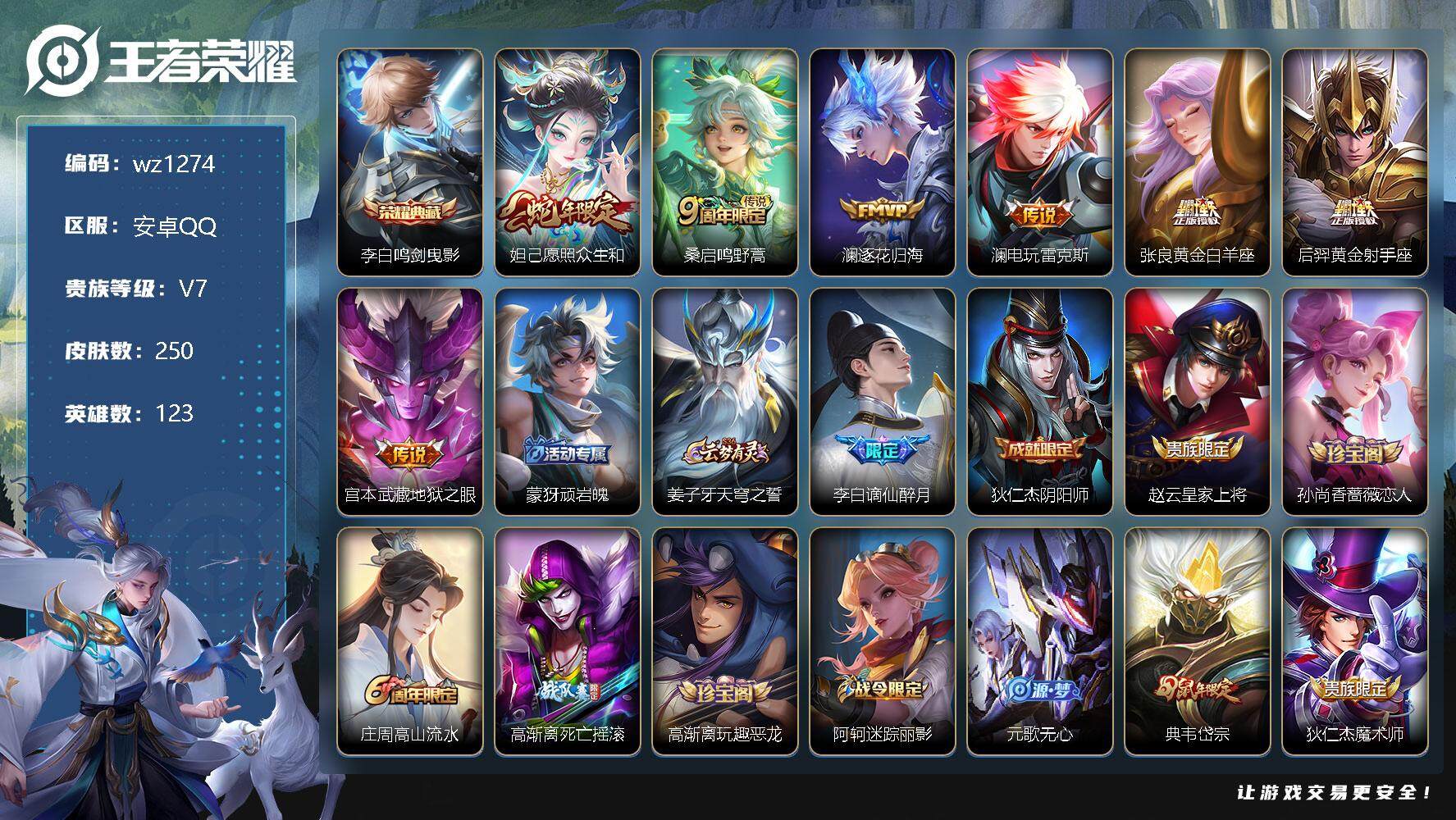 【账号佳】 【可二次实名】【wz1274】【商品标题】:安卓Q-V7-最强王者段位-123英雄-250皮肤-1典藏-0珍品无双-0无双-0珍品传说-7传说-70史诗 【荣耀典藏】:李白鸣剑曳影 【传说皮肤】:妲己愿照众生和,桑启鸣野蒿,澜逐花归海,澜电玩雷克斯,张良黄金白羊座,后羿黄金射手座,宫本武藏地狱之眼 【限定皮肤】:蒙犽顽岩魄,姜子牙天穹之誓,李白谪仙醉月,狄仁杰阴阳师,赵云皇家上将,孙尚香蔷薇恋人,庄周高山流水,高渐离死亡摇滚,高渐离玩趣恶龙,阿轲迷踪丽影,元歌无心,典韦岱宗,狄仁杰魔术师,狄仁杰万华元夜,达摩沙漠行僧,项羽海滩派对,老夫子醍醐杖,程咬金演武夺筹,韩信飞衡,韩信傲雪梅枪,兰陵王金庭之子,孙悟空孙行者,李元芳银河之约,李元芳云中旅人,钟馗驱傩正仪,杨戬潮玩骑兵,雅典娜黎明之约,太乙真人华丽摇滚,鬼谷子原初探秘者,鬼谷子五谷丰年,苏烈千军破阵,百里玄策原初追逐者,梦奇顽趣,沈梦溪大漠名商,明世隐疑决卦,裴擒虎李小龙,裴擒虎擒涛扼浪,云中君纤云弄巧,上官婉儿梁祝,嫦娥拒霜思,嫦娥暖冬兔眠,鲁班大师探海日志,桑启海盐诗旅,暃星界游侠,艾琳流音漫舞,司空震地狱燃心,阿古朵江河有灵,张良古海寻踪,蒙犽百解令,蒙恬荣光圣徽,高渐离燃音魔法,妲己灵卜魔法,鬼谷子天穹祈灯,沈梦溪龙舞盛年,鲁班七号蔬乡物语,李元芳蔬乡物语,刘邦剑破天穹,程咬金群星魔术团,刘备异域游侠,周瑜熔金海岸 【年限皮肤】:韩信飞衡,典韦岱宗 【赛季限定】:狄仁杰万华元夜,达摩沙漠行僧,老夫子醍醐杖,程咬金演武夺筹,兰陵王金庭之子,张良古海寻踪,李元芳云中旅人,钟馗驱傩正仪,雅典娜黎明之约,鬼谷子原初探秘者,苏烈千军破阵,百里玄策原初追逐者,梦奇顽趣,沈梦溪大漠名商,明世隐疑决卦,裴擒虎擒涛扼浪,鲁班大师探海日志,桑启海盐诗旅,鬼谷子天穹祈灯,蒙恬荣光圣徽,刘邦剑破天穹,姜子牙天穹之誓 【战令限定】:阿轲迷踪丽影,艾琳流音漫舞,李元芳银河之约,杨戬潮玩骑兵,嫦娥暖冬兔眠,司空震地狱燃心,暃星界游侠,高渐离燃音魔法,妲己灵卜魔法,鲁班七号蔬乡物语,李元芳蔬乡物语 【史诗皮肤】:项羽苍穹之光,赵云皇家上将,赵云未来纪元,貂蝉圣诞恋歌,甄姬冰雪圆舞曲,王昭君偶像歌手,狄仁杰魔术师,宫本武藏鬼剑武藏,孙尚香蔷薇恋人,孙尚香水果甜心,嬴政摇滚巨星,妲己魅力维加斯,妲己女仆咖啡,墨子龙骑士,墨子金属风暴,吕布圣诞狂欢,刘禅绅士熊喵,李白千年之狐,吕布末日机甲,花木兰水晶猎龙者,兰陵王暗隐猎兽者,诸葛亮黄金分割率,百里守约特工魅影,铠曙光守护者,刘禅天才门将,李元芳逐浪之夏,程咬金功夫厨神,白起星夜王子,阿轲节奏热浪,孙策猫狗日记,伽罗箭羽风息,狄仁杰鹰眼统帅,上官婉儿梁祝,李元芳银河之约,韩信飞衡,典韦岱宗,小乔青蛇,阿轲迷踪丽影,橘右京修罗,百里玄策原初追逐者,裴擒虎李小龙,云中君纤云弄巧,孙悟空孙行者,庄周高山流水,嫦娥拒霜思,雅典娜黎明之约,韩信傲雪梅枪,张良千筹问战,鬼谷子五谷丰年,元歌无心,梦奇顽趣,暃星界游侠,司空震地狱燃心,阿古朵江河有灵,蒙犽百解令,妲己灵卜魔法,高渐离燃音魔法,蒙恬荣光圣徽,鲁班七号蔬乡物语,黄忠怒海争锋,蒙犽顽岩魄,姬小满战舞者,亚连破空之剑,李白谪仙醉月,百里守约百相守梦,牛魔星界战将,孙膑茶境仙,阿轲化蝶舞,刘禅鸭鸭历险记,狂铁龙之律动,黄忠百相守梦 【其他皮肤】:项羽海滩派对,韩信教廷特使,韩信街头霸王,达摩大发明家,赵云白执事,赵云忍炎影,芈月红桃皇后,白起白色死神,扁鹊化身博士,宫本武藏未来纪元,安琪拉玩偶对对碰,孙膑天使之翼,妲己少女阿狸,典韦黄金武士,亚瑟死亡骑士,达摩拳王,花木兰兔女郎,张飞五福同心,宫本武藏万象初新,后羿阿尔法小队,狄仁杰阴阳师,刘备纽约教父,高渐离死亡摇滚,刘备汉昭烈帝,李元芳黑猫爱糖果,关羽龙腾万里,钟无艳海滩丽影,狂铁命运角斗场,老夫子功夫老勺,孙尚香沉稳之力,诸葛亮掌控之力,李白敏锐之力,鬼谷子幻乐之宴,太乙真人华丽摇滚,苏烈坚韧之力,明世隐虹云星官,小乔丁香结,吕布野性能量,高渐离玩趣恶龙,沈梦溪鲨炮海盗猫,姜子牙炽热元素使,哪吒次元突破,鲁班七号黑桃队长,明世隐疑决卦,老夫子醍醐杖,狂铁特工战影,鬼谷子原初探秘者,狄仁杰万华元夜,刘禅秘密基地,程咬金演武夺筹,钟馗驱傩正仪,鲁班大师乓乓大师,苏烈千军破阵,达摩沙漠行僧,程咬金无双福将,兰陵王金庭之子,沈梦溪大漠名商,蒙犽胡桃狂想曲,蒙恬蔚蓝守将,李元芳云中旅人,戈娅危途狂花,刘备潮玩造梦师,桑启海盐诗旅,嫦娥暖冬兔眠,海月幻泉雾影,猪八戒潮玩探月行,牛魔牛运亨通,赵怀真太极少年,裴擒虎擒涛扼浪,杨戬潮玩骑兵,太乙真人劲辣红锅,莱西奥西部游侠,鲁班大师探海日志,艾琳流音漫舞,张良古海寻踪,海月王牌新星,亚连破局者,兰陵王幻夜行动,曹操决胜大满贯,后羿完美