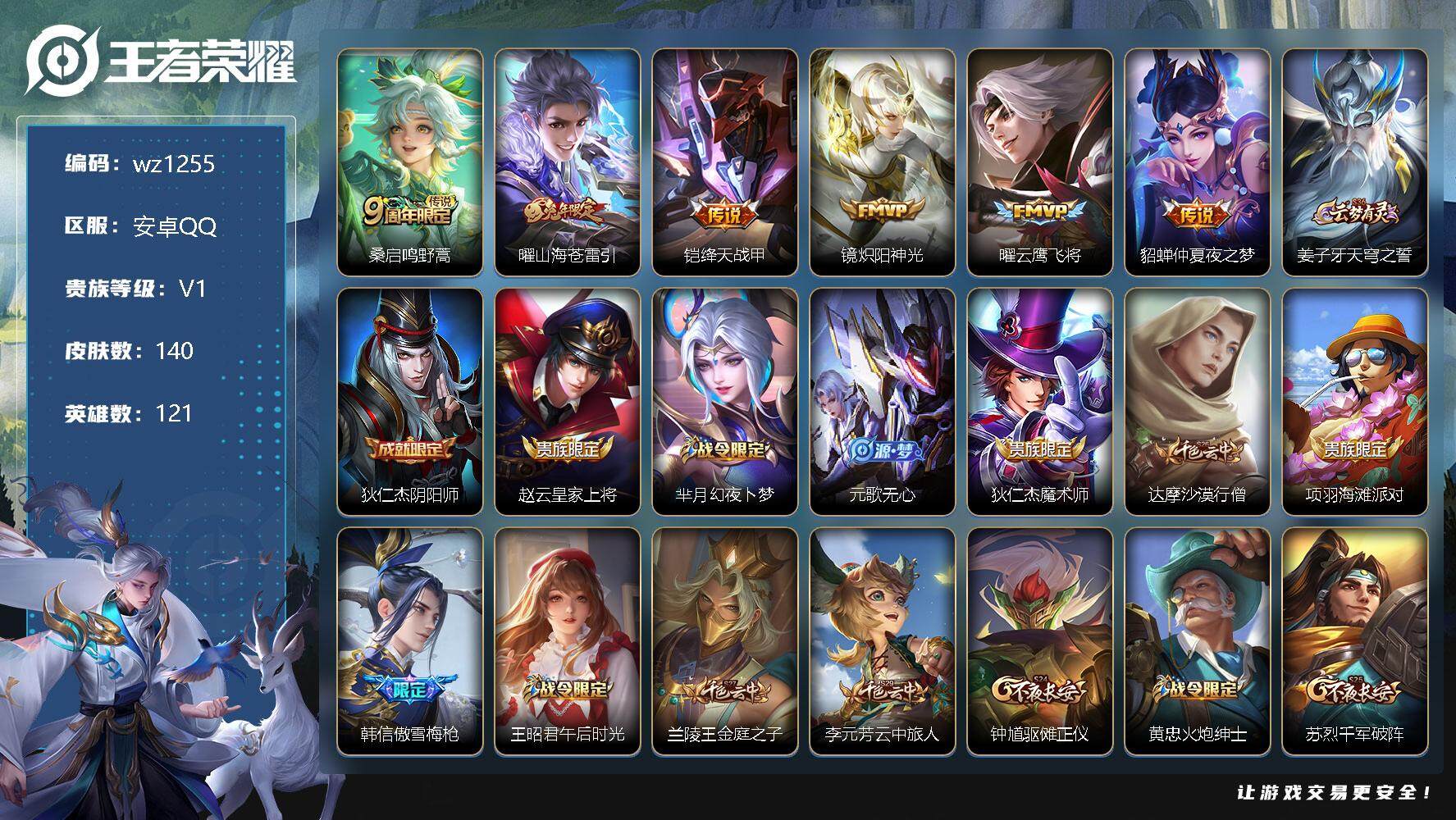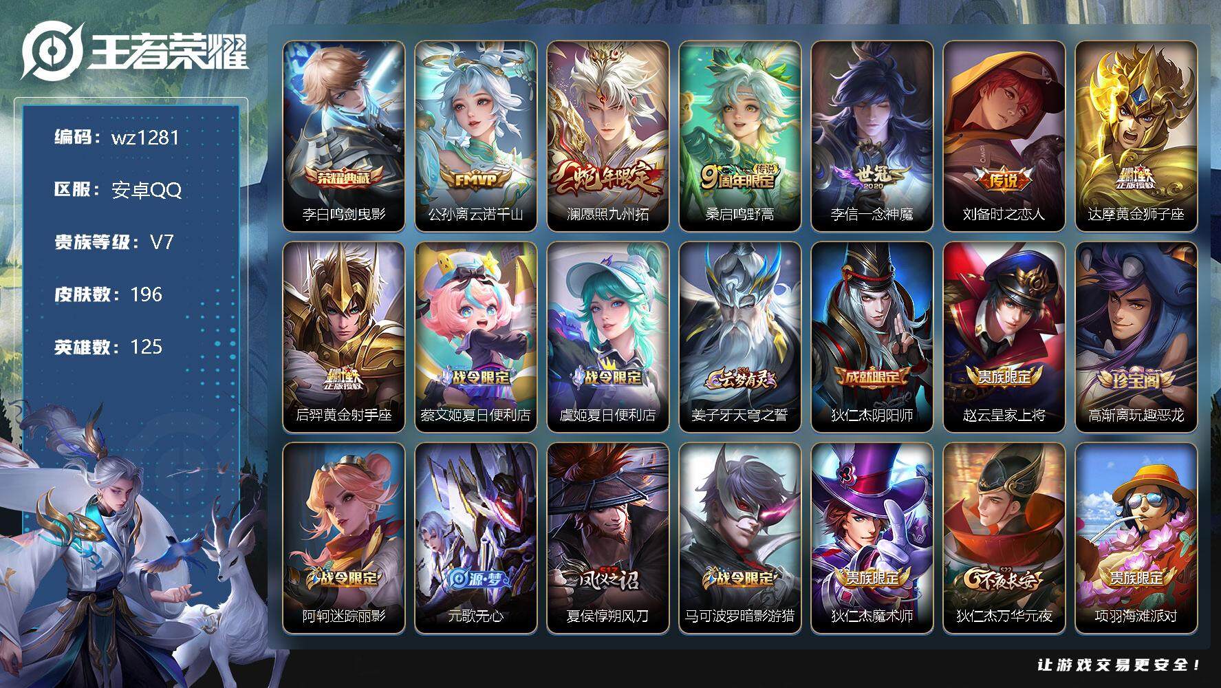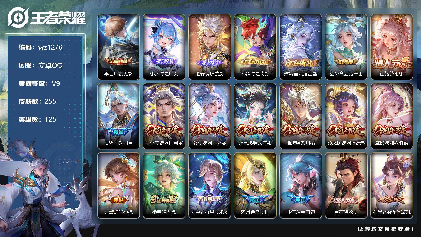 【账号佳】 【可二次实名】【wz1276】【商品标题】:安卓Q-V9-最强王者段位-125英雄-255皮肤-1典藏-0珍品无双-2无双-2珍品传说-36传说-63史诗 【荣耀典藏】:李白鸣剑曳影 【无双皮肤】:小乔时之魔女,曜器灵螭龙剑 【珍品传说】:孙策时之奇旅,嫦娥器灵落星盏 【传说皮肤】:公孙离云诺千山,西施续相思,后羿千劫归真,司空震愿照山河定,女娲愿照千秋盛,妲己愿照众生和,澜愿照九州拓,蔡文姬愿照福禄聚,虞姬愿照岁时盈,云缨幻光神枪,桑启鸣野蒿,云中君群星魔术团,海月金乌负日,亚连落雪白狼,吕布曦玄引,孙尚香乘龙问璇玑,孙策乘龙淬吴钩,赵云乘龙铭钟鼎,铠琥珀纪元,澜逐花归海,公孙离记忆之芯,夏洛特浮生妄,李白诗剑行,狄仁杰神器狴犴令,百里守约碎云,孙尚香音你闪耀,孙策挚爱之约,孙策末日机甲,公孙离祈雪灵祝,诸葛亮时雨天司,镜炽阳神光,虞姬启明星使,曜云鹰飞将,李信一念神魔,刘备时之恋人,貂蝉仲夏夜之梦 【限定皮肤】:蒙犽顽岩魄,蔡文姬夏日便利店,大乔绒语心约,虞姬夏日便利店,姜子牙天穹之誓,狄仁杰阴阳师,赵云皇家上将,赵云引擎之心,钟无艳超时空战士,孙膑寅虎展翼,元歌无心,甄姬落雪兰心,马可波罗山海玄木吟,狄仁杰魔术师,狄仁杰神器狴犴令,达摩沙漠行僧,项羽海滩派对,安琪拉魔法小厨娘,程咬金演武夺筹,韩信傲雪梅枪,孙悟空大圣娶亲,后羿如梦令,刘备百相守梦,李元芳云中旅人,虞姬启明星使,钟馗神迹守卫,钟馗驱傩正仪,女娲朔望之晖,鬼谷子五谷丰年,诸葛亮时雨天司,百里玄策原初追逐者,公孙离祈雪灵祝,沈梦溪大漠名商,裴擒虎天狼狩猎者,裴擒虎擒涛扼浪,孙策挚爱之约,鲁班大师探海日志,盘古冰霜神祇,桑启海盐诗旅,夏洛特浮生妄,张良古海寻踪,鬼谷子天穹祈灯,伽罗琥珀纪元,铠琥珀纪元,姬小满妄想食味,小乔时之魔女,孙尚香乘龙问璇玑,孙策乘龙淬吴钩,赵云乘龙铭钟鼎,吕布曦玄引,亚连落雪白狼,沈梦溪龙舞盛年,曹操夜都魔契,鲁班七号蔬乡物语,李元芳蔬乡物语,海月金乌负日,刘邦剑破天穹,上官婉儿群星魔术团,程咬金群星魔术团,云中君群星魔术团,镜青焰无极,项羽苍威无极,海诺心动手记,刘备异域游侠,周瑜熔金海岸 【年限皮肤】:孙膑寅虎展翼,公孙离祈雪灵祝,诸葛亮时雨天司,马可波罗山海玄木吟,孙尚香乘龙问璇玑,孙策乘龙淬吴钩,赵云乘龙铭钟鼎 【赛季限定】:达摩沙漠行僧,程咬金演武夺筹,张良古海寻踪,李元芳云中旅人,钟馗驱傩正仪,百里玄策原初追逐者,沈梦溪大漠名商,裴擒虎擒涛扼浪,鲁班大师探海日志,桑启海盐诗旅,鬼谷子天穹祈灯,刘邦剑破天穹,姜子牙天穹之誓 【战令限定】:蔡文姬夏日便利店,虞姬夏日便利店,钟无艳超时空战士,甄姬落雪兰心,钟馗神迹守卫,女娲朔望之晖,鲁班七号蔬乡物语,李元芳蔬乡物语,镜青焰无极,项羽苍威无极 【史诗皮肤】:鲁班七号电玩小子,露娜紫霞仙子,赵云皇家上将,貂蝉圣诞恋歌,甄姬冰雪圆舞曲,狄仁杰魔术师,宫本武藏鬼剑武藏,孙尚香水果甜心,妲己魅力维加斯,妲己女仆咖啡,墨子龙骑士,吕布圣诞狂欢,刘禅绅士熊喵,安琪拉魔法小厨娘,韩信白龙吟,赵云引擎之心,花木兰水晶猎龙者,小乔缤纷独角兽,兰陵王暗隐猎兽者,雅典娜冰冠公主,李元芳逐浪之夏,程咬金功夫厨神,白起星夜王子,阿轲节奏热浪,孙策猫狗日记,大乔猫狗日记,孙悟空大圣娶亲,伽罗箭羽风息,裴擒虎天狼狩猎者,狄仁杰鹰眼统帅,公孙离无限星赏官,娜可露露晚萤,后羿如梦令,橘右京修罗,百里玄策原初追逐者,沈梦溪月团寄思,司马懿暗渊魔法,韩信傲雪梅枪,孙膑寅虎展翼,澜赏金猎手,钟无艳超时空战士,鬼谷子五谷丰年,元歌无心,马可波罗山海玄木吟,盘古冰霜神祇,刘备百相守梦,伽罗琥珀纪元,姬小满妄想食味,曹操夜都魔契,鲁班七号蔬乡物语,上官婉儿群星魔术团,镜青焰无极,海诺心动手记,黄忠怒海争锋,蔡文姬夏日便利店,蒙犽顽岩魄,少司缘涂山红红,大司命东方月初,艾琳陌上桑,牛魔星界战将,赵怀真器灵浮梦炉,阿轲化蝶舞,狂铁龙之律动 【其他皮肤】:项羽海滩派对,韩信教廷特使,露娜哥特玫瑰,达摩大发明家,赵云白执事,赵云忍炎影,白起白色死神,牛魔西部大镖客,武则天东方不败,安琪拉玩偶对对碰,孙膑天使之翼,姜子牙时尚教父,妲己少女阿狸,典韦黄金武士,亚瑟死亡骑士,花木兰兔女郎,张飞五福同心,甄姬花好人间,刘备万事如意,宫本武藏万象初新,后羿阿尔法小队,狄仁杰阴阳师,刘备纽约教父,关羽龙腾万里,钟无艳海滩丽影,王昭君幻想奇妙夜,老夫子功夫老勺,李白敏锐之力,鬼谷子幻乐之宴,苏烈坚韧之力,大乔守护之力,明世隐虹云星官,女娲朔望之晖,小乔丁香结,钟馗神迹守卫,孙膑归虚梦演,沈梦溪鲨炮海盗猫,哪吒次元突破,鲁班七号黑桃队长,盾山圆桌骑士,狂铁特工战影,刘禅秘密基地,杨戬次元傲视,露娜瓷语鉴心,程咬金演武夺筹,张良缤纷绘卷,钟馗驱傩正仪,鲁班大师乓