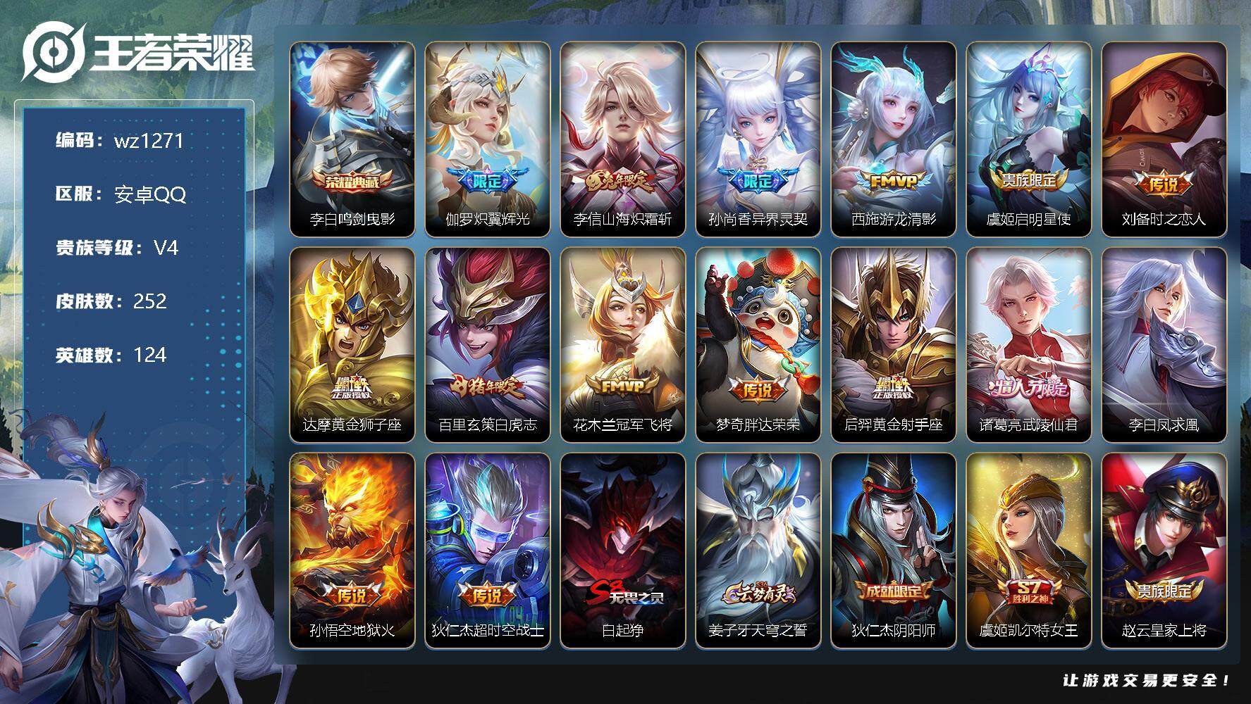 【账号佳】 【可二次实名】【wz1271】【商品标题】:安卓Q-V4-永恒钻石V段位-124英雄-252皮肤-1典藏-0珍品无双-0无双-0珍品传说-15传说-71史诗 【荣耀典藏】:李白鸣剑曳影 【传说皮肤】:伽罗炽翼辉光,李信山海炽霜斩,孙尚香异界灵契,西施游龙清影,虞姬启明星使,刘备时之恋人,达摩黄金狮子座,百里玄策白虎志,花木兰冠军飞将,梦奇胖达荣荣,后羿黄金射手座,诸葛亮武陵仙君,李白凤求凰,孙悟空地狱火,狄仁杰超时空战士 【限定皮肤】:白起狰,姜子牙天穹之誓,狄仁杰阴阳师,虞姬凯尔特女王,赵云皇家上将,墨子神迹守卫,嬴政白昼王子,孙尚香异界灵契,鲁班七号狮舞东方,庄周高山流水,高渐离死亡摇滚,阿轲迷踪丽影,白起夜都怪侠,芈月重明,芈月幻夜卜梦,吕布猎兽之王,周瑜赤莲之焰,夏侯惇朔风刀,甄姬游园惊梦,曹操烛龙,典韦穷奇,典韦蓝屏警告,马可波罗暗影游猎,马可波罗山海玄木吟,狄仁杰魔术师,狄仁杰万华元夜,达摩沙漠行僧,项羽海滩派对,老夫子醍醐杖,安琪拉魔法小厨娘,程咬金演武夺筹,露娜一生所爱,刘邦夺宝奇兵,韩信飞衡,兰陵王驯魔猎人,兰陵王金庭之子,花木兰瑞麟志,孙悟空大圣娶亲,孙悟空孙行者,牛魔御旌,后羿圣弓游侠,李元芳银河之约,李元芳云中旅人,虞姬霸王别姬,虞姬启明星使,钟馗神迹守卫,钟馗驱傩正仪,杨玉环遇见飞天,女娲朔望之晖,干将莫邪冰霜恋舞曲,干将莫邪真爱魔法,雅典娜单词大作战,雅典娜黎明之约,蔡文姬繁星吟游,太乙真人饕餮,鬼谷子原初探秘者,鬼谷子五谷丰年,诸葛亮武陵仙君,黄忠火炮绅士,苏烈千军破阵,百里玄策白虎志,百里玄策原初追逐者,百里守约朱雀志,弈星混沌棋,梦奇顽趣,公孙离蜜橘之夏,沈梦溪星空之诺,沈梦溪大漠名商,明世隐疑决卦,裴擒虎李小龙,裴擒虎擒涛扼浪,狂铁御狮,米莱狄御霄,瑶山海碧波行,云中君纤云弄巧,李信山海炽霜斩,伽罗炽翼辉光,盾山御銮,猪八戒西部大镖客,猪八戒猪悟能,上官婉儿梁祝,嫦娥拒霜思,蒙犽狂想玩偶喵,鲁班大师探海日志,桑启海盐诗旅,艾琳女武神,阿古朵江河有灵,张良古海寻踪,蒙恬荣光圣徽,鬼谷子天穹祈灯,姬小满妄想食味,沈梦溪龙舞盛年,刘邦剑破天穹 【年限皮肤】:百里玄策白虎志,百里守约朱雀志,花木兰瑞麟志,李白凤求凰,韩信飞衡,马超神威,瑶山海碧波行,马可波罗山海玄木吟,李信山海炽霜斩,伽罗炽翼辉光 【赛季限定】:白起狰,芈月重明,夏侯惇朔风刀,曹操烛龙,典韦穷奇,狄仁杰万华元夜,达摩沙漠行僧,老夫子醍醐杖,程咬金演武夺筹,兰陵王金庭之子,张良古海寻踪,牛魔御旌,李元芳云中旅人,虞姬凯尔特女王,钟馗驱傩正仪,雅典娜黎明之约,太乙真人饕餮,鬼谷子原初探秘者,苏烈千军破阵,百里玄策原初追逐者,弈星混沌棋,梦奇顽趣,沈梦溪大漠名商,明世隐疑决卦,裴擒虎擒涛扼浪,狂铁御狮,米莱狄御霄,盾山御銮,鲁班大师探海日志,桑启海盐诗旅,鬼谷子天穹祈灯,蒙恬荣光圣徽,刘邦剑破天穹,姜子牙天穹之誓 【战令限定】:墨子神迹守卫,嬴政白昼王子,鲁班七号狮舞东方,阿轲迷踪丽影,白起夜都怪侠,芈月幻夜卜梦,吕布猎兽之王,周瑜赤莲之焰,典韦蓝屏警告,马可波罗暗影游猎,刘邦夺宝奇兵,兰陵王驯魔猎人,后羿圣弓游侠,李元芳银河之约,钟馗神迹守卫,女娲朔望之晖,干将莫邪真爱魔法,雅典娜单词大作战,黄忠火炮绅士,沈梦溪星空之诺,猪八戒西部大镖客,蒙犽狂想玩偶喵 【史诗皮肤】:露娜紫霞仙子,赵云皇家上将,貂蝉圣诞恋歌,甄姬冰雪圆舞曲,王昭君偶像歌手,狄仁杰魔术师,宫本武藏鬼剑武藏,孙尚香水果甜心,嬴政摇滚巨星,妲己魅力维加斯,妲己女仆咖啡,墨子龙骑士,李白千年之狐,安琪拉魔法小厨娘,虞姬霸王别姬,刘邦德古拉伯爵,夏侯惇乘风破浪,小乔缤纷独角兽,甄姬游园惊梦,亚瑟心灵战警,雅典娜冰冠公主,百里守约特工魅影,铠曙光守护者,蔡文姬舞动绿茵,刘禅天才门将,公孙离蜜橘之夏,李元芳逐浪之夏,阿轲节奏热浪,杨玉环遇见飞天,嬴政白昼王子,孙策猫狗日记,大乔猫狗日记,百里守约朱雀志,干将莫邪冰霜恋舞曲,露娜一生所爱,孙悟空大圣娶亲,花木兰瑞麟志,典韦蓝屏警告,伽罗箭羽风息,鲁班七号狮舞东方,狄仁杰鹰眼统帅,公孙离无限星赏官,兰陵王驯魔猎人,上官婉儿梁祝,蔡文姬繁星吟游,李元芳银河之约,韩信飞衡,阿轲迷踪丽影,橘右京修罗,马超神威,马可波罗暗影游猎,蒙犽狂想玩偶喵,百里玄策原初追逐者,裴擒虎李小龙,云中君纤云弄巧,干将莫邪真爱魔法,孙悟空孙行者,猪八戒猪悟能,庄周高山流水,嫦娥拒霜思,黄忠火炮绅士,雅典娜黎明之约,貂蝉唤灵魅影,鬼谷子五谷丰年,梦奇顽趣,马可波罗山海玄木吟,瑶山海碧波行,刘禅电玩爆裂旋风,阿古朵江河有灵,蒙恬荣光圣徽,姬小满妄想食味 【其他皮肤】:项羽海滩派对,韩信教廷特使,韩信街头霸王,露娜哥特玫瑰,阿轲致命风华,阿轲爱心护理,赵云忍炎影,芈月红桃皇后,艾