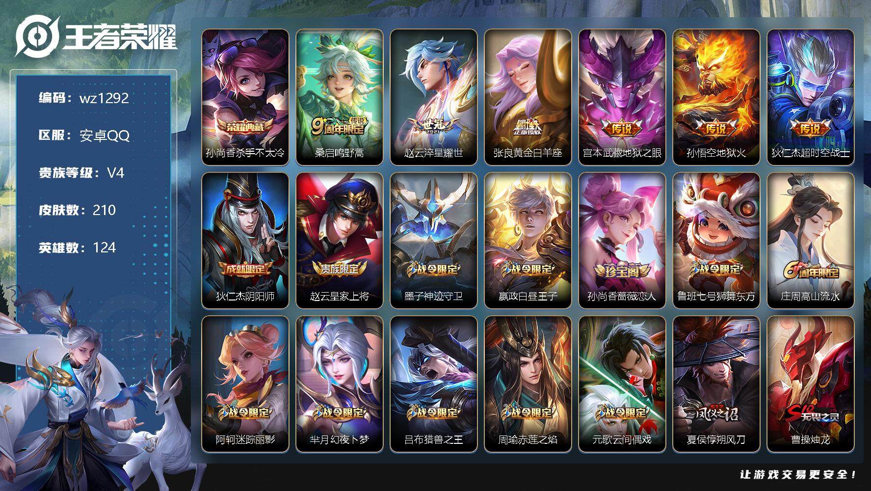【账号佳】 【可二次实名】【wz1292】【商品标题】:安卓Q-V4-永恒钻石V段位-124英雄-210皮肤-1典藏-0珍品无双-0无双-0珍品传说-6传说-59史诗 【荣耀典藏】:孙尚香杀手不太冷 【传说皮肤】:桑启鸣野蒿,赵云淬星耀世,张良黄金白羊座,宫本武藏地狱之眼,孙悟空地狱火,狄仁杰超时空战士 【限定皮肤】:狄仁杰阴阳师,赵云皇家上将,墨子神迹守卫,嬴政白昼王子,孙尚香蔷薇恋人,鲁班七号狮舞东方,庄周高山流水,阿轲迷踪丽影,芈月幻夜卜梦,吕布猎兽之王,周瑜赤莲之焰,元歌云间偶戏,夏侯惇朔风刀,曹操烛龙,典韦穷奇,马可波罗暗影游猎,狄仁杰魔术师,狄仁杰万华元夜,达摩星际陆战队,达摩沙漠行僧,项羽海滩派对,老夫子醍醐杖,老夫子航海奇遇记,程咬金演武夺筹,刘邦夺宝奇兵,韩信逐梦之影,王昭君午后时光,兰陵王驯魔猎人,兰陵王金庭之子,亚瑟潮玩骑士王,牛魔御旌,后羿圣弓游侠,李元芳银河之约,李元芳云中旅人,钟馗神迹守卫,钟馗驱傩正仪,杨玉环遇见飞天,干将莫邪真爱魔法,雅典娜单词大作战,鬼谷子原初探秘者,鬼谷子五谷丰年,黄忠火炮绅士,苏烈千军破阵,弈星混沌棋,沈梦溪星空之诺,沈梦溪大漠名商,明世隐疑决卦,裴擒虎李小龙,裴擒虎擒涛扼浪,狂铁御狮,狂铁电玩高手,米莱狄御霄,米莱狄胡桃异想国,云中君纤云弄巧,盾山御銮,猪八戒西部大镖客,猪八戒猪悟能,上官婉儿梁祝,蒙犽狂想玩偶喵,鲁班大师探海日志,桑启海盐诗旅,艾琳女武神,张良古海寻踪,鬼谷子天穹祈灯,刘邦剑破天穹,周瑜熔金海岸 【赛季限定】:夏侯惇朔风刀,曹操烛龙,典韦穷奇,狄仁杰万华元夜,达摩沙漠行僧,老夫子醍醐杖,程咬金演武夺筹,兰陵王金庭之子,张良古海寻踪,牛魔御旌,李元芳云中旅人,钟馗驱傩正仪,鬼谷子原初探秘者,苏烈千军破阵,弈星混沌棋,沈梦溪大漠名商,明世隐疑决卦,裴擒虎擒涛扼浪,狂铁御狮,米莱狄御霄,盾山御銮,鲁班大师探海日志,桑启海盐诗旅,鬼谷子天穹祈灯,刘邦剑破天穹 【战令限定】:墨子神迹守卫,嬴政白昼王子,鲁班七号狮舞东方,阿轲迷踪丽影,芈月幻夜卜梦,吕布猎兽之王,周瑜赤莲之焰,元歌云间偶戏,马可波罗暗影游猎,达摩星际陆战队,老夫子航海奇遇记,刘邦夺宝奇兵,王昭君午后时光,兰陵王驯魔猎人,亚瑟潮玩骑士王,后羿圣弓游侠,李元芳银河之约,钟馗神迹守卫,干将莫邪真爱魔法,雅典娜单词大作战,黄忠火炮绅士,沈梦溪星空之诺,狂铁电玩高手,米莱狄胡桃异想国,猪八戒西部大镖客,蒙犽狂想玩偶喵 【史诗皮肤】:露娜紫霞仙子,阿轲暗夜猫娘,赵云皇家上将,赵云未来纪元,貂蝉圣诞恋歌,甄姬冰雪圆舞曲,王昭君偶像歌手,狄仁杰魔术师,宫本武藏鬼剑武藏,孙尚香蔷薇恋人,孙尚香水果甜心,妲己魅力维加斯,墨子金属风暴,吕布圣诞狂欢,刘禅绅士熊喵,曹操幽灵船长,李白千年之狐,张飞乱世虎臣,花木兰水晶猎龙者,刘邦德古拉伯爵,韩信逐梦之影,夏侯惇乘风破浪,小乔缤纷独角兽,兰陵王暗隐猎兽者,亚瑟心灵战警,雅典娜冰冠公主,百里守约特工魅影,李元芳逐浪之夏,程咬金功夫厨神,白起星夜王子,阿轲节奏热浪,杨玉环遇见飞天,嬴政白昼王子,孙策猫狗日记,伽罗箭羽风息,鲁班七号狮舞东方,狄仁杰鹰眼统帅,公孙离无限星赏官,兰陵王驯魔猎人,上官婉儿梁祝,李元芳银河之约,不知火舞魅语,阿轲迷踪丽影,橘右京修罗,孙尚香时之恋人,马可波罗暗影游猎,蒙犽狂想玩偶喵,裴擒虎李小龙,云中君纤云弄巧,元歌云间偶戏,米莱狄胡桃异想国,老夫子航海奇遇记,干将莫邪真爱魔法,猪八戒猪悟能,庄周高山流水,黄忠火炮绅士,狂铁电玩高手,鬼谷子五谷丰年,后羿石田雨龙 【其他皮肤】:项羽海滩派对,韩信教廷特使,韩信街头霸王,露娜哥特玫瑰,阿轲爱心护理,赵云忍炎影,艾琳女武神,白起白色死神,牛魔西部大镖客,扁鹊化身博士,宫本武藏未来纪元,安琪拉玩偶对对碰,孙膑天使之翼,妲己少女阿狸,典韦黄金武士,亚瑟死亡骑士,达摩拳王,甄姬花好人间,宫本武藏万象初新,后羿阿尔法小队,狄仁杰阴阳师,刘备汉昭烈帝,关羽龙腾万里,钟无艳海滩丽影,宫本武藏霸王丸,曹操烛龙,王昭君幻想奇妙夜,狂铁命运角斗场,老夫子功夫老勺,孙尚香沉稳之力,典韦穷奇,李白敏锐之力,鬼谷子幻乐之宴,狂铁御狮,大乔守护之力,米莱狄御霄,吕布猎兽之王,明世隐虹云星官,牛魔御旌,小乔丁香结,钟馗神迹守卫,盾山御銮,孙膑归虚梦演,沈梦溪鲨炮海盗猫,姜子牙炽热元素使,夏侯惇朔风刀,周瑜赤莲之焰,沈梦溪星空之诺,弈星混沌棋,哪吒次元突破,明世隐疑决卦,刘邦夺宝奇兵,盾山圆桌骑士,老夫子醍醐杖,猪八戒西部大镖客,狂铁特工战影,鬼谷子原初探秘者,雅典娜单词大作战,狄仁杰万华元夜,亚瑟潮玩骑士王,刘禅秘密基地,露娜瓷语鉴心,达摩星际陆战队,程咬金演武夺筹,张良缤纷绘卷,盘古重装意志,钟馗驱傩正仪,墨子神迹守卫,鲁班大师乓乓大师,苏烈千军破阵,后羿圣