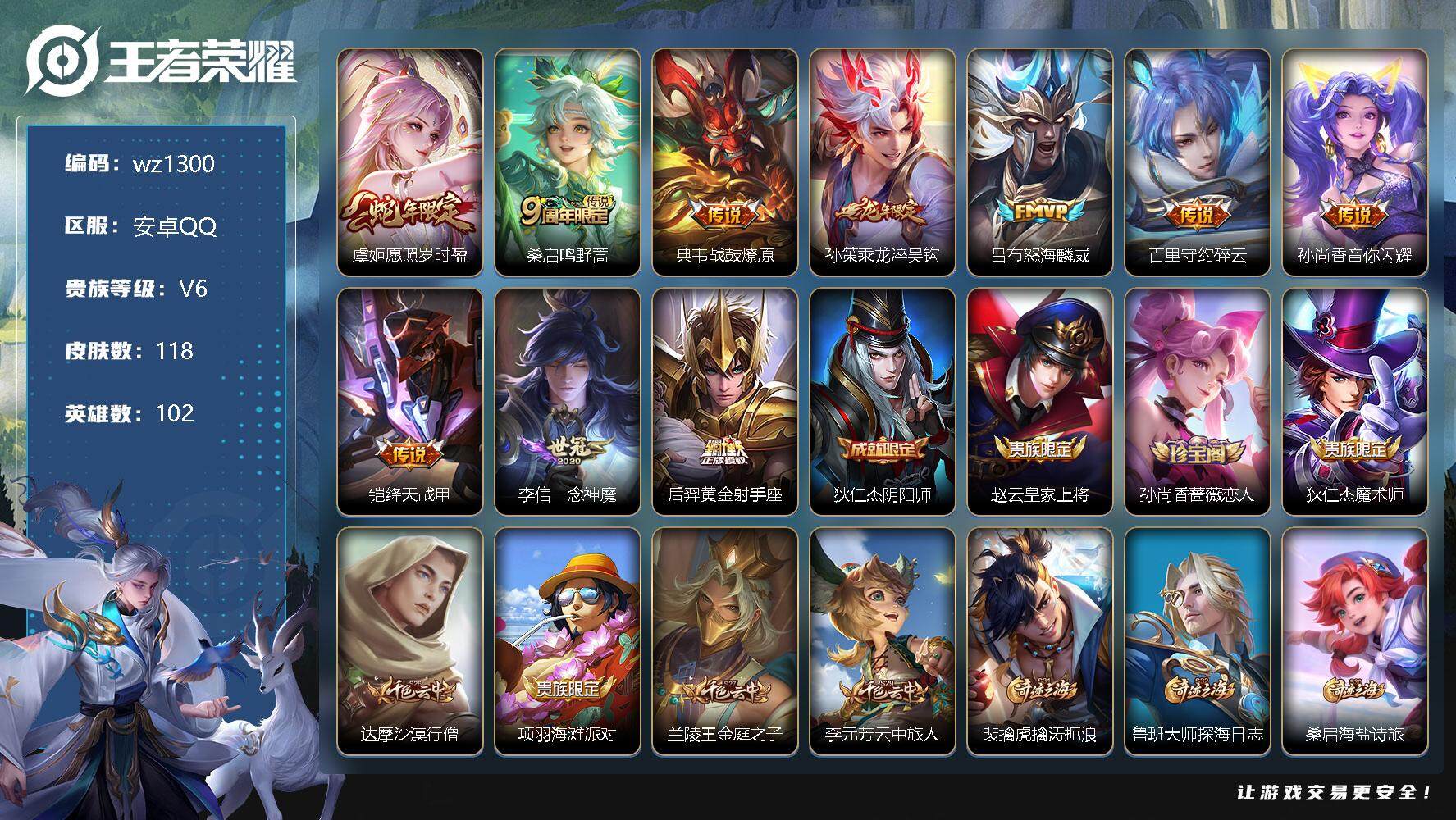 【账号佳】 【可二次实名】【wz1300】【商品标题】:安卓Q-V6-至尊星耀V段位-102英雄-118皮肤-0典藏-0珍品无双-0无双-0珍品传说-10传说-27史诗 【传说皮肤】:虞姬愿照岁时盈,桑启鸣野蒿,典韦战鼓燎原,孙策乘龙淬吴钩,吕布怒海麟威,百里守约碎云,孙尚香音你闪耀,铠绛天战甲,李信一念神魔,后羿黄金射手座 【限定皮肤】:狄仁杰阴阳师,赵云皇家上将,孙尚香蔷薇恋人,狄仁杰魔术师,达摩沙漠行僧,项羽海滩派对,兰陵王金庭之子,李元芳云中旅人,裴擒虎擒涛扼浪,鲁班大师探海日志,桑启海盐诗旅,张良古海寻踪,鬼谷子天穹祈灯,孙策乘龙淬吴钩,沈梦溪龙舞盛年,李元芳蔬乡物语,刘邦剑破天穹,程咬金群星魔术团,刘备异域游侠 【年限皮肤】:孙策乘龙淬吴钩 【赛季限定】:达摩沙漠行僧,兰陵王金庭之子,张良古海寻踪,李元芳云中旅人,裴擒虎擒涛扼浪,鲁班大师探海日志,桑启海盐诗旅,鬼谷子天穹祈灯,刘邦剑破天穹 【战令限定】:李元芳蔬乡物语 【史诗皮肤】:赵云皇家上将,赵云未来纪元,狄仁杰魔术师,宫本武藏鬼剑武藏,孙尚香蔷薇恋人,孙尚香水果甜心,妲己女仆咖啡,墨子龙骑士,吕布圣诞狂欢,张飞乱世虎臣,兰陵王暗隐猎兽者,亚瑟心灵战警,安琪拉心灵骇客,铠曙光守护者,蔡文姬舞动绿茵,刘禅天才门将,阿轲节奏热浪,狄仁杰鹰眼统帅,小乔青蛇,瑶遇见神鹿,孙尚香时之恋人,钟馗乐园奇幻夜,安琪拉时之奇旅,刘禅电玩爆裂旋风,阿轲化蝶舞,狂铁龙之律动,黄忠百相守梦 【其他皮肤】:项羽海滩派对,赵云忍炎影,芈月红桃皇后,白起白色死神,扁鹊救世之瞳,安琪拉玩偶对对碰,妲己少女阿狸,典韦黄金武士,亚瑟死亡骑士,达摩拳王,狄仁杰阴阳师,钟无艳海滩丽影,老夫子功夫老勺,诸葛亮掌控之力,明世隐虹云星官,沈梦溪鲨炮海盗猫,鲁班七号黑桃队长,刘禅秘密基地,达摩沙漠行僧,兰陵王金庭之子,蒙犽胡桃狂想曲,李元芳云中旅人,桑启海盐诗旅,猪八戒潮玩探月行,裴擒虎擒涛扼浪,鲁班大师探海日志,张良古海寻踪,鬼谷子天穹祈灯,海诺时空谍影,廉颇功夫炙烤,沈梦溪龙舞盛年,李元芳蔬乡物语,刘邦剑破天穹,程咬金群星魔术团,刘备异域游侠,盘古敬我三分,东皇太一噬灭天穹,亚瑟动物派对,米莱狄怪诞之夜,吕布逐霄战戟,苍苍林狼骑,太乙真人谧流熔炉,影魅影绮裳,姜子牙星梦巡礼,东皇太一金福满堂,达摩爆裂喵拳,少司缘灵卦秘语,明世隐景韶洛都,戈娅玫蓝誓约,刘备浪漫序章,钟馗虚灵犬护,苏烈春野闲踪,小乔秘证寻踪,张良灵野札记,阿古朵布丁狗之约,露娜命运加冕,姬小满小满鸭,白起死霸装,甄姬逆浪荇歌,高渐离金属狂潮,项羽帝国元帅,王昭君精灵公主,张良一千零一夜,刘禅英喵野望,兰陵王隐刃,夏侯惇战争骑士,杨戬埃及法老,铠龙域领主,明世隐占星师,裴擒虎街头旋风,弈星踏雪寻梅,元歌午夜歌剧院,司马懿魇语军师,伽罗花见巫女,李信灼热之刃,猪八戒年年有余,云中君荷鲁斯之眼,西施归虚梦演,蒙恬秩序猎龙将,司空震启蛰,暃碧珀绯影 【内测皮肤】:孙尚香蔷薇恋人 【营地ID】:1612728212