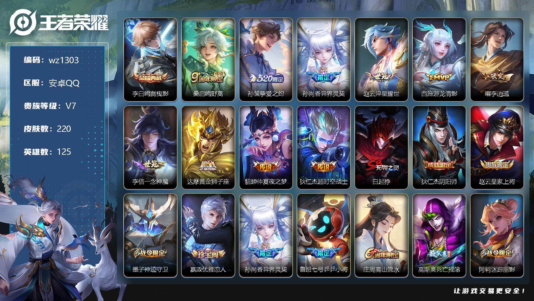 【账号佳】 【可二次实名】【wz1303】【商品标题】:安卓Q-V7-至尊星耀V段位-125英雄-220皮肤-1典藏-0珍品无双-0无双-0珍品传说-10传说-66史诗 【荣耀典藏】:李白鸣剑曳影 【传说皮肤】:桑启鸣野蒿,孙策挚爱之约,孙尚香异界灵契,赵云淬星耀世,西施游龙清影,曜李逍遥 ,李信一念神魔,达摩黄金狮子座,貂蝉仲夏夜之梦,狄仁杰超时空战士 【限定皮肤】:白起狰,狄仁杰阴阳师,赵云皇家上将,墨子神迹守卫,嬴政优雅恋人,孙尚香异界灵契,鲁班七号乒乒小将,庄周高山流水,高渐离死亡摇滚,阿轲迷踪丽影,钟无艳王者之锤,白起夜都怪侠,芈月白晶晶,芈月幻夜卜梦,曹操烛龙,马可波罗暗影游猎,狄仁杰魔术师,狄仁杰万华元夜,达摩沙漠行僧,项羽海滩派对,老夫子醍醐杖,老夫子航海奇遇记,程咬金演武夺筹,刘邦夺宝奇兵,兰陵王金庭之子,孙悟空大圣娶亲,孙悟空孙行者,牛魔御旌,后羿圣弓游侠,李元芳银河之约,李元芳云中旅人,虞姬霸王别姬,钟馗驱傩正仪,干将莫邪胡桃夹子,干将莫邪真爱魔法,雅典娜单词大作战,雅典娜黎明之约,蔡文姬繁星吟游,鬼谷子原初探秘者,鬼谷子五谷丰年,黄忠火炮绅士,苏烈千军破阵,百里玄策原初追逐者,弈星混沌棋,梦奇顽趣,公孙离蜜橘之夏,沈梦溪星空之诺,沈梦溪大漠名商,明世隐疑决卦,明世隐吟游魔法,裴擒虎李小龙,裴擒虎擒涛扼浪,狂铁御狮,云中君纤云弄巧,云中君时之祈愿,伽罗天狼溯光者,盾山御銮,孙策挚爱之约,猪八戒西部大镖客,猪八戒猪悟能,上官婉儿天狼绘梦者,嫦娥拒霜思,曜李逍遥 ,蒙犽狂想玩偶喵,鲁班大师探海日志,桑启海盐诗旅,阿古朵江河有灵,张良古海寻踪,刘邦剑破天穹,程咬金群星魔术团,周瑜熔金海岸 【年限皮肤】:马超神威 【赛季限定】:白起狰,曹操烛龙,狄仁杰万华元夜,达摩沙漠行僧,老夫子醍醐杖,程咬金演武夺筹,兰陵王金庭之子,张良古海寻踪,牛魔御旌,李元芳云中旅人,钟馗驱傩正仪,雅典娜黎明之约,鬼谷子原初探秘者,苏烈千军破阵,百里玄策原初追逐者,弈星混沌棋,梦奇顽趣,沈梦溪大漠名商,明世隐疑决卦,裴擒虎擒涛扼浪,狂铁御狮,盾山御銮,鲁班大师探海日志,桑启海盐诗旅,刘邦剑破天穹 【战令限定】:墨子神迹守卫,阿轲迷踪丽影,白起夜都怪侠,芈月幻夜卜梦,马可波罗暗影游猎,老夫子航海奇遇记,刘邦夺宝奇兵,后羿圣弓游侠,李元芳银河之约,干将莫邪真爱魔法,雅典娜单词大作战,黄忠火炮绅士,沈梦溪星空之诺,明世隐吟游魔法,猪八戒西部大镖客,蒙犽狂想玩偶喵 【史诗皮肤】:项羽苍穹之光,钟无艳王者之锤,赵云皇家上将,貂蝉圣诞恋歌,王昭君偶像歌手,狄仁杰魔术师,宫本武藏鬼剑武藏,孙尚香水果甜心,嬴政优雅恋人,嬴政摇滚巨星,妲己魅力维加斯,妲己女仆咖啡,墨子金属风暴,吕布圣诞狂欢,曹操幽灵船长,吕布末日机甲,虞姬霸王别姬,花木兰水晶猎龙者,夏侯惇乘风破浪,小乔缤纷独角兽,兰陵王暗隐猎兽者,亚瑟心灵战警,雅典娜冰冠公主,铠曙光守护者,公孙离蜜橘之夏,李元芳逐浪之夏,程咬金功夫厨神,白起星夜王子,孙策猫狗日记,孙悟空大圣娶亲,伽罗箭羽风息,狄仁杰鹰眼统帅,蔡文姬繁星吟游,李元芳银河之约,娜可露露晚萤,阿轲迷踪丽影,橘右京修罗,瑶遇见神鹿,马超神威,上官婉儿天狼绘梦者,马可波罗暗影游猎,蒙犽狂想玩偶喵,百里玄策原初追逐者,裴擒虎李小龙,云中君纤云弄巧,芈月白晶晶,百里玄策热力回旋,老夫子航海奇遇记,伽罗天狼溯光者,鲁班七号乒乒小将,杨戬天秀启明,干将莫邪真爱魔法,孙悟空孙行者,猪八戒猪悟能,庄周高山流水,嫦娥拒霜思,黄忠火炮绅士,雅典娜黎明之约,云中君时之祈愿,夏洛特永昼,澜赏金猎手,明世隐吟游魔法,高渐离天秀音浪,鬼谷子五谷丰年,梦奇顽趣,阿古朵江河有灵 【其他皮肤】:项羽海滩派对,韩信教廷特使,韩信街头霸王,露娜哥特玫瑰,达摩大发明家,赵云忍炎影,程咬金星际陆战队,扁鹊化身博士,扁鹊救世之瞳,宫本武藏未来纪元,安琪拉玩偶对对碰,孙膑天使之翼,妲己少女阿狸,典韦黄金武士,亚瑟死亡骑士,达摩拳王,张飞五福同心,宫本武藏万象初新,狄仁杰阴阳师,刘备纽约教父,高渐离死亡摇滚,刘备汉昭烈帝,关羽龙腾万里,白起狰,钟无艳海滩丽影,宫本武藏霸王丸,曹操烛龙,王昭君幻想奇妙夜,狂铁命运角斗场,老夫子功夫老勺,牛魔制霸全明星,孙尚香沉稳之力,诸葛亮掌控之力,狂铁御狮,苏烈坚韧之力,大乔守护之力,项羽科学大爆炸,牛魔御旌,小乔丁香结,吕布野性能量,盾山御銮,孙膑归虚梦演,沈梦溪鲨炮海盗猫,姜子牙炽热元素使,沈梦溪星空之诺,弈星混沌棋,哪吒次元突破,明世隐疑决卦,刘邦夺宝奇兵,盾山圆桌骑士,老夫子醍醐杖,猪八戒西部大镖客,狂铁特工战影,廉颇无尽征程,鬼谷子原初探秘者,雅典娜单词大作战,狄仁杰万华元夜,刘禅秘密基地,杨戬次元傲视,程咬金演武夺筹,钟馗驱傩正仪,墨子神迹守卫,鲁班大师乓乓大师,