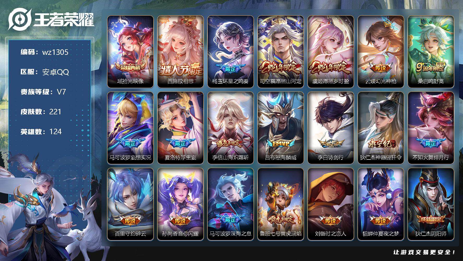 【账号佳】 【可二次实名】【wz1305】【商品标题】:安卓Q-V7-永恒钻石III段位-124英雄-221皮肤-1典藏-0珍品无双-0无双-0珍品传说-19传说-63史诗 【荣耀典藏】:瑶拾光映像 【传说皮肤】:西施续相思,杨玉环星之鸣奏,司空震愿照山河定,虞姬愿照岁时盈,云缨幻光神枪,桑启鸣野蒿,马可波罗妄想实况,夏洛特浮生妄,李信山海炽霜斩,吕布怒海麟威,李白诗剑行,狄仁杰神器狴犴令,不知火舞绯月行,百里守约碎云,孙尚香音你闪耀,马可波罗深海之息,鲁班七号寅虎瑞焰,刘备时之恋人,貂蝉仲夏夜之梦 【限定皮肤】:狄仁杰阴阳师,赵云皇家上将,鲁班七号寅虎瑞焰,高渐离玩趣恶龙,扁鹊奇幻香踪,元歌云间偶戏,元歌无心,马可波罗深海之息,马可波罗山海玄木吟,马可波罗妄想实况,狄仁杰魔术师,狄仁杰万华元夜,狄仁杰神器狴犴令,项羽海滩派对,老夫子醍醐杖,老夫子航海奇遇记,王昭君午后时光,兰陵王金庭之子,不知火舞绯月行,李元芳云中旅人,钟馗驱傩正仪,杨戬潮玩骑兵,鬼谷子五谷丰年,百里玄策原初追逐者,弈星混沌棋,梦奇顽趣,沈梦溪大漠名商,明世隐疑决卦,裴擒虎擒涛扼浪,狂铁电玩高手,云中君纤云弄巧,李信山海炽霜斩,盾山御銮,上官婉儿天狼绘梦者,上官婉儿神器万象笔,嫦娥暖冬兔眠,西施玲珑珍味,鲁班大师探海日志,桑启海盐诗旅,夏洛特浮生妄,暃星界游侠,戈娅驭风魔法,艾琳流音漫舞,赵怀真鹤归松栖,司空震地狱燃心,阿古朵江河有灵,张良古海寻踪,蒙犽百解令,蒙恬荣光圣徽,妲己灵卜魔法,鬼谷子天穹祈灯,沈梦溪龙舞盛年,刘邦剑破天穹,周瑜熔金海岸 【年限皮肤】:鲁班七号寅虎瑞焰,马可波罗山海玄木吟,李信山海炽霜斩 【赛季限定】:狄仁杰万华元夜,老夫子醍醐杖,兰陵王金庭之子,张良古海寻踪,李元芳云中旅人,钟馗驱傩正仪,百里玄策原初追逐者,弈星混沌棋,梦奇顽趣,沈梦溪大漠名商,明世隐疑决卦,裴擒虎擒涛扼浪,盾山御銮,鲁班大师探海日志,桑启海盐诗旅,鬼谷子天穹祈灯,蒙恬荣光圣徽,刘邦剑破天穹 【战令限定】:扁鹊奇幻香踪,元歌云间偶戏,老夫子航海奇遇记,王昭君午后时光,艾琳流音漫舞,杨戬潮玩骑兵,狂铁电玩高手,嫦娥暖冬兔眠,西施玲珑珍味,司空震地狱燃心,暃星界游侠,戈娅驭风魔法,妲己灵卜魔法 【史诗皮肤】:鲁班七号电玩小子,露娜紫霞仙子,赵云皇家上将,赵云未来纪元,甄姬冰雪圆舞曲,王昭君偶像歌手,狄仁杰魔术师,宫本武藏鬼剑武藏,孙尚香水果甜心,妲己女仆咖啡,墨子金属风暴,吕布圣诞狂欢,刘禅绅士熊喵,曹操幽灵船长,张飞乱世虎臣,花木兰水晶猎龙者,刘邦德古拉伯爵,夏侯惇乘风破浪,小乔缤纷独角兽,兰陵王暗隐猎兽者,亚瑟心灵战警,安琪拉心灵骇客,百里守约特工魅影,铠曙光守护者,刘禅天才门将,李元芳逐浪之夏,白起星夜王子,阿轲节奏热浪,孙策猫狗日记,伽罗箭羽风息,狄仁杰鹰眼统帅,娜可露露晚萤,瑶遇见神鹿,上官婉儿天狼绘梦者,百里玄策原初追逐者,云中君纤云弄巧,元歌云间偶戏,老夫子航海奇遇记,夏洛特永昼,狂铁电玩高手,张良千筹问战,弈星滕王阁序,鬼谷子五谷丰年,上官婉儿神器万象笔,元歌无心,梦奇顽趣,暃星界游侠,马可波罗山海玄木吟,扁鹊奇幻香踪,刘禅电玩爆裂旋风,戈娅驭风魔法,赵怀真鹤归松栖,司空震地狱燃心,阿古朵江河有灵,蒙犽百解令,妲己灵卜魔法,蒙恬荣光圣徽,百里守约百相守梦,牛魔星界战将,孙膑茶境仙,赵怀真器灵浮梦炉,狄仁杰绮世丹青,阿轲化蝶舞,狂铁龙之律动 【其他皮肤】:项羽海滩派对,韩信教廷特使,韩信街头霸王,露娜哥特玫瑰,阿轲爱心护理,赵云白执事,赵云忍炎影,芈月红桃皇后,宫本武藏未来纪元,安琪拉玩偶对对碰,孙膑天使之翼,妲己少女阿狸,典韦黄金武士,花木兰兔女郎,张飞五福同心,甄姬花好人间,后羿阿尔法小队,狄仁杰阴阳师,刘备汉昭烈帝,关羽龙腾万里,墨子进击墨子号,钟无艳海滩丽影,王昭君幻想奇妙夜,老夫子功夫老勺,苏烈坚韧之力,明世隐虹云星官,小乔丁香结,吕布野性能量,盾山御銮,孙膑归虚梦演,高渐离玩趣恶龙,沈梦溪鲨炮海盗猫,姜子牙炽热元素使,弈星混沌棋,鲁班七号黑桃队长,明世隐疑决卦,盾山圆桌骑士,老夫子醍醐杖,狂铁特工战影,狄仁杰万华元夜,刘禅秘密基地,钟馗驱傩正仪,程咬金无双福将,兰陵王金庭之子,王昭君午后时光,沈梦溪大漠名商,蒙犽胡桃狂想曲,蒙恬蔚蓝守将,李元芳云中旅人,戈娅危途狂花,刘备潮玩造梦师,桑启海盐诗旅,嫦娥暖冬兔眠,海月幻泉雾影,猪八戒潮玩探月行,牛魔牛运亨通,白起乐园追猎者,赵怀真太极少年,裴擒虎擒涛扼浪,杨戬潮玩骑兵,太乙真人劲辣红锅,莱西奥西部游侠,鲁班大师探海日志,西施玲珑珍味,姬小满零食大作战,李元芳妄想特派,哪吒热血海滩,艾琳流音漫舞,张良古海寻踪,海月王牌新星,后羿完美运算,鬼谷子天穹祈灯,妲己灵卜魔法,朵莉亚金色潮汐,廉颇功夫炙烤,沈梦溪龙舞盛年,刘邦剑