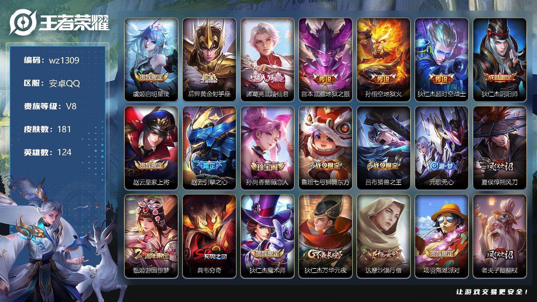 【账号佳】 【可二次实名】【wz1309】【商品标题】:安卓Q-V8-荣耀黄金I段位-124英雄-181皮肤-0典藏-0珍品无双-0无双-0珍品传说-6传说-44史诗 【传说皮肤】:虞姬启明星使,后羿黄金射手座,诸葛亮武陵仙君,宫本武藏地狱之眼,孙悟空地狱火,狄仁杰超时空战士 【限定皮肤】:狄仁杰阴阳师,赵云皇家上将,赵云引擎之心,孙尚香蔷薇恋人,鲁班七号狮舞东方,吕布猎兽之王,元歌无心,夏侯惇朔风刀,甄姬游园惊梦,典韦穷奇,狄仁杰魔术师,狄仁杰万华元夜,达摩沙漠行僧,项羽海滩派对,老夫子醍醐杖,关羽冰锋战神,程咬金演武夺筹,兰陵王金庭之子,孙悟空美猴王,牛魔御旌,李元芳云中旅人,虞姬启明星使,钟馗神迹守卫,钟馗驱傩正仪,蔡文姬繁星吟游,鬼谷子原初探秘者,诸葛亮武陵仙君,苏烈千军破阵,弈星混沌棋,沈梦溪大漠名商,明世隐疑决卦,裴擒虎李小龙,裴擒虎擒涛扼浪,狂铁御狮,米莱狄御霄,米莱狄胡桃异想国,云中君纤云弄巧,盾山御銮,猪八戒猪悟能,上官婉儿梁祝,嫦娥拒霜思,鲁班大师探海日志,桑启海盐诗旅,艾琳流音漫舞,司空震地狱燃心,阿古朵江河有灵,张良古海寻踪,鬼谷子天穹祈灯,周瑜熔金海岸 【年限皮肤】:孙悟空美猴王 【赛季限定】:夏侯惇朔风刀,典韦穷奇,狄仁杰万华元夜,达摩沙漠行僧,老夫子醍醐杖,程咬金演武夺筹,兰陵王金庭之子,张良古海寻踪,牛魔御旌,李元芳云中旅人,钟馗驱傩正仪,鬼谷子原初探秘者,苏烈千军破阵,弈星混沌棋,沈梦溪大漠名商,明世隐疑决卦,裴擒虎擒涛扼浪,狂铁御狮,米莱狄御霄,盾山御銮,鲁班大师探海日志,桑启海盐诗旅,鬼谷子天穹祈灯 【战令限定】:鲁班七号狮舞东方,吕布猎兽之王,艾琳流音漫舞,钟馗神迹守卫,米莱狄胡桃异想国,司空震地狱燃心 【史诗皮肤】:鲁班七号电玩小子,露娜紫霞仙子,赵云皇家上将,赵云未来纪元,甄姬冰雪圆舞曲,王昭君偶像歌手,狄仁杰魔术师,孙尚香蔷薇恋人,孙尚香水果甜心,妲己魅力维加斯,妲己女仆咖啡,墨子金属风暴,吕布圣诞狂欢,刘禅绅士熊喵,李白千年之狐,张飞乱世虎臣,韩信白龙吟,关羽冰锋战神,赵云引擎之心,花木兰水晶猎龙者,刘邦德古拉伯爵,兰陵王暗隐猎兽者,诸葛亮黄金分割率,甄姬游园惊梦,亚瑟心灵战警,安琪拉心灵骇客,百里守约特工魅影,铠曙光守护者,李元芳逐浪之夏,白起星夜王子,伽罗箭羽风息,鲁班七号狮舞东方,狄仁杰鹰眼统帅,上官婉儿梁祝,蔡文姬繁星吟游,裴擒虎李小龙,云中君纤云弄巧,米莱狄胡桃异想国,猪八戒猪悟能,嫦娥拒霜思,元歌无心,司空震地狱燃心,阿古朵江河有灵,弈星万物之道 【其他皮肤】:项羽海滩派对,韩信教廷特使,韩信街头霸王,阿轲爱心护理,赵云白执事,赵云忍炎影,程咬金星际陆战队,白起白色死神,牛魔西部大镖客,扁鹊化身博士,宫本武藏未来纪元,安琪拉玩偶对对碰,妲己少女阿狸,典韦黄金武士,亚瑟死亡骑士,达摩拳王,孙悟空美猴王,花木兰兔女郎,张飞五福同心,甄姬花好人间,刘备万事如意,宫本武藏万象初新,狄仁杰阴阳师,刘备汉昭烈帝,关羽龙腾万里,墨子进击墨子号,钟无艳海滩丽影,宫本武藏霸王丸,狂铁命运角斗场,老夫子功夫老勺,牛魔制霸全明星,孙尚香沉稳之力,典韦穷奇,李白敏锐之力,鬼谷子幻乐之宴,狂铁御狮,苏烈坚韧之力,大乔守护之力,项羽科学大爆炸,米莱狄御霄,吕布猎兽之王,明世隐虹云星官,张良幽兰居士,牛魔御旌,小乔丁香结,吕布野性能量,钟馗神迹守卫,盾山御銮,孙膑归虚梦演,沈梦溪鲨炮海盗猫,姜子牙炽热元素使,夏侯惇朔风刀,弈星混沌棋,哪吒次元突破,鲁班七号黑桃队长,明世隐疑决卦,盾山圆桌骑士,老夫子醍醐杖,狂铁特工战影,鬼谷子原初探秘者,狄仁杰万华元夜,刘禅秘密基地,杨戬次元傲视,程咬金演武夺筹,张良缤纷绘卷,钟馗驱傩正仪,鲁班大师乓乓大师,苏烈千军破阵,马可波罗潮玩牛仔,达摩沙漠行僧,程咬金无双福将,兰陵王金庭之子,米莱狄契约魔法,沈梦溪大漠名商,李元芳云中旅人,刘备潮玩造梦师,桑启海盐诗旅,海月幻泉雾影,猪八戒潮玩探月行,裴擒虎擒涛扼浪,鲁班大师探海日志,李元芳妄想特派,艾琳流音漫舞,张良古海寻踪,亚连破局者,鬼谷子天穹祈灯,廉颇功夫炙烤,周瑜熔金海岸,鲁班七号福禄兄弟,高渐离金属狂潮,钟无艳生化警戒,貂蝉异域舞娘,曹操死神来了,孙膑未来旅行,孙悟空西部大镖客,周瑜海军大将,刘禅英喵野望,兰陵王隐刃,李白范海辛,钟馗地府判官,刘邦圣殿之光,虞姬加勒比小姐,关羽天启骑士,马可波罗激情绿茵,苍维京掠夺者,杨戬埃及法老,哪吒三太子,诸葛亮星航指挥官,黄忠芝加哥教父,铠龙域领主,百里玄策威尼斯狂欢,苏烈爱与和平,梦奇美梦成真,女娲尼罗河女神,裴擒虎街头旋风,元歌午夜歌剧院,孙策海之征途,司马懿魇语军师,伽罗花见巫女,沈梦溪棒球奇才,李信灼热之刃,上官婉儿修竹墨客,猪八戒年年有余,盘古创世神祝,瑶森,曜归虚梦演,鲁班大师归虚