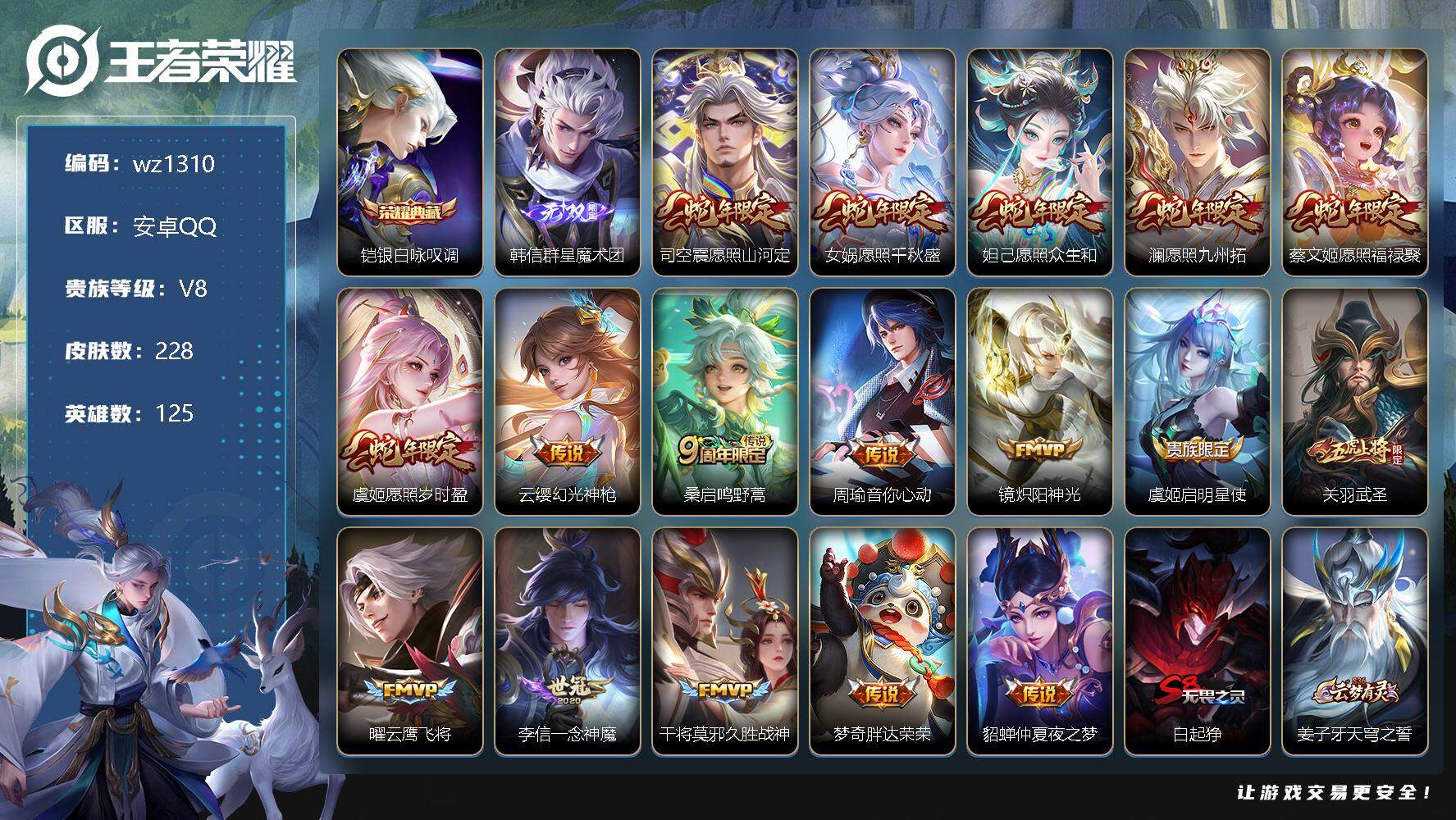 【账号佳】 【可二次实名】【wz1310】【商品标题】:安卓Q-V8-尊贵铂金II段位-125英雄-228皮肤-1典藏-0珍品无双-1无双-0珍品传说-17传说-62史诗 【荣耀典藏】:铠银白咏叹调 【无双皮肤】:韩信群星魔术团 【传说皮肤】:司空震愿照山河定,女娲愿照千秋盛,妲己愿照众生和,澜愿照九州拓,蔡文姬愿照福禄聚,虞姬愿照岁时盈,云缨幻光神枪,桑启鸣野蒿,周瑜音你心动,镜炽阳神光,虞姬启明星使,关羽武圣,曜云鹰飞将,李信一念神魔,干将莫邪久胜战神,梦奇胖达荣荣,貂蝉仲夏夜之梦 【限定皮肤】:白起狰,姜子牙天穹之誓,杨戬破阵退雄兵,狄仁杰阴阳师,虞姬凯尔特女王,赵云皇家上将,墨子神迹守卫,嬴政白昼王子,孙尚香蔷薇恋人,阿轲迷踪丽影,扁鹊炼金王,芈月白晶晶,吕布猎兽之王,吕布御风骁将,元歌云间偶戏,夏侯惇朔风刀,曹操烛龙,典韦穷奇,马可波罗暗影游猎,狄仁杰魔术师,狄仁杰万华元夜,达摩星际陆战队,达摩沙漠行僧,项羽海滩派对,老夫子醍醐杖,老夫子航海奇遇记,关羽冰锋战神,关羽武圣,程咬金演武夺筹,刘邦夺宝奇兵,韩信飞衡,兰陵王金庭之子,亚瑟潮玩骑士王,孙悟空至尊宝,孙悟空孙行者,牛魔御旌,李元芳银河之约,虞姬启明星使,钟馗驱傩正仪,雅典娜单词大作战,蔡文姬繁星吟游,太乙真人饕餮,鬼谷子原初探秘者,铠青龙志,百里玄策原初追逐者,弈星混沌棋,沈梦溪星空之诺,沈梦溪大漠名商,明世隐疑决卦,裴擒虎李小龙,裴擒虎擒涛扼浪,狂铁御狮,米莱狄御霄,米莱狄胡桃异想国,伽罗天狼溯光者,盾山御銮,猪八戒西部大镖客,猪八戒猪悟能,蒙犽狂想玩偶喵,桑启海盐诗旅,张良古海寻踪,鬼谷子天穹祈灯,姬小满妄想食味,刘邦剑破天穹,韩信群星魔术团,周瑜熔金海岸 【年限皮肤】:铠青龙志,吕布御风骁将,韩信飞衡,关羽武圣 【赛季限定】:扁鹊炼金王,白起狰,夏侯惇朔风刀,曹操烛龙,典韦穷奇,狄仁杰万华元夜,达摩沙漠行僧,老夫子醍醐杖,程咬金演武夺筹,兰陵王金庭之子,张良古海寻踪,牛魔御旌,虞姬凯尔特女王,钟馗驱傩正仪,太乙真人饕餮,鬼谷子原初探秘者,百里玄策原初追逐者,弈星混沌棋,沈梦溪大漠名商,明世隐疑决卦,裴擒虎擒涛扼浪,狂铁御狮,米莱狄御霄,盾山御銮,桑启海盐诗旅,鬼谷子天穹祈灯,刘邦剑破天穹,姜子牙天穹之誓 【战令限定】:墨子神迹守卫,嬴政白昼王子,阿轲迷踪丽影,吕布猎兽之王,元歌云间偶戏,马可波罗暗影游猎,达摩星际陆战队,老夫子航海奇遇记,刘邦夺宝奇兵,亚瑟潮玩骑士王,李元芳银河之约,雅典娜单词大作战,沈梦溪星空之诺,米莱狄胡桃异想国,猪八戒西部大镖客,蒙犽狂想玩偶喵 【史诗皮肤】:露娜紫霞仙子,阿轲暗夜猫娘,赵云皇家上将,赵云未来纪元,貂蝉圣诞恋歌,甄姬冰雪圆舞曲,王昭君偶像歌手,狄仁杰魔术师,廉颇地狱岩魂,宫本武藏鬼剑武藏,孙尚香蔷薇恋人,孙尚香水果甜心,嬴政暗夜贵公子,嬴政摇滚巨星,妲己魅力维加斯,妲己女仆咖啡,墨子龙骑士,吕布圣诞狂欢,刘禅绅士熊喵,曹操幽灵船长,李白千年之狐,吕布末日机甲,张飞乱世虎臣,韩信白龙吟,关羽冰锋战神,孙悟空至尊宝,花木兰水晶猎龙者,刘邦德古拉伯爵,夏侯惇乘风破浪,小乔缤纷独角兽,兰陵王暗隐猎兽者,亚瑟心灵战警,雅典娜冰冠公主,安琪拉心灵骇客,百里守约特工魅影,铠曙光守护者,李元芳逐浪之夏,白起星夜王子,嬴政白昼王子,铠青龙志,狄仁杰鹰眼统帅,蔡文姬繁星吟游,李元芳银河之约,韩信飞衡,不知火舞魅语,阿轲迷踪丽影,橘右京修罗,马可波罗暗影游猎,蒙犽狂想玩偶喵,百里玄策原初追逐者,裴擒虎李小龙,元歌云间偶戏,芈月白晶晶,吕布御风骁将,米莱狄胡桃异想国,老夫子航海奇遇记,伽罗天狼溯光者,安琪拉时之奇旅,孙悟空孙行者,猪八戒猪悟能,姬小满妄想食味,赵怀真器灵浮梦炉 【其他皮肤】:项羽海滩派对,韩信教廷特使,韩信街头霸王,露娜哥特玫瑰,达摩大发明家,赵云忍炎影,芈月红桃皇后,牛魔西部大镖客,扁鹊化身博士,宫本武藏未来纪元,孙膑天使之翼,姜子牙时尚教父,妲己少女阿狸,典韦黄金武士,亚瑟死亡骑士,达摩拳王,花木兰兔女郎,张飞五福同心,甄姬花好人间,宫本武藏万象初新,后羿阿尔法小队,狄仁杰阴阳师,刘备纽约教父,刘备汉昭烈帝,扁鹊炼金王,关羽龙腾万里,虞姬凯尔特女王,白起狰,钟无艳海滩丽影,太乙真人饕餮,宫本武藏霸王丸,曹操烛龙,狂铁命运角斗场,老夫子功夫老勺,典韦穷奇,诸葛亮掌控之力,李白敏锐之力,鬼谷子幻乐之宴,狂铁御狮,苏烈坚韧之力,大乔守护之力,米莱狄御霄,吕布猎兽之王,明世隐虹云星官,庄周奇妙博物学,牛魔御旌,小乔丁香结,吕布野性能量,盾山御銮,孙膑归虚梦演,沈梦溪鲨炮海盗猫,姜子牙炽热元素使,夏侯惇朔风刀,沈梦溪星空之诺,弈星混沌棋,哪吒次元突破,明世隐疑决卦,刘邦夺宝奇兵,盾山圆桌骑士,老夫子醍醐杖,猪八戒西部大镖客,廉颇无尽征程,鬼谷子原初探秘