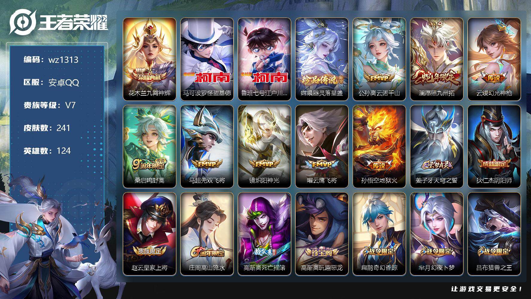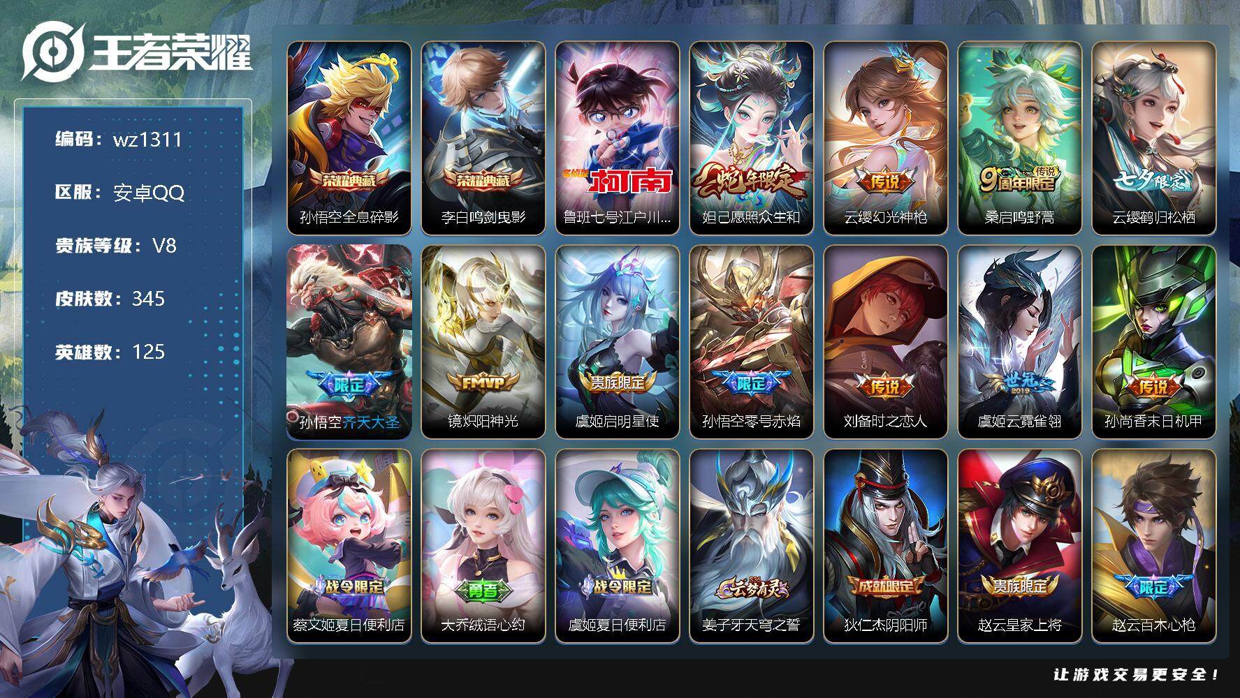 【账号佳】 【可二次实名】【wz1311】【商品标题】:安卓Q-V8-至尊星耀I段位-125英雄-345皮肤-2典藏-0珍品无双-0无双-1珍品传说-11传说-106史诗 【荣耀典藏】:孙悟空全息碎影,李白鸣剑曳影 【珍品传说】:鲁班七号江户川柯南 【传说皮肤】:妲己愿照众生和,云缨幻光神枪,桑启鸣野蒿,云缨鹤归松栖,孙悟空齐天大圣,镜炽阳神光,虞姬启明星使,孙悟空零号赤焰,刘备时之恋人,虞姬云霓雀翎,孙尚香末日机甲 【限定皮肤】:蔡文姬夏日便利店,大乔绒语心约,虞姬夏日便利店,姜子牙天穹之誓,狄仁杰阴阳师,赵云皇家上将,赵云百木心枪,墨子神迹守卫,庄周高山流水,高渐离死亡摇滚,钟无艳超时空战士,扁鹊奇幻香踪,白起夜都怪侠,芈月白晶晶,芈月幻夜卜梦,元歌无心,夏侯惇匿光决锋者,甄姬女儿国国王,甄姬落雪兰心,典韦岱宗,狄仁杰魔术师,达摩沙漠行僧,项羽海滩派对,韩信傲雪梅枪,王昭君午后时光,兰陵王金庭之子,孙悟空美猴王,孙悟空至尊宝,孙悟空零号赤焰,孙悟空孙行者,孙悟空齐天大圣,后羿如梦令,后羿圣弓游侠,李元芳云中旅人,虞姬启明星使,钟馗神迹守卫,钟馗驱傩正仪,杨戬潮玩骑兵,女娲朔望之晖,干将莫邪真爱魔法,太乙真人华丽摇滚,鬼谷子五谷丰年,黄忠火炮绅士,铠青龙志,苏烈千军破阵,百里玄策原初追逐者,梦奇顽趣,公孙离蜜橘之夏,公孙离玉兔公主,沈梦溪大漠名商,明世隐吟游魔法,裴擒虎李小龙,裴擒虎擒涛扼浪,狂铁电玩高手,云中君纤云弄巧,猪八戒猪悟能,嫦娥拒霜思,嫦娥暖冬兔眠,西施玲珑珍味,鲁班大师探海日志,桑启海盐诗旅,金蝉唐三藏,暃星界游侠,戈娅驭风魔法,艾琳女武神,艾琳流音漫舞,赵怀真鹤归松栖,云缨鹤归松栖,司空震地狱燃心,阿古朵江河有灵,张良古海寻踪,蒙犽百解令,蒙恬荣光圣徽,高渐离燃音魔法,妲己灵卜魔法,鬼谷子天穹祈灯,姬小满妄想食味,沈梦溪龙舞盛年,鲁班七号蔬乡物语,李元芳蔬乡物语,刘邦剑破天穹,程咬金群星魔术团,关羽决胜骁骑,镜青焰无极,项羽苍威无极,刘备异域游侠,周瑜熔金海岸 【年限皮肤】:铠青龙志,孙悟空美猴王,典韦岱宗 【赛季限定】:达摩沙漠行僧,兰陵王金庭之子,张良古海寻踪,李元芳云中旅人,钟馗驱傩正仪,苏烈千军破阵,百里玄策原初追逐者,梦奇顽趣,沈梦溪大漠名商,裴擒虎擒涛扼浪,鲁班大师探海日志,桑启海盐诗旅,鬼谷子天穹祈灯,蒙恬荣光圣徽,刘邦剑破天穹,姜子牙天穹之誓 【战令限定】:墨子神迹守卫,蔡文姬夏日便利店,虞姬夏日便利店,钟无艳超时空战士,扁鹊奇幻香踪,白起夜都怪侠,芈月幻夜卜梦,甄姬落雪兰心,王昭君午后时光,艾琳流音漫舞,后羿圣弓游侠,钟馗神迹守卫,杨戬潮玩骑兵,女娲朔望之晖,干将莫邪真爱魔法,黄忠火炮绅士,明世隐吟游魔法,狂铁电玩高手,嫦娥暖冬兔眠,西施玲珑珍味,司空震地狱燃心,暃星界游侠,戈娅驭风魔法,高渐离燃音魔法,妲己灵卜魔法,鲁班七号蔬乡物语,李元芳蔬乡物语,镜青焰无极,项羽苍威无极 【史诗皮肤】:露娜紫霞仙子,赵云皇家上将,赵云未来纪元,貂蝉圣诞恋歌,甄姬冰雪圆舞曲,王昭君偶像歌手,狄仁杰魔术师,廉颇地狱岩魂,宫本武藏鬼剑武藏,孙尚香水果甜心,嬴政摇滚巨星,妲己魅力维加斯,妲己女仆咖啡,墨子龙骑士,墨子金属风暴,吕布圣诞狂欢,刘禅绅士熊喵,曹操幽灵船长,李白千年之狐,吕布末日机甲,张飞乱世虎臣,孙悟空至尊宝,花木兰水晶猎龙者,刘邦德古拉伯爵,夏侯惇乘风破浪,小乔缤纷独角兽,兰陵王暗隐猎兽者,诸葛亮黄金分割率,亚瑟心灵战警,雅典娜冰冠公主,安琪拉心灵骇客,百里守约特工魅影,铠曙光守护者,蔡文姬舞动绿茵,刘禅天才门将,公孙离蜜橘之夏,李元芳逐浪之夏,程咬金功夫厨神,白起星夜王子,阿轲节奏热浪,孙策猫狗日记,铠青龙志,伽罗箭羽风息,狄仁杰鹰眼统帅,娜可露露晚萤,典韦岱宗,后羿如梦令,大乔白蛇,小乔青蛇,不知火舞魅语,瑶遇见神鹿,百里玄策原初追逐者,裴擒虎李小龙,云中君纤云弄巧,芈月白晶晶,杨戬天秀启明,干将莫邪真爱魔法,钟馗乐园奇幻夜,孙悟空孙行者,猪八戒猪悟能,庄周高山流水,嫦娥拒霜思,黄忠火炮绅士,甄姬女儿国国王,韩信傲雪梅枪,赵云百木心枪,公孙离玉兔公主,明世隐吟游魔法,夏侯惇匿光决锋者,貂蝉唤灵魅影,高渐离天秀音浪,狂铁电玩高手,张良千筹问战,金蝉唐三藏,钟无艳超时空战士,鬼谷子五谷丰年,元歌无心,梦奇顽趣,暃星界游侠,扁鹊奇幻香踪,蔡文姬电玩兔顽号,刘禅电玩爆裂旋风,戈娅驭风魔法,赵怀真鹤归松栖,司空震地狱燃心,阿古朵江河有灵,蒙犽百解令,妲己灵卜魔法,高渐离燃音魔法,蒙恬荣光圣徽,姬小满妄想食味,鲁班七号蔬乡物语,镜青焰无极,关羽决胜骁骑,黄忠怒海争锋,蔡文姬夏日便利店,姬小满战舞者,廉颇撼地雄心,亚连破空之剑,百里守约百相守梦,牛魔星界战将,孙膑茶境仙,赵怀真器灵浮梦炉,阿轲化蝶舞,刘禅鸭鸭历险记,狂铁龙之律动