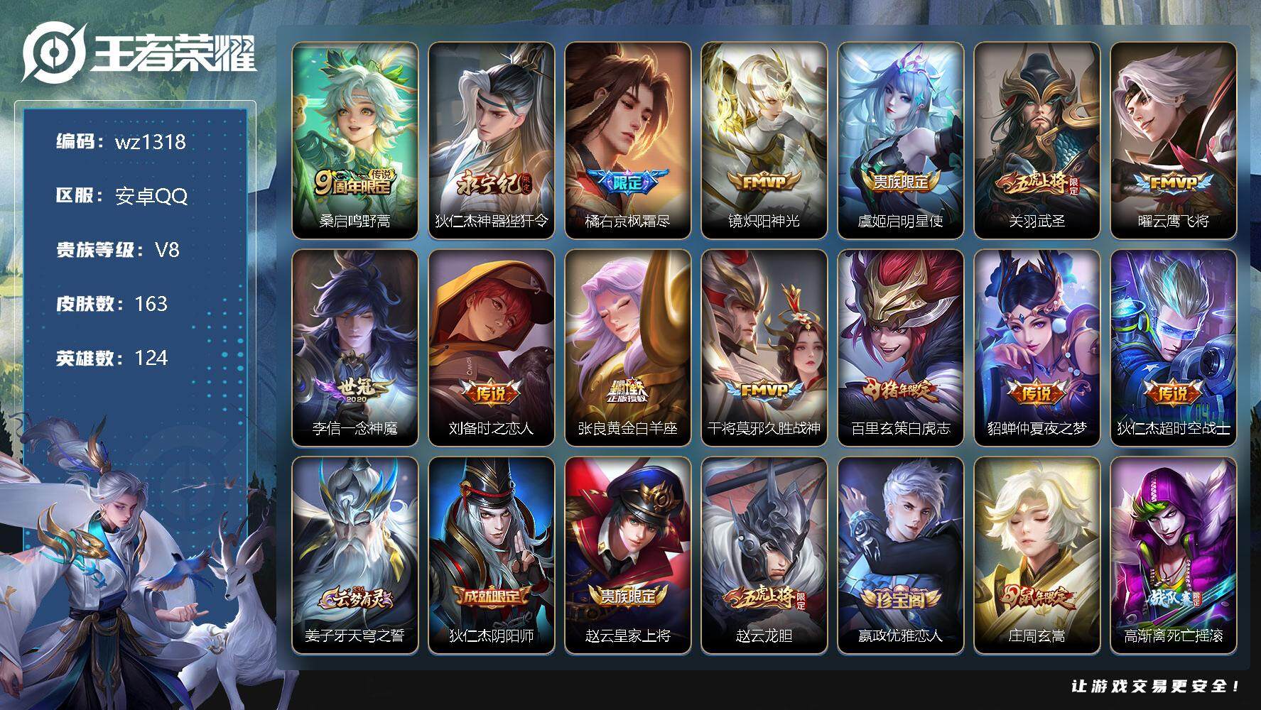 【账号佳】 【可二次实名】【wz1318】【商品标题】:安卓Q-V8-尊贵铂金I段位-124英雄-163皮肤-0典藏-0珍品无双-0无双-0珍品传说-14传说-49史诗 【传说皮肤】:桑启鸣野蒿,狄仁杰神器狴犴令,橘右京枫霜尽,镜炽阳神光,虞姬启明星使,关羽武圣,曜云鹰飞将,李信一念神魔,刘备时之恋人,张良黄金白羊座,干将莫邪久胜战神,百里玄策白虎志,貂蝉仲夏夜之梦,狄仁杰超时空战士 【限定皮肤】:姜子牙天穹之誓,狄仁杰阴阳师,赵云皇家上将,赵云龙胆,嬴政优雅恋人,庄周玄嵩,高渐离死亡摇滚,阿轲迷踪丽影,元歌云间偶戏,马可波罗暗影游猎,狄仁杰魔术师,狄仁杰万华元夜,狄仁杰神器狴犴令,达摩沙漠行僧,项羽海滩派对,老夫子醍醐杖,关羽武圣,程咬金演武夺筹,刘邦夺宝奇兵,花木兰默契交锋,橘右京枫霜尽,亚瑟潮玩骑士王,李元芳银河之约,李元芳云中旅人,虞姬启明星使,钟馗驱傩正仪,女娲朔望之晖,干将莫邪冰霜恋舞曲,雅典娜单词大作战,蔡文姬繁星吟游,鬼谷子原初探秘者,鬼谷子五谷丰年,苏烈千军破阵,百里玄策白虎志,百里玄策原初追逐者,弈星混沌棋,沈梦溪星空之诺,明世隐疑决卦,裴擒虎李小龙,裴擒虎擒涛扼浪,云中君纤云弄巧,猪八戒西部大镖客,上官婉儿天狼绘梦者,嫦娥如梦令,蒙犽狂想玩偶喵,鲁班大师探海日志,桑启海盐诗旅,艾琳流音漫舞,司空震地狱燃心,阿古朵江河有灵,张良古海寻踪,高渐离燃音魔法,妲己灵卜魔法,鬼谷子天穹祈灯,沈梦溪龙舞盛年,鲁班七号蔬乡物语,李元芳蔬乡物语,刘邦剑破天穹,程咬金群星魔术团,周瑜熔金海岸 【年限皮肤】:百里玄策白虎志,庄周玄嵩,马超神威,关羽武圣,赵云龙胆 【赛季限定】:狄仁杰万华元夜,达摩沙漠行僧,老夫子醍醐杖,程咬金演武夺筹,张良古海寻踪,李元芳云中旅人,钟馗驱傩正仪,鬼谷子原初探秘者,苏烈千军破阵,百里玄策原初追逐者,弈星混沌棋,明世隐疑决卦,裴擒虎擒涛扼浪,鲁班大师探海日志,桑启海盐诗旅,鬼谷子天穹祈灯,刘邦剑破天穹,姜子牙天穹之誓 【战令限定】:阿轲迷踪丽影,元歌云间偶戏,马可波罗暗影游猎,刘邦夺宝奇兵,艾琳流音漫舞,亚瑟潮玩骑士王,李元芳银河之约,女娲朔望之晖,雅典娜单词大作战,沈梦溪星空之诺,猪八戒西部大镖客,蒙犽狂想玩偶喵,司空震地狱燃心,高渐离燃音魔法,妲己灵卜魔法,鲁班七号蔬乡物语,李元芳蔬乡物语 【史诗皮肤】:露娜紫霞仙子,赵云皇家上将,甄姬冰雪圆舞曲,狄仁杰魔术师,廉颇地狱岩魂,宫本武藏鬼剑武藏,孙尚香水果甜心,嬴政优雅恋人,嬴政暗夜贵公子,嬴政摇滚巨星,妲己女仆咖啡,吕布圣诞狂欢,曹操幽灵船长,吕布末日机甲,花木兰水晶猎龙者,刘邦德古拉伯爵,兰陵王暗隐猎兽者,亚瑟心灵战警,铠曙光守护者,李元芳逐浪之夏,阿轲节奏热浪,干将莫邪冰霜恋舞曲,狄仁杰鹰眼统帅,公孙离无限星赏官,蔡文姬繁星吟游,李元芳银河之约,娜可露露晚萤,庄周玄嵩,嫦娥如梦令,阿轲迷踪丽影,橘右京修罗,瑶遇见神鹿,马超神威,赵云龙胆,孙尚香时之恋人,上官婉儿天狼绘梦者,马可波罗暗影游猎,蒙犽狂想玩偶喵,百里玄策原初追逐者,裴擒虎李小龙,云中君纤云弄巧,元歌云间偶戏,花木兰默契交锋,鬼谷子五谷丰年,司空震地狱燃心,阿古朵江河有灵,妲己灵卜魔法,高渐离燃音魔法,鲁班七号蔬乡物语,黄忠百相守梦 【其他皮肤】:项羽海滩派对,韩信街头霸王,露娜哥特玫瑰,赵云忍炎影,芈月红桃皇后,程咬金爱与正义,白起白色死神,宫本武藏未来纪元,姜子牙时尚教父,典韦黄金武士,花木兰兔女郎,张飞五福同心,刘备万事如意,宫本武藏万象初新,后羿阿尔法小队,狄仁杰阴阳师,刘备纽约教父,高渐离死亡摇滚,狂铁命运角斗场,孙尚香沉稳之力,李白敏锐之力,苏烈坚韧之力,明世隐虹云星官,女娲朔望之晖,小乔丁香结,吕布野性能量,孙膑归虚梦演,沈梦溪鲨炮海盗猫,沈梦溪星空之诺,弈星混沌棋,明世隐疑决卦,刘邦夺宝奇兵,盾山圆桌骑士,老夫子醍醐杖,猪八戒西部大镖客,狂铁特工战影,廉颇无尽征程,鬼谷子原初探秘者,雅典娜单词大作战,狄仁杰万华元夜,亚瑟潮玩骑士王,杨戬次元傲视,程咬金演武夺筹,张良缤纷绘卷,钟馗驱傩正仪,鲁班大师乓乓大师,苏烈千军破阵,达摩沙漠行僧,蒙恬蔚蓝守将,李元芳云中旅人,戈娅危途狂花,桑启海盐诗旅,赵怀真太极少年,裴擒虎擒涛扼浪,鲁班大师探海日志,姬小满零食大作战,艾琳流音漫舞,张良古海寻踪,亚连破局者,后羿完美运算,鬼谷子天穹祈灯,妲己灵卜魔法,嫦娥漠中幻影,沈梦溪龙舞盛年,李元芳蔬乡物语,刘邦剑破天穹,程咬金群星魔术团,姜子牙天穹之誓,周瑜熔金海岸,姜子牙星梦巡礼,露娜绯红之刃,孙膑未来旅行,后羿精灵王,李白范海辛,钟馗地府判官,刘邦圣殿之光,关羽天启骑士,雅典娜战争女神,苍维京掠夺者,太乙真人圆桌骑士,黄忠芝加哥教父,大乔伊势巫女,干将莫邪第七人偶,百里守约绝影神枪,女娲尼罗河女神,公孙