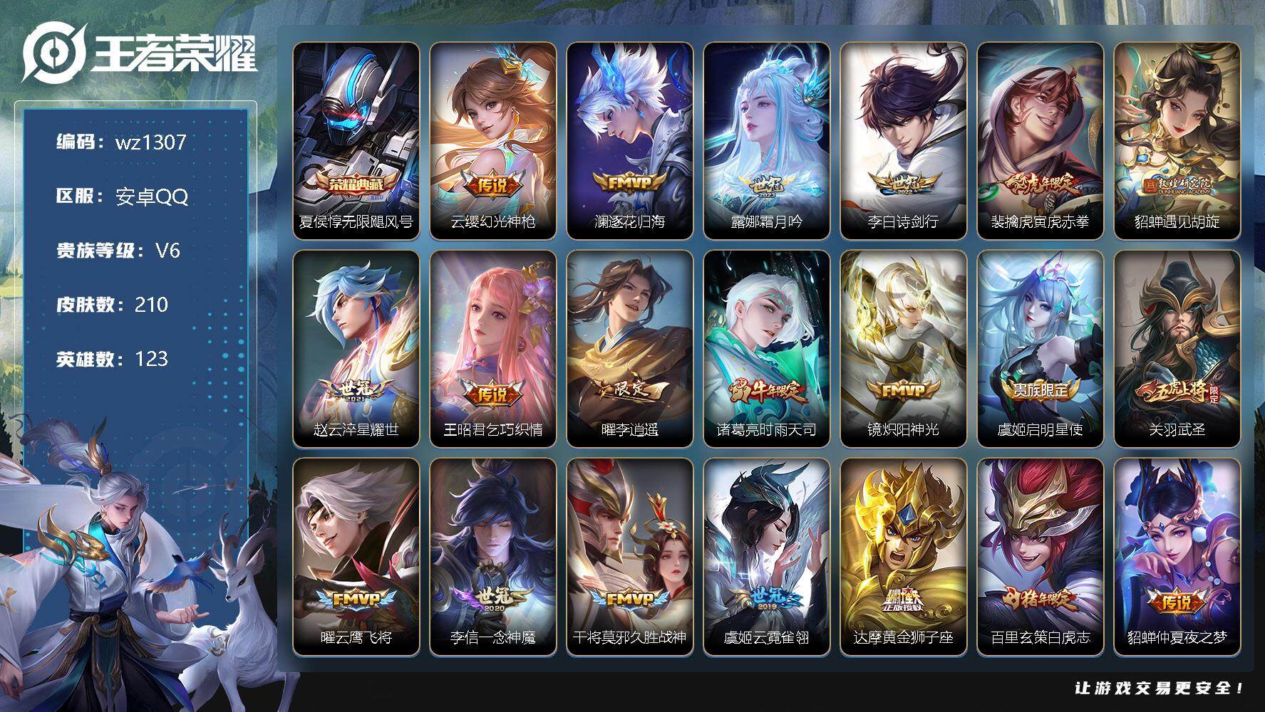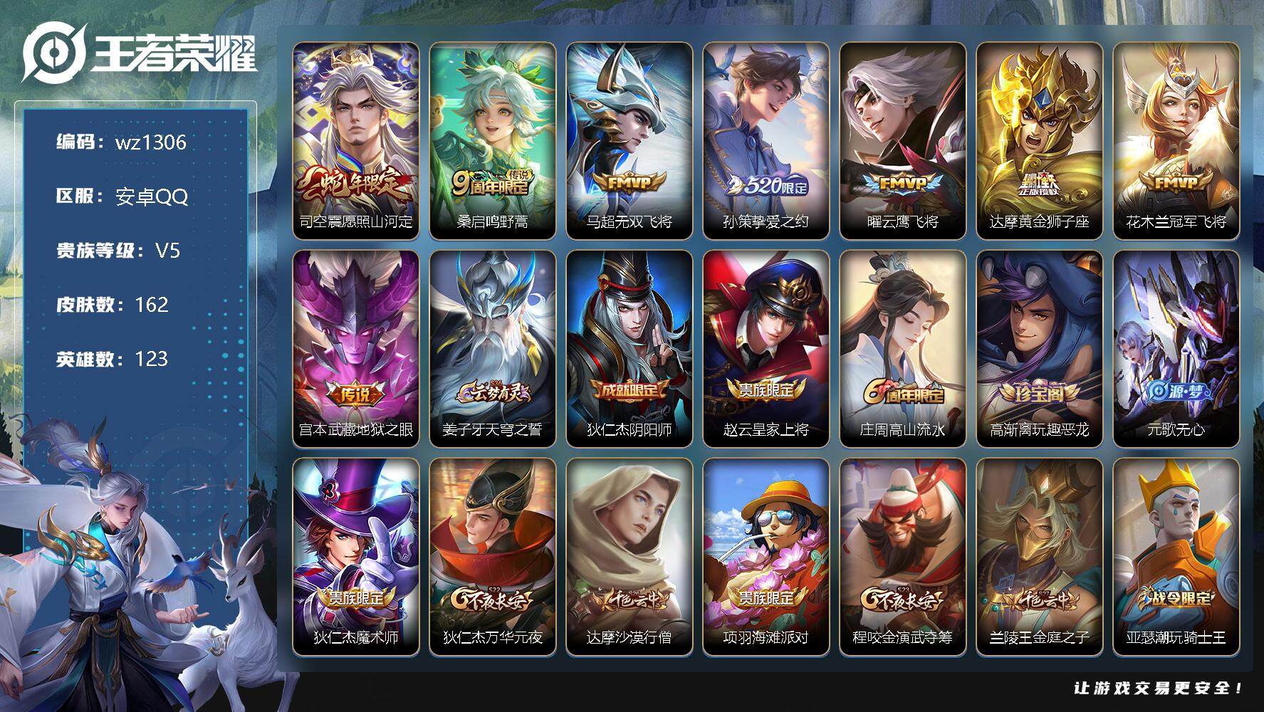 【账号佳】 【可二次实名】【wz1307】【商品标题】:安卓Q-V6-至尊星耀II段位-123英雄-210皮肤-1典藏-0珍品无双-0无双-0珍品传说-21传说-55史诗 【荣耀典藏】:夏侯惇无限飓风号 【传说皮肤】:云缨幻光神枪,澜逐花归海,露娜霜月吟,李白诗剑行,裴擒虎寅虎赤拳,貂蝉遇见胡旋,赵云淬星耀世,王昭君乞巧织情,曜李逍遥 ,诸葛亮时雨天司,镜炽阳神光,虞姬启明星使,关羽武圣,曜云鹰飞将,李信一念神魔,干将莫邪久胜战神,虞姬云霓雀翎,达摩黄金狮子座,百里玄策白虎志,貂蝉仲夏夜之梦,宫本武藏地狱之眼 【限定皮肤】:狄仁杰阴阳师,赵云皇家上将,孙尚香蔷薇恋人,庄周高山流水,吕布御风骁将,周瑜赤莲之焰,元歌云间偶戏,元歌无心,夏侯惇朔风刀,典韦岱宗,马可波罗暗影游猎,狄仁杰魔术师,狄仁杰万华元夜,达摩星际陆战队,达摩沙漠行僧,项羽海滩派对,老夫子醍醐杖,关羽武圣,貂蝉遇见胡旋,程咬金演武夺筹,韩信飞衡,韩信傲雪梅枪,兰陵王驯魔猎人,兰陵王金庭之子,花木兰默契交锋,亚瑟潮玩骑士王,牛魔御旌,后羿辉光之辰,后羿如梦令,李元芳云中旅人,虞姬启明星使,钟馗驱傩正仪,杨玉环遇见飞天,雅典娜单词大作战,雅典娜黎明之约,鬼谷子原初探秘者,诸葛亮时雨天司,苏烈千军破阵,百里玄策白虎志,百里玄策原初追逐者,弈星混沌棋,梦奇顽趣,公孙离玉兔公主,沈梦溪大漠名商,明世隐疑决卦,裴擒虎李小龙,裴擒虎寅虎赤拳,裴擒虎擒涛扼浪,米莱狄胡桃异想国,云中君纤云弄巧,伽罗天狼溯光者,盾山御銮,猪八戒西部大镖客,猪八戒猪悟能,上官婉儿梁祝,嫦娥拒霜思,曜李逍遥 ,蒙犽狂想玩偶喵,鲁班大师探海日志,桑启海盐诗旅,张良古海寻踪,鬼谷子天穹祈灯,姬小满妄想食味 【年限皮肤】:百里玄策白虎志,裴擒虎寅虎赤拳,后羿辉光之辰,吕布御风骁将,诸葛亮时雨天司,韩信飞衡,典韦岱宗,马超神威,关羽武圣 【赛季限定】:夏侯惇朔风刀,狄仁杰万华元夜,达摩沙漠行僧,老夫子醍醐杖,程咬金演武夺筹,兰陵王金庭之子,张良古海寻踪,牛魔御旌,李元芳云中旅人,钟馗驱傩正仪,雅典娜黎明之约,鬼谷子原初探秘者,苏烈千军破阵,百里玄策原初追逐者,弈星混沌棋,梦奇顽趣,沈梦溪大漠名商,明世隐疑决卦,裴擒虎擒涛扼浪,盾山御銮,鲁班大师探海日志,桑启海盐诗旅,鬼谷子天穹祈灯 【战令限定】:周瑜赤莲之焰,元歌云间偶戏,马可波罗暗影游猎,达摩星际陆战队,兰陵王驯魔猎人,亚瑟潮玩骑士王,雅典娜单词大作战,米莱狄胡桃异想国,猪八戒西部大镖客,蒙犽狂想玩偶喵 【史诗皮肤】:露娜紫霞仙子,阿轲暗夜猫娘,赵云皇家上将,貂蝉圣诞恋歌,甄姬冰雪圆舞曲,王昭君偶像歌手,狄仁杰魔术师,宫本武藏鬼剑武藏,孙尚香蔷薇恋人,孙尚香水果甜心,妲己魅力维加斯,墨子金属风暴,曹操幽灵船长,李白千年之狐,花木兰水晶猎龙者,小乔缤纷独角兽,诸葛亮黄金分割率,后羿辉光之辰,百里守约特工魅影,铠曙光守护者,蔡文姬舞动绿茵,杨玉环遇见飞天,孙策猫狗日记,狄仁杰鹰眼统帅,公孙离无限星赏官,兰陵王驯魔猎人,上官婉儿梁祝,韩信飞衡,典韦岱宗,后羿如梦令,不知火舞魅语,橘右京修罗,马超神威,马可波罗暗影游猎,蒙犽狂想玩偶喵,百里玄策原初追逐者,裴擒虎李小龙,云中君纤云弄巧,元歌云间偶戏,吕布御风骁将,花木兰默契交锋,米莱狄胡桃异想国,伽罗天狼溯光者,猪八戒猪悟能,庄周高山流水,司马懿暗渊魔法,嫦娥拒霜思,雅典娜黎明之约,韩信傲雪梅枪,夏洛特永昼,公孙离玉兔公主,澜赏金猎手,元歌无心,梦奇顽趣,姬小满妄想食味 【其他皮肤】:项羽海滩派对,韩信街头霸王,露娜哥特玫瑰,赵云白执事,赵云忍炎影,芈月红桃皇后,白起白色死神,牛魔西部大镖客,扁鹊救世之瞳,宫本武藏未来纪元,安琪拉玩偶对对碰,姜子牙时尚教父,亚瑟死亡骑士,达摩拳王,花木兰兔女郎,张飞五福同心,甄姬花好人间,宫本武藏万象初新,后羿阿尔法小队,狄仁杰阴阳师,刘备汉昭烈帝,关羽龙腾万里,钟无艳海滩丽影,王昭君幻想奇妙夜,狂铁命运角斗场,孙尚香沉稳之力,诸葛亮掌控之力,李白敏锐之力,苏烈坚韧之力,大乔守护之力,庄周奇妙博物学,牛魔御旌,小乔丁香结,盾山御銮,孙膑归虚梦演,沈梦溪鲨炮海盗猫,夏侯惇朔风刀,周瑜赤莲之焰,弈星混沌棋,明世隐疑决卦,盾山圆桌骑士,老夫子醍醐杖,猪八戒西部大镖客,狂铁特工战影,鬼谷子原初探秘者,雅典娜单词大作战,狄仁杰万华元夜,亚瑟潮玩骑士王,刘禅秘密基地,杨戬次元傲视,达摩星际陆战队,程咬金演武夺筹,张良缤纷绘卷,钟馗驱傩正仪,鲁班大师乓乓大师,苏烈千军破阵,妲己紫罗兰之誓,达摩沙漠行僧,程咬金无双福将,刘邦虎啸剑宗,兰陵王金庭之子,米莱狄契约魔法,沈梦溪大漠名商,李元芳云中旅人,戈娅危途狂花,桑启海盐诗旅,海月幻泉雾影,猪八戒潮玩探月行,赵怀真太极少年,裴擒虎擒涛扼浪,鲁班大师探海日志,姬小满零食大作战